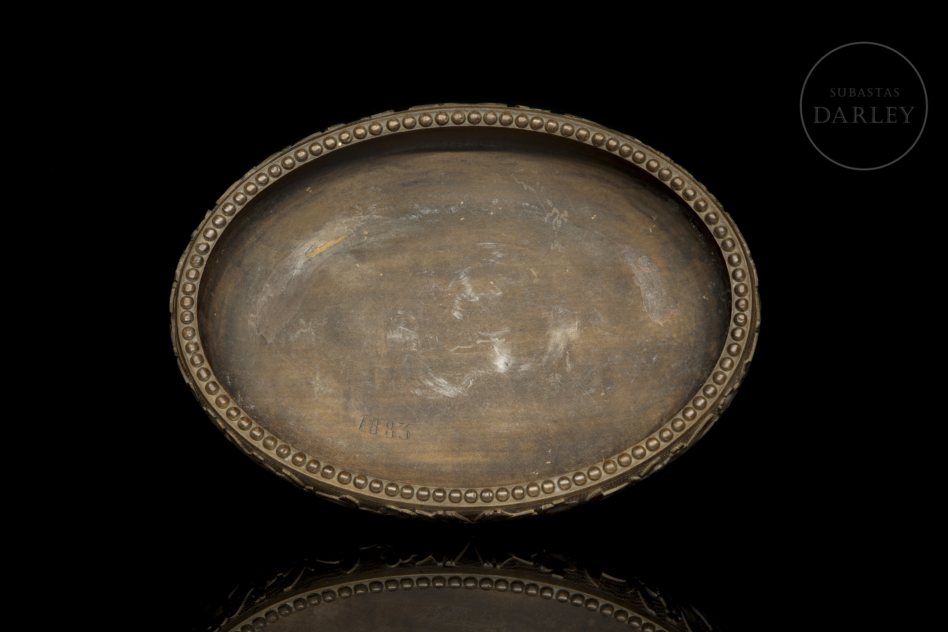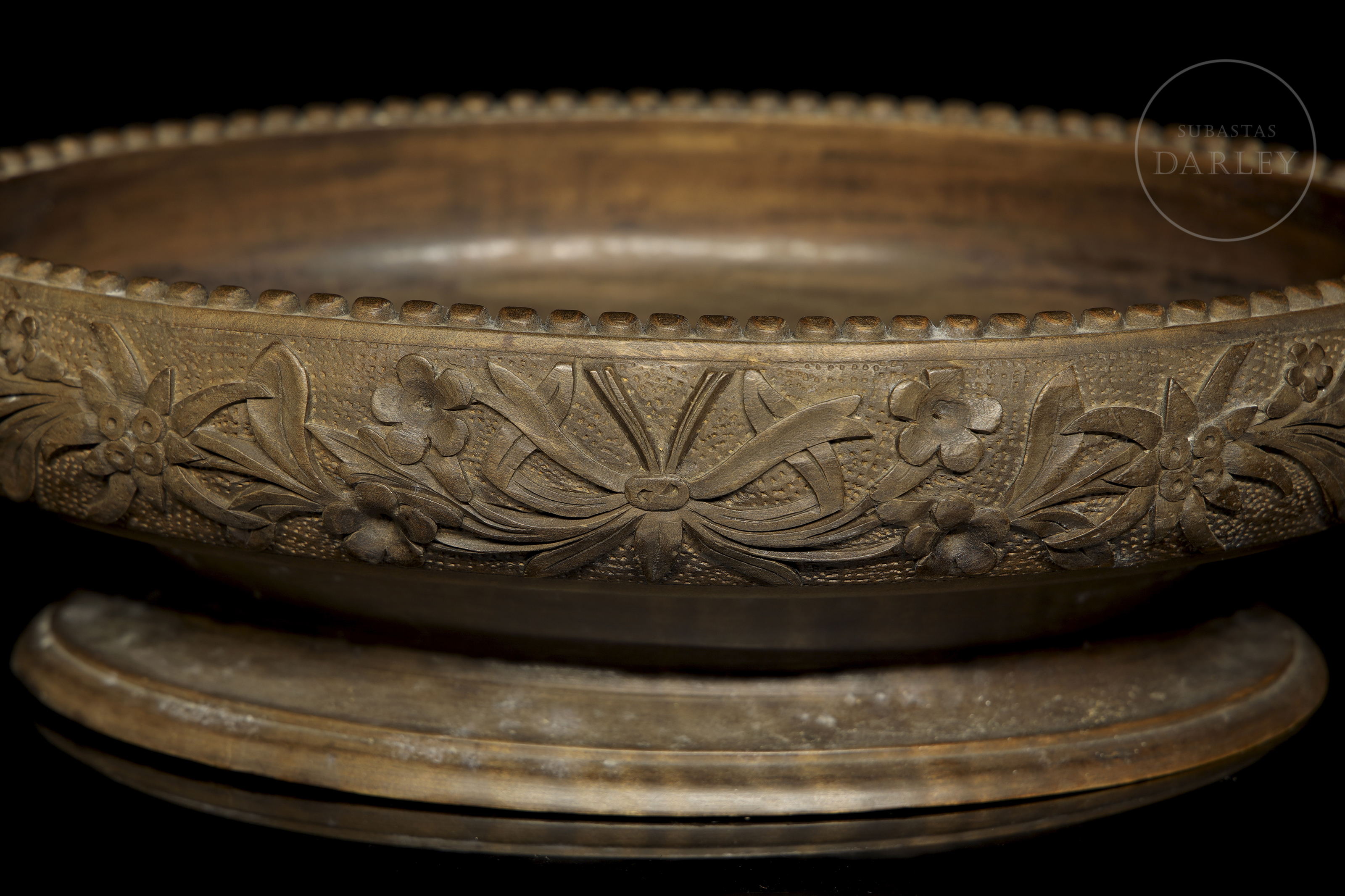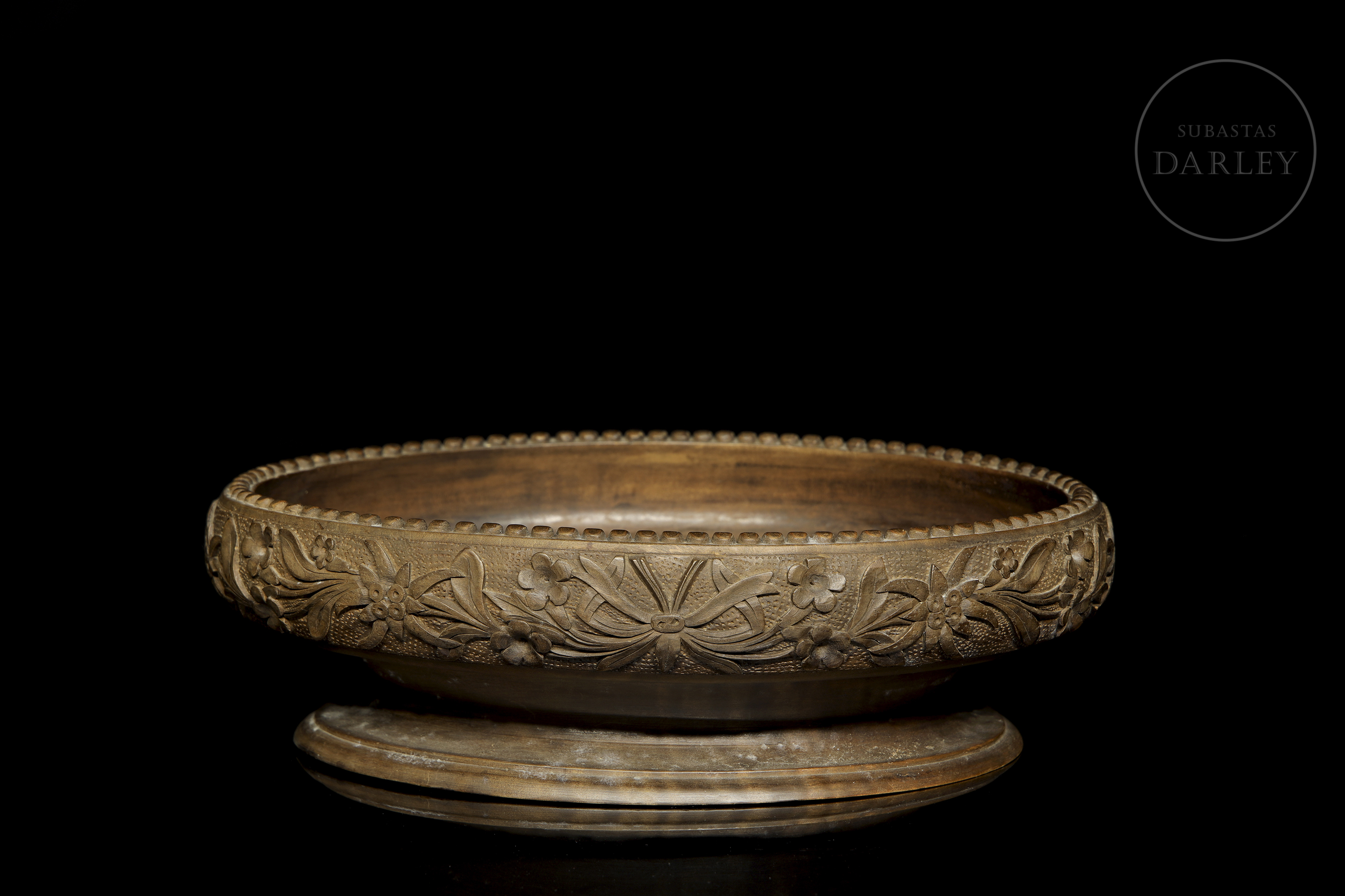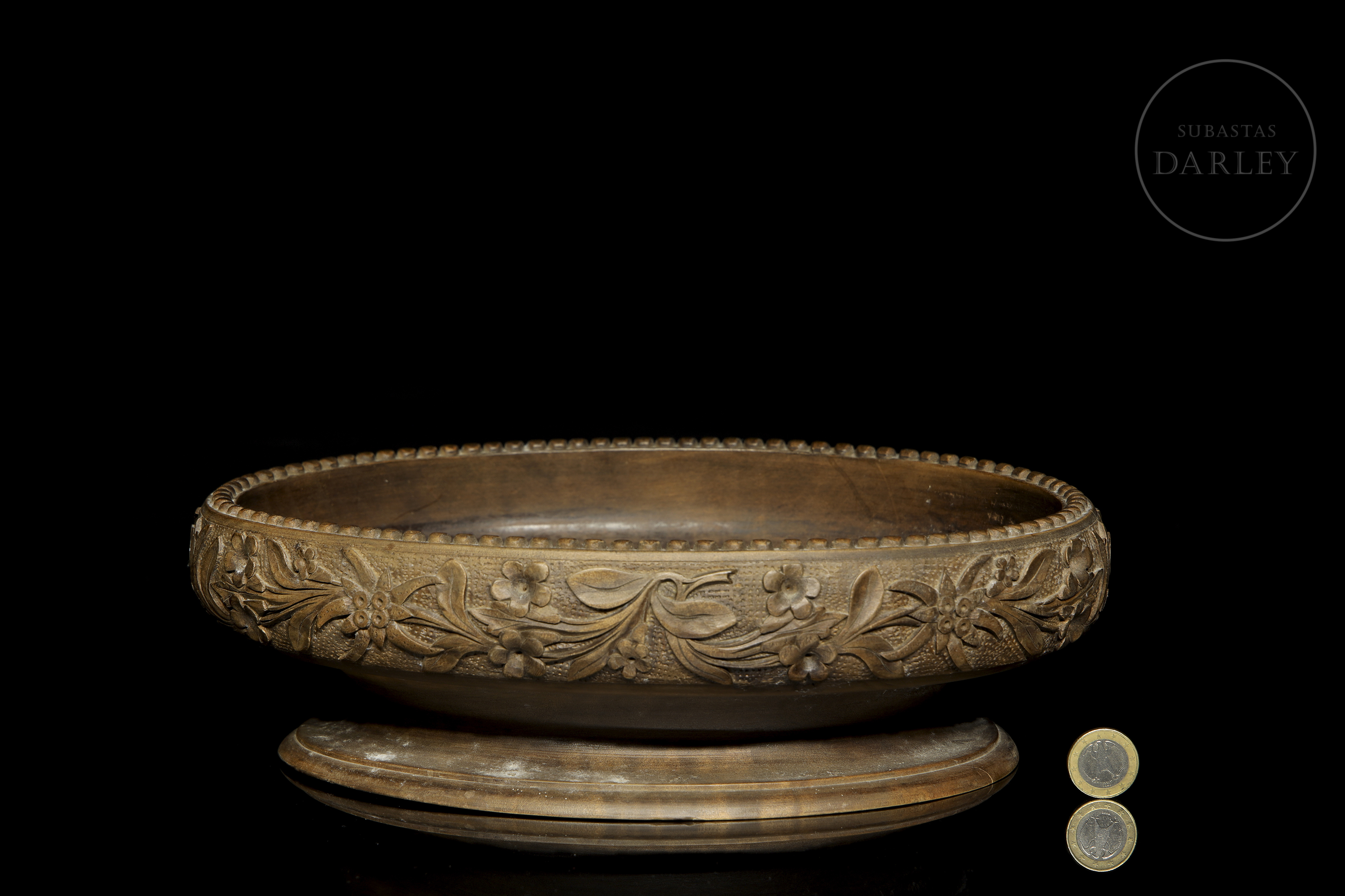 Madera tallada. Posee forma elíptica, con un pie acampanado sobre el que se dispone el cuerpo, hondo y de perfil curvo, adornado en el exterior por finos detalles incisos y en relieve de hojas y curvas ramas en flor. Muestra desgaste por envejecimiento.