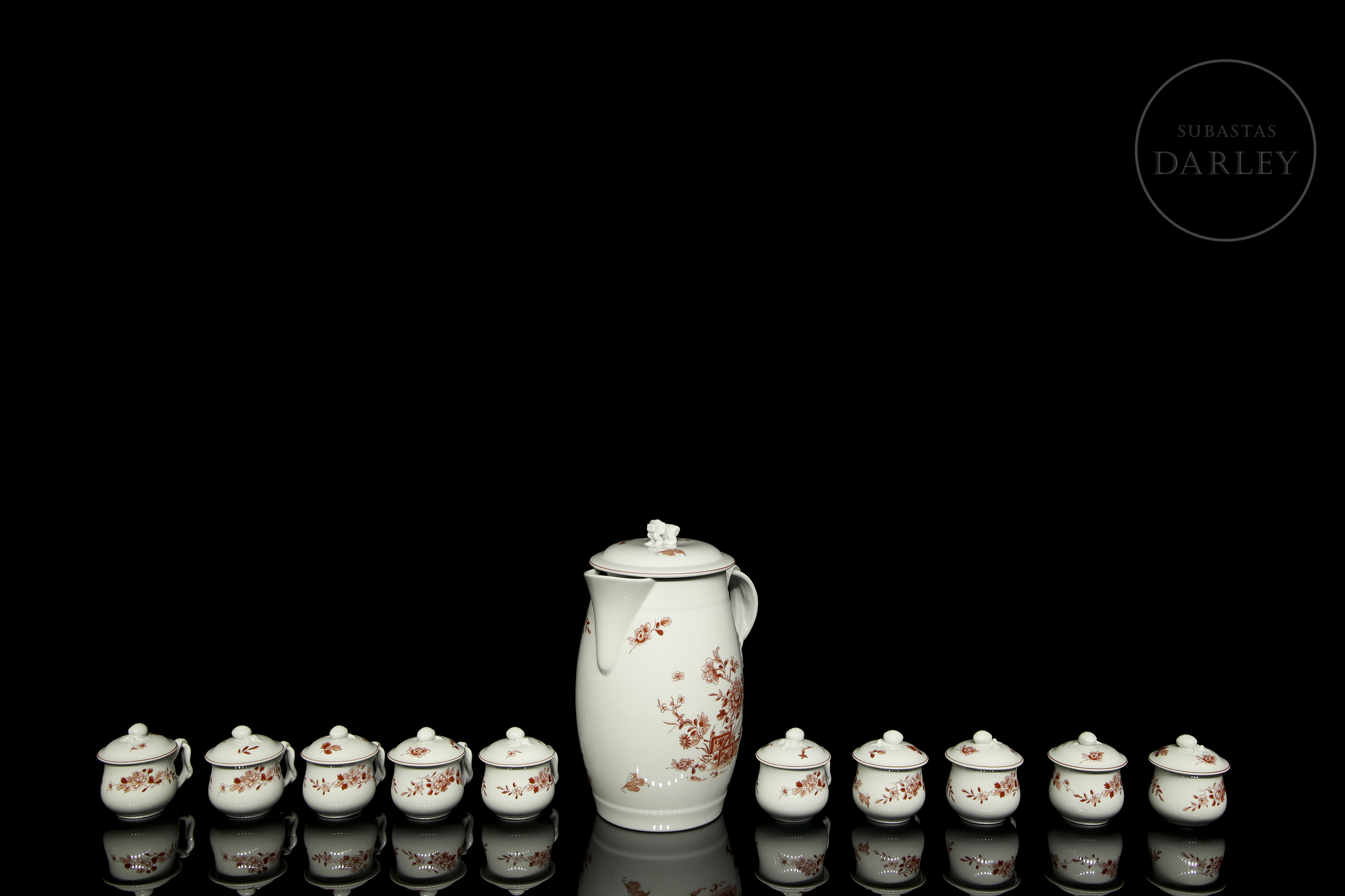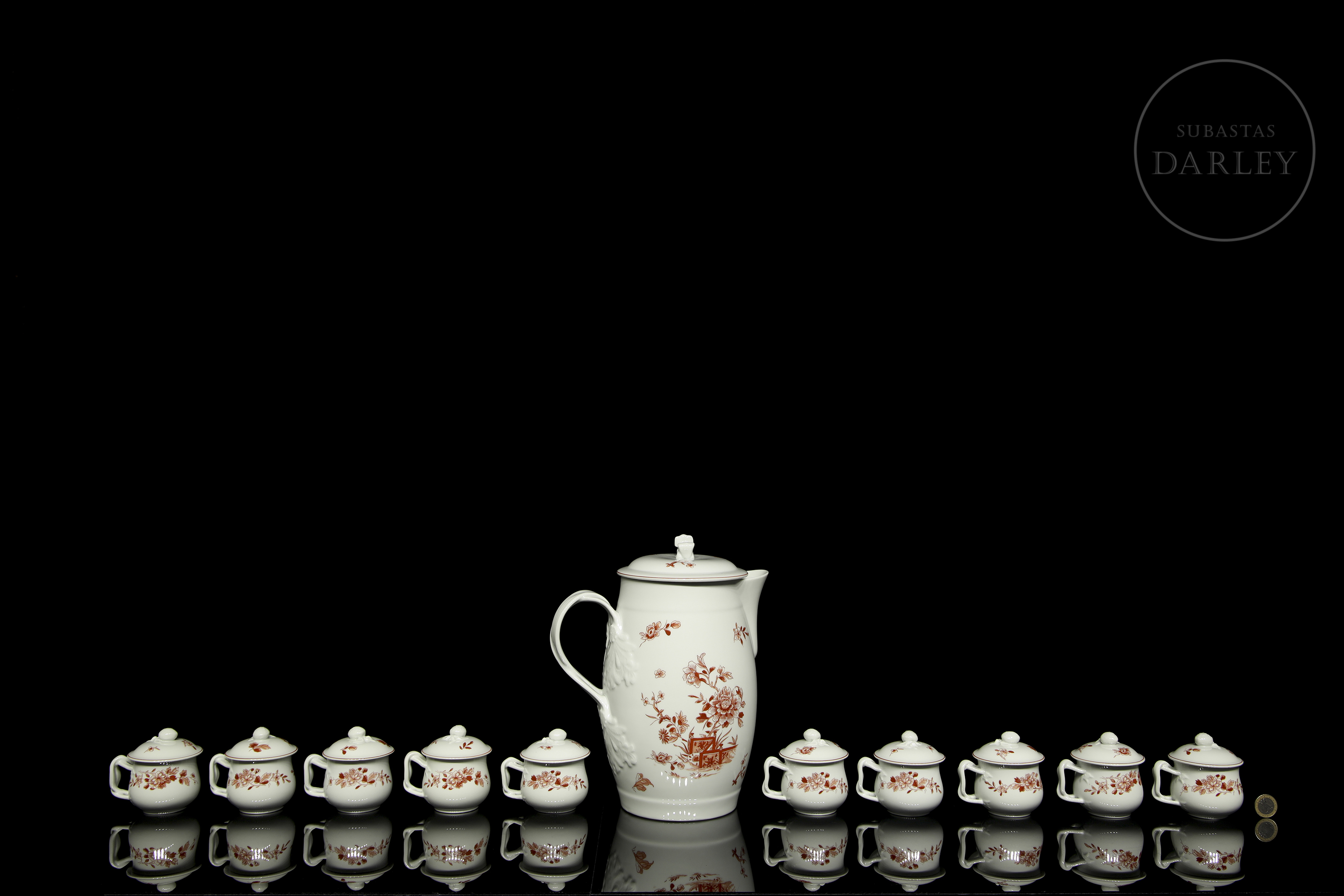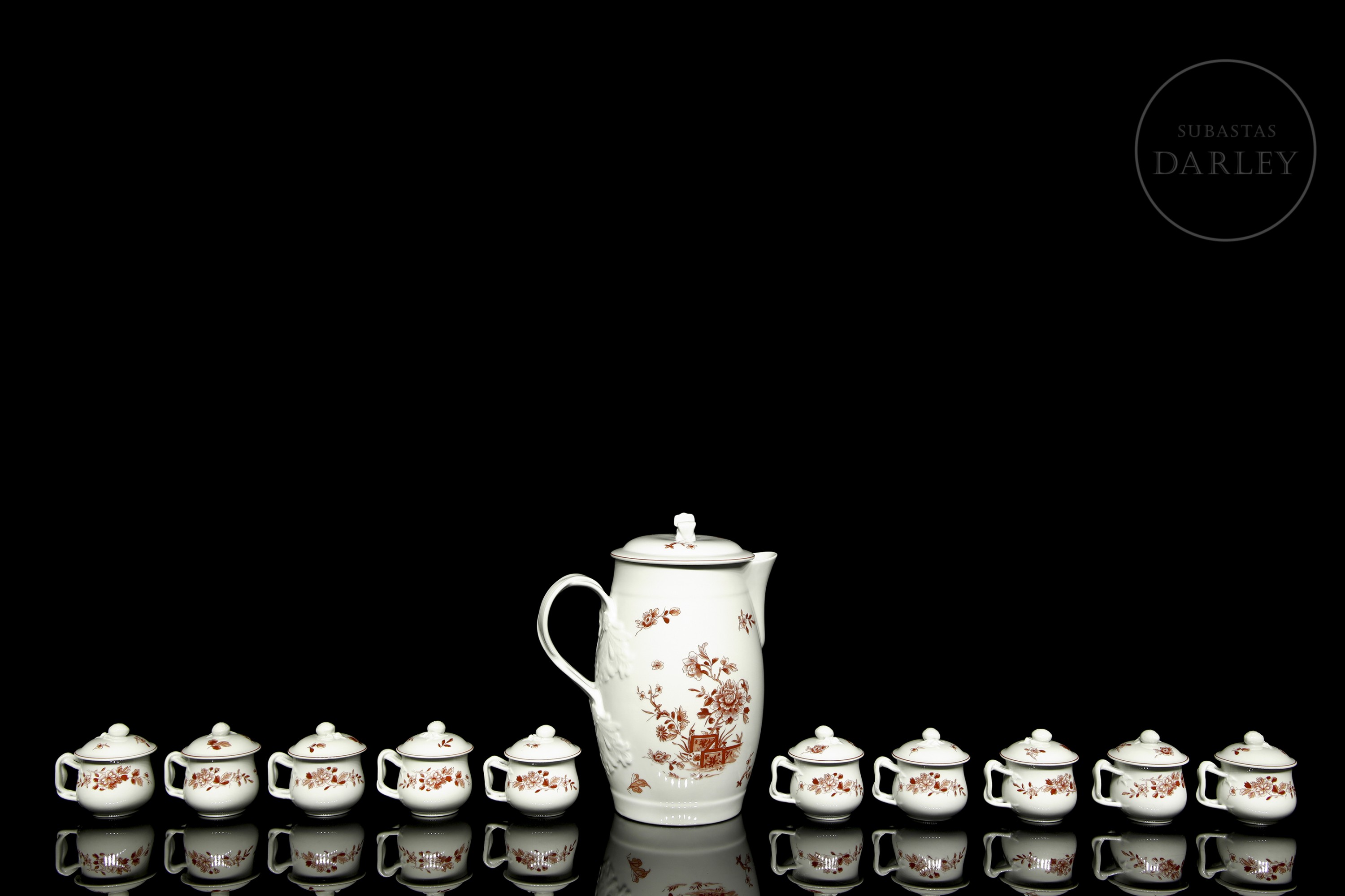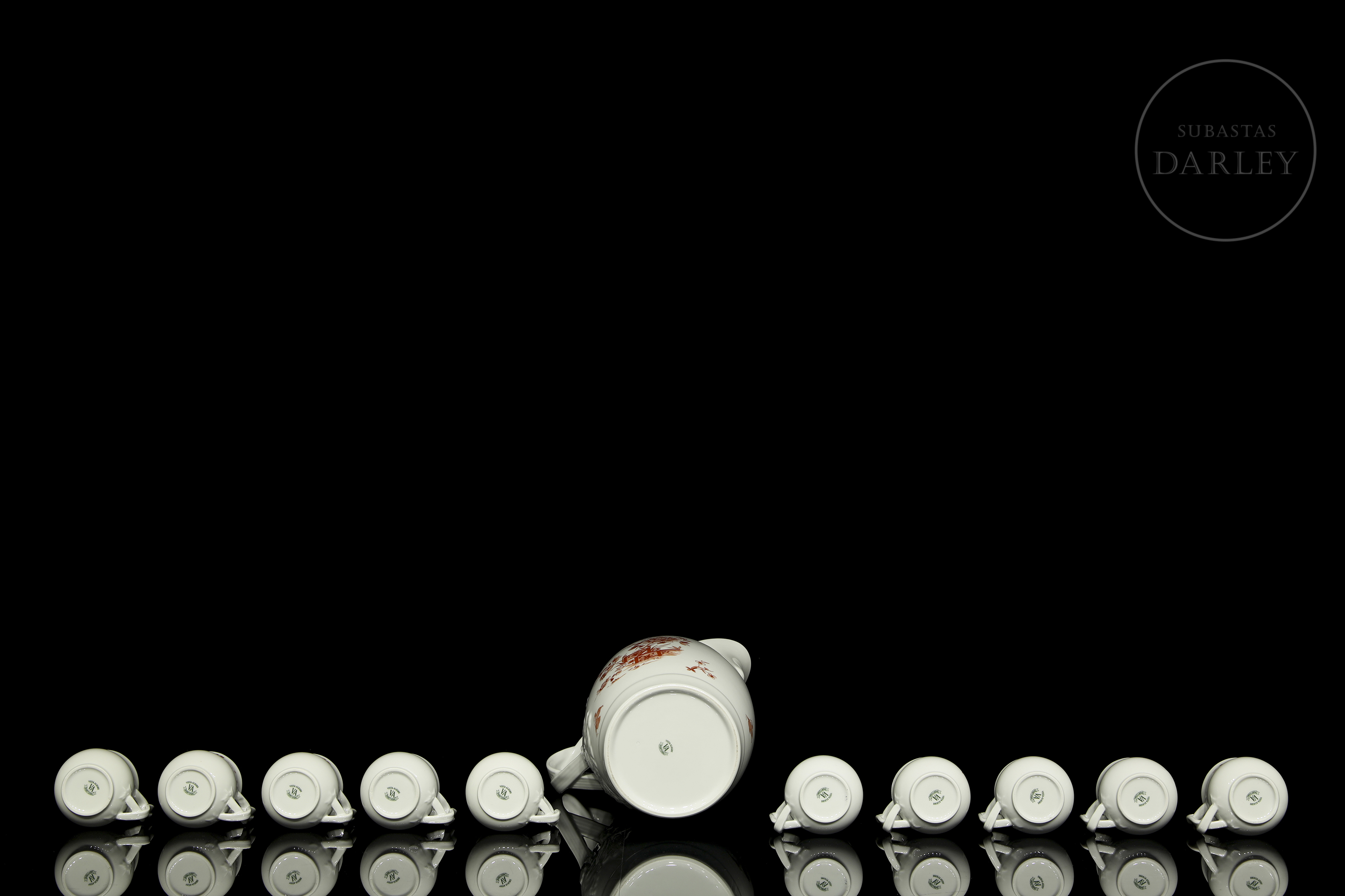 Juego de té de porcelana. Conformado por diez tazas (con tapa) y una tetera. Adornado con elementos florales de estilo asiático. Con sello de fabricación en la base.