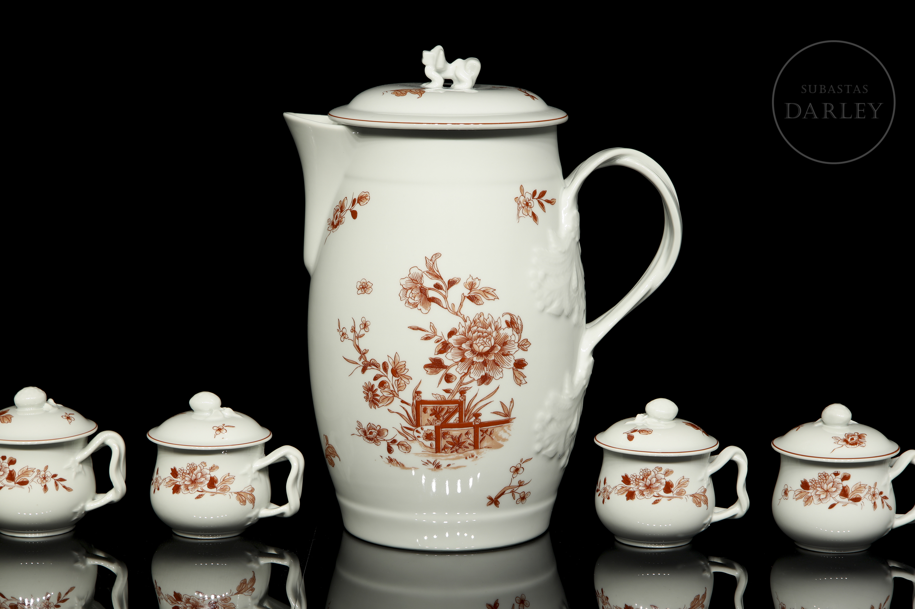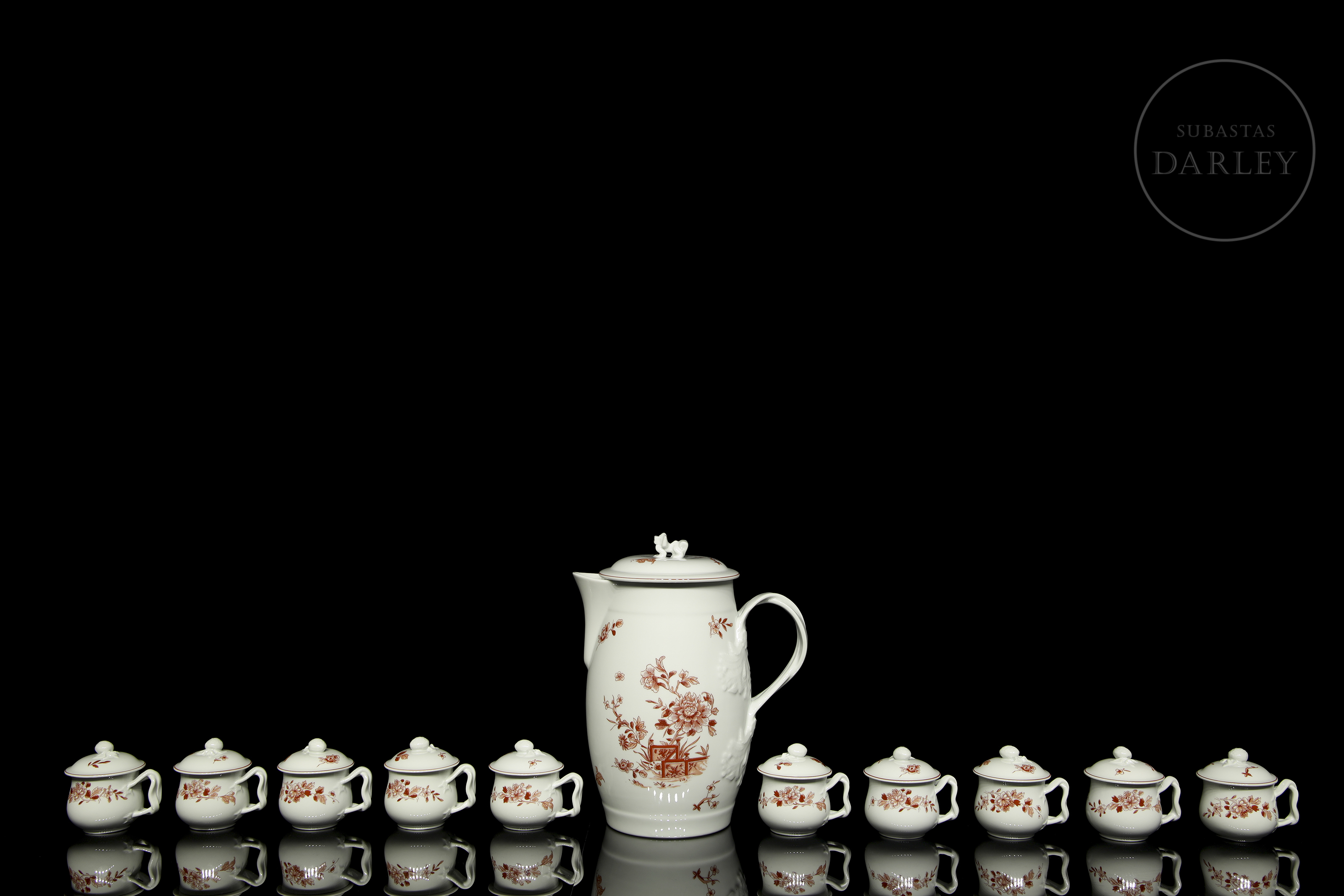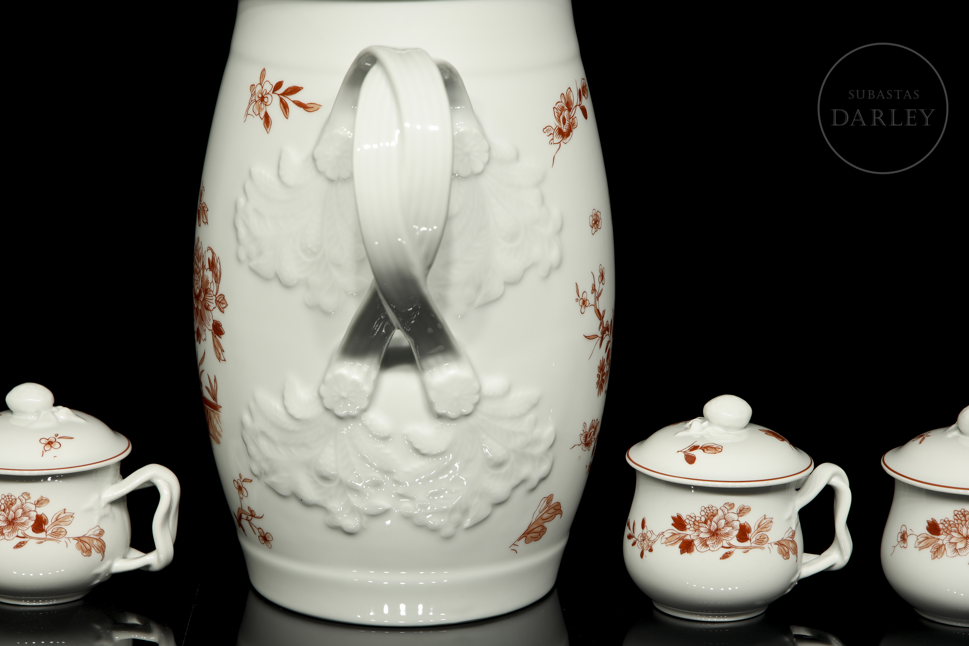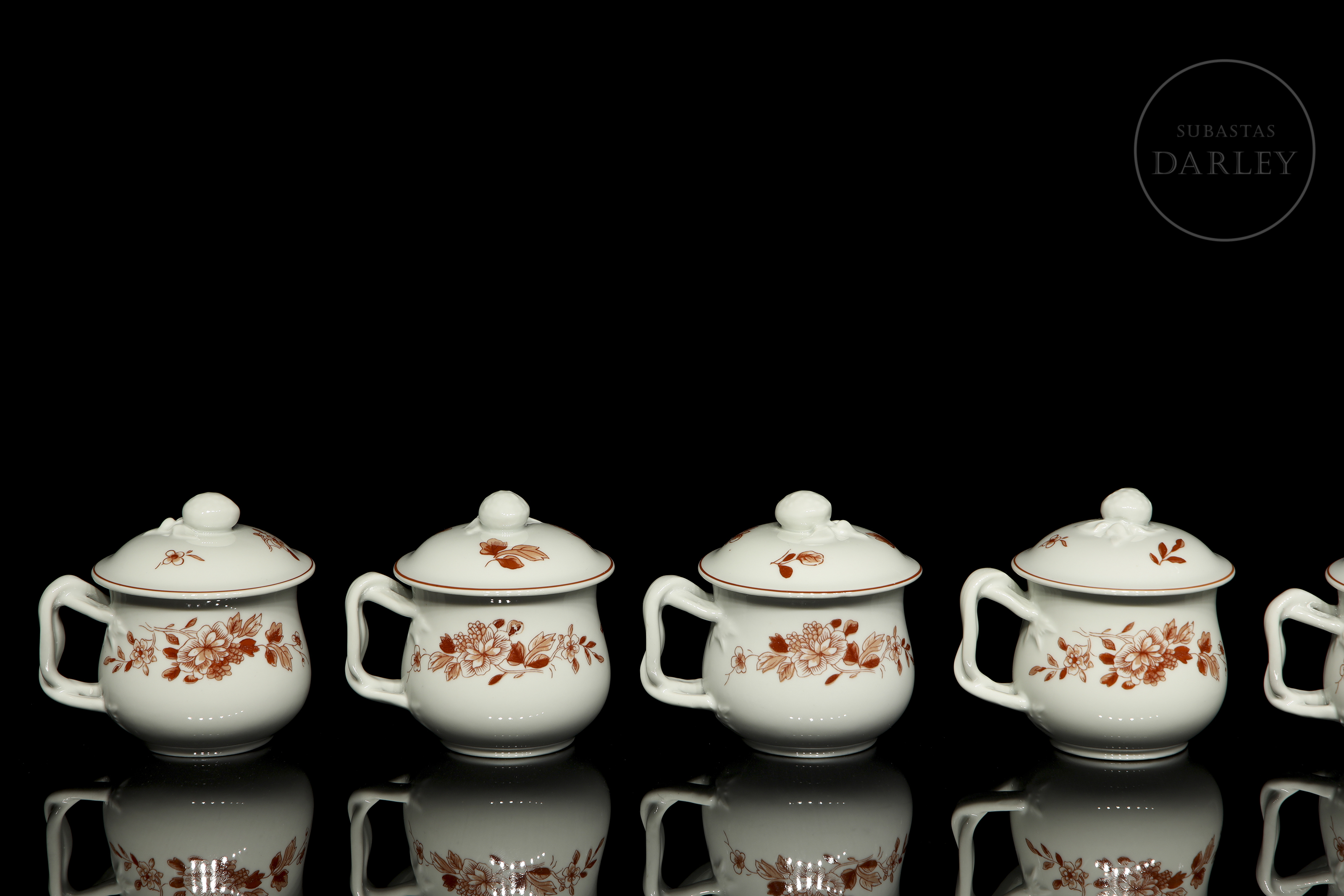 Juego de té de porcelana. Conformado por diez tazas (con tapa) y una tetera. Adornado con elementos florales de estilo asiático. Con sello de fabricación en la base.