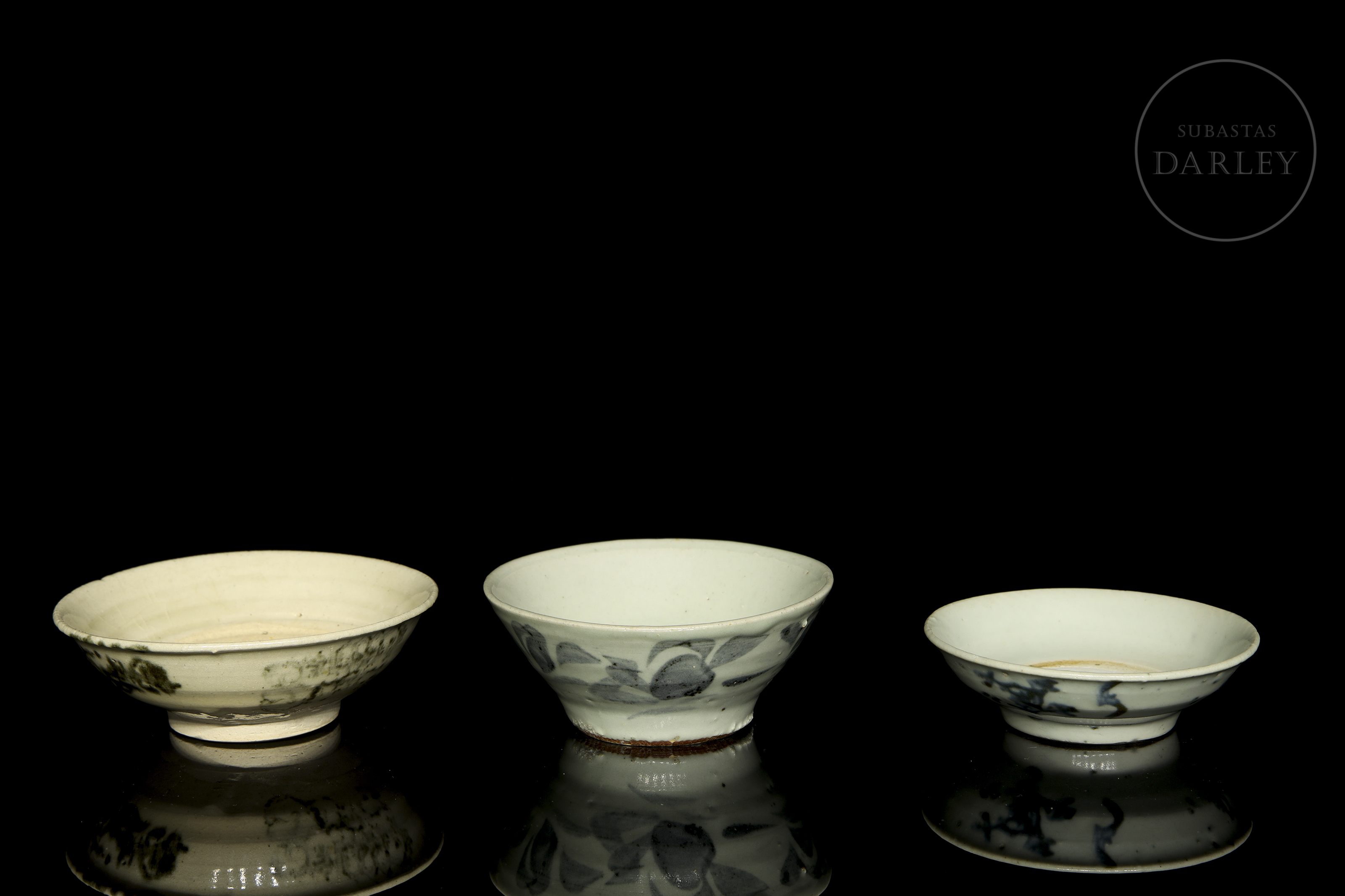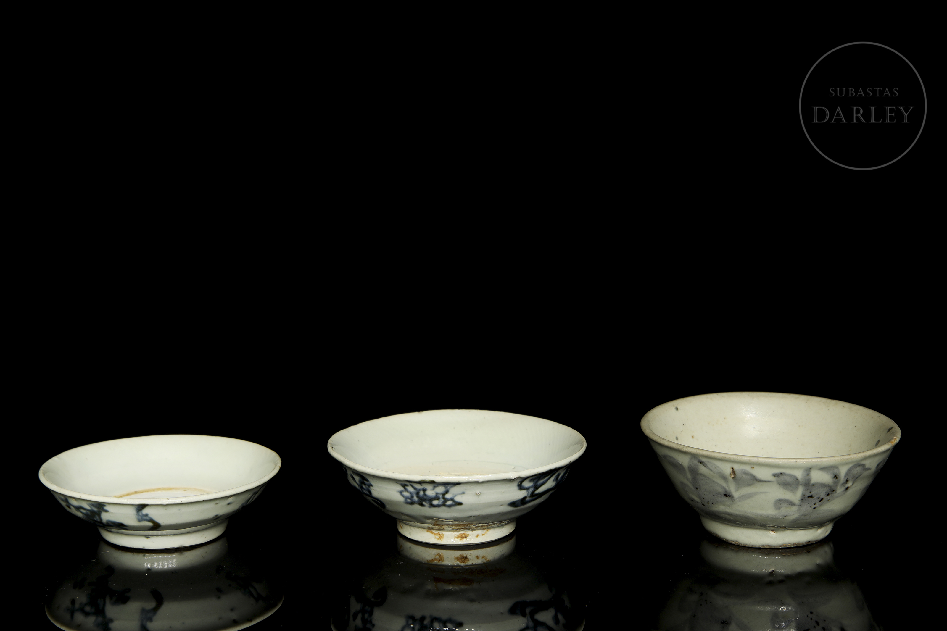 Cerámica esmaltada con decoración bajo vidriado en tonos azule y grisáceos sobre fondo blanco. Poseen un cuerpo circular y paredes acampanadas, asentadas sobre cortos pies anulares. Están decorados con un motivo de líneas estilizadas, flores y hojas. En la base se dispone un símbolo bajo vidriado. Dinastía Ming (1368-1644).