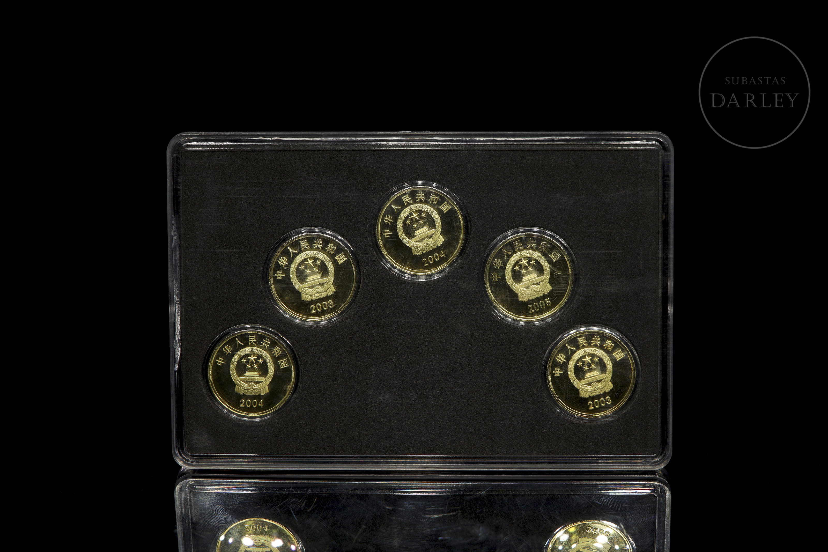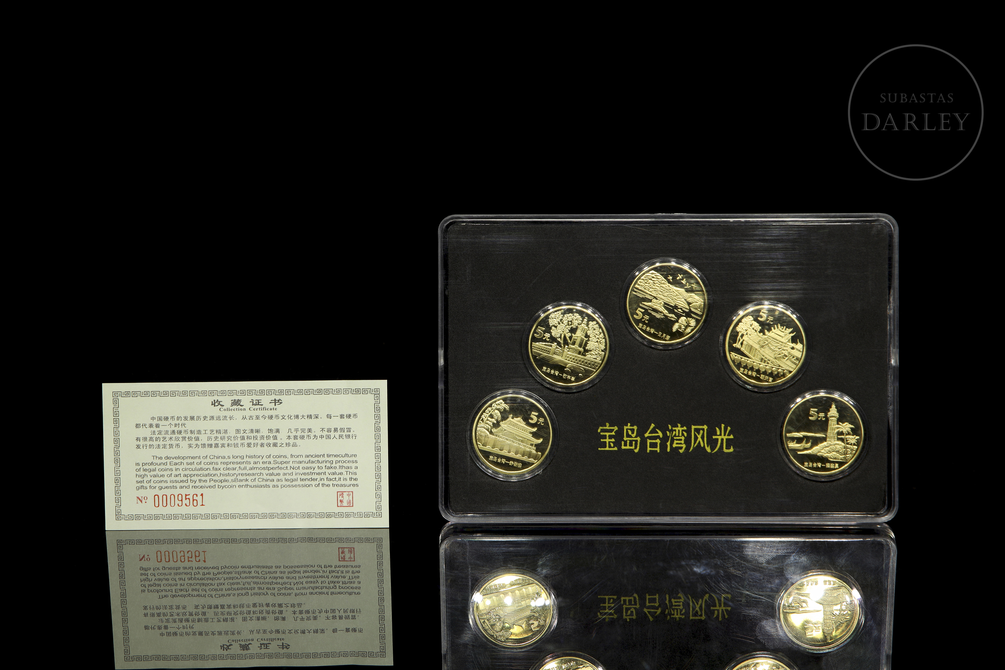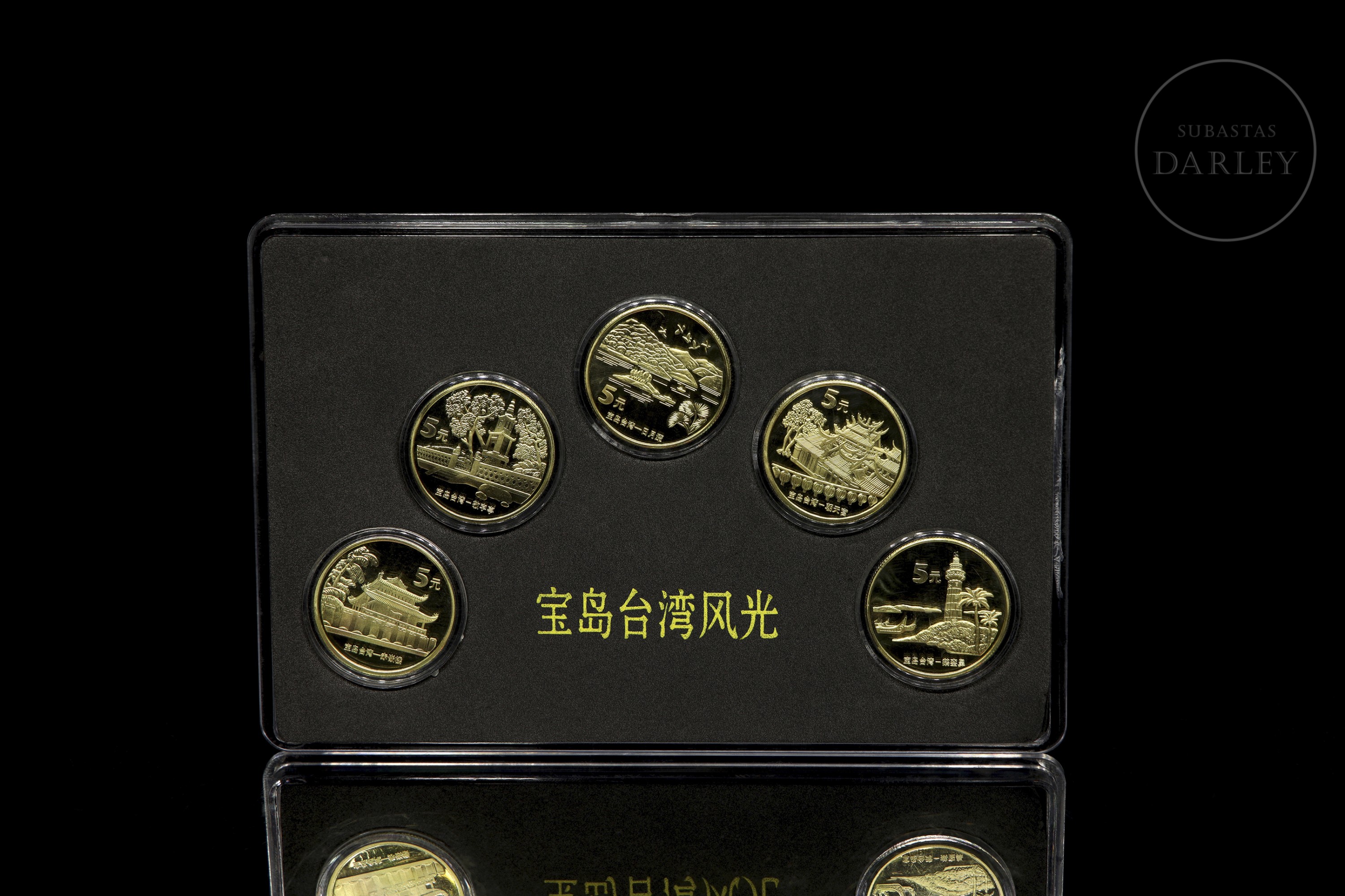 Conjunto de 5 monedas de coleccionista, pertenecientes a la serie "China Treasure Island Taiwan Series" que muestra diferentes lugares de Taiwán, y que fueron emitidas entre los años 2003 y 2005. Cada moneda tiene un valor de 5 Yuanes. Se presenta con estuche y caja.