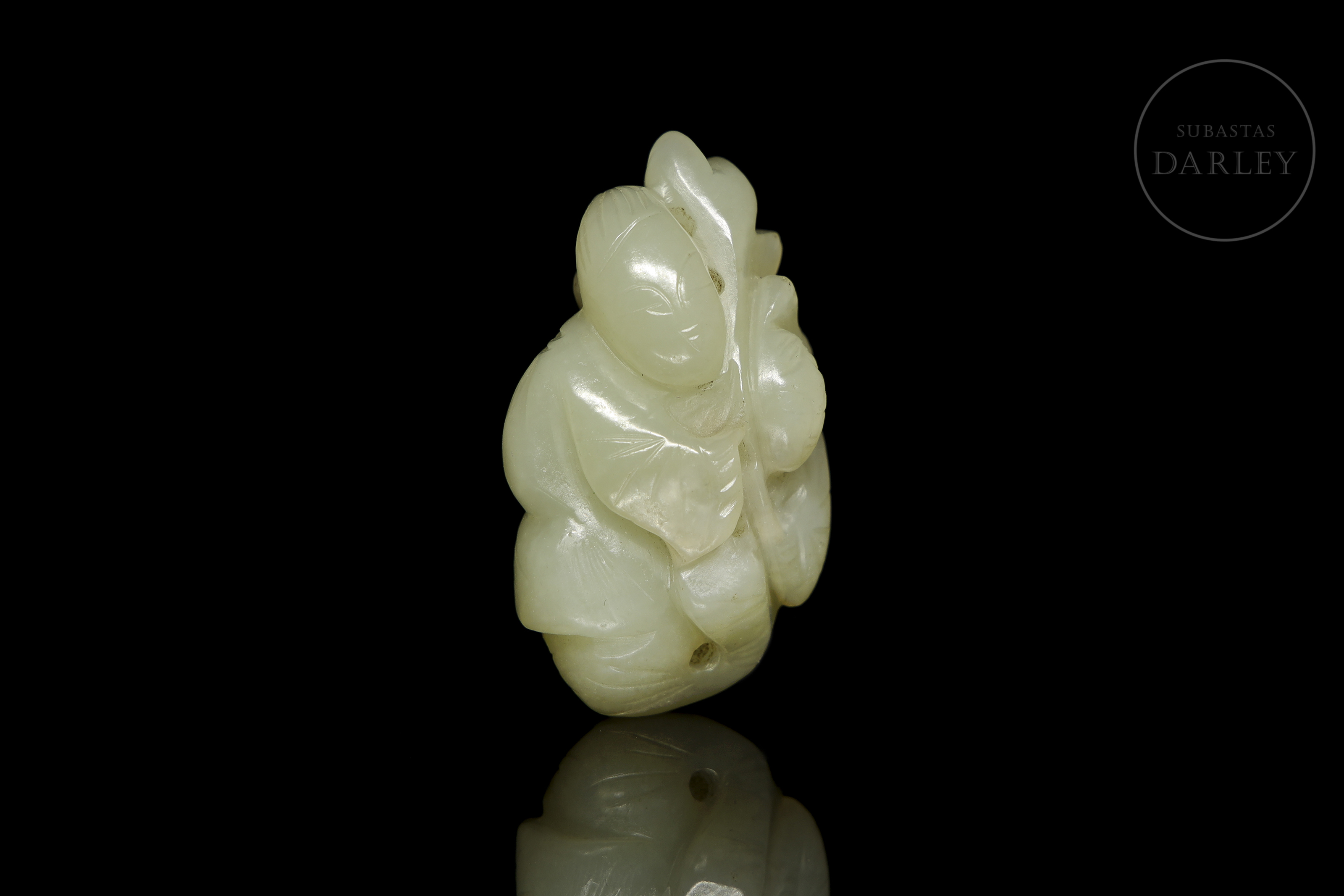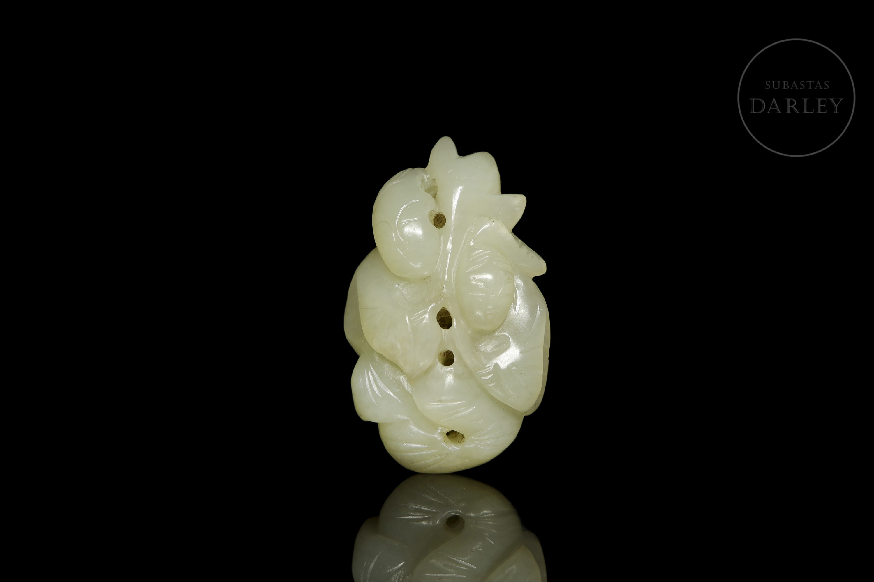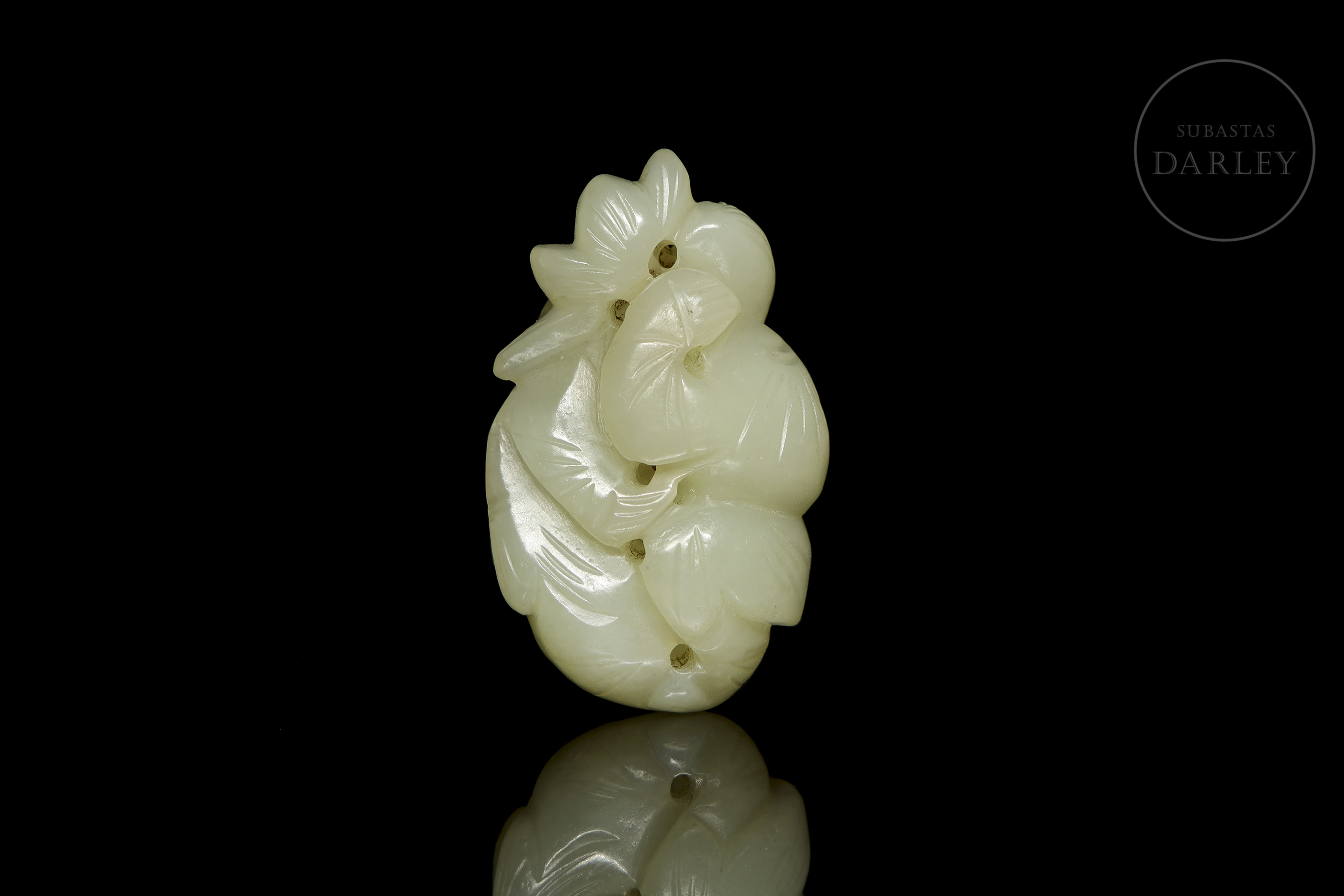 Jade blanco con un pulido de tacto sedoso. Presenta tallado una composición compleja que integra dos figuras humanas entre un profuso ramaje, todo ello definido mediante líneas incisas y calados. Posee una serie de perforaciones que permiten su suspensión. Dinastía Qing (1644–1912).