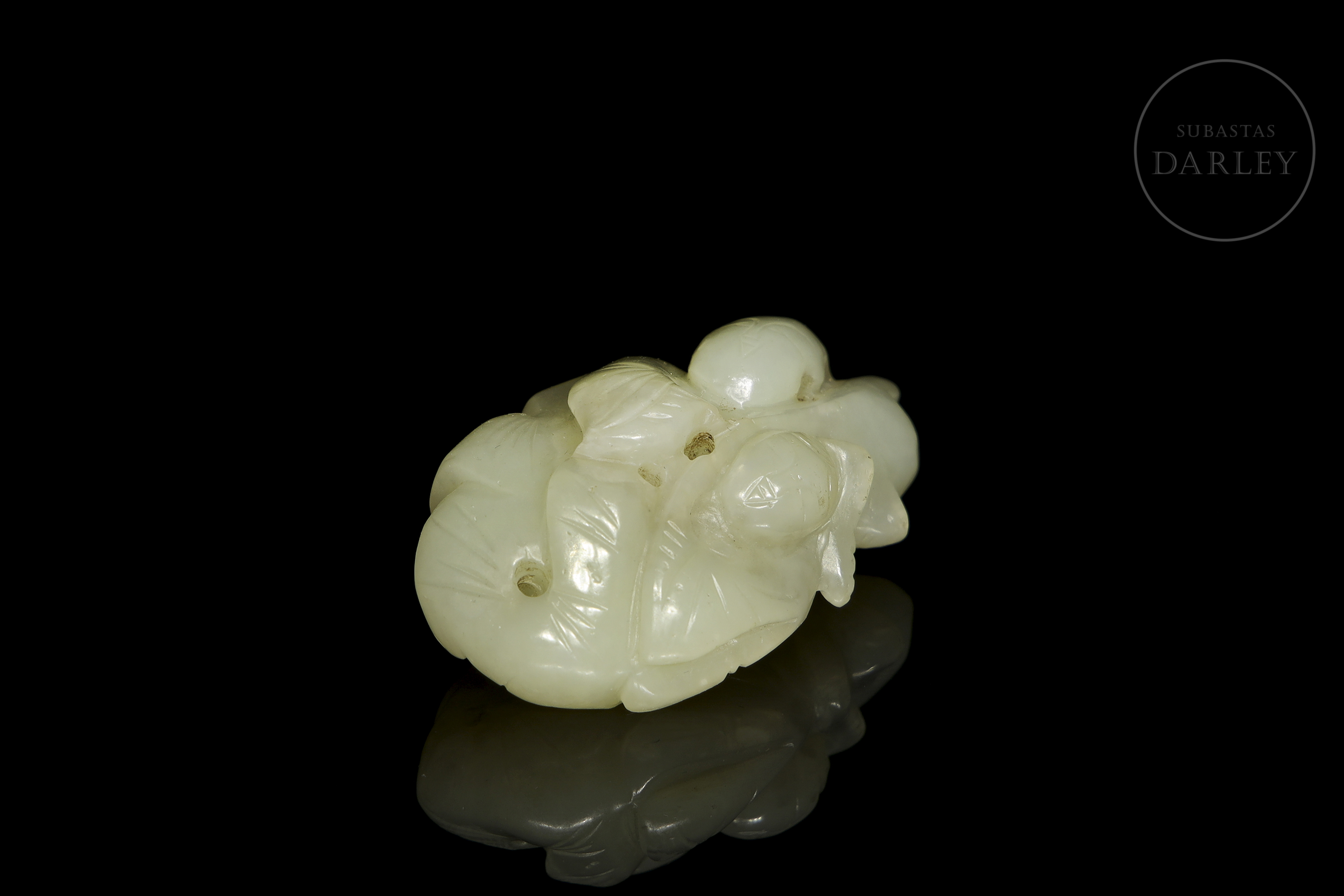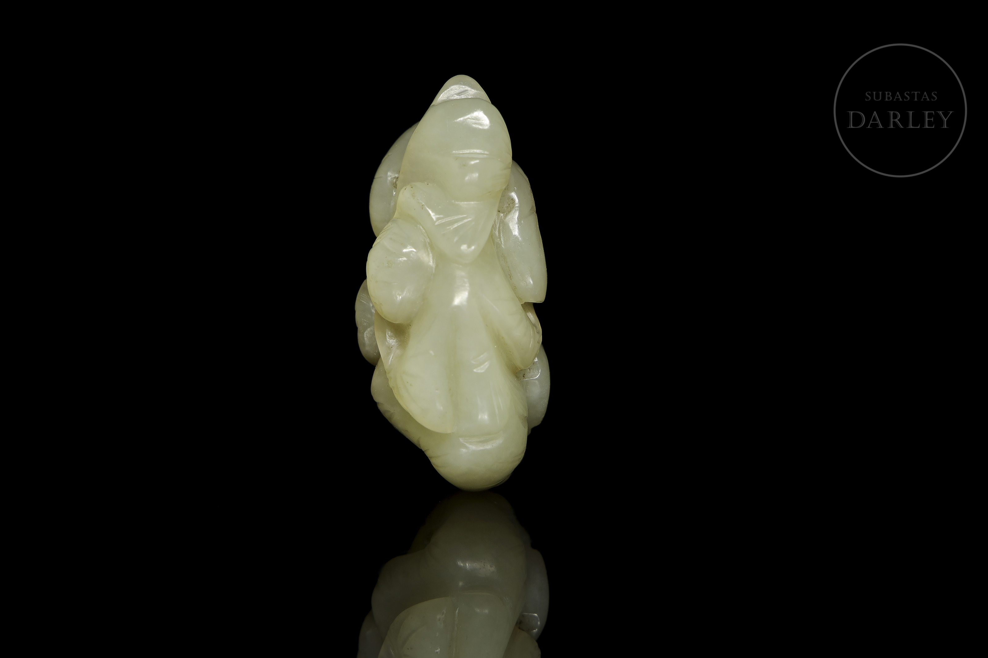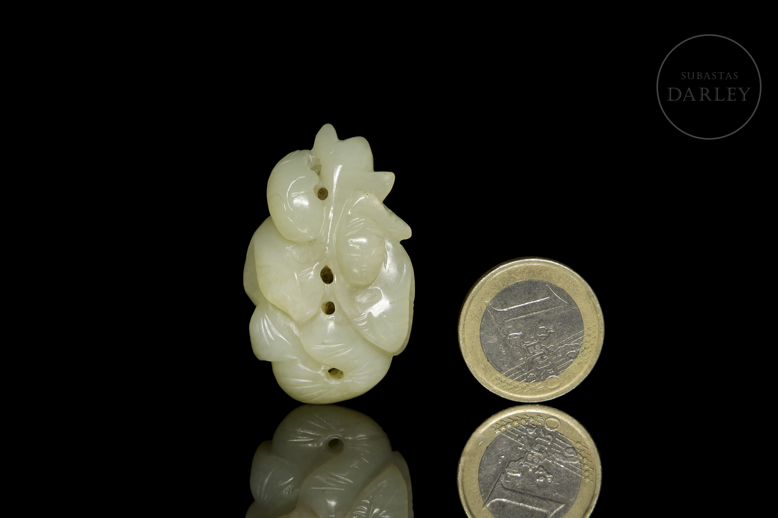 Jade blanco con un pulido de tacto sedoso. Presenta tallado una composición compleja que integra dos figuras humanas entre un profuso ramaje, todo ello definido mediante líneas incisas y calados. Posee una serie de perforaciones que permiten su suspensión. Dinastía Qing (1644–1912).
