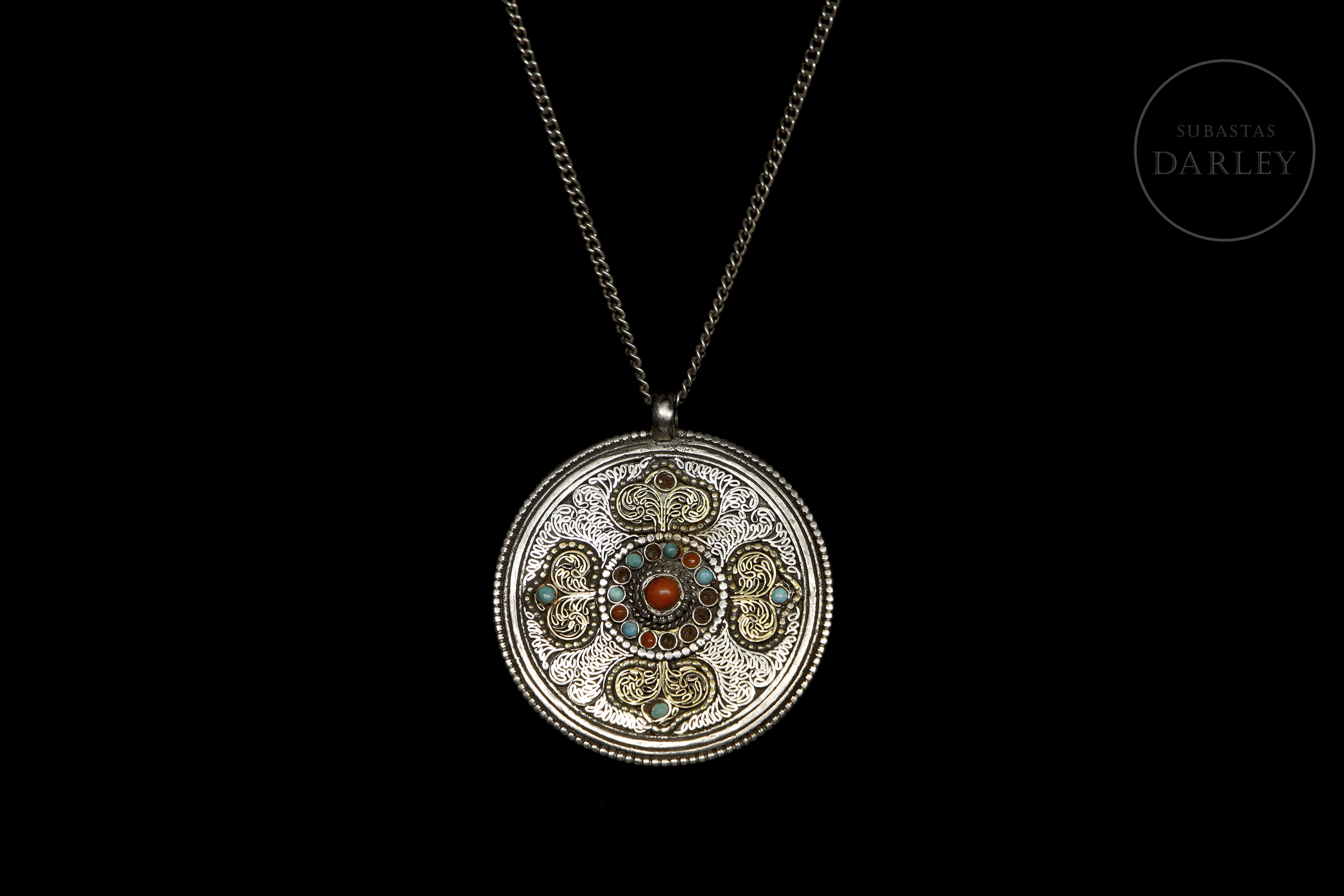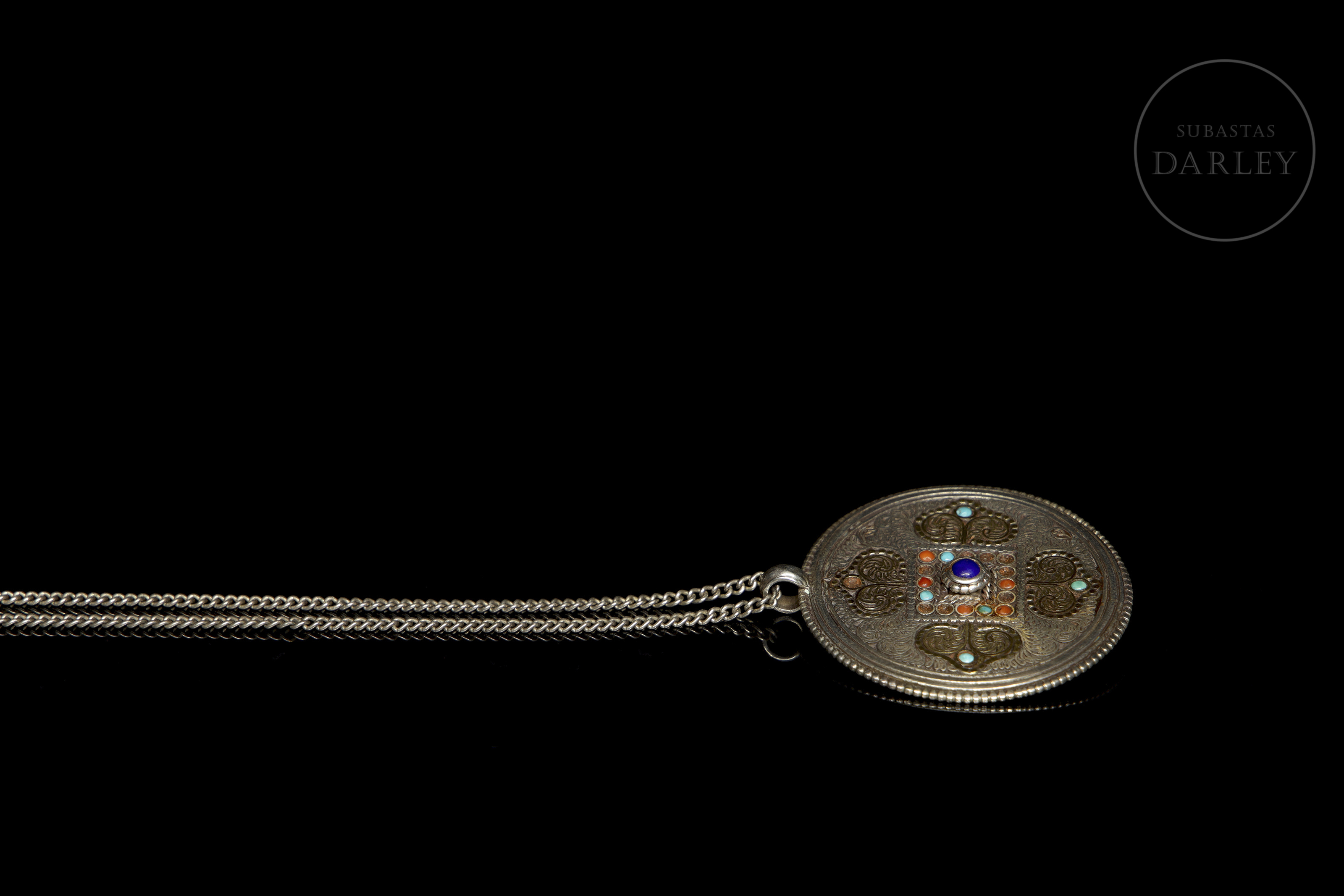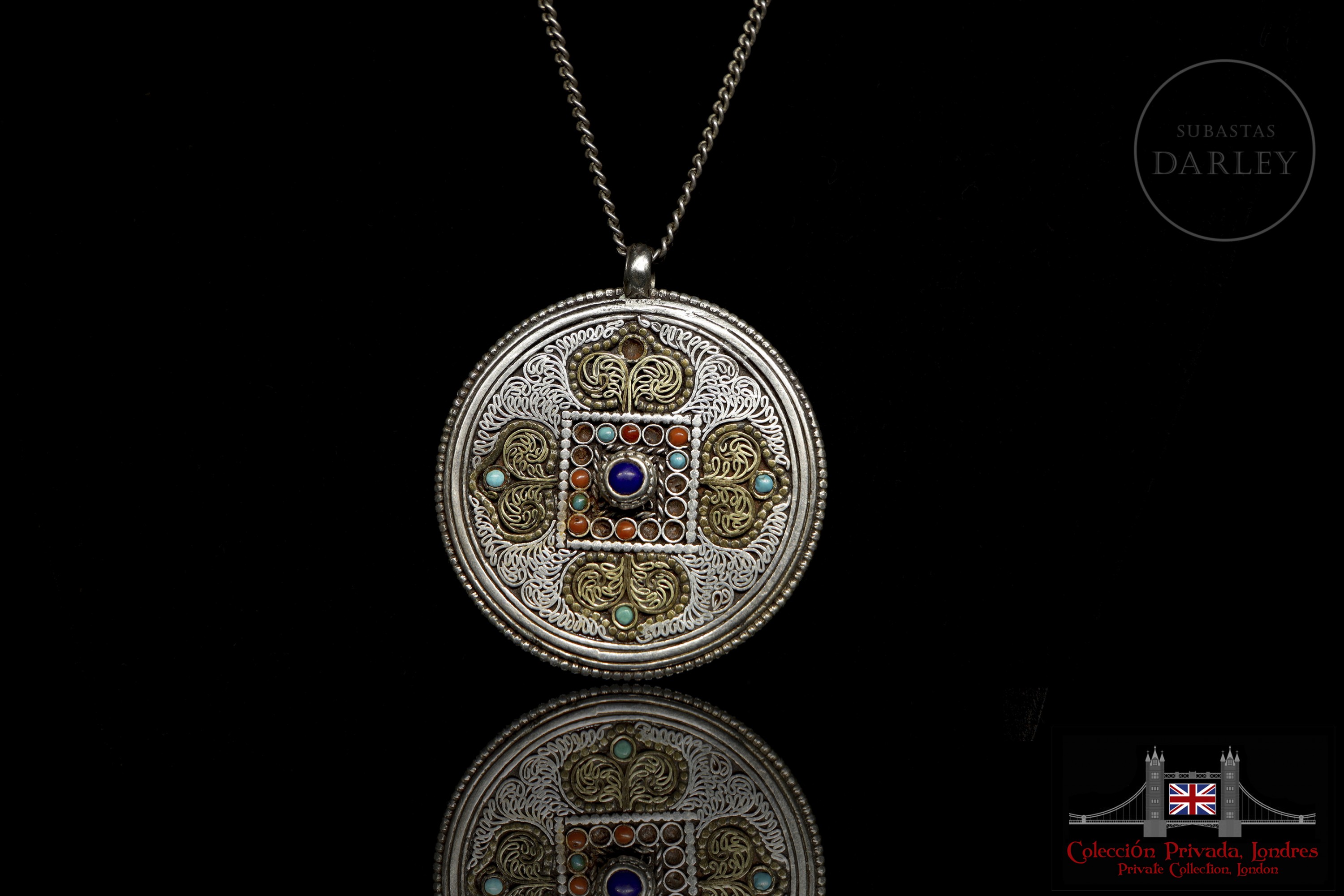 Colgante de forma circular elaborado en plata con delicados trabajos de filigrana y detalles ornamentales en relieve. La pieza presenta un diseño simétrico, destacando en el centro una composición cuadrada decorada con pequeñas piedras incrustadas en tonos turquesa, coral y una piedra central en color azul intenso. Alrededor del motivo central se disponen cuatro secciones con filigranas doradas de diseño vegetal, también enmarcadas por incrustaciones de pequeñas cuentas turquesas. La cadena es sencilla, de eslabones finos, complementando el protagonismo del colgante. Dinastía Qing (1644-1912) o posterior.
