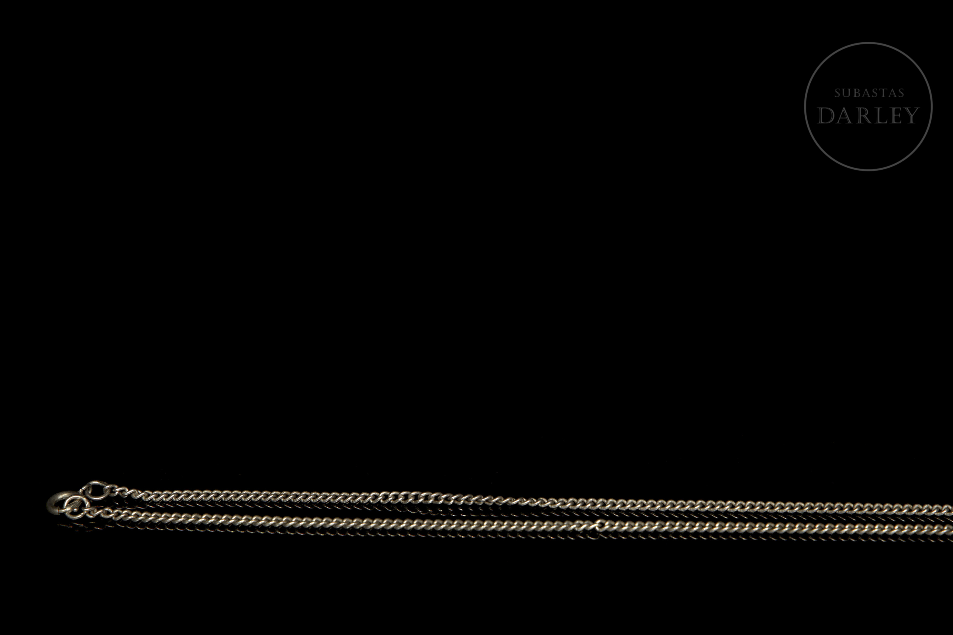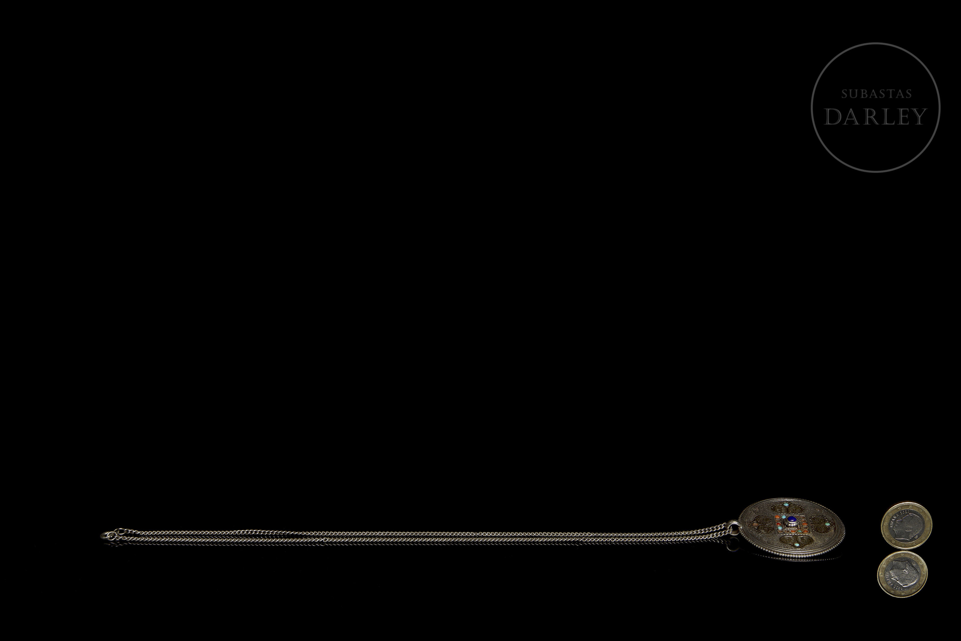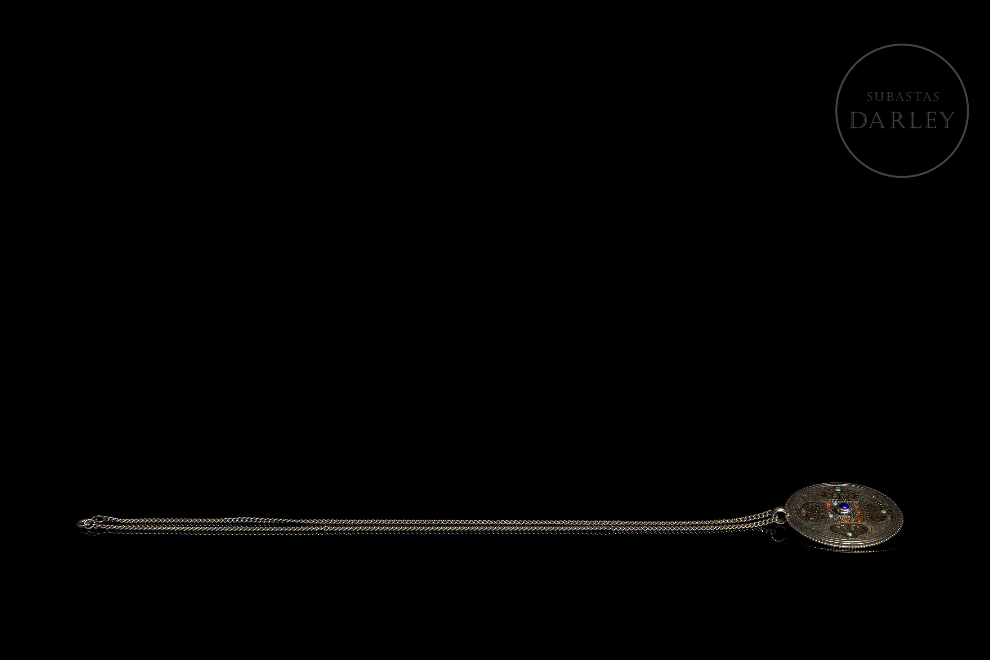 Colgante de forma circular elaborado en plata con delicados trabajos de filigrana y detalles ornamentales en relieve. La pieza presenta un diseño simétrico, destacando en el centro una composición cuadrada decorada con pequeñas piedras incrustadas en tonos turquesa, coral y una piedra central en color azul intenso. Alrededor del motivo central se disponen cuatro secciones con filigranas doradas de diseño vegetal, también enmarcadas por incrustaciones de pequeñas cuentas turquesas. La cadena es sencilla, de eslabones finos, complementando el protagonismo del colgante. Dinastía Qing (1644-1912) o posterior.