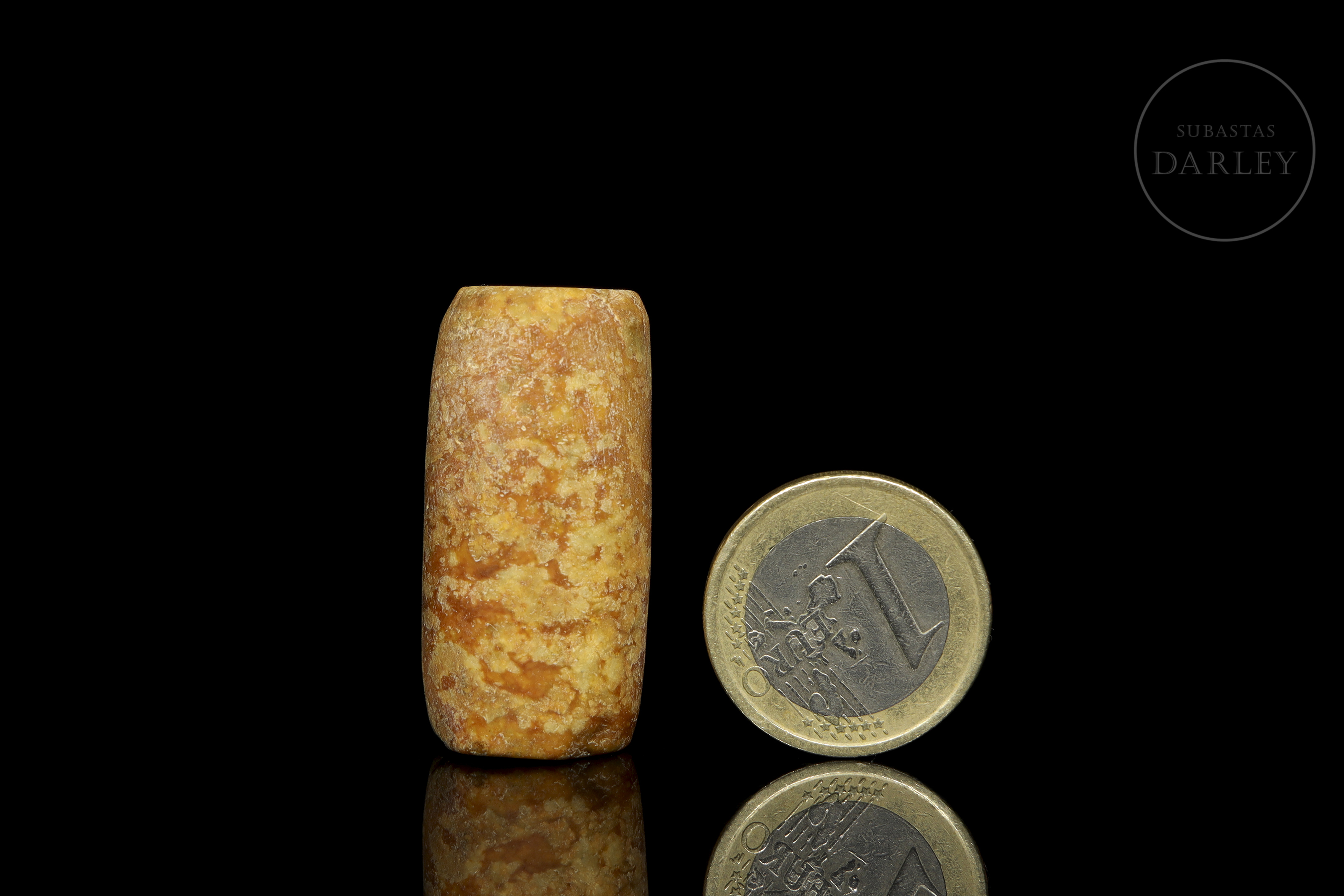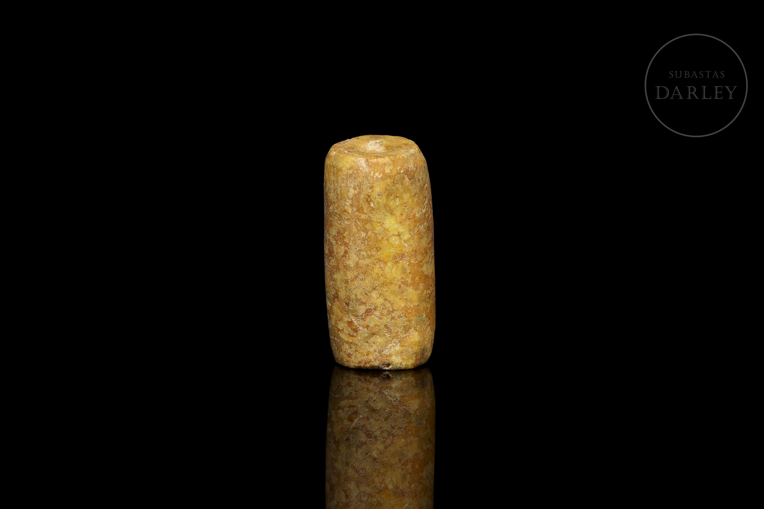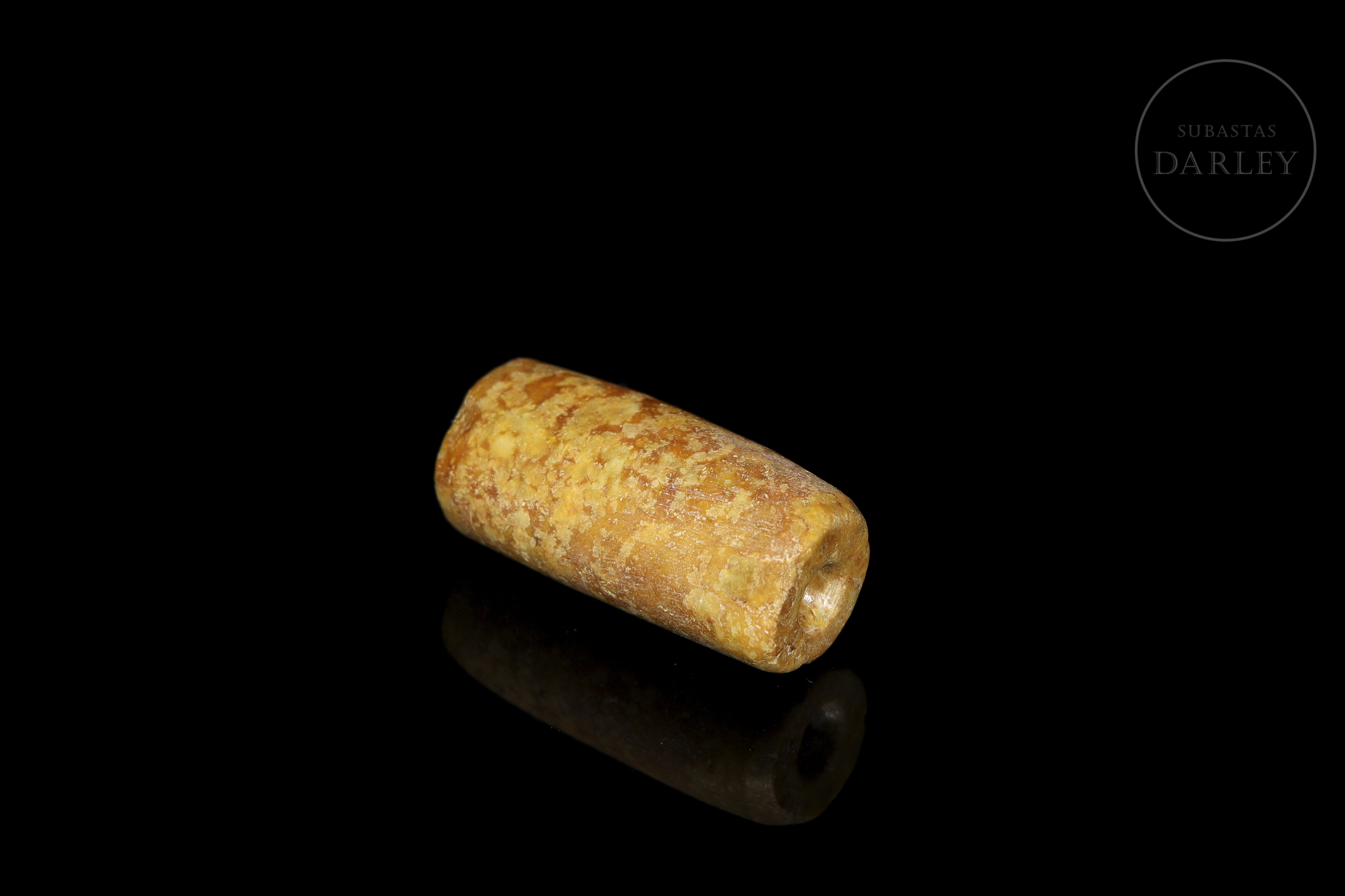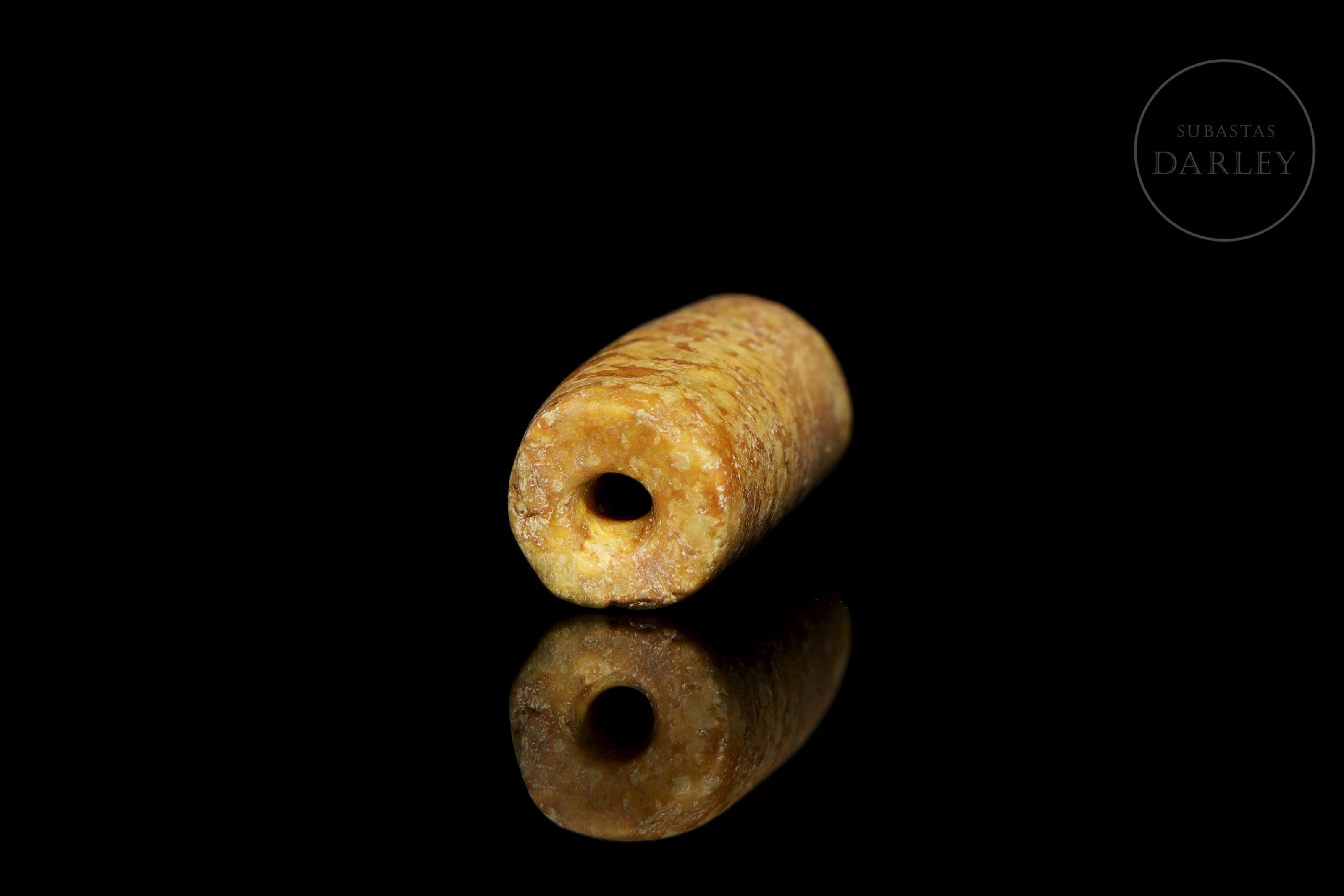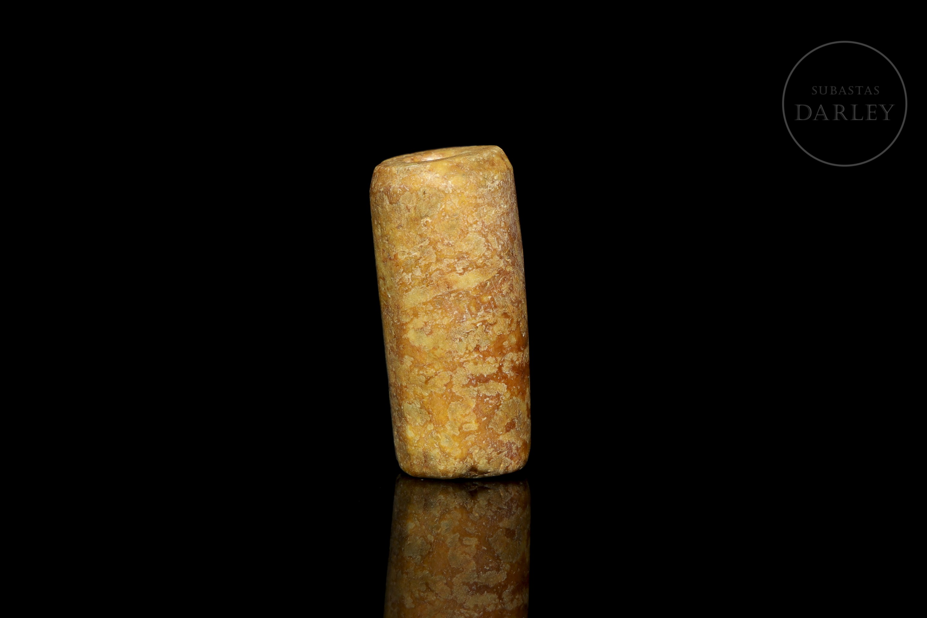 Jade tallado de tonalidad ocre amarillenta. La pieza presenta un formato cilíndrico simple e irregular, con una perforación longitudinal para su suspensión ritual. La superficie muestra pátina y desgaste por envejecimiento. Cultura Hongshan (aprox. 4000–3000 a.C.) o posterior.