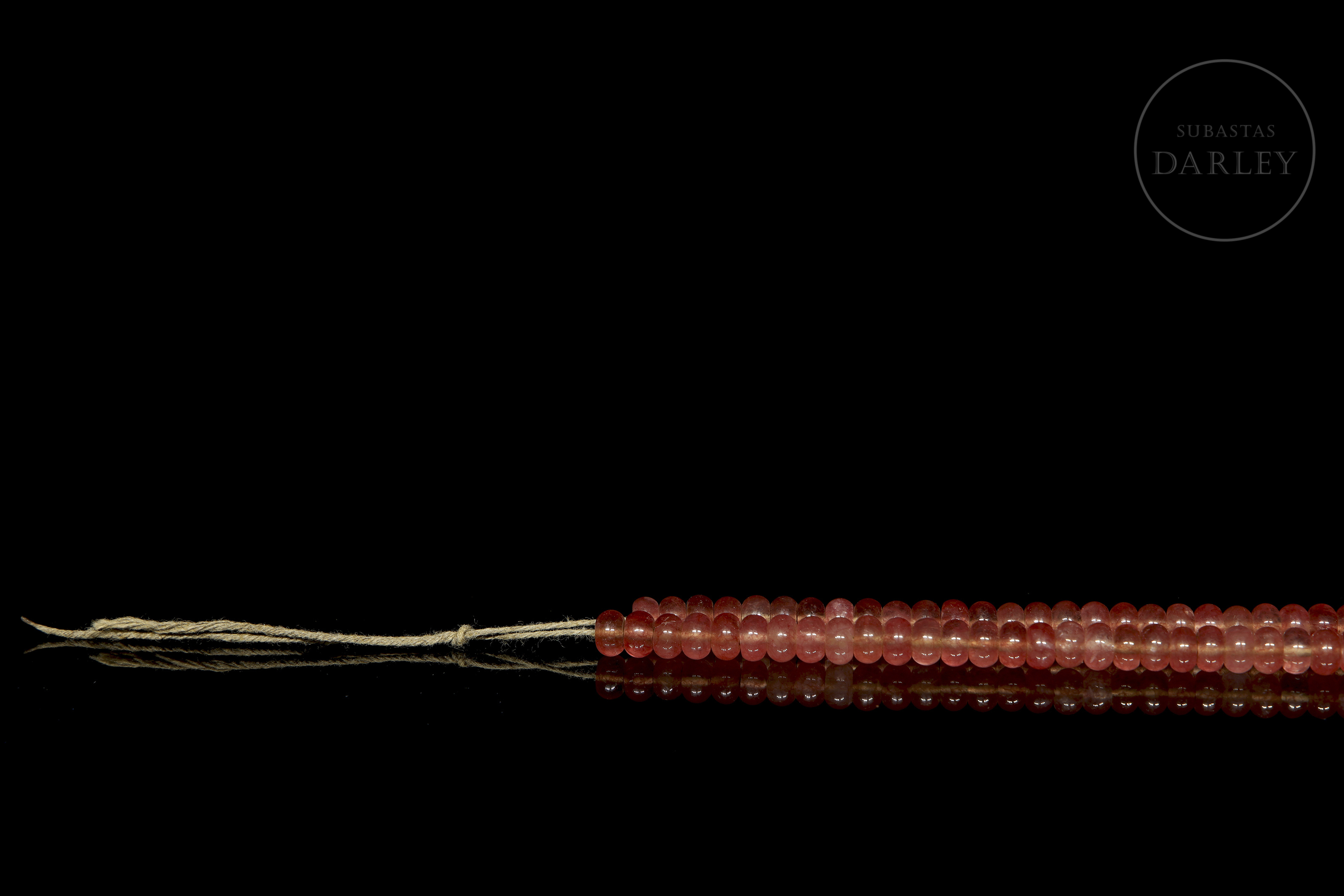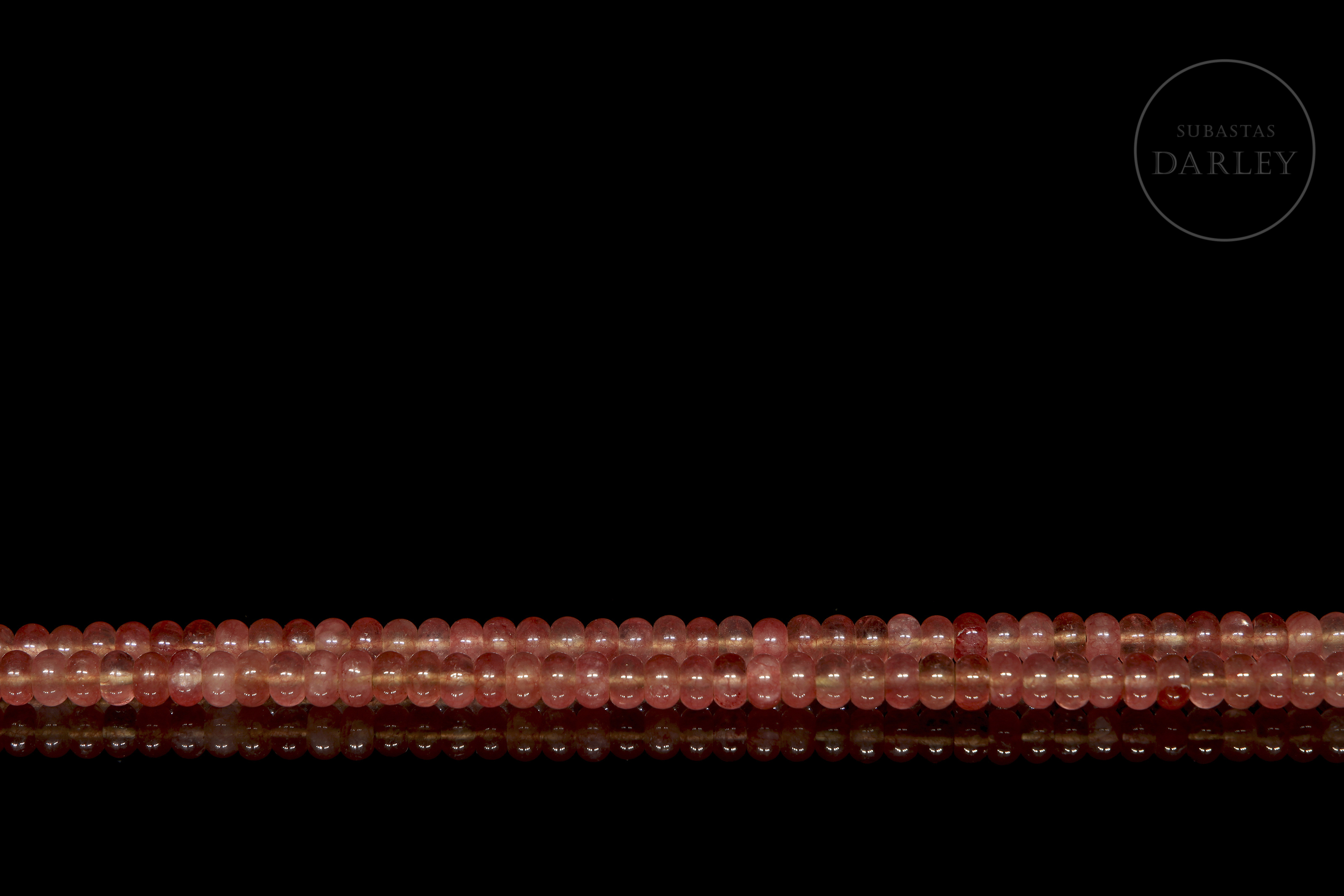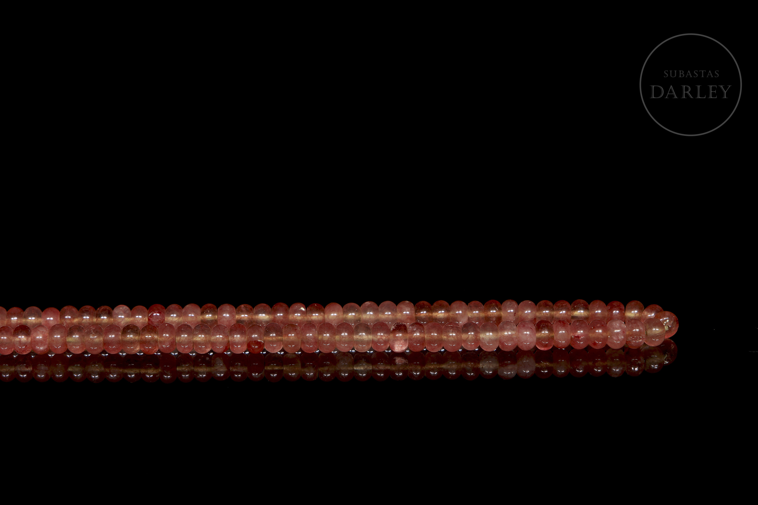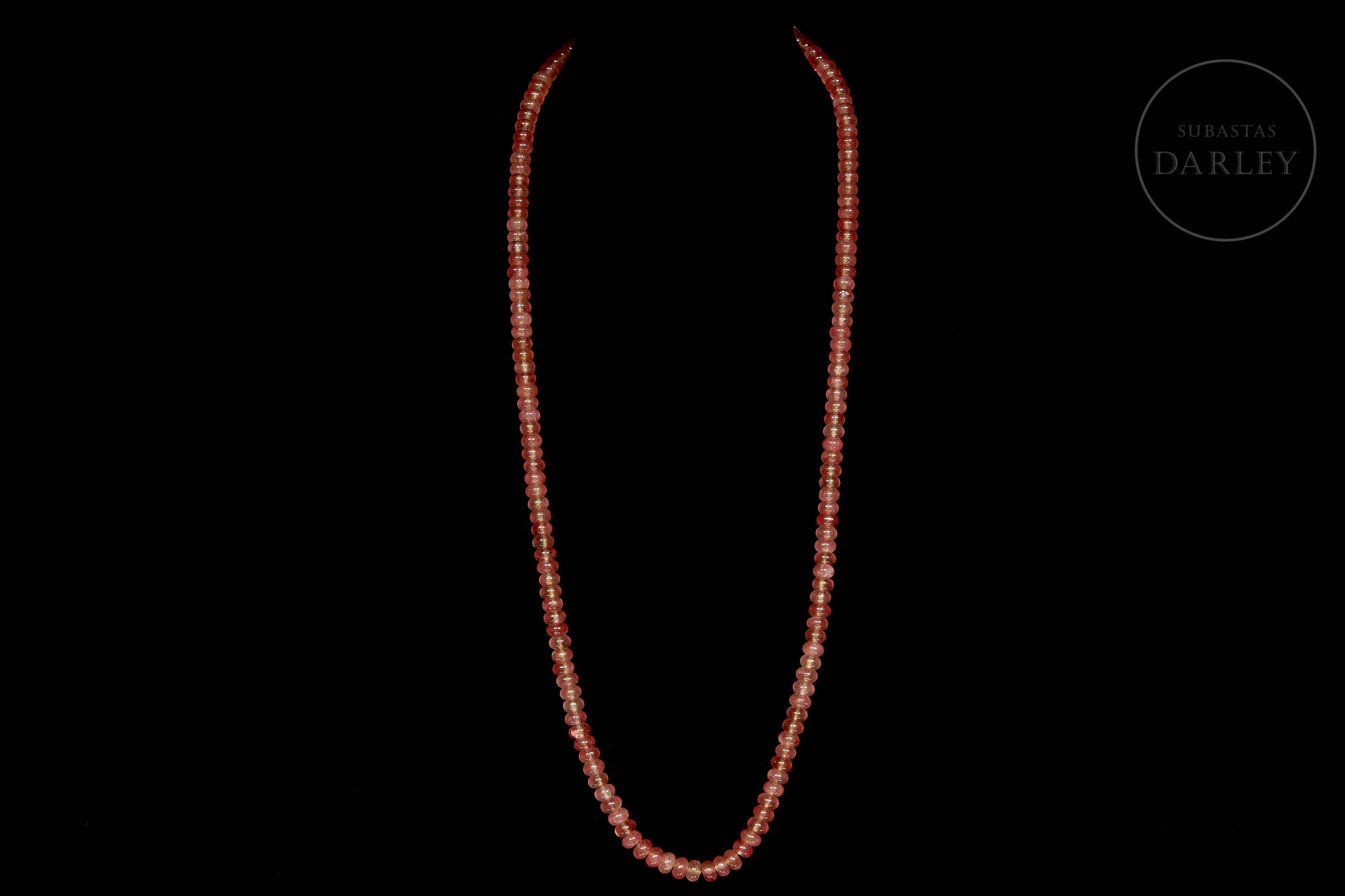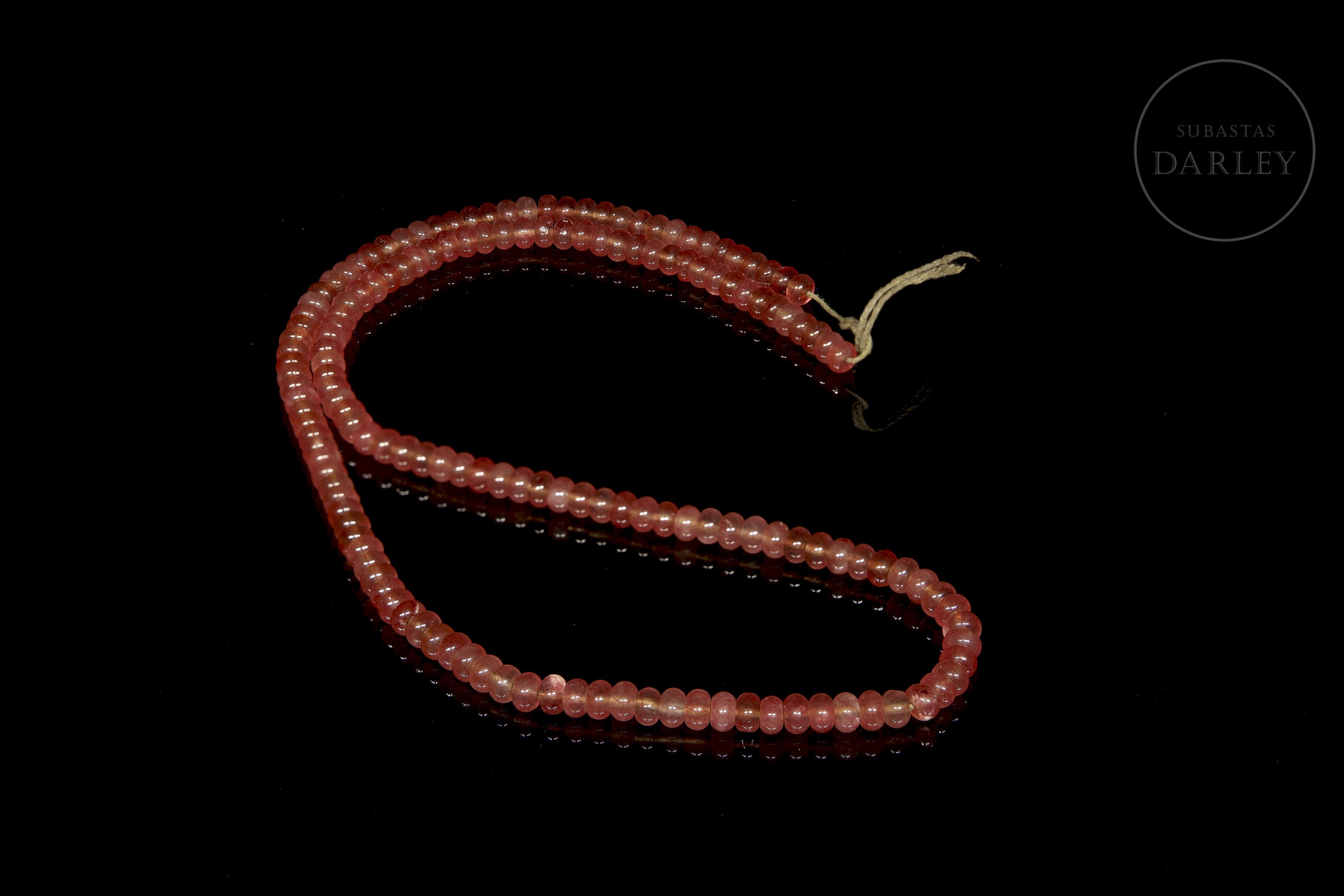 Collar compuesto por pequeñas cuentas de tonalidad rosada, con vetas de mayor intensidad y gran transparencia, talladas en forma cilíndrica, con el perfil achatado y una perforación central para ser montado en un grueso hilo.