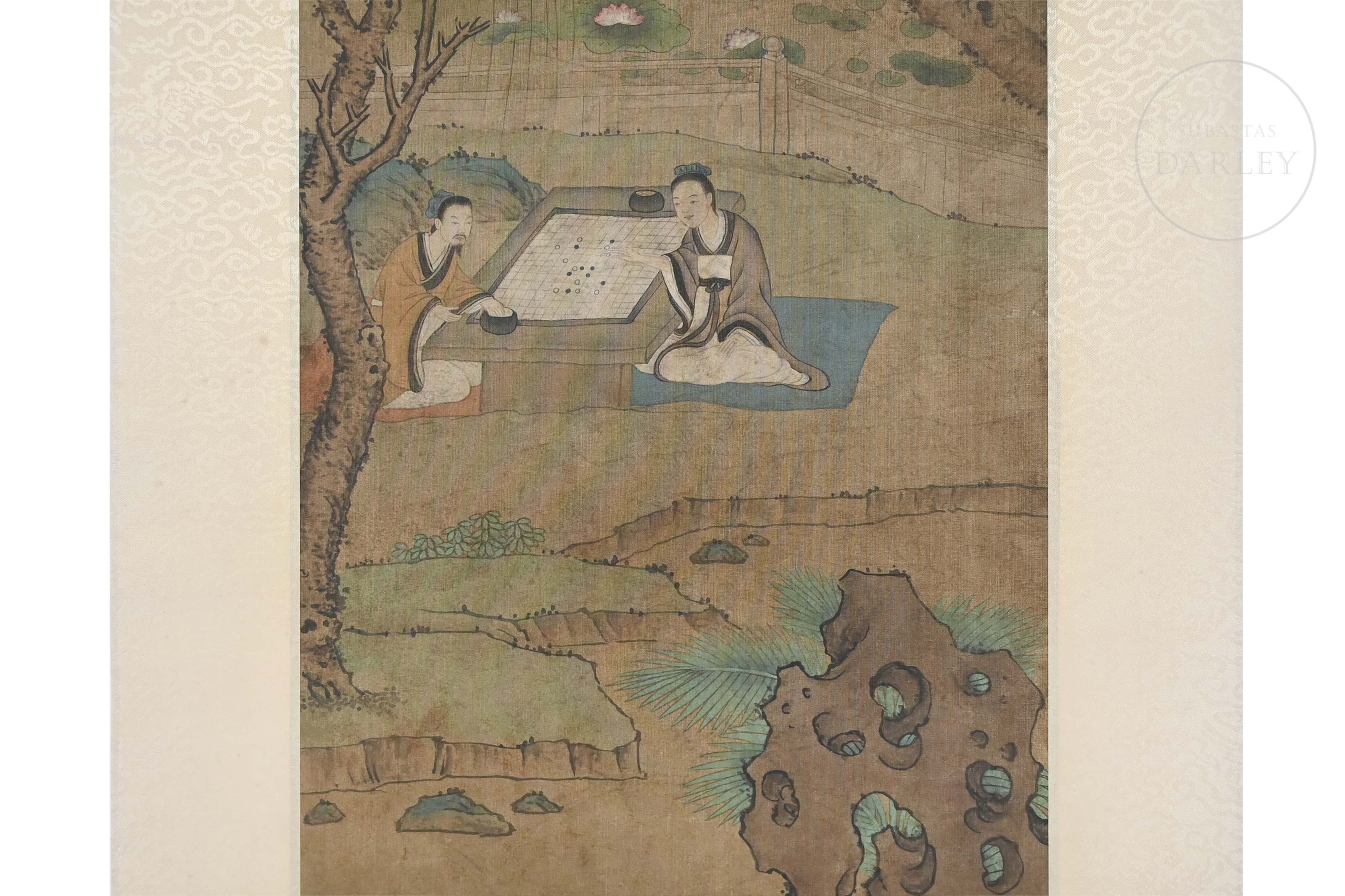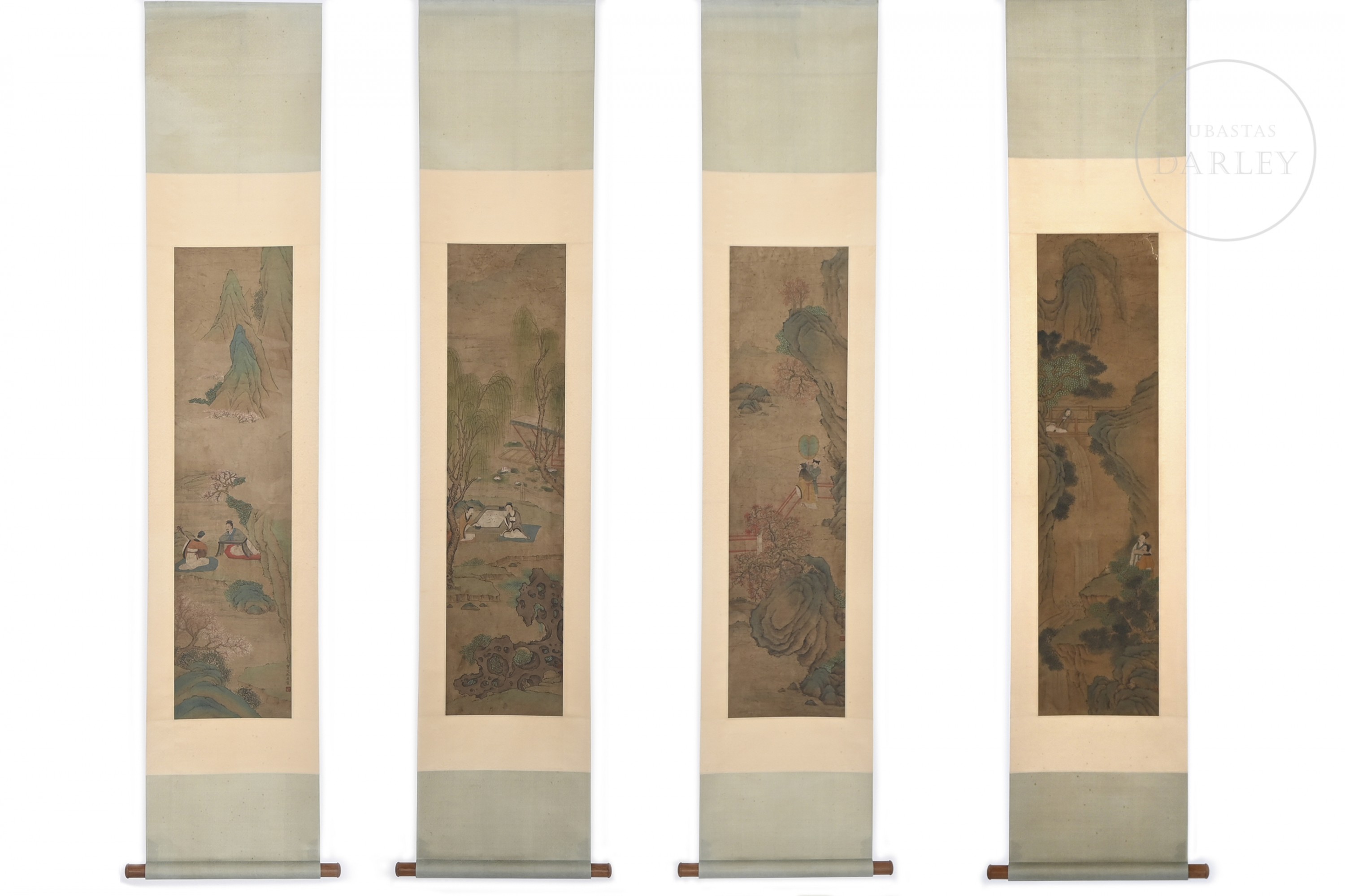 Conjunto de cuatro pinturas chinas "Escenas de jardín", con firma Qiu Ying