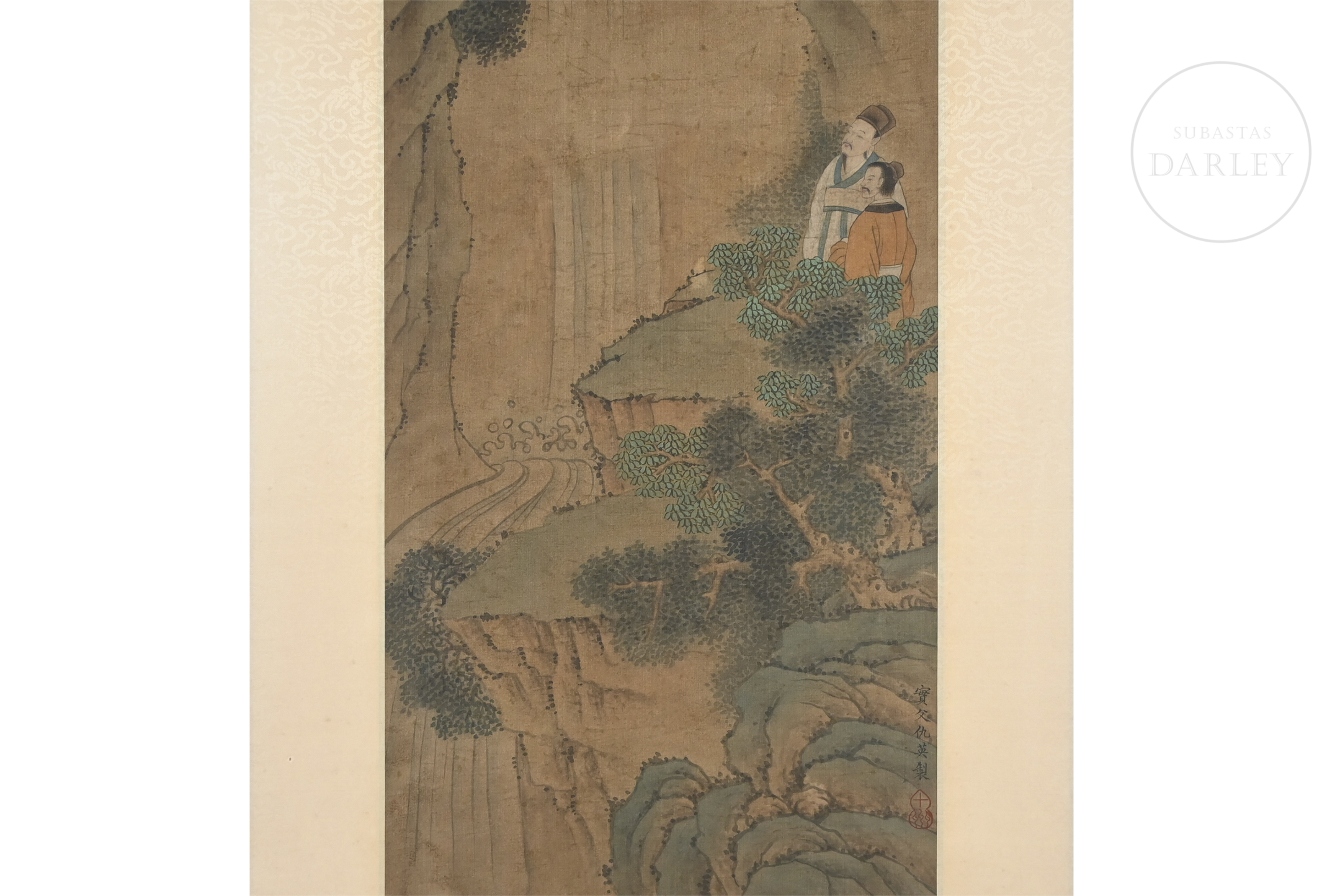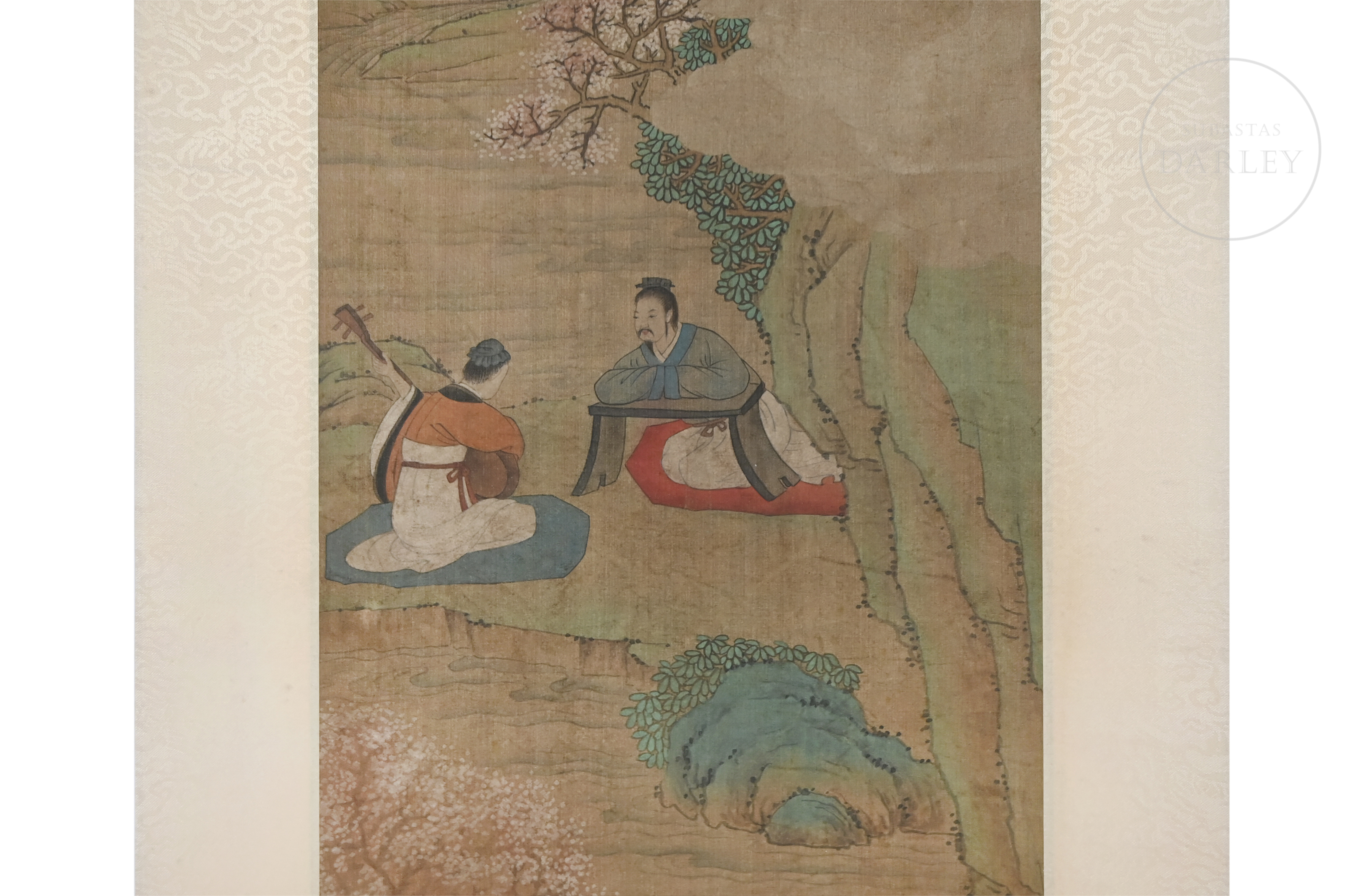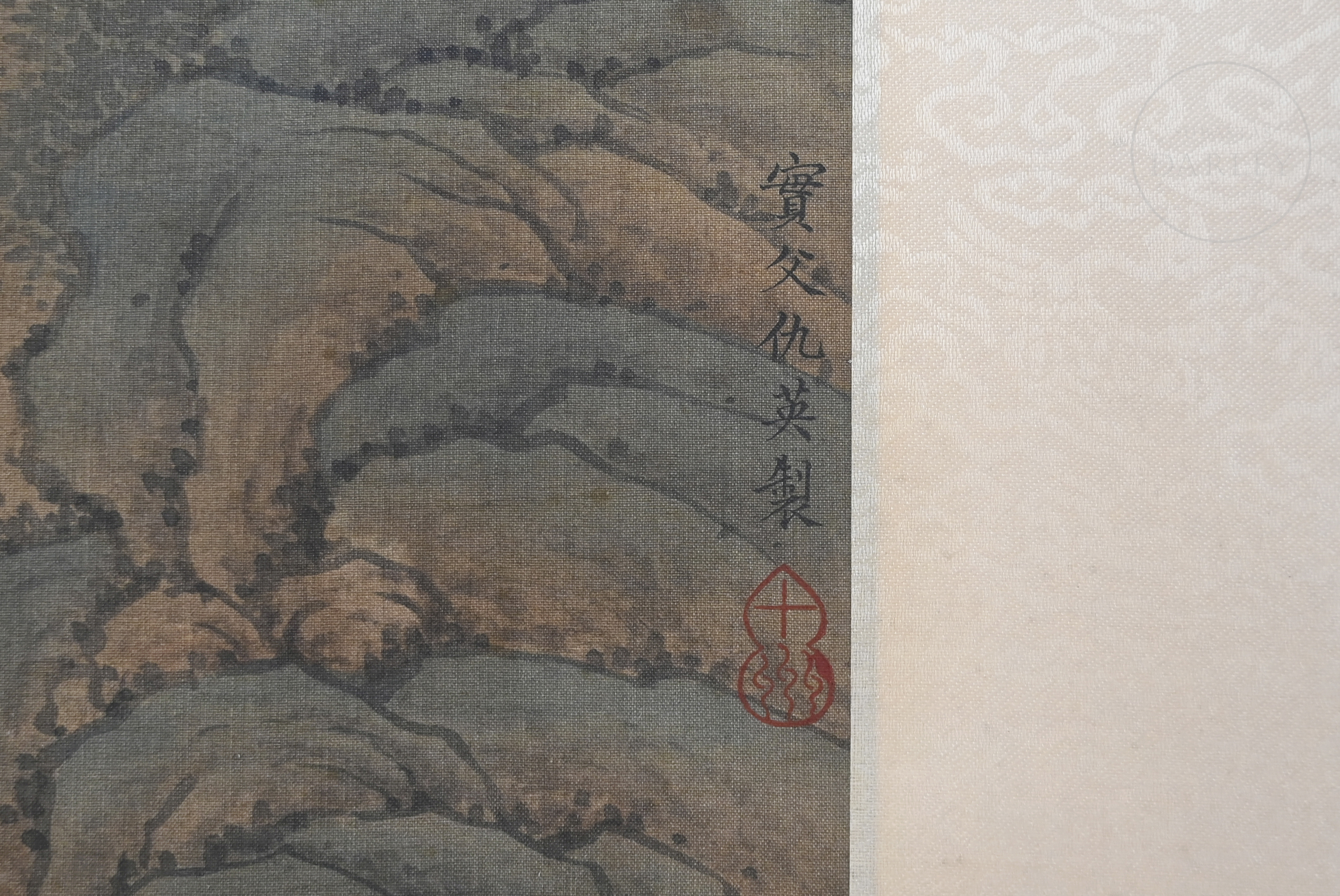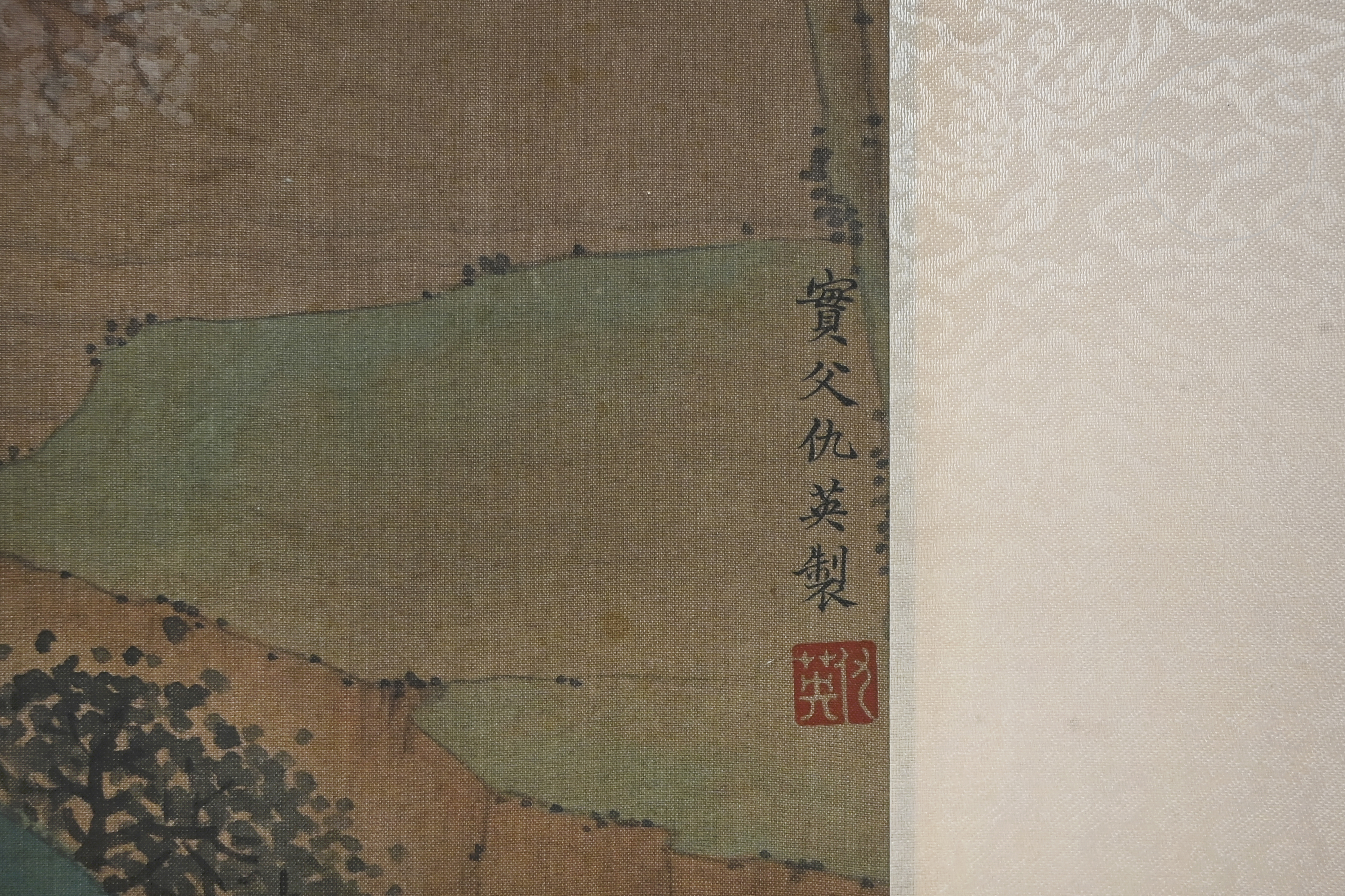 Pinturas realizadas en tinta y pigmentos sobre seda, montadas en cuatro marcos de seda brocada. Las escenas representan temas de género de literatos en paisaje: conversación junto al río, partida de weiqi bajo los sauces, paseo por pasarelas entre rocas y contemplación de cascadas, todo en parajes montañosos con vegetación y formaciones rocosas. En cada pieza aparece la inscripción "宝父仇英制", acompañada de un sello en rojo "仇英". Qiu Ying (ca. 1494–1552).