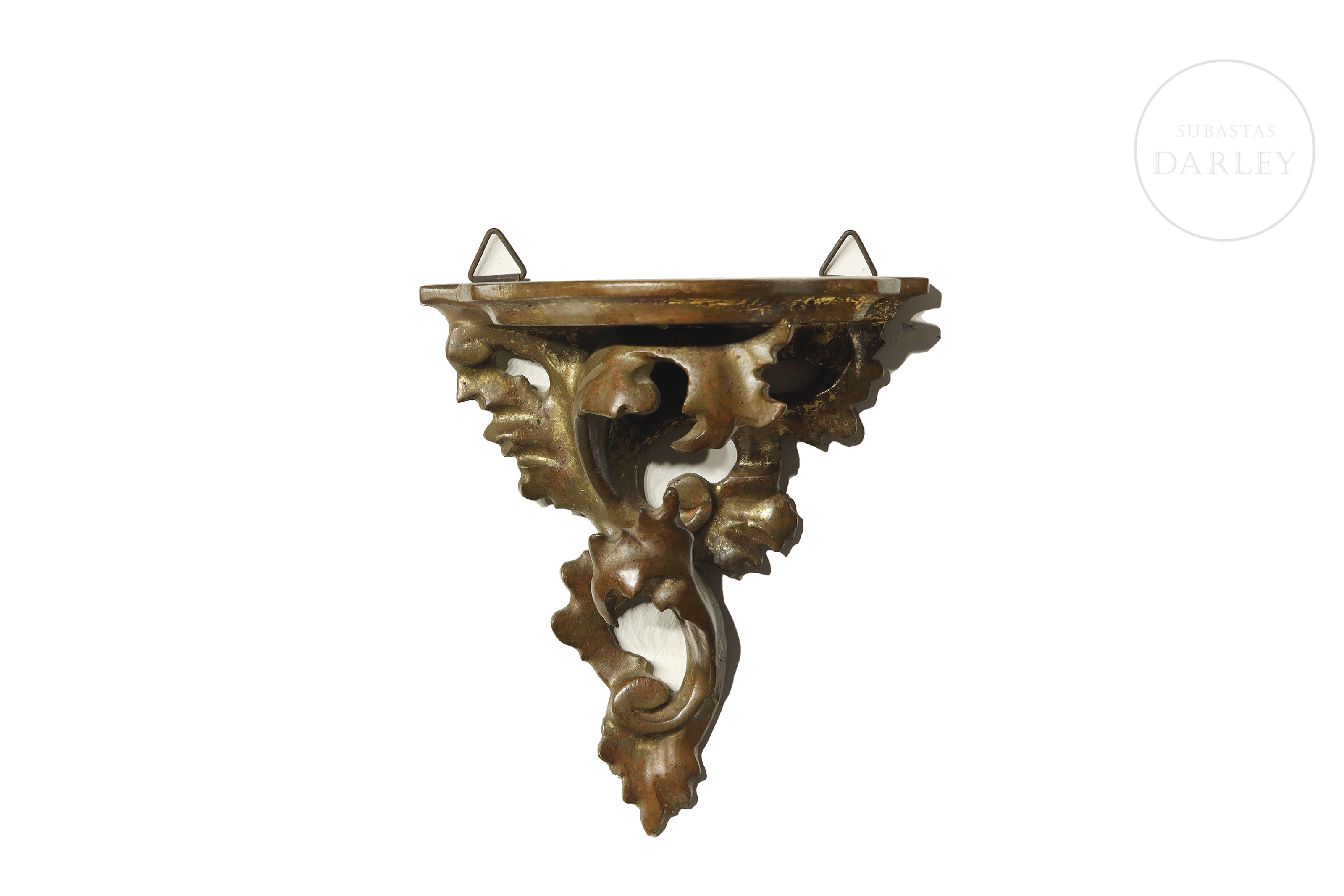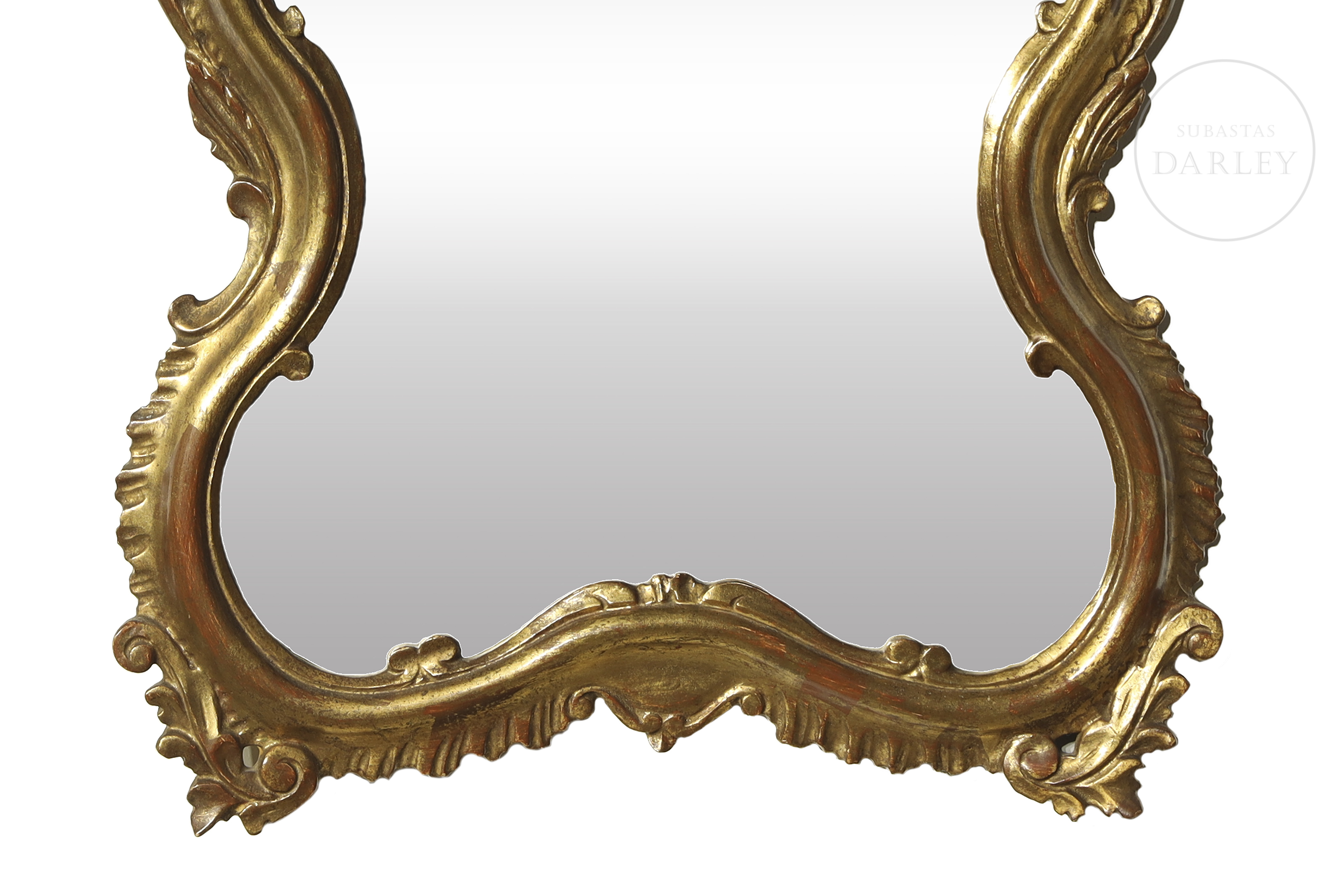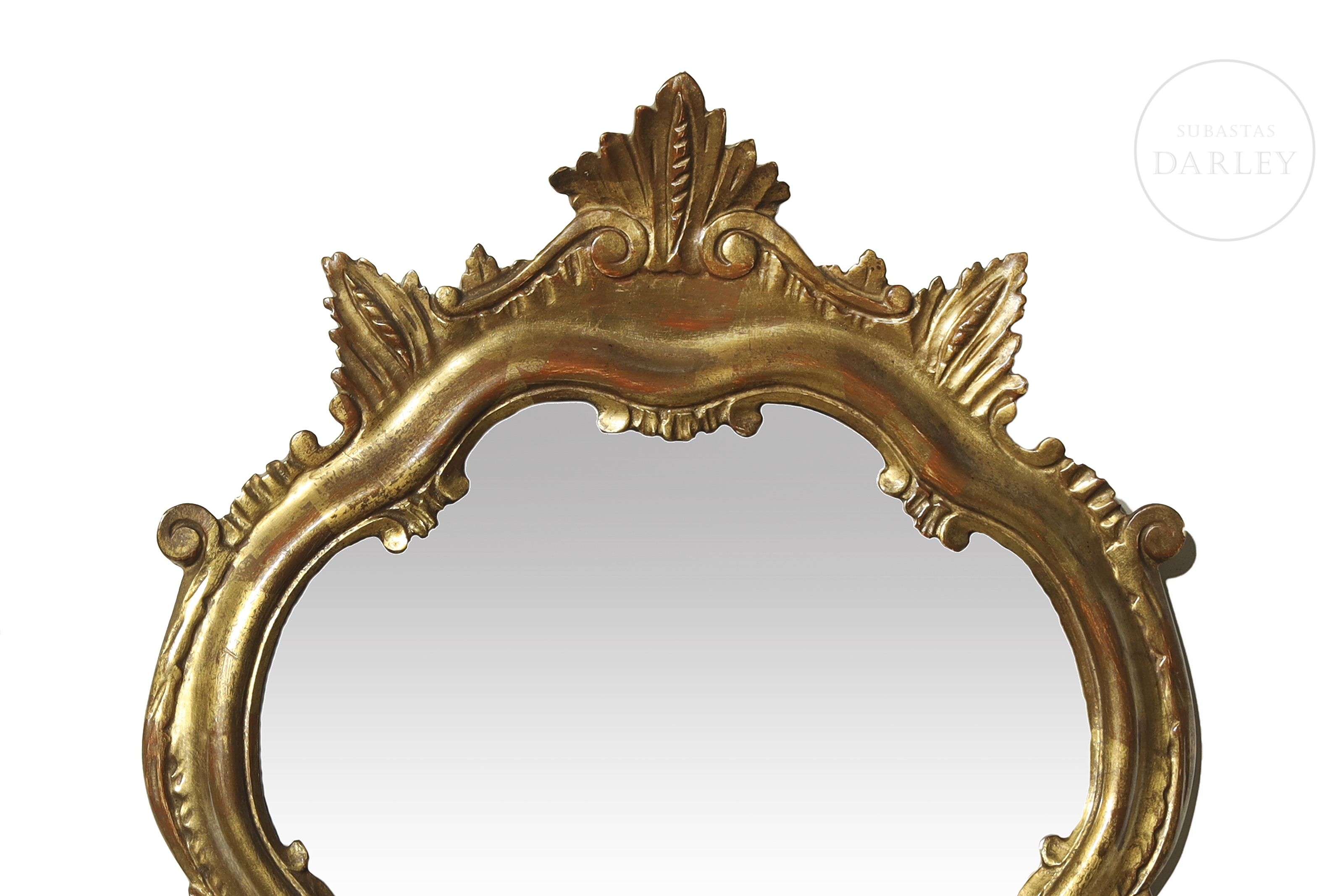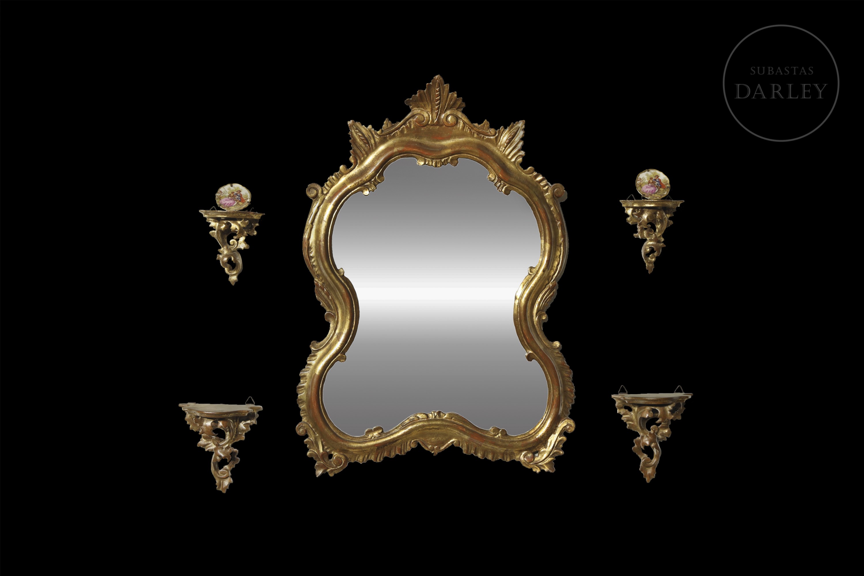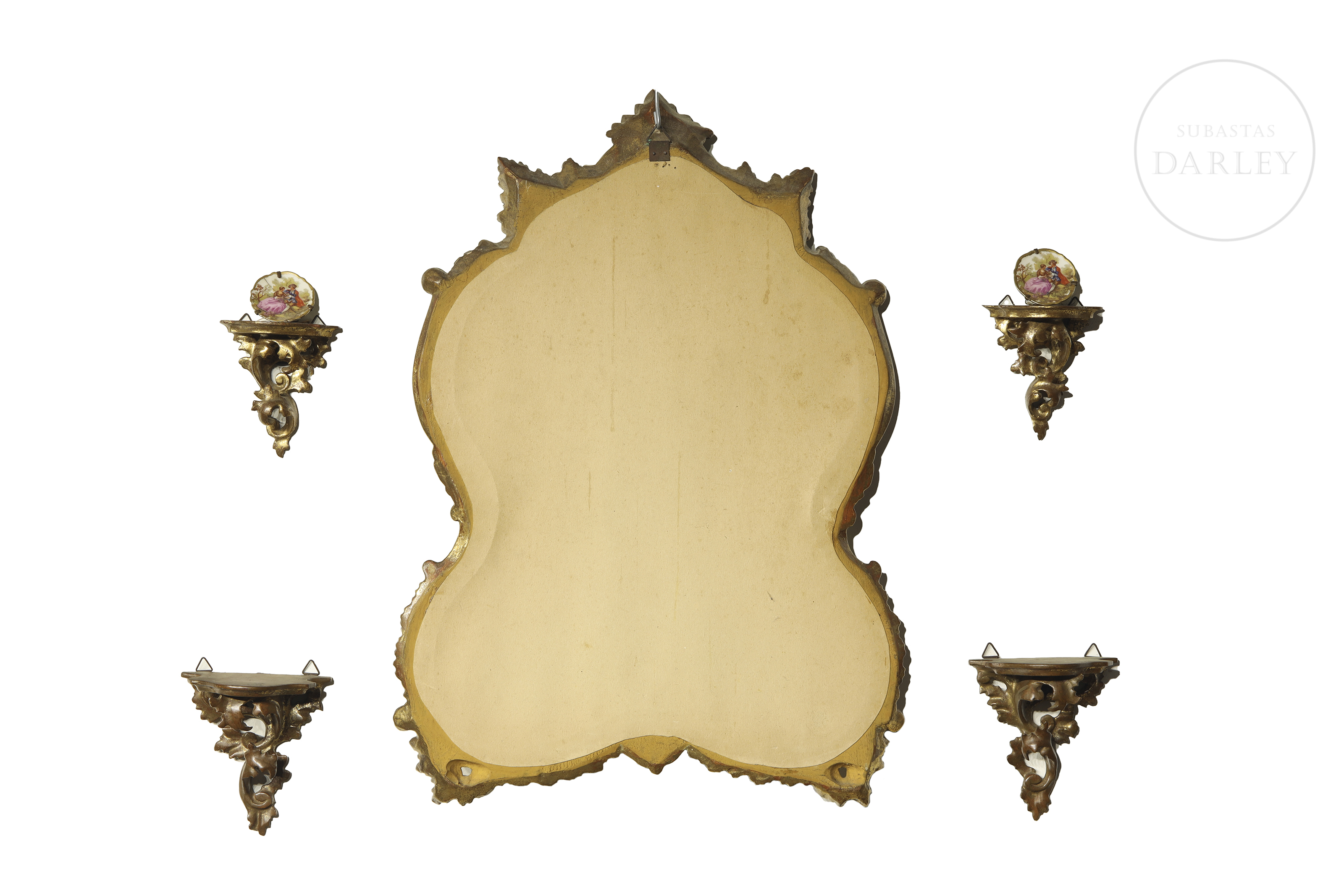 Espejo en madera tallada y dorada, acompañado por cuatro pequeñas cornucopias de estética similar, adornadas con hojas y volutas.