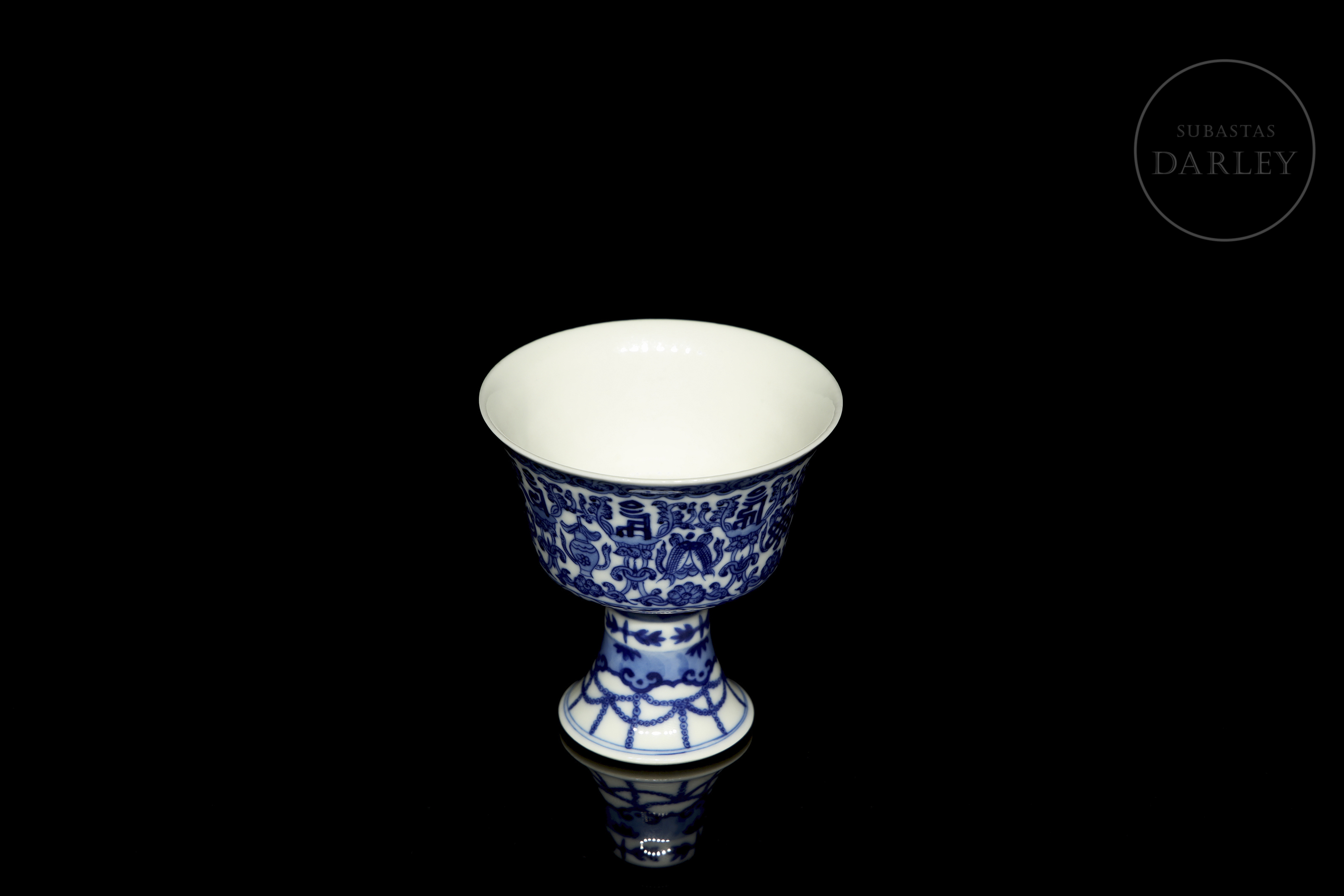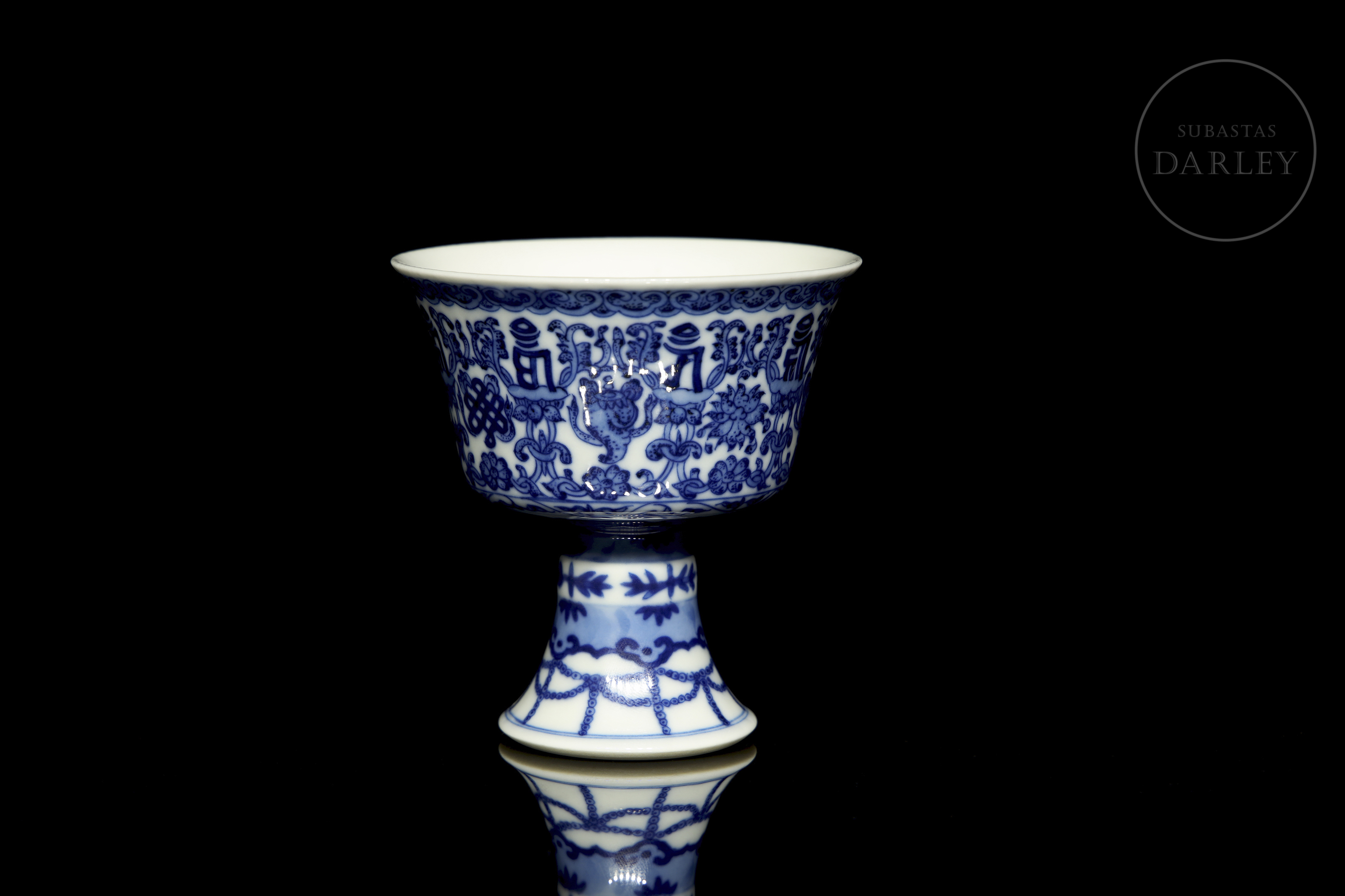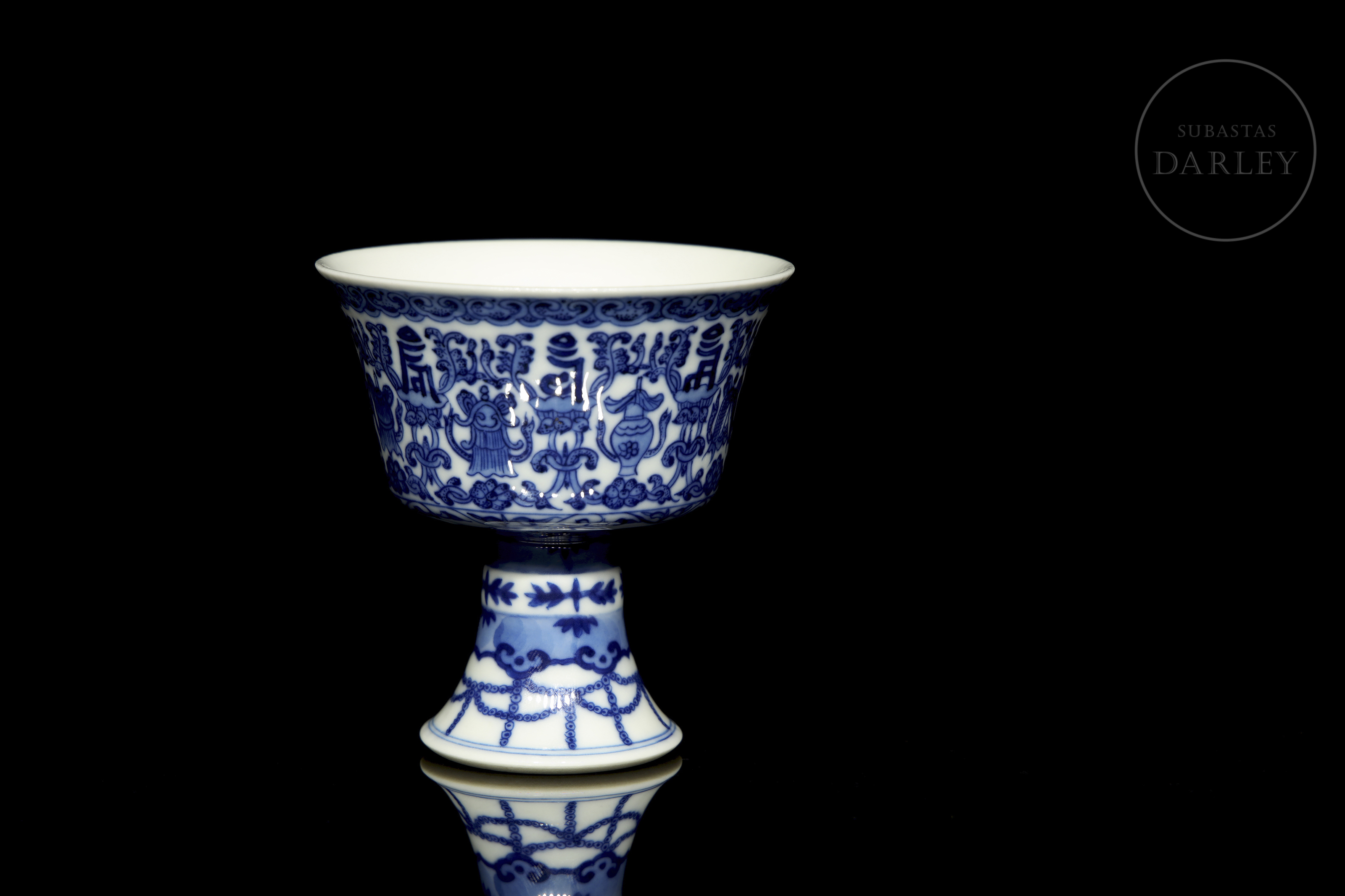 Copa ceremonial en porcelana esmaltada en azul cobalto sobre fondo blanco. El cuerpo troncocónico se alza sobre un alto pie acampanado, y presenta decoración continua de los "ocho emblemas budistas" (bajixiang) entre motivos florales y guirnaldas. El borde superior está delimitado por una cenefa de volutas, mientras que la base del pie muestra una orla de cintas colgantes estilizadas. En la base se aprecia un sello apócrifo de seis caracteres en azul bajo cubierta: "大清道光年製".