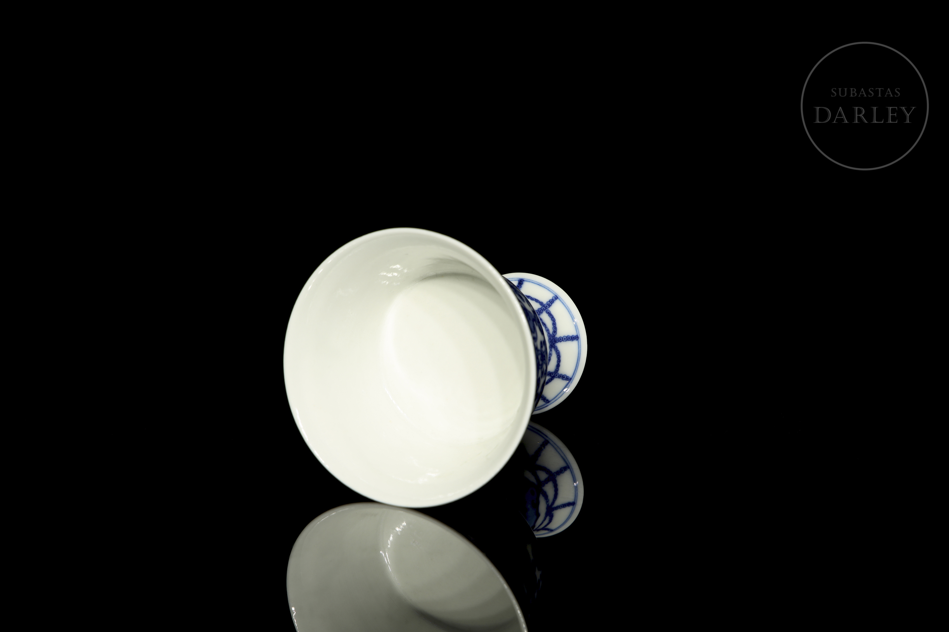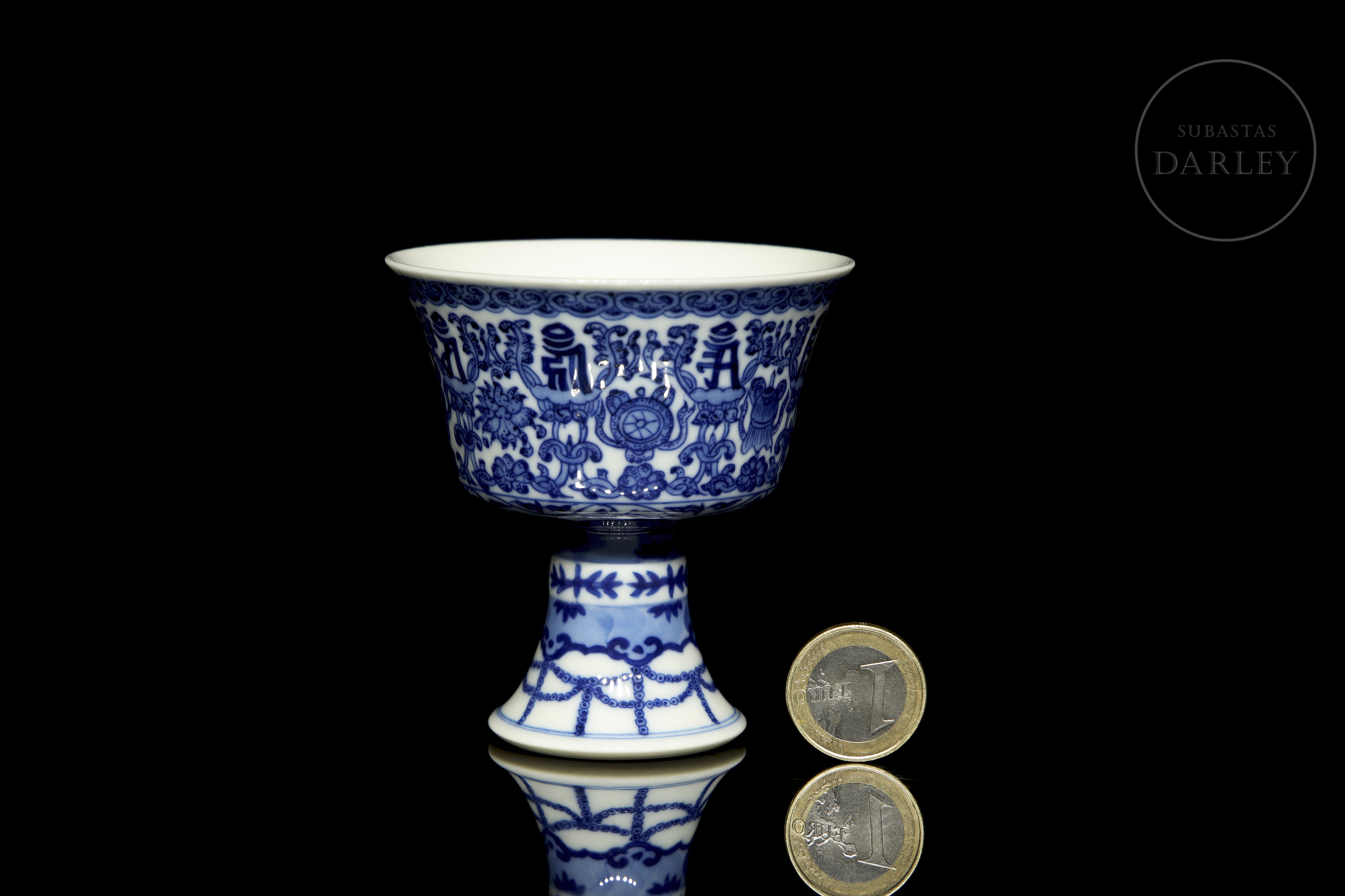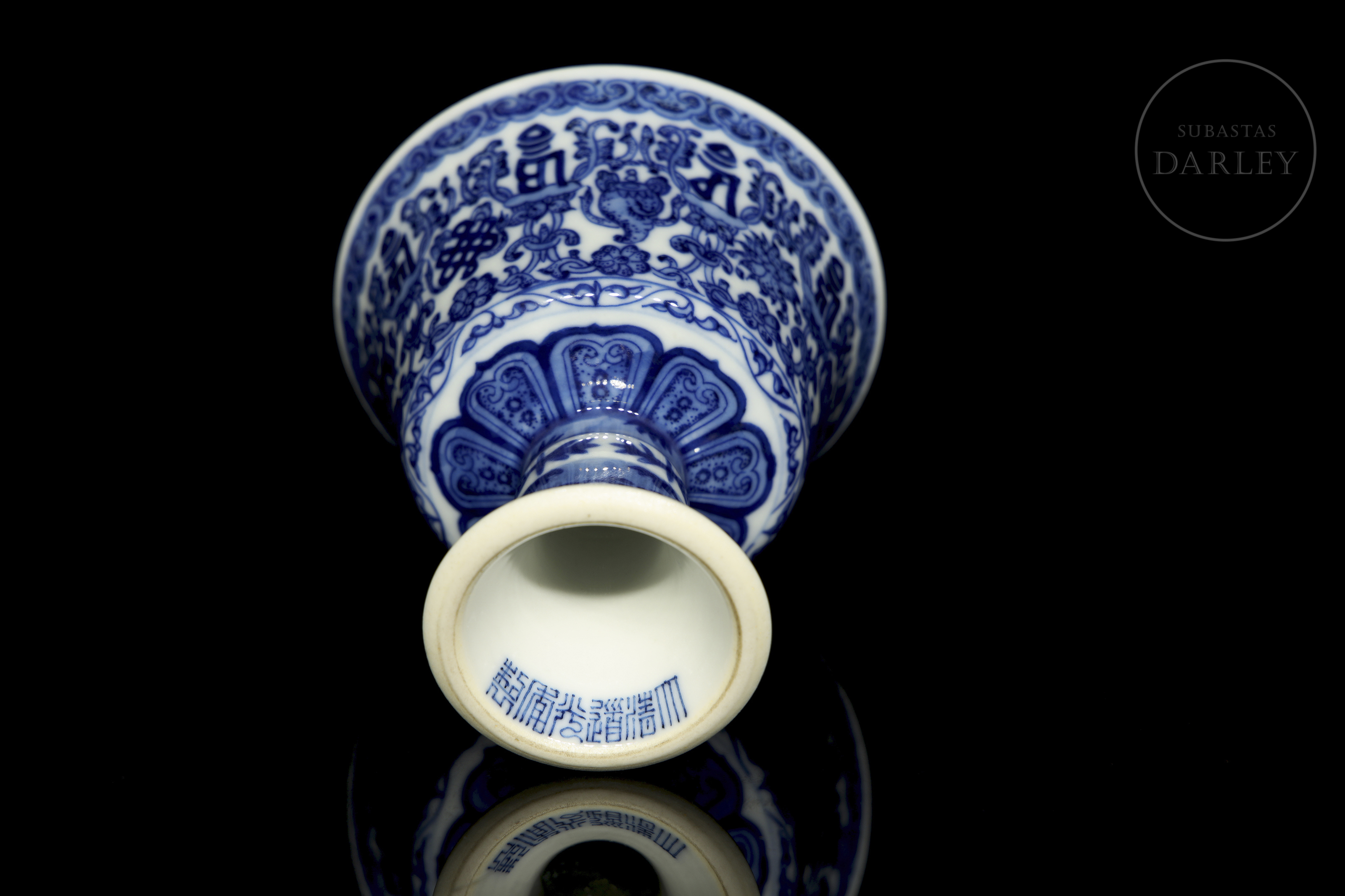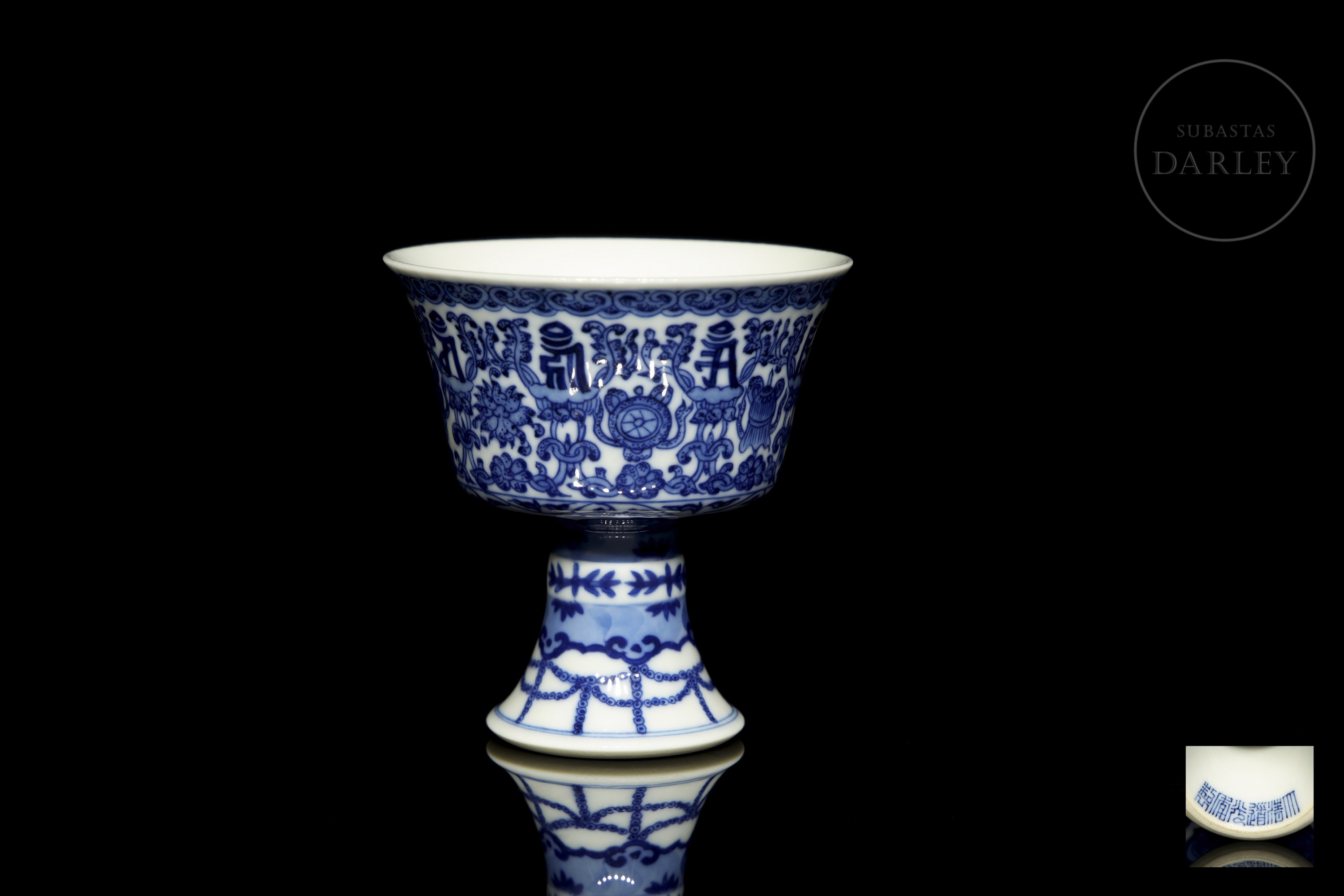 Copa ceremonial en porcelana esmaltada en azul cobalto sobre fondo blanco. El cuerpo troncocónico se alza sobre un alto pie acampanado, y presenta decoración continua de los "ocho emblemas budistas" (bajixiang) entre motivos florales y guirnaldas. El borde superior está delimitado por una cenefa de volutas, mientras que la base del pie muestra una orla de cintas colgantes estilizadas. En la base se aprecia un sello apócrifo de seis caracteres en azul bajo cubierta: "大清道光年製".