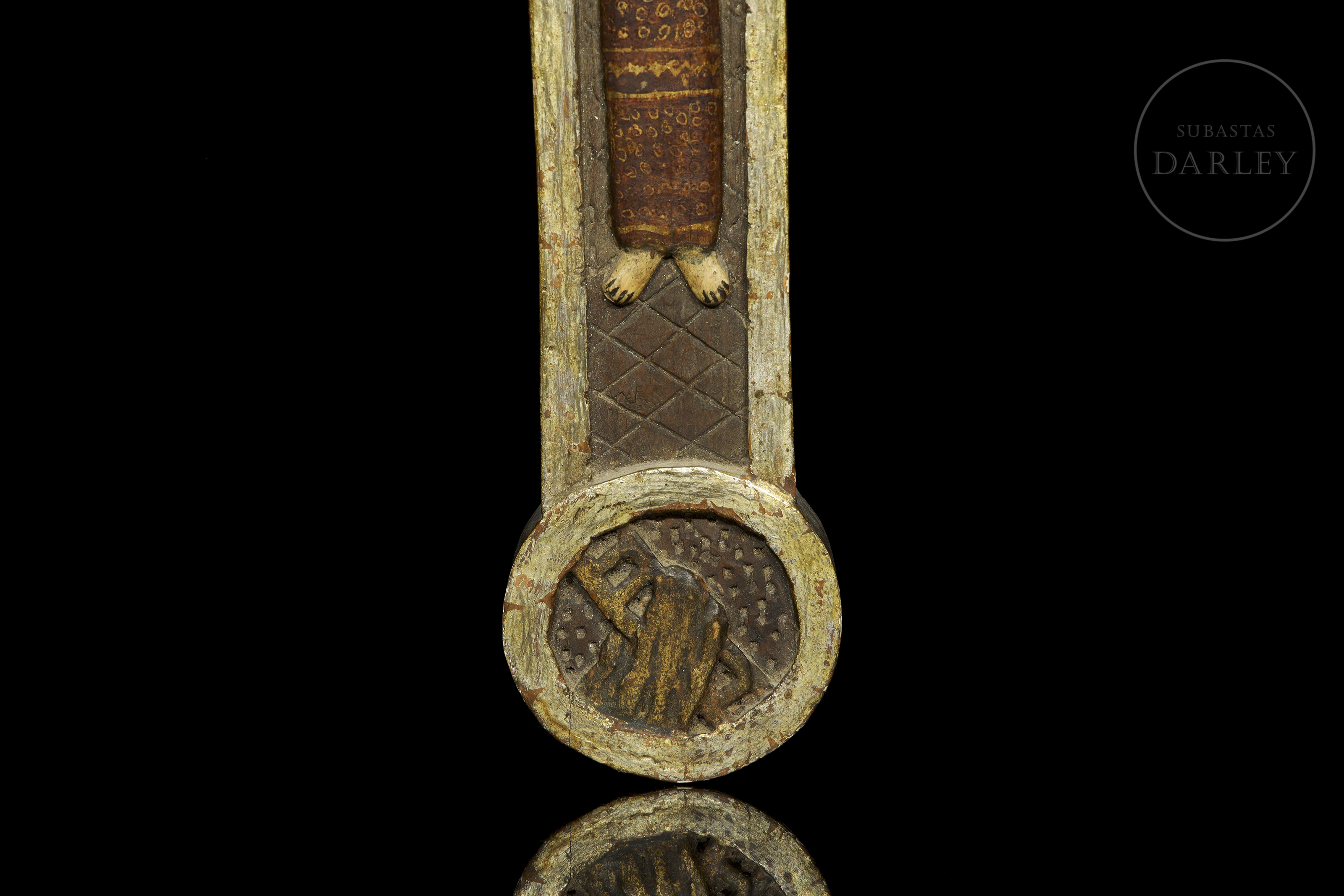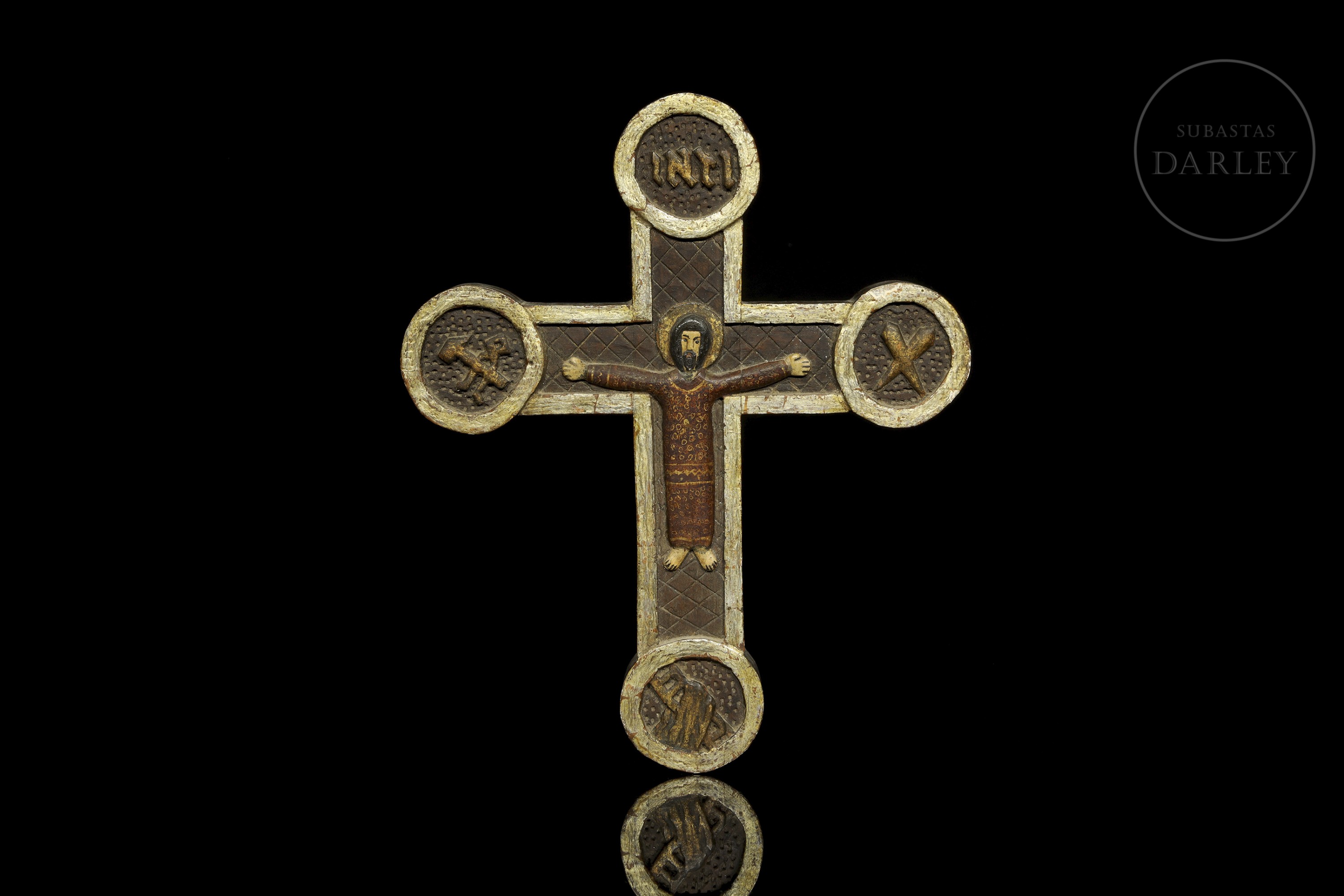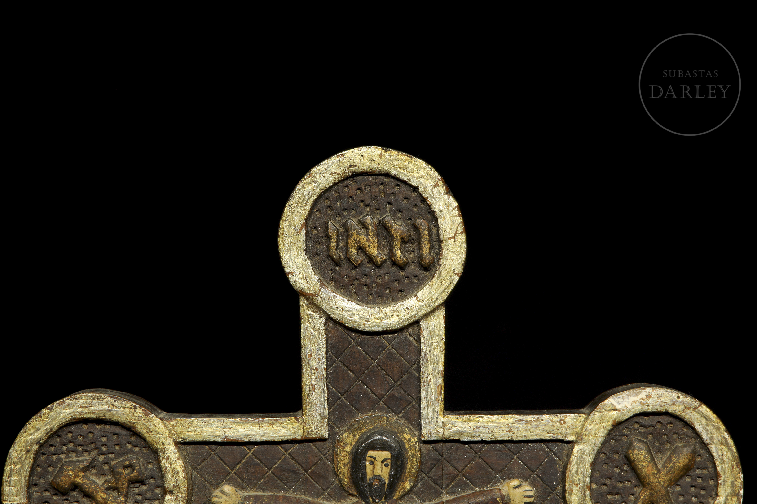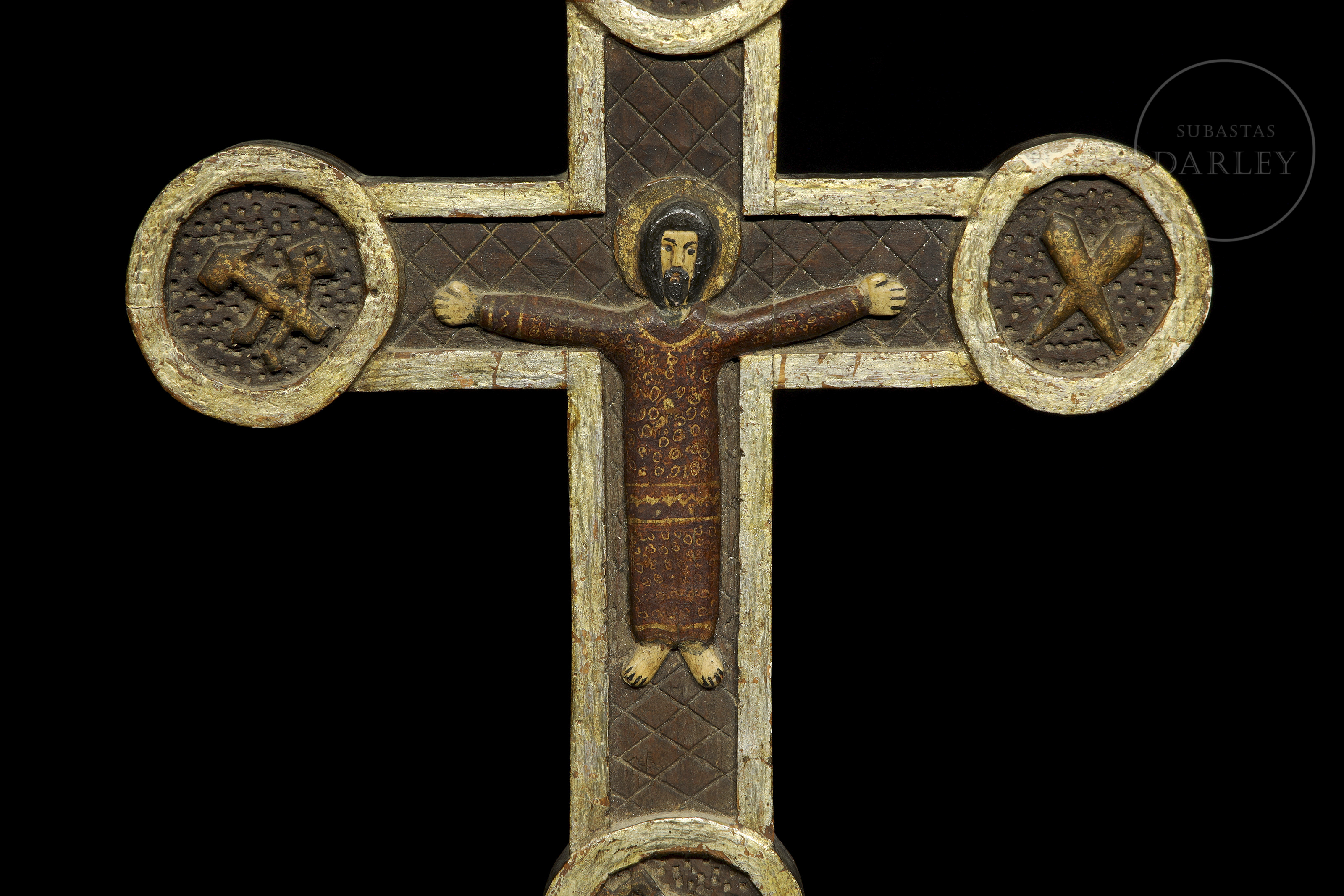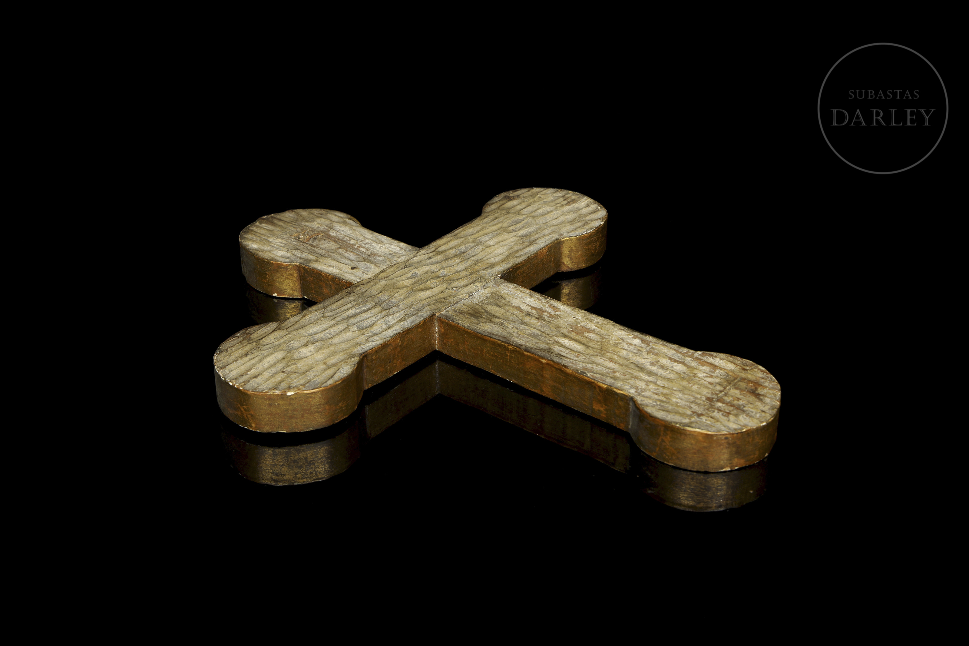 Madera tallada, policromada y dorada. Cruz de pared con el cuerpo de Cristo pintado. Presenta el cuerpo de la cruz con un patrón de rombos grabados y los extremos rematados por medallones circulares dorados.
