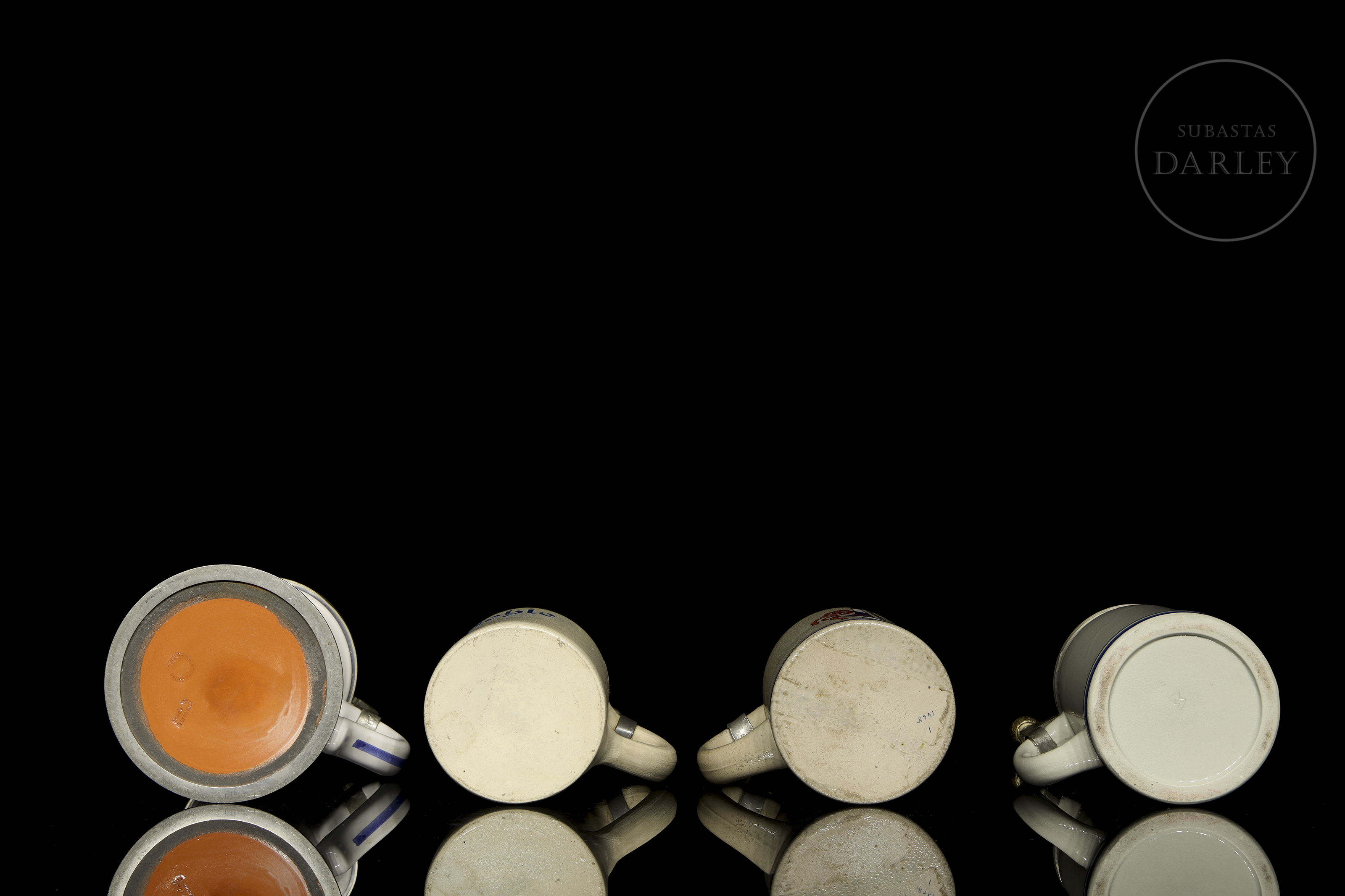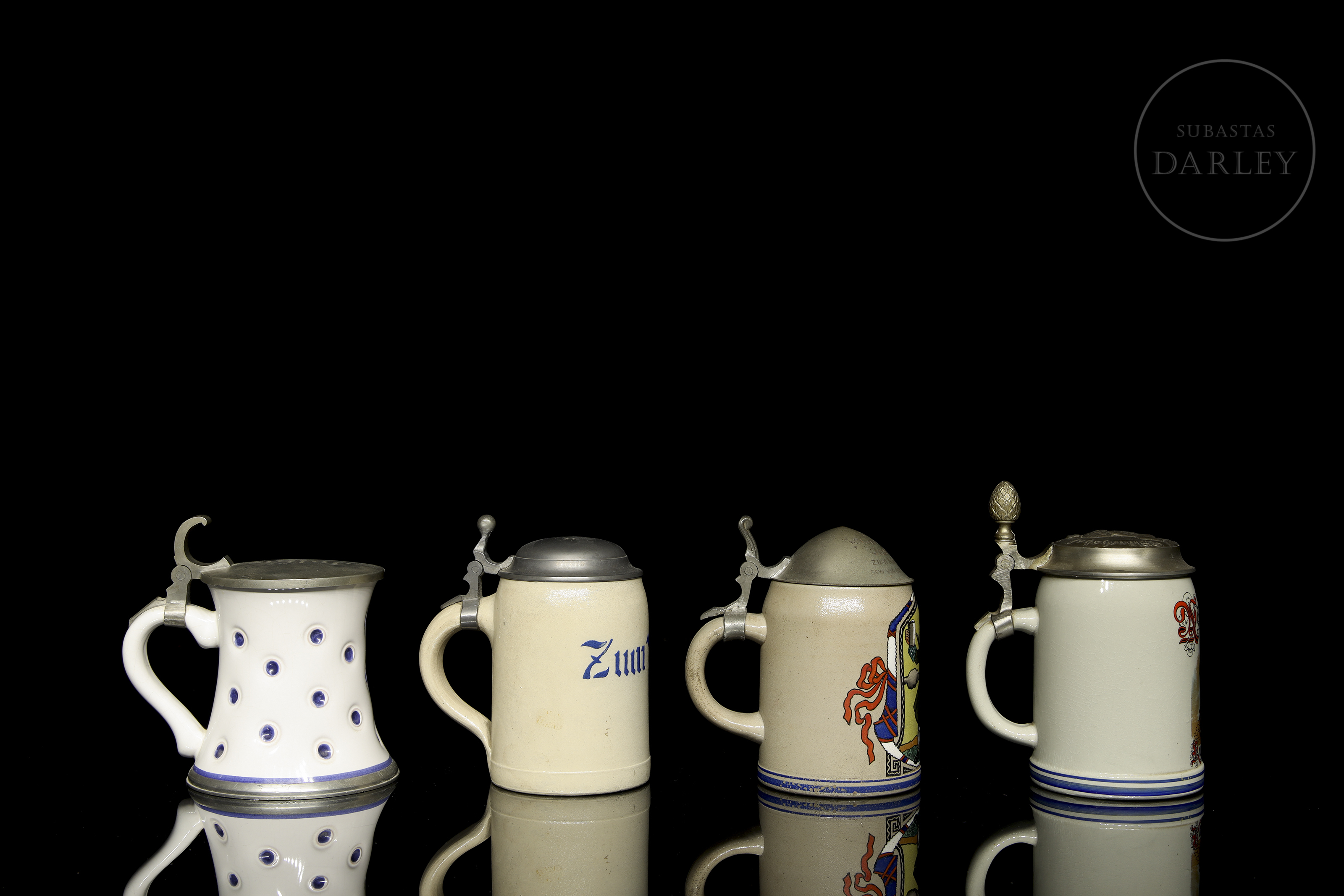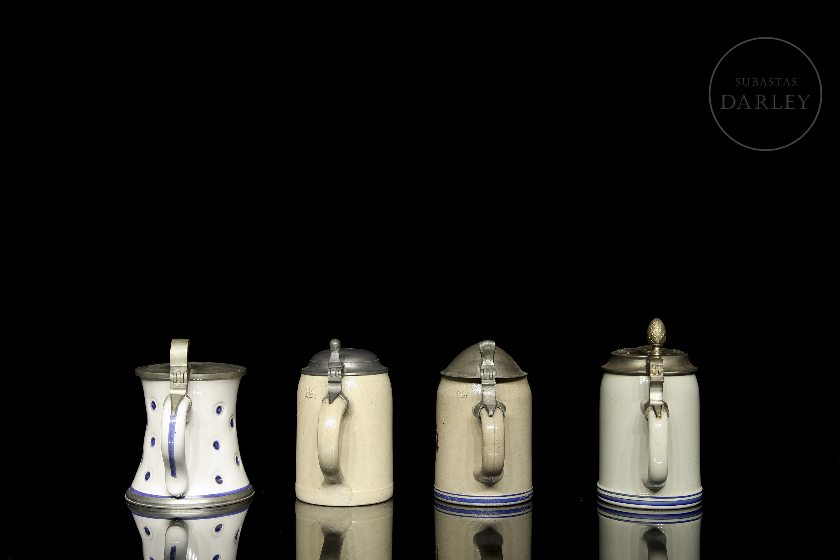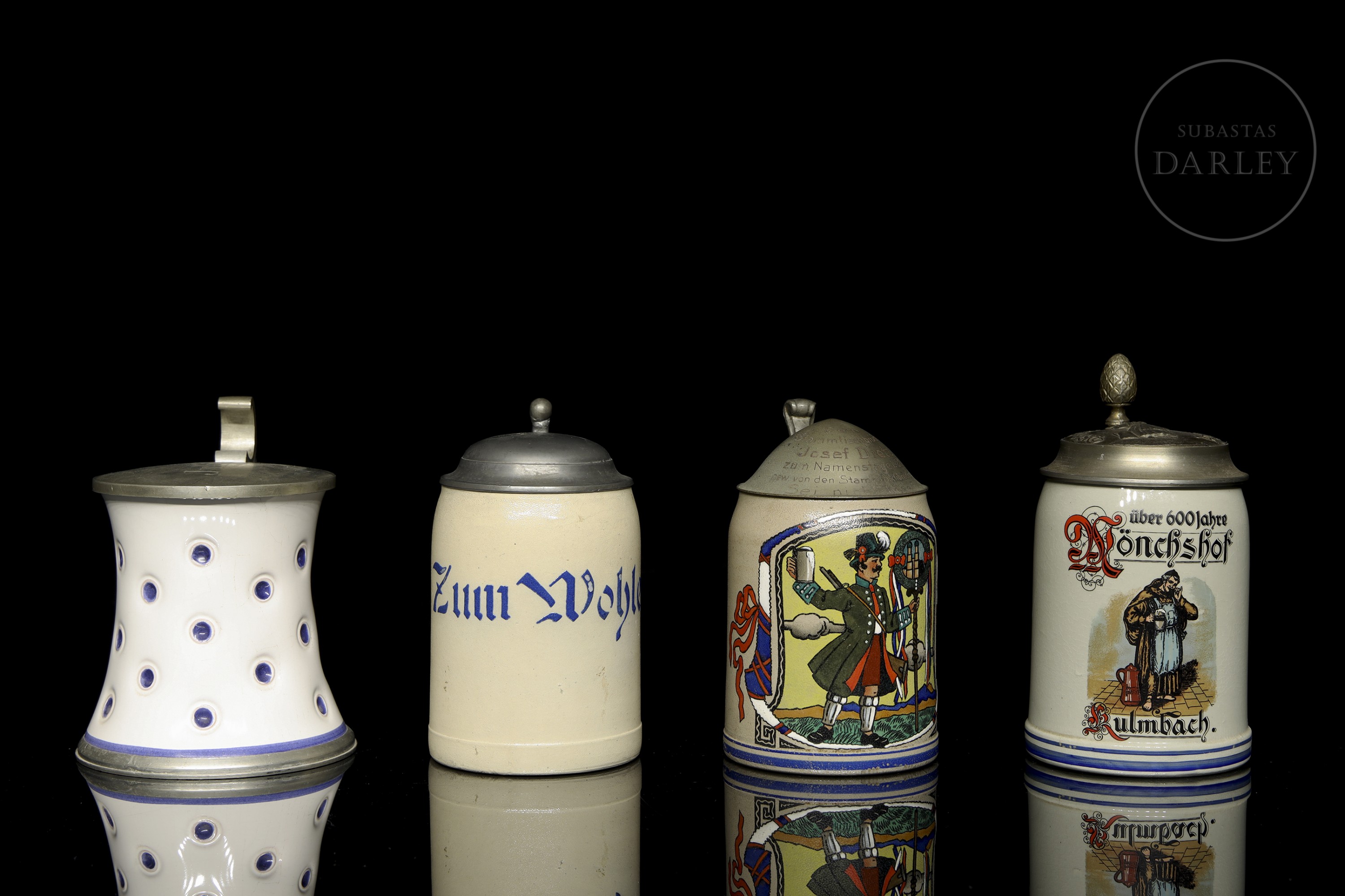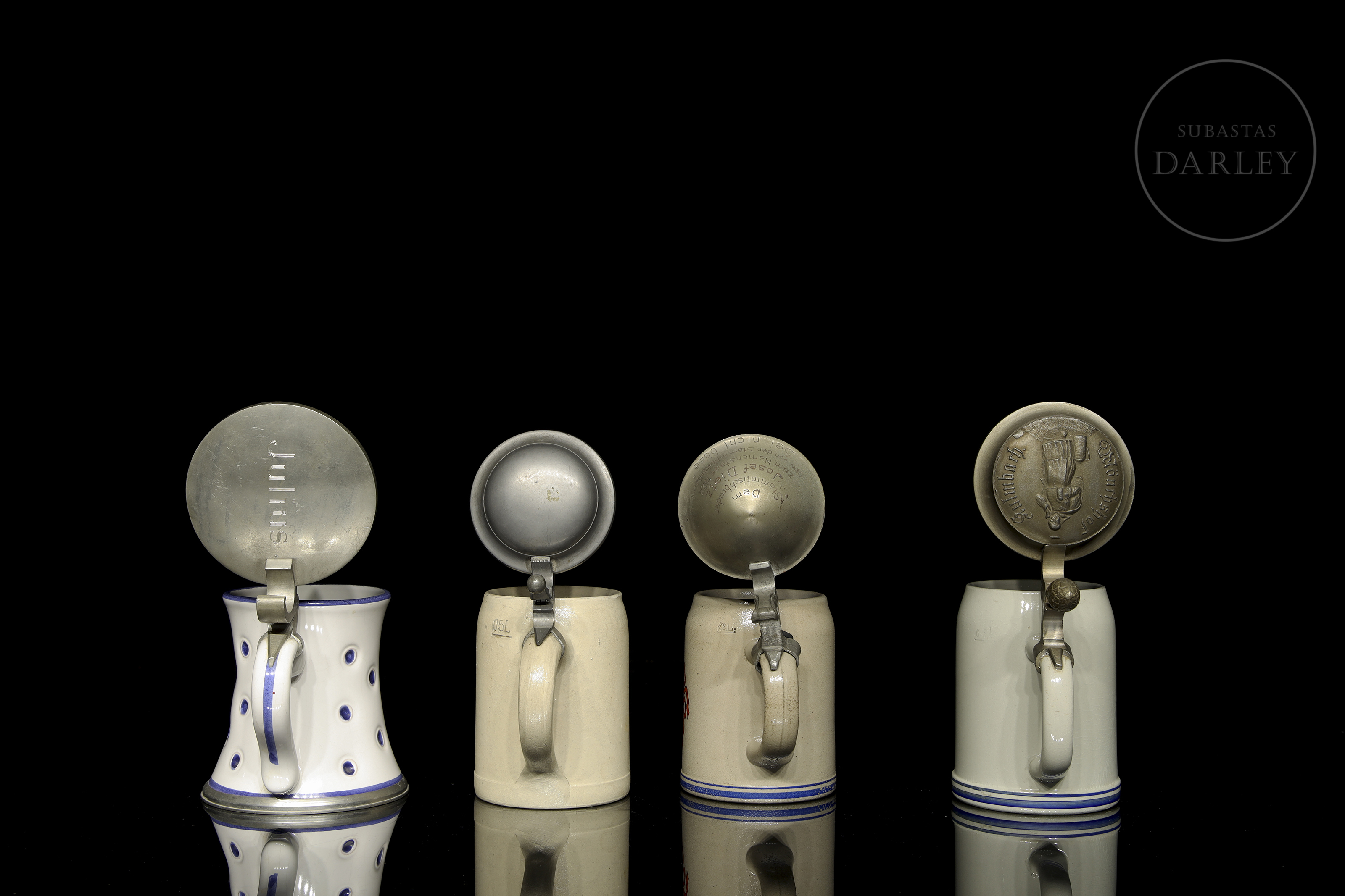 Gres o cerámica modelada. Muestra decoraciones esmaltadas de marcas publicitarias o elementos decorativos. Todas ellas coronadas por tapas a medida de peltre o metal.