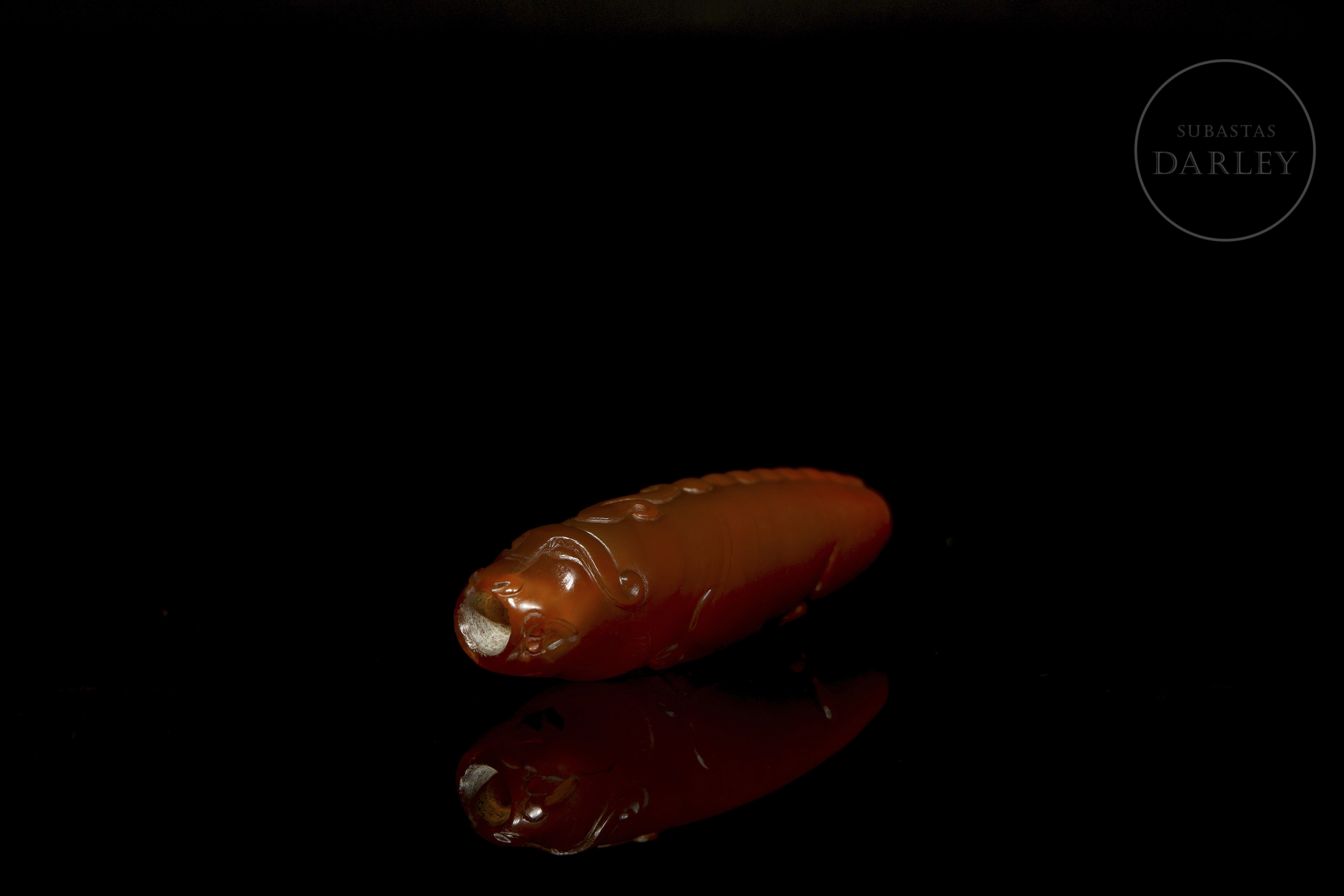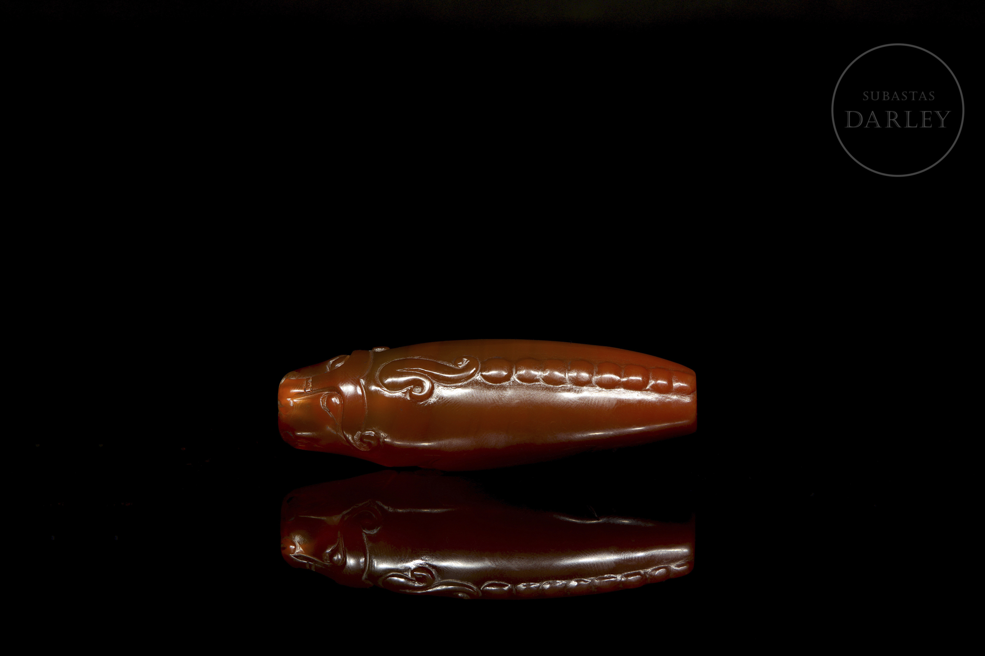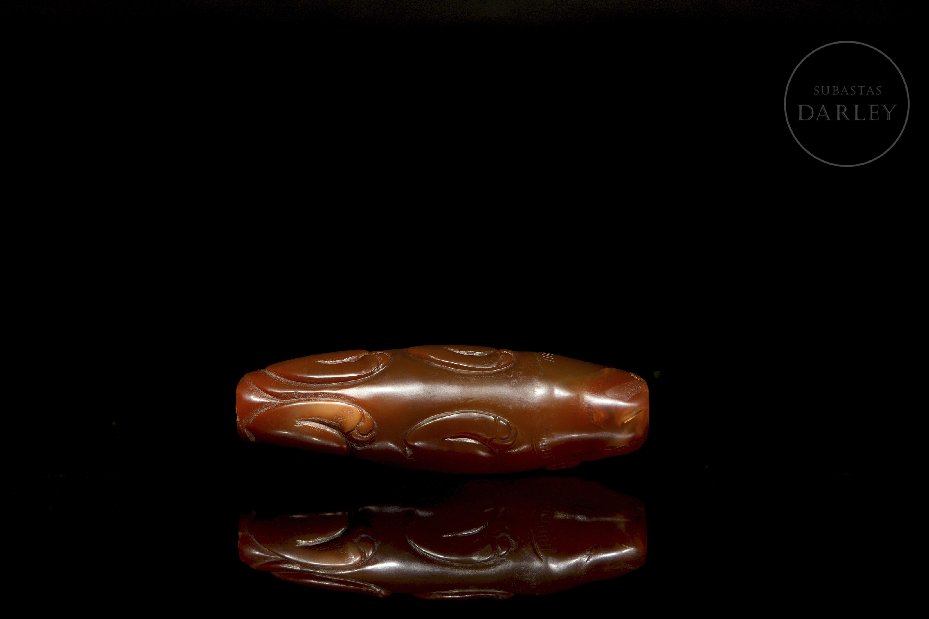 Pieza alargada y cilíndrica, de perfil fusiforme, perforada longitudinalmente. Decorada en bajo relieve representando a un buey recostado, con las patas flexionadas bajo el cuerpo, y la cabeza y cola insinuadas en los extremos. El ágata destaca por su color rojo y pulido uniforme. Dinastía Han (206 a.C. - 220 d.C.). o posterior.