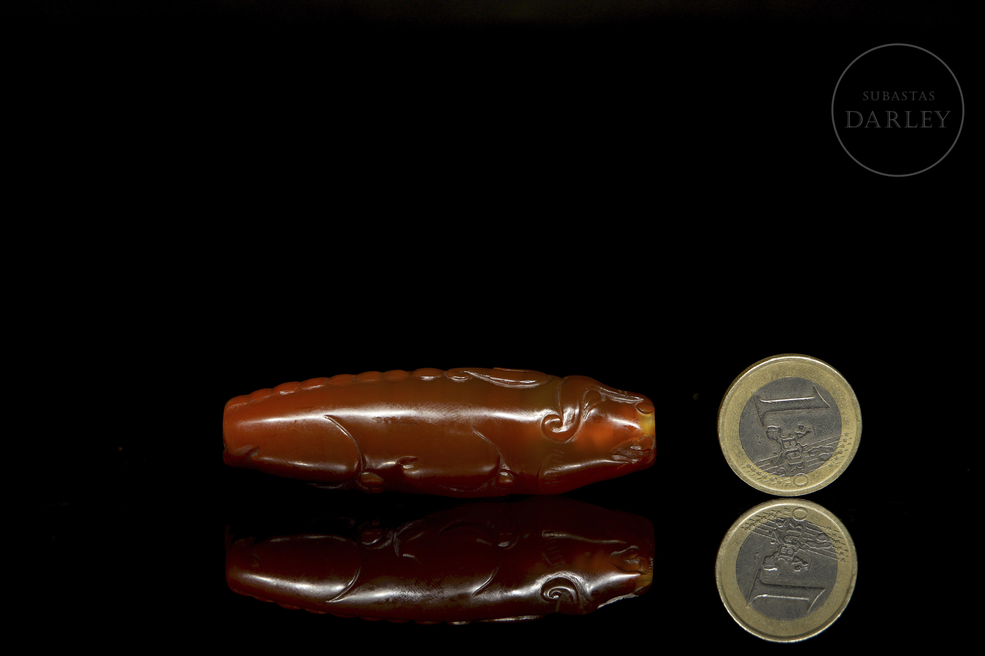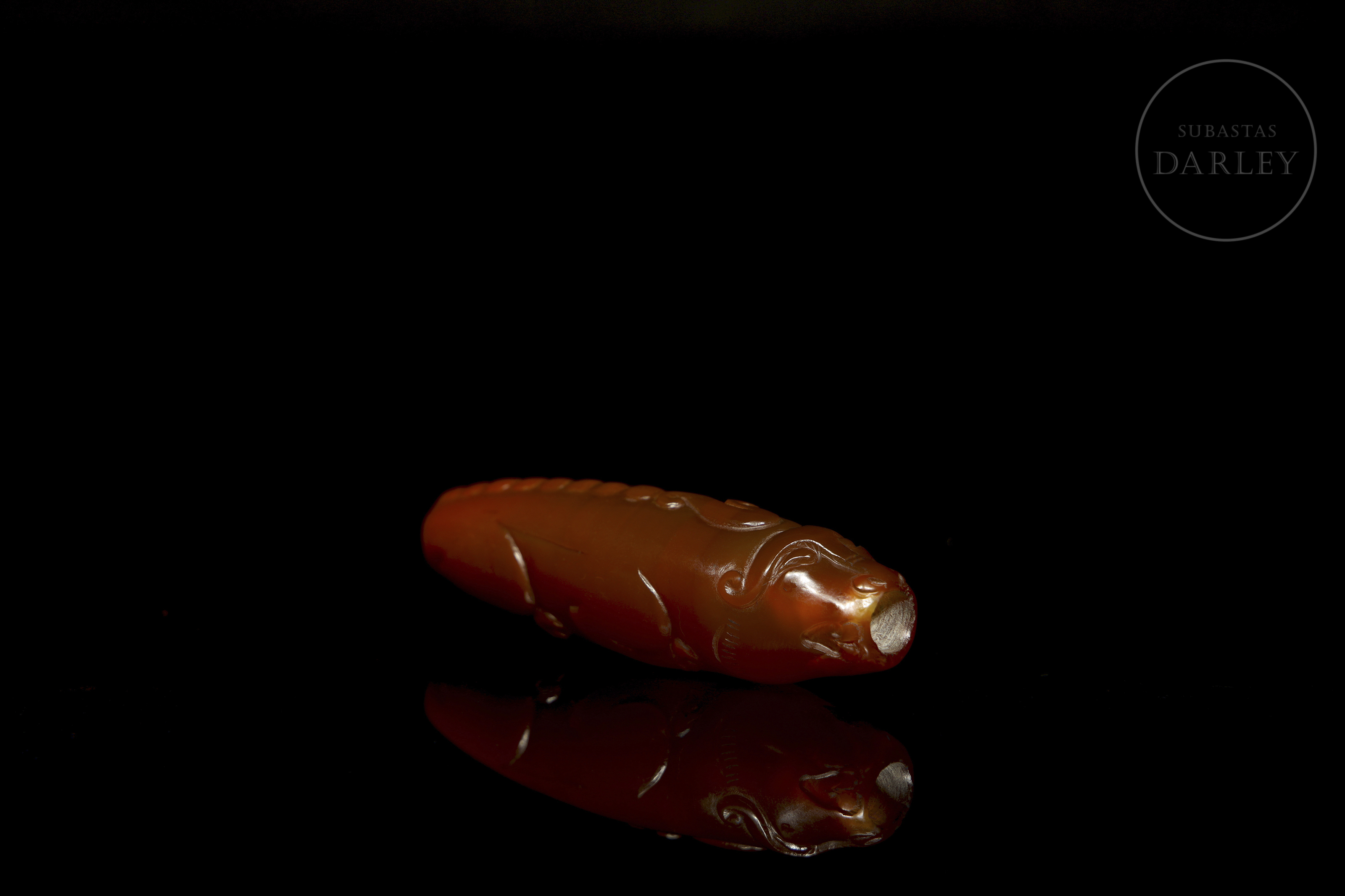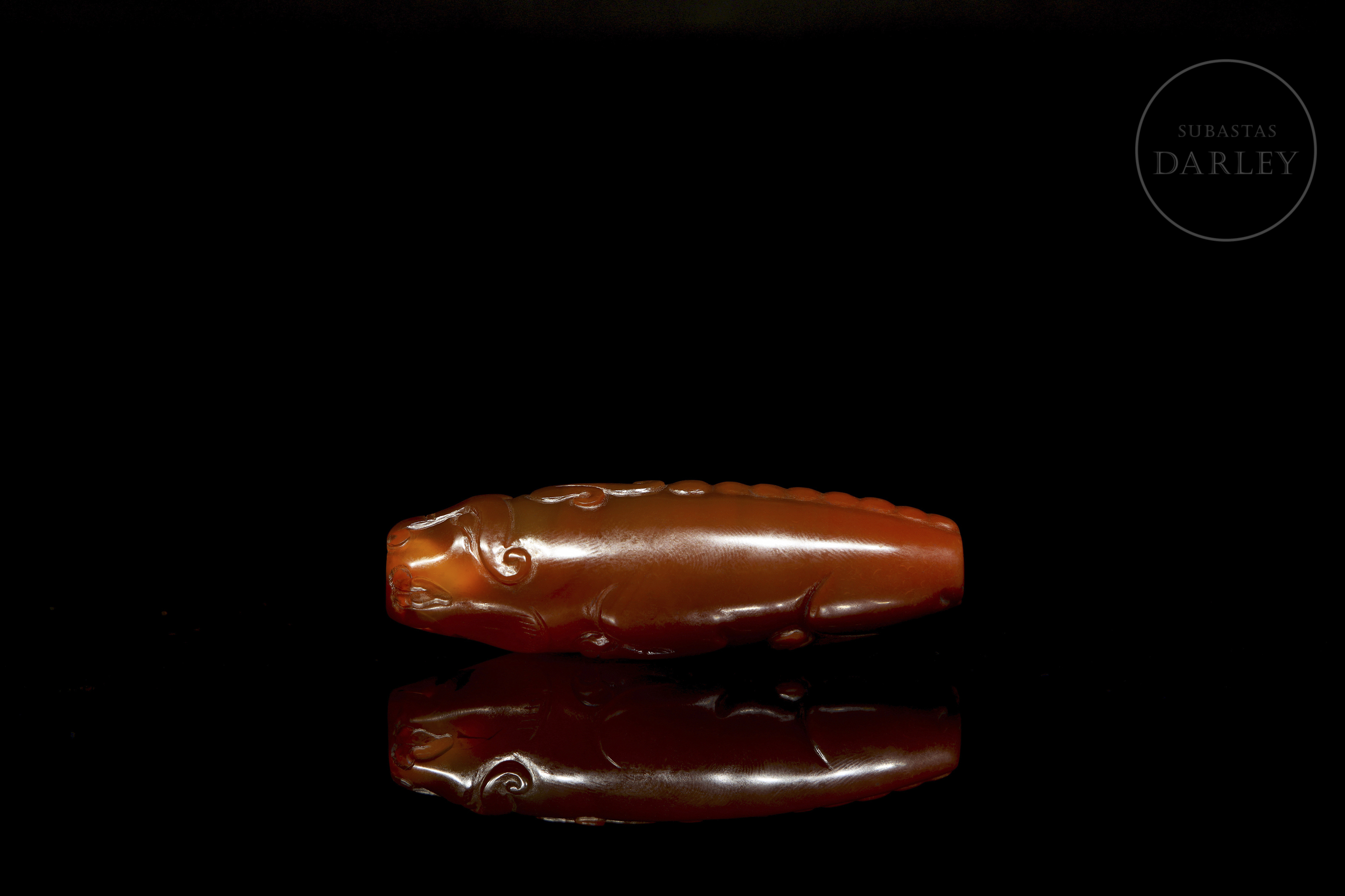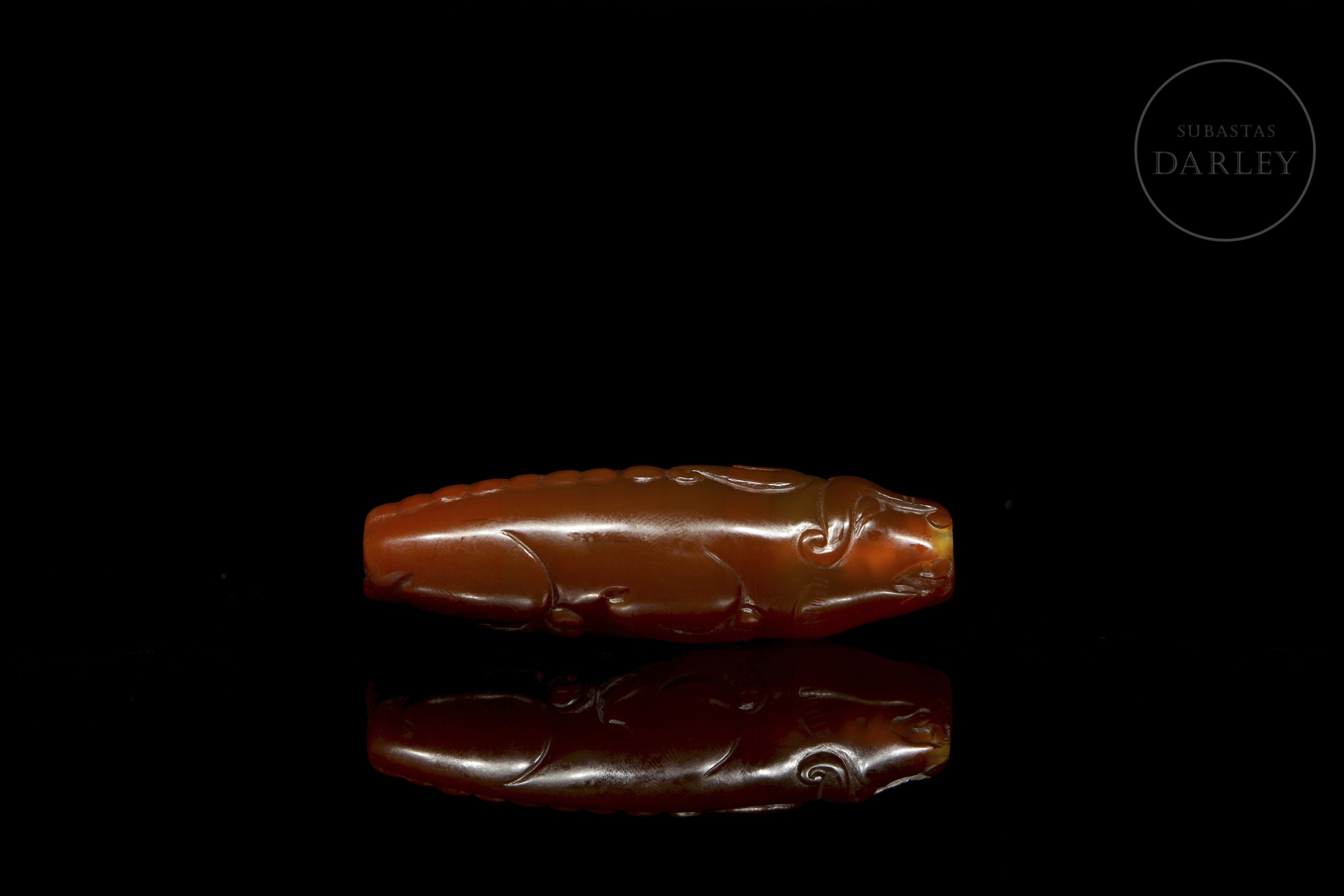 Pieza alargada y cilíndrica, de perfil fusiforme, perforada longitudinalmente. Decorada en bajo relieve representando a un buey recostado, con las patas flexionadas bajo el cuerpo, y la cabeza y cola insinuadas en los extremos. El ágata destaca por su color rojo y pulido uniforme. Dinastía Han (206 a.C. - 220 d.C.). o posterior.