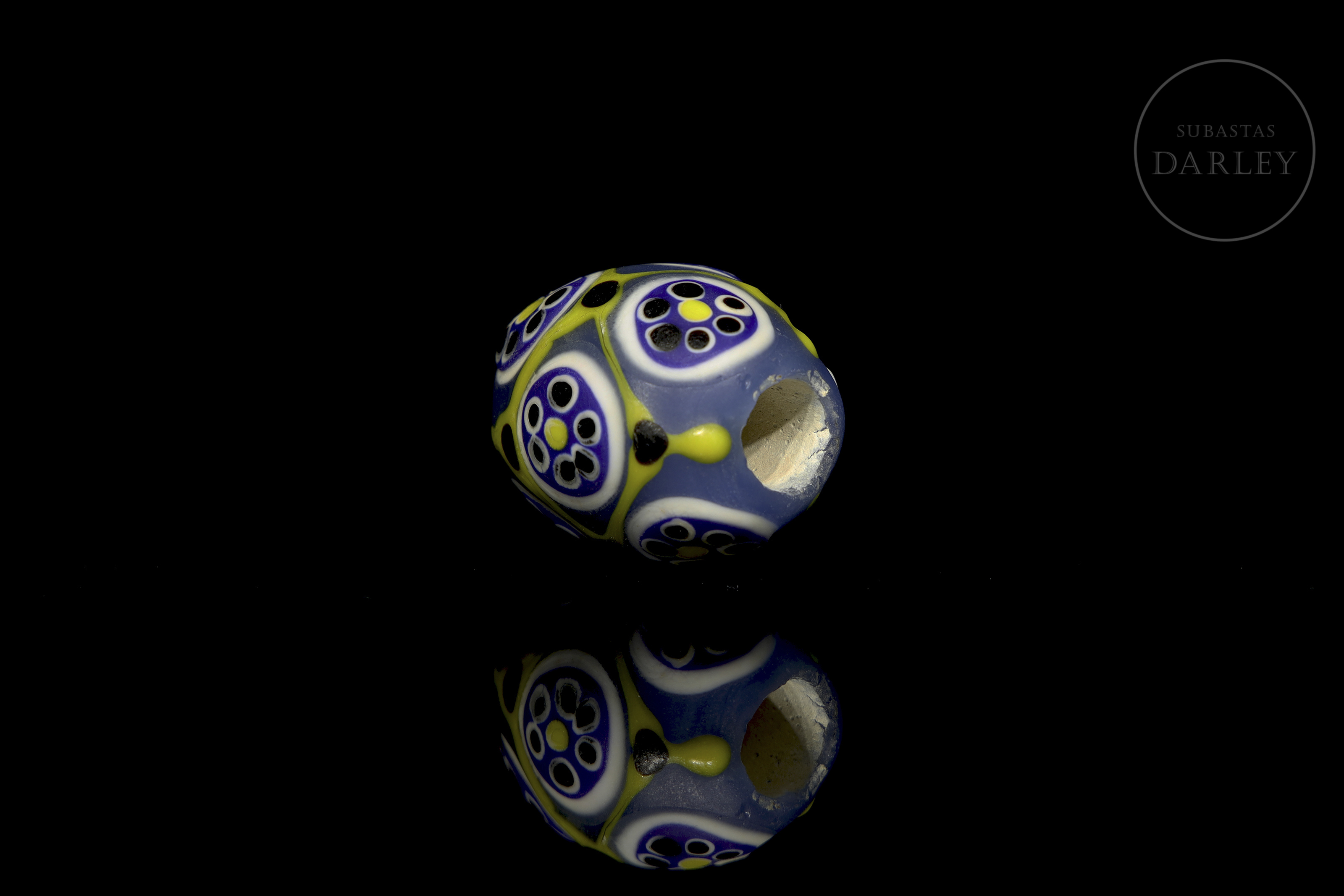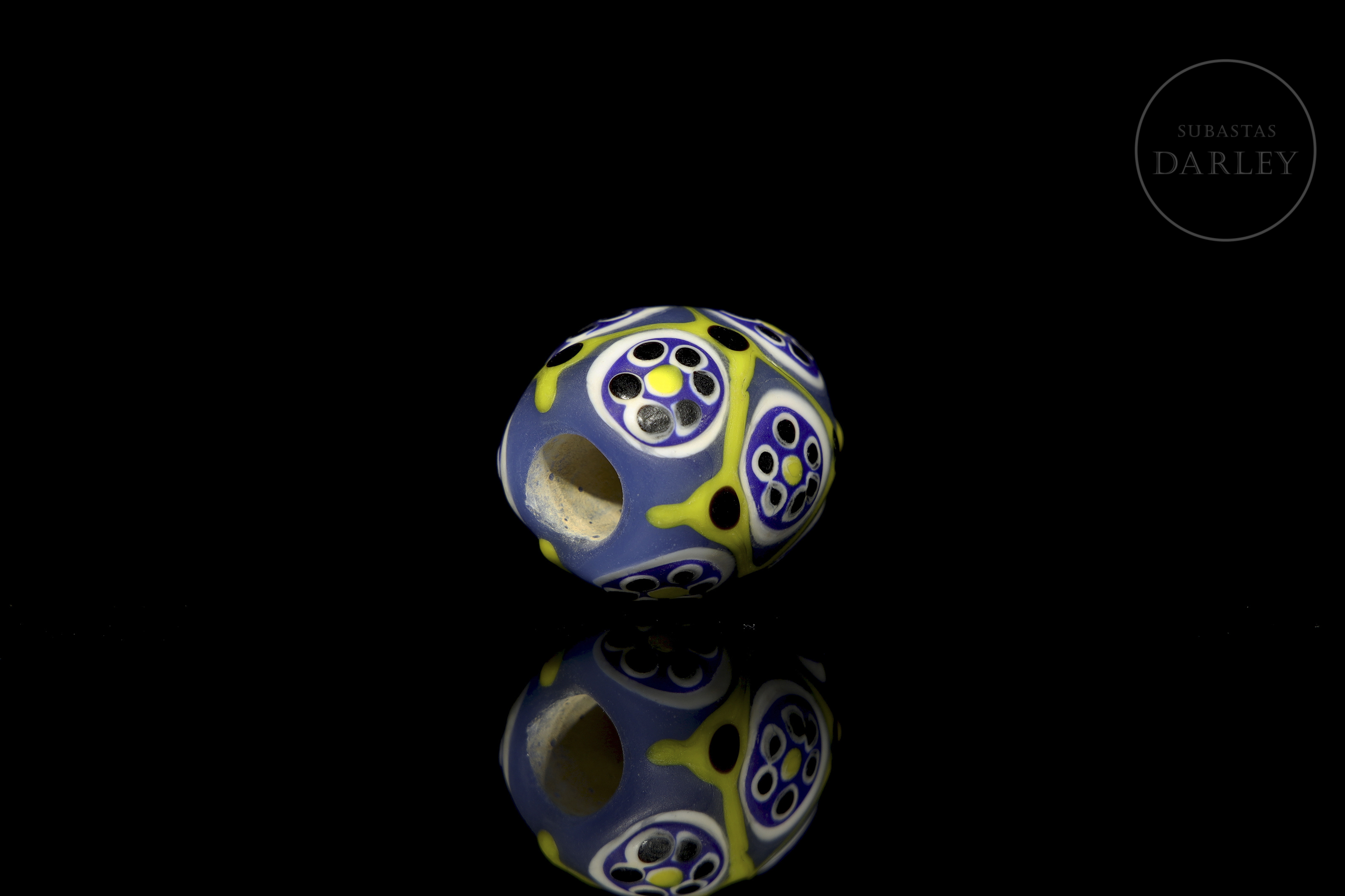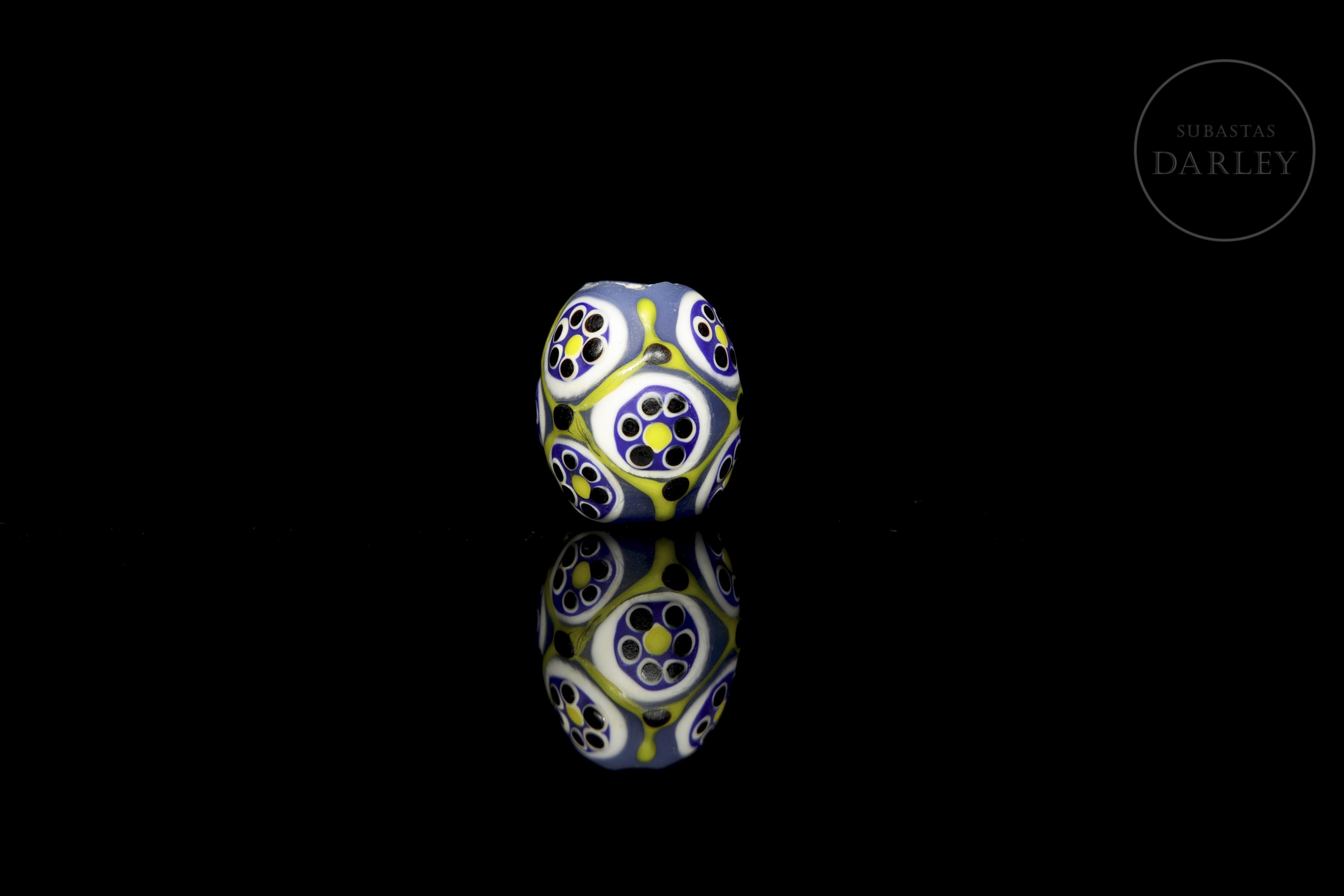 Cuenta de "liulí" (琉璃) de forma globular. Presenta un color base azul pálido. La superficie está ornamentada con múltiples flores con un botón central amarillo limón rodeado por cinco "pétalos" negros. Cada una de ellas inscrita en círculos concéntricos a su vez enmarcados por una gruesa retícula amarilla. Dinastía Tang (618-906 d.C.).