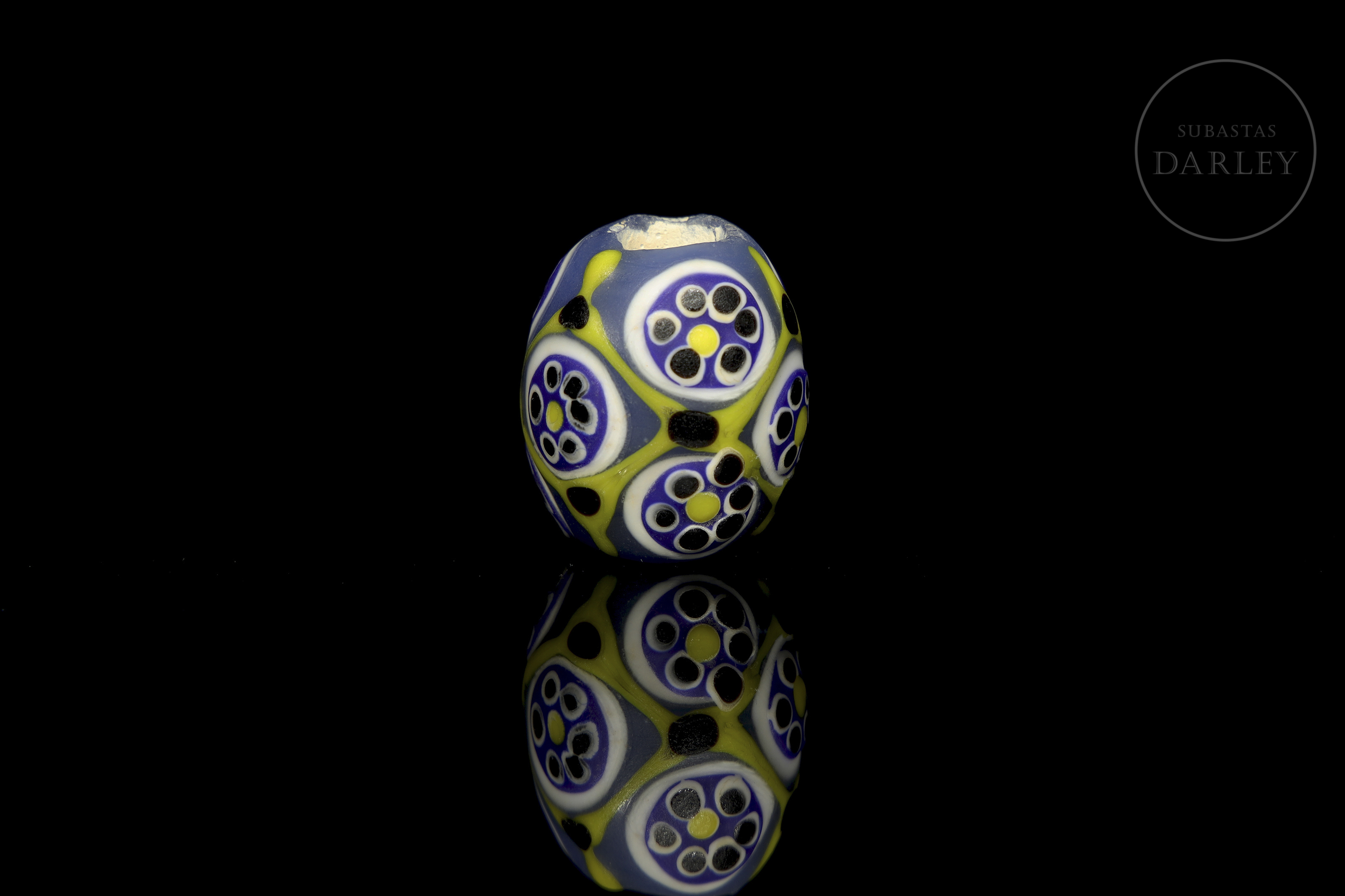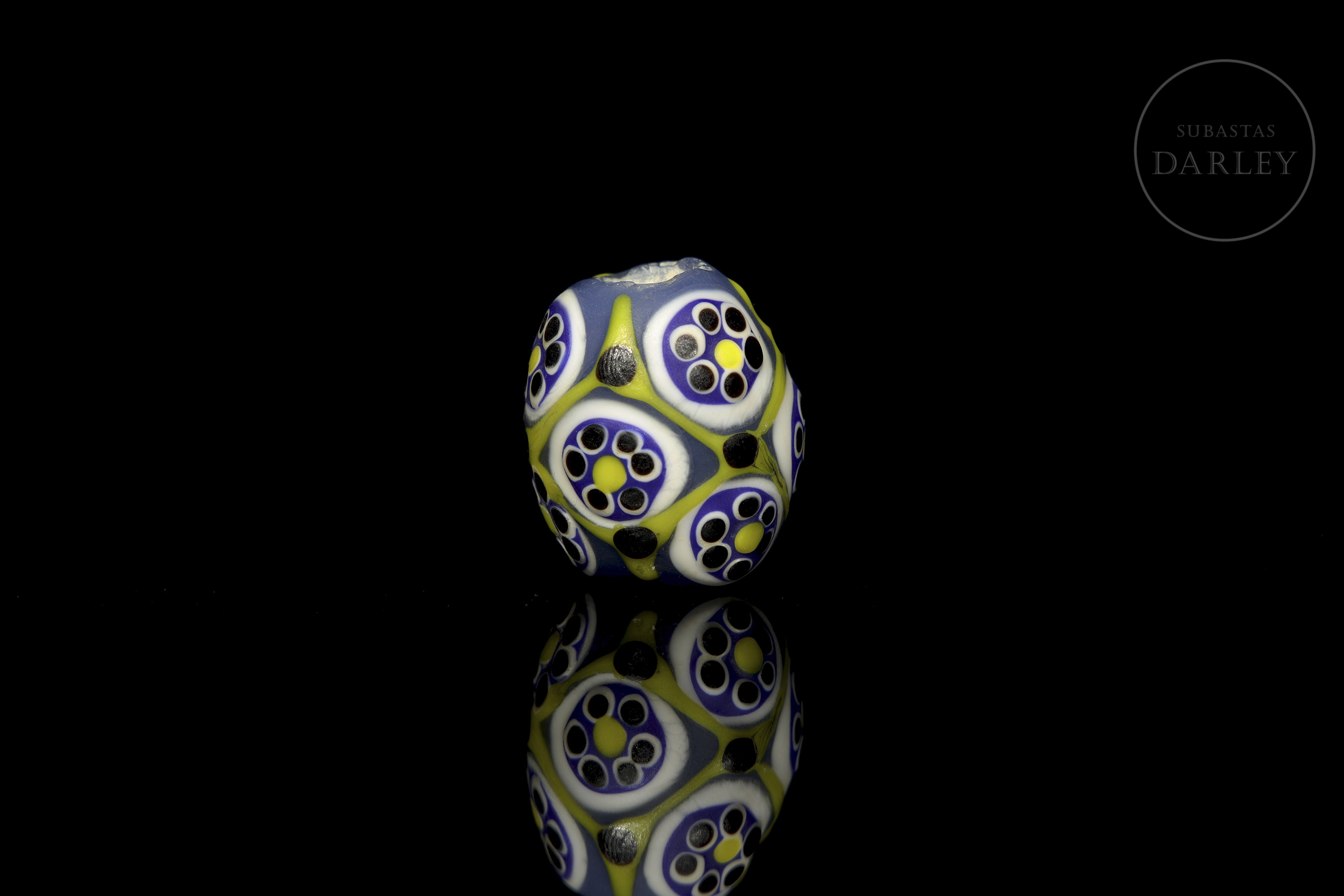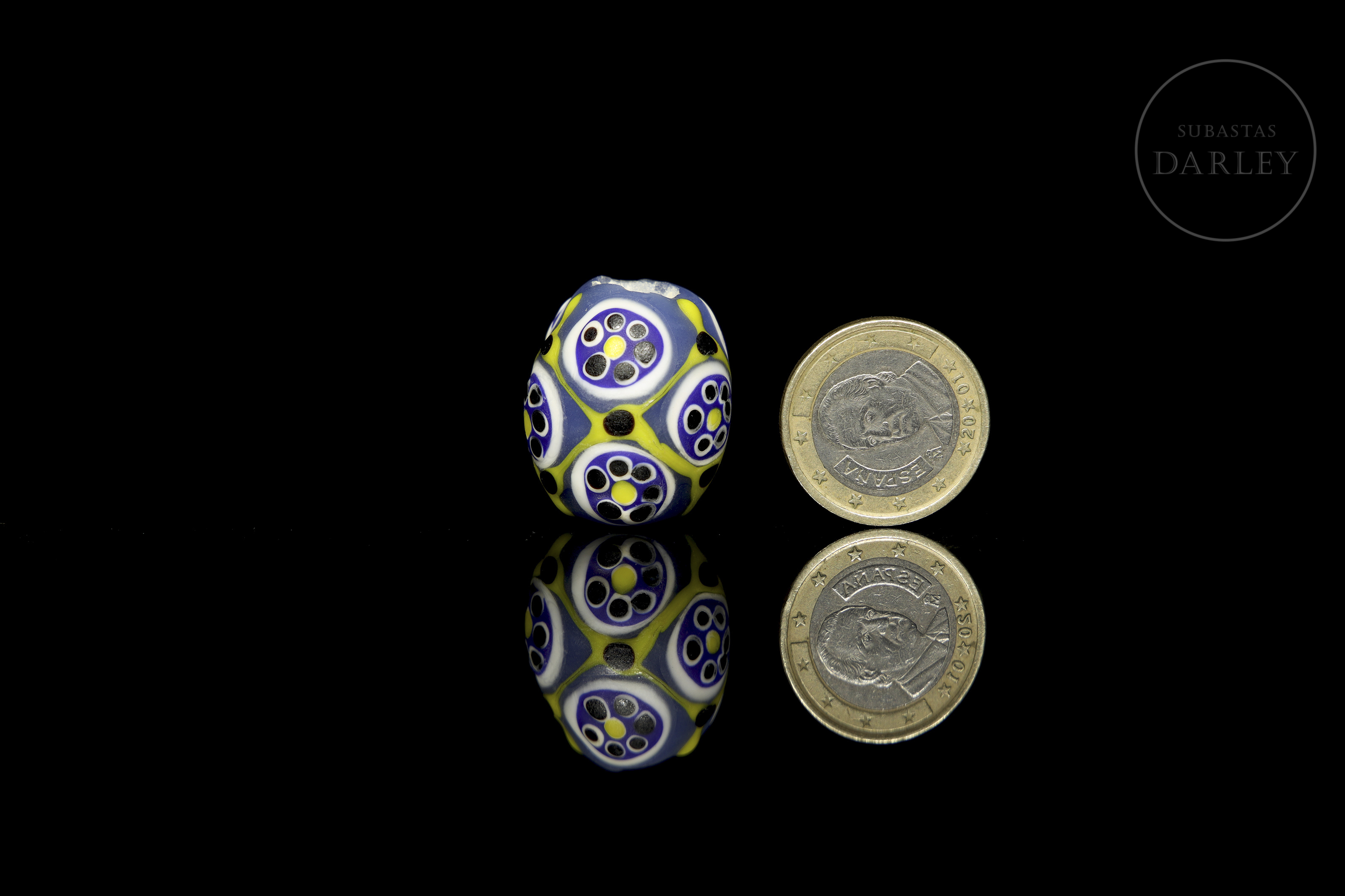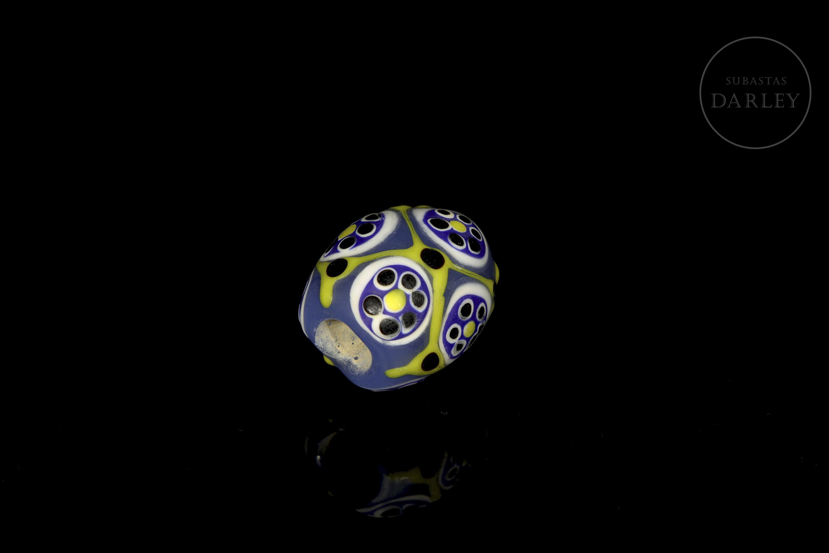 Cuenta de "liulí" (琉璃) de forma globular. Presenta un color base azul pálido. La superficie está ornamentada con múltiples flores con un botón central amarillo limón rodeado por cinco "pétalos" negros. Cada una de ellas inscrita en círculos concéntricos a su vez enmarcados por una gruesa retícula amarilla. Dinastía Tang (618-906 d.C.).