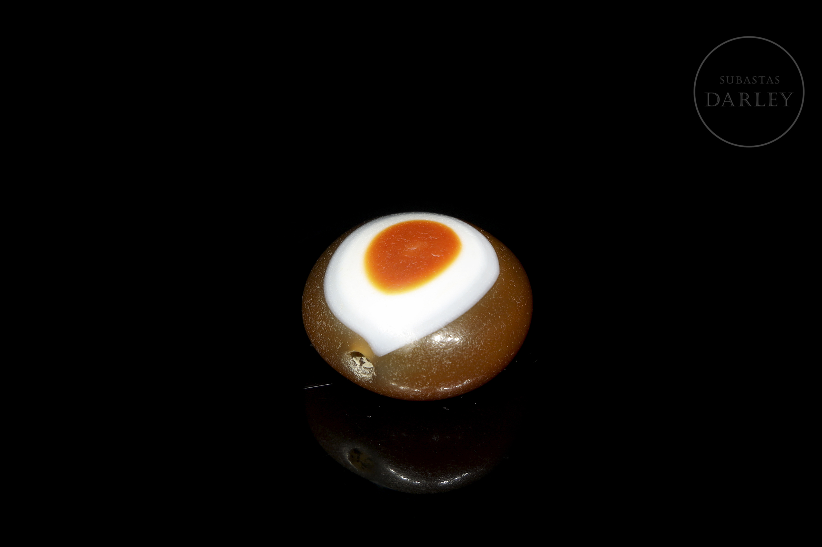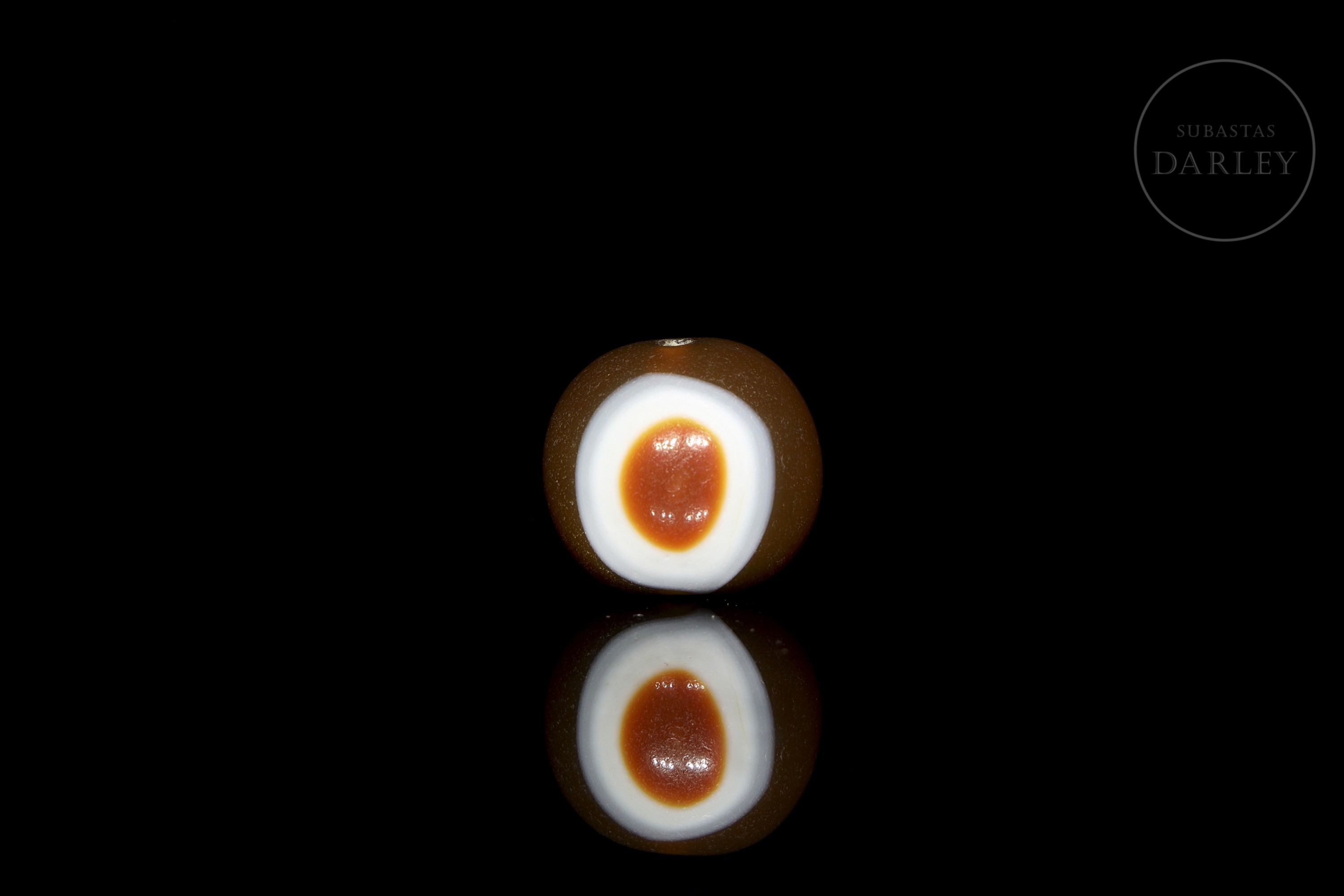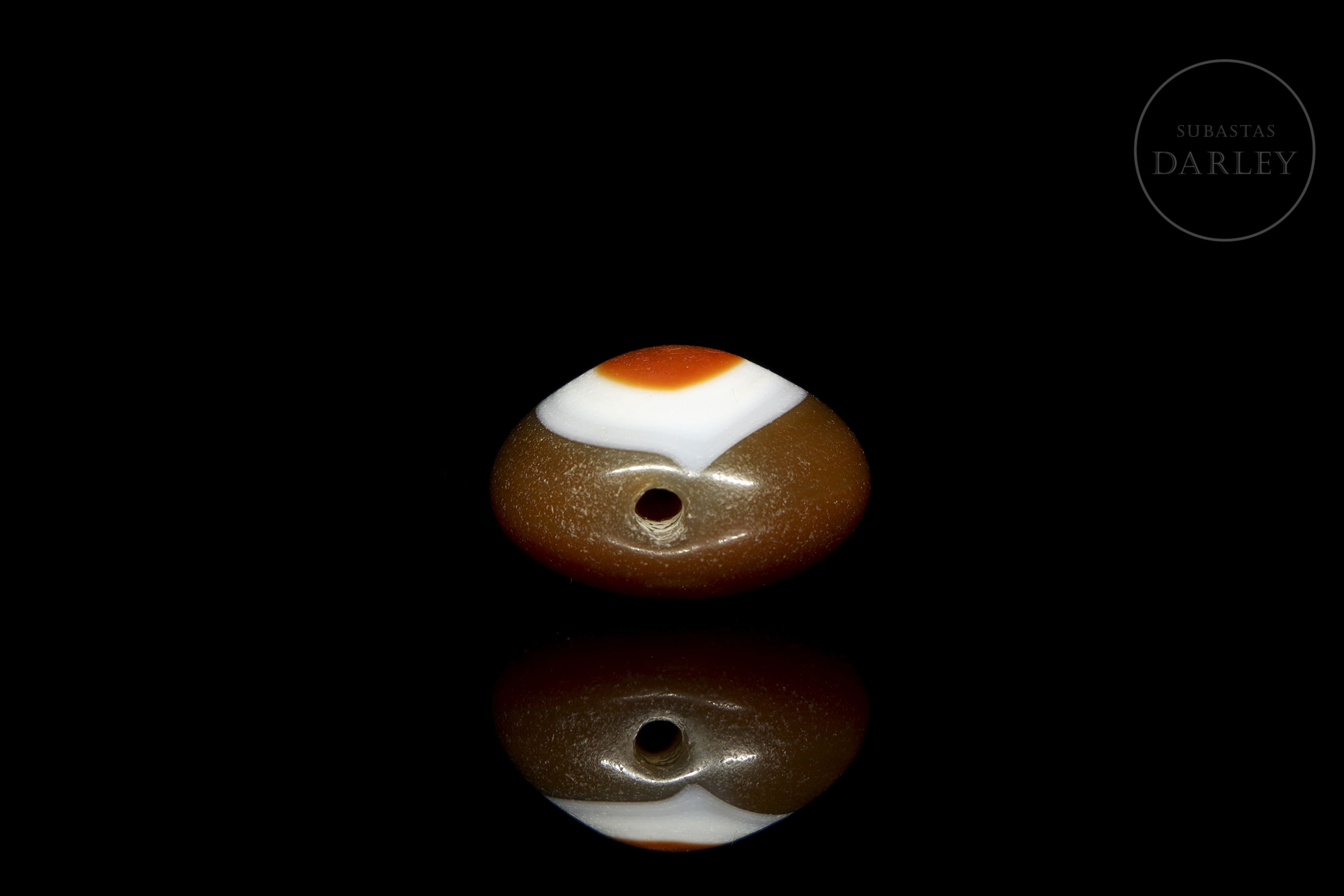 Cuenta Dzi "Ban Zhu" (板珠), realizada en ágata de una tonalidad marrón rojizo, con un diseño circular concéntrico en blanco y un centro anaranjado creando el conocido "Ojo". Posee pátina por antigüedad de acabado vítreo. Dinastía Liao (916–1125) o posterior.