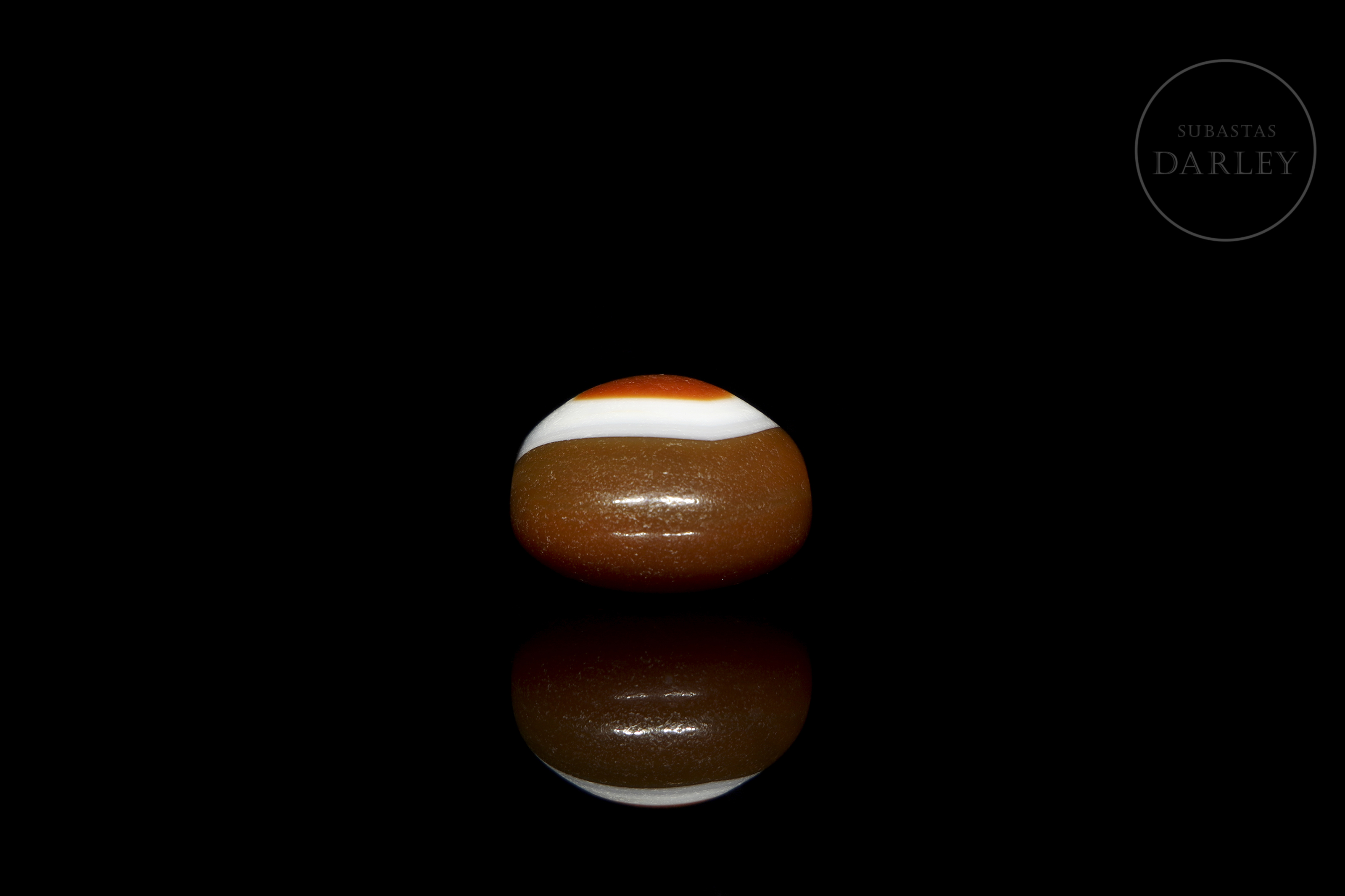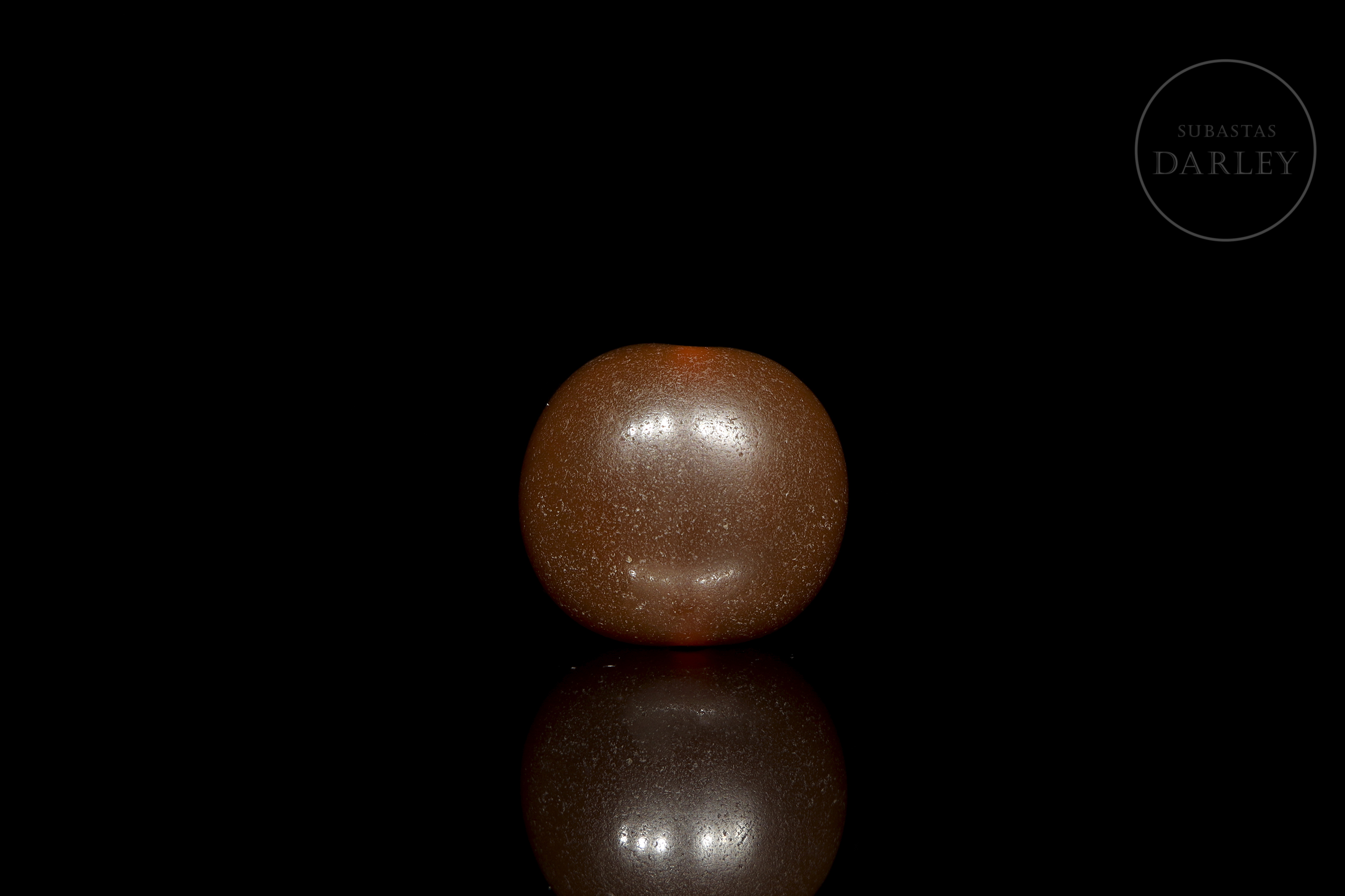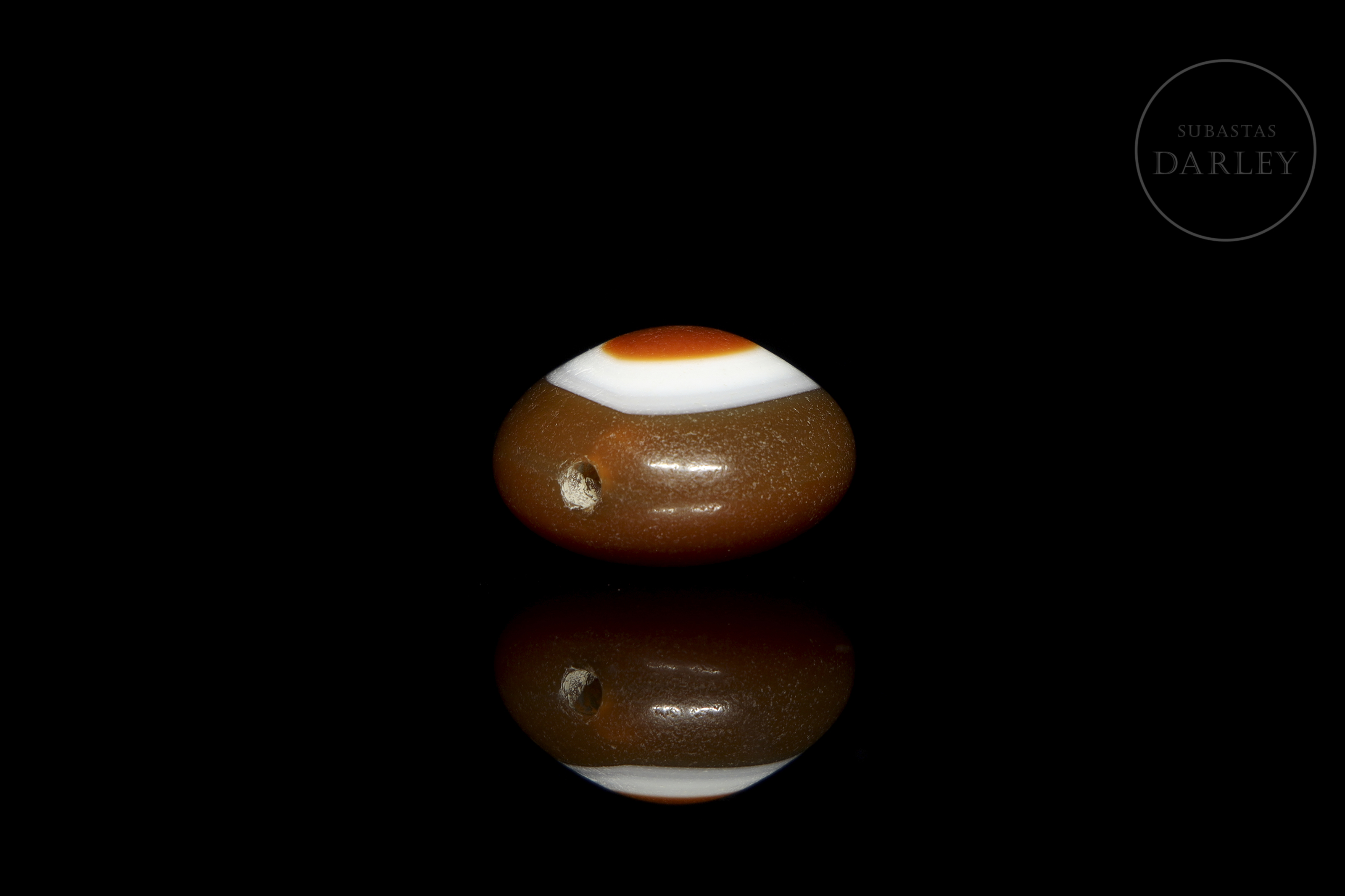 Cuenta Dzi "Ban Zhu" (板珠), realizada en ágata de una tonalidad marrón rojizo, con un diseño circular concéntrico en blanco y un centro anaranjado creando el conocido "Ojo". Posee pátina por antigüedad de acabado vítreo. Dinastía Liao (916–1125) o posterior.