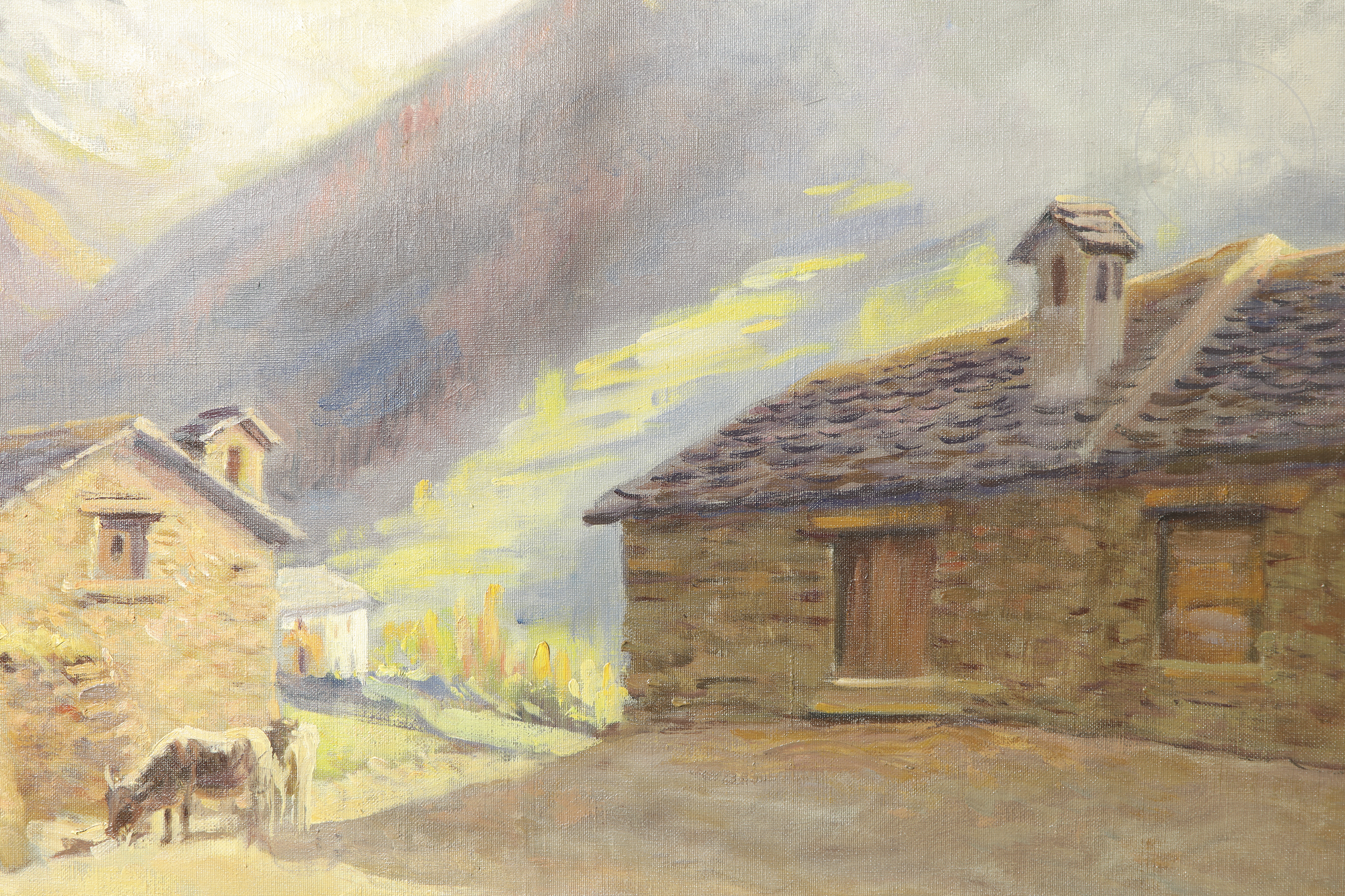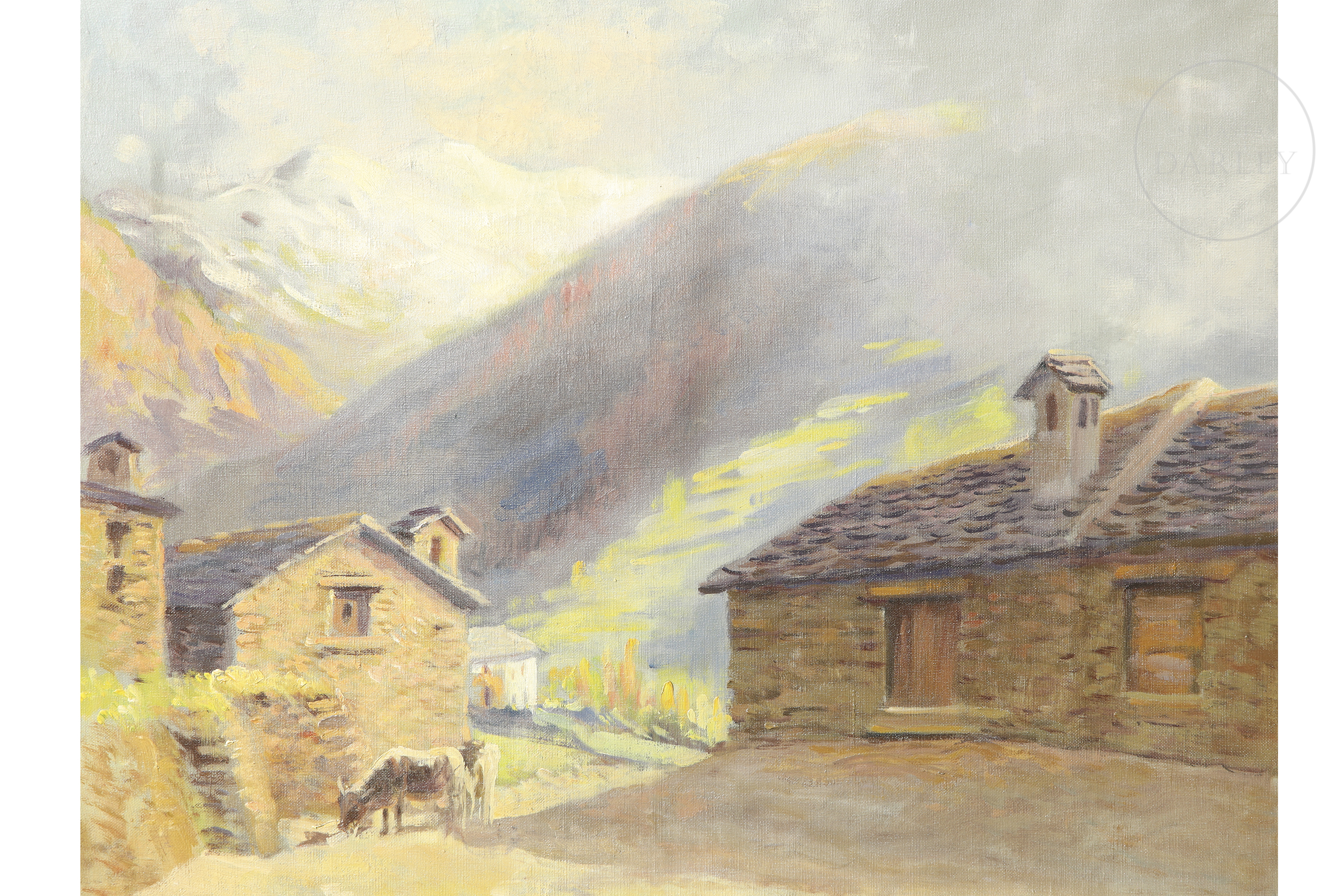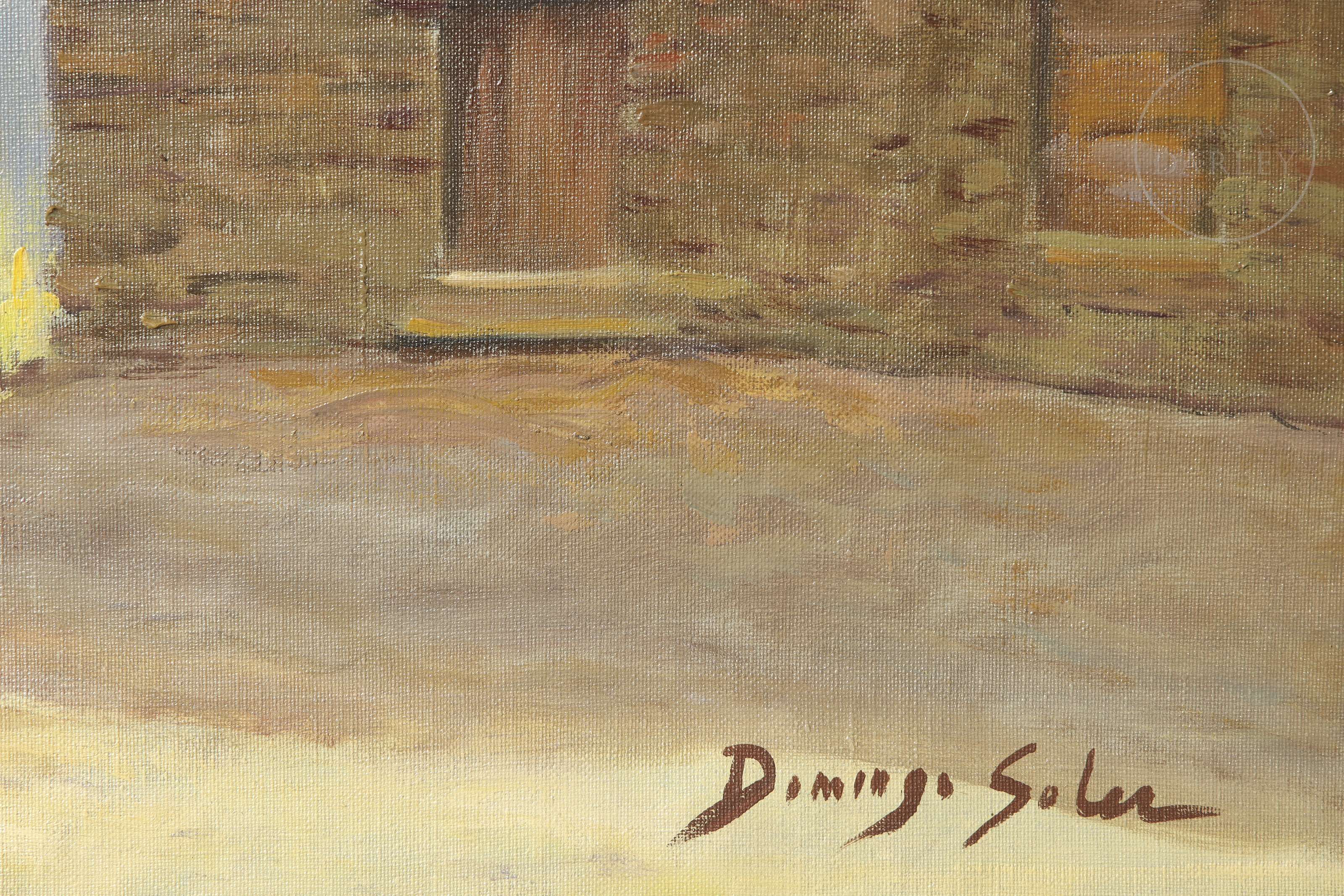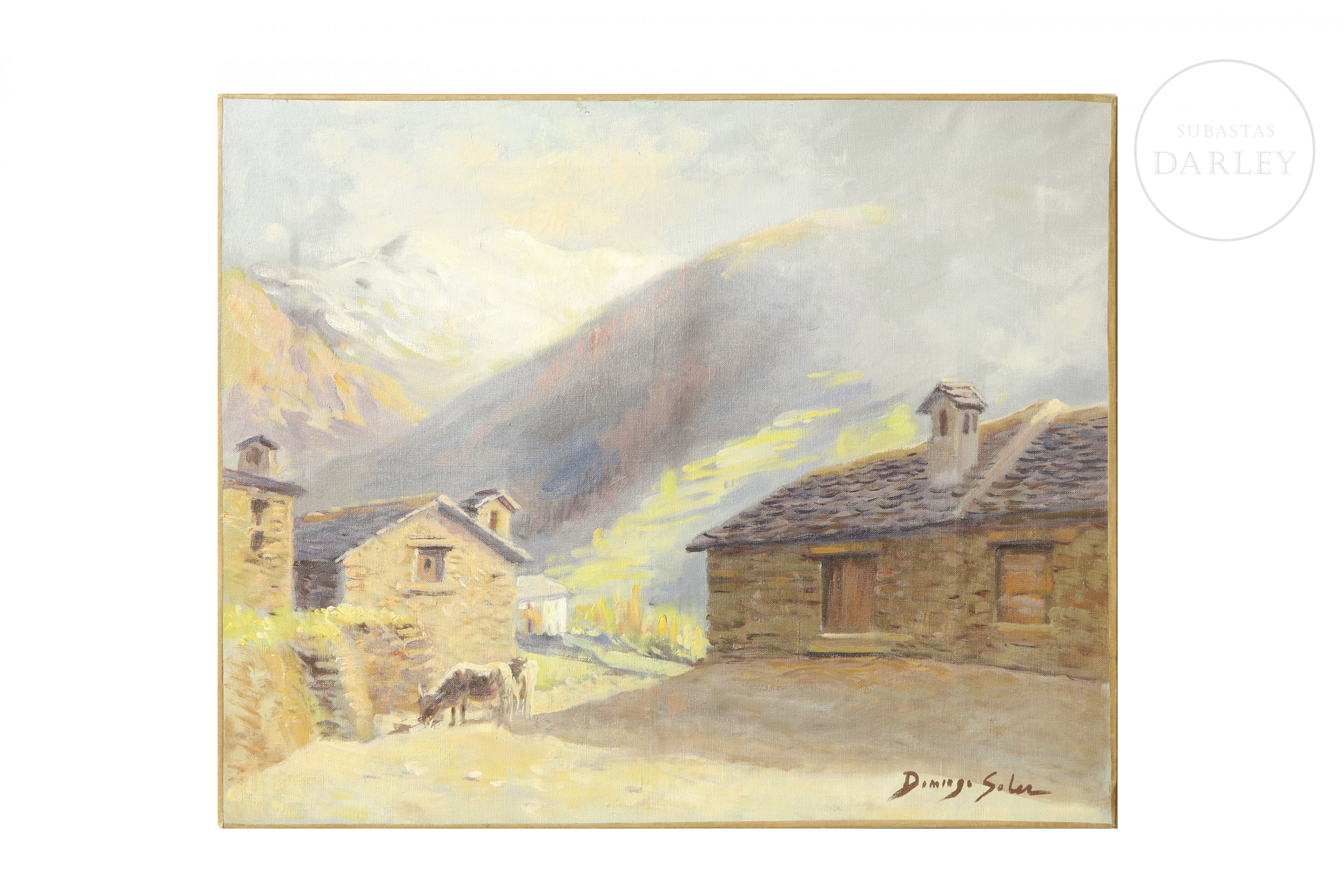 Óleo sobre lienzo. Muestra una aldea en el campo. Firmado "Domingo Soler" en el ángulo inferior derecho.