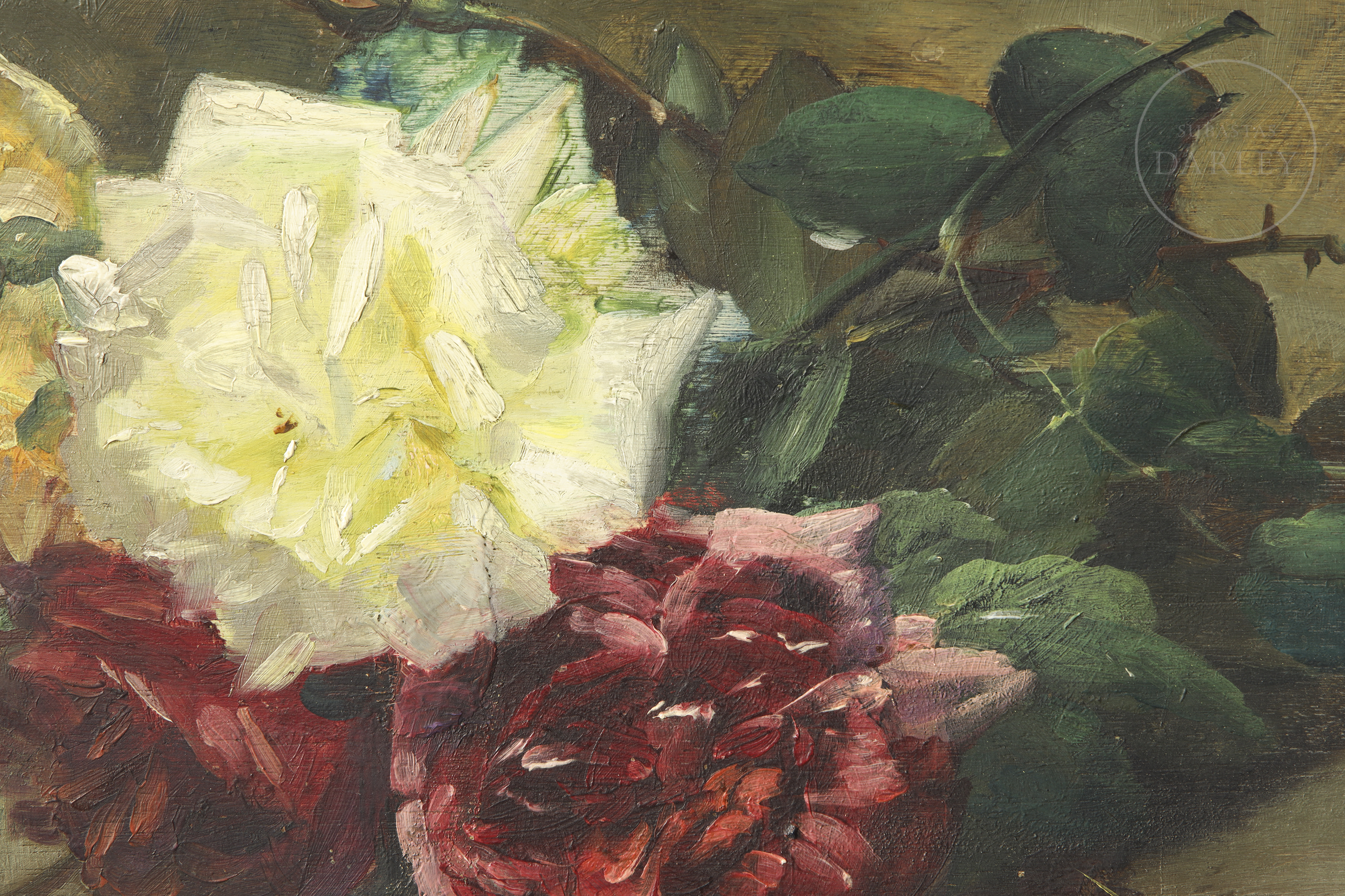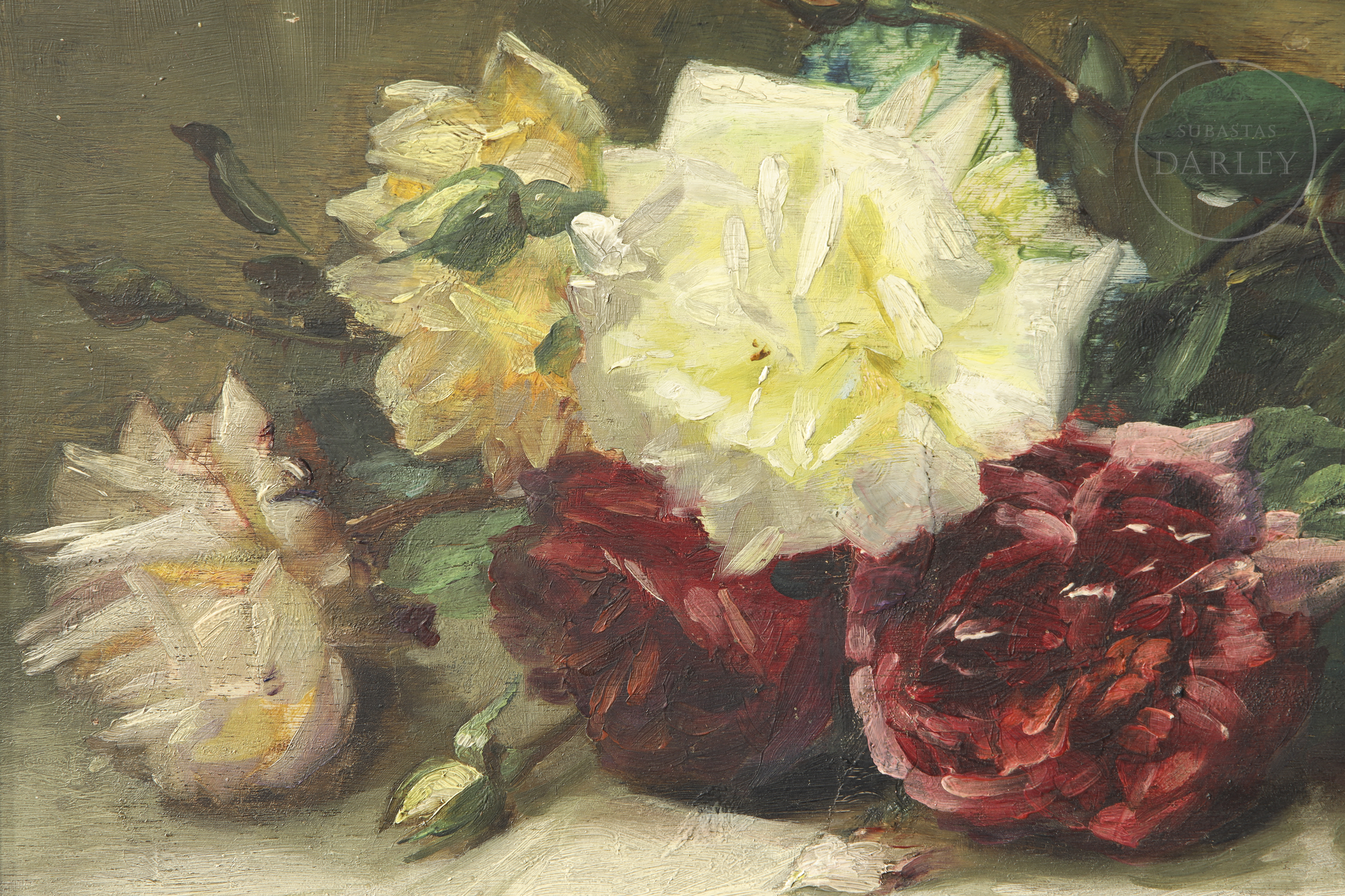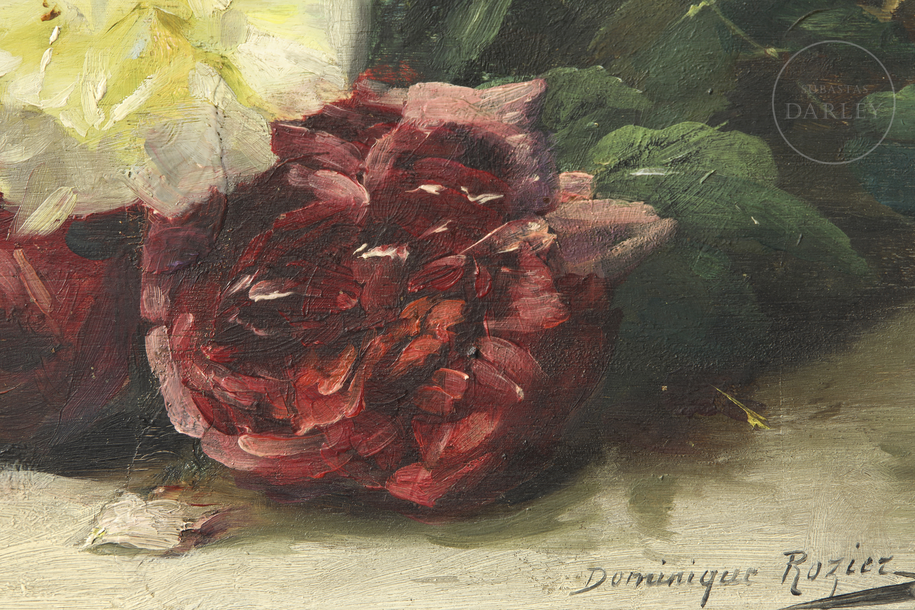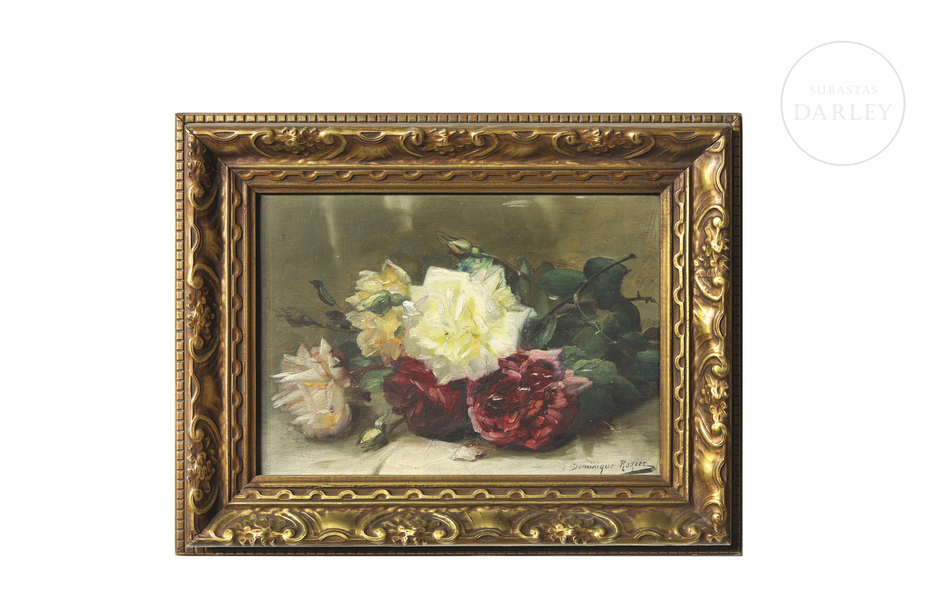 Óleo sobre tabla. Delicado bodegón que representa un ramo de rosas de distintos colores dispuestas sobre un entablado. La obra destaca por su realismo y trabajo en la captación de los pétalos. Firmado "Dominique Rozier" en la esquina inferior derecha.