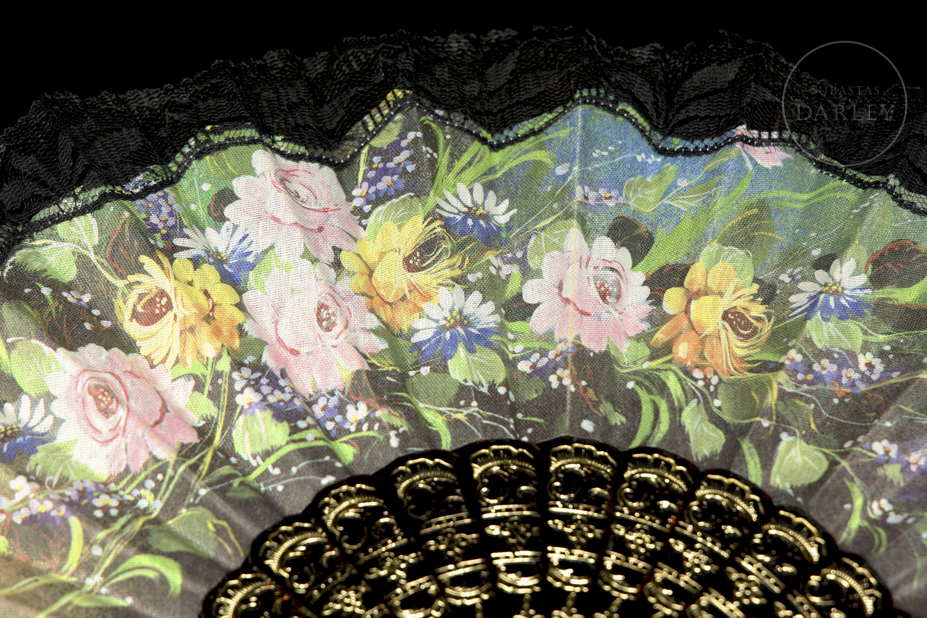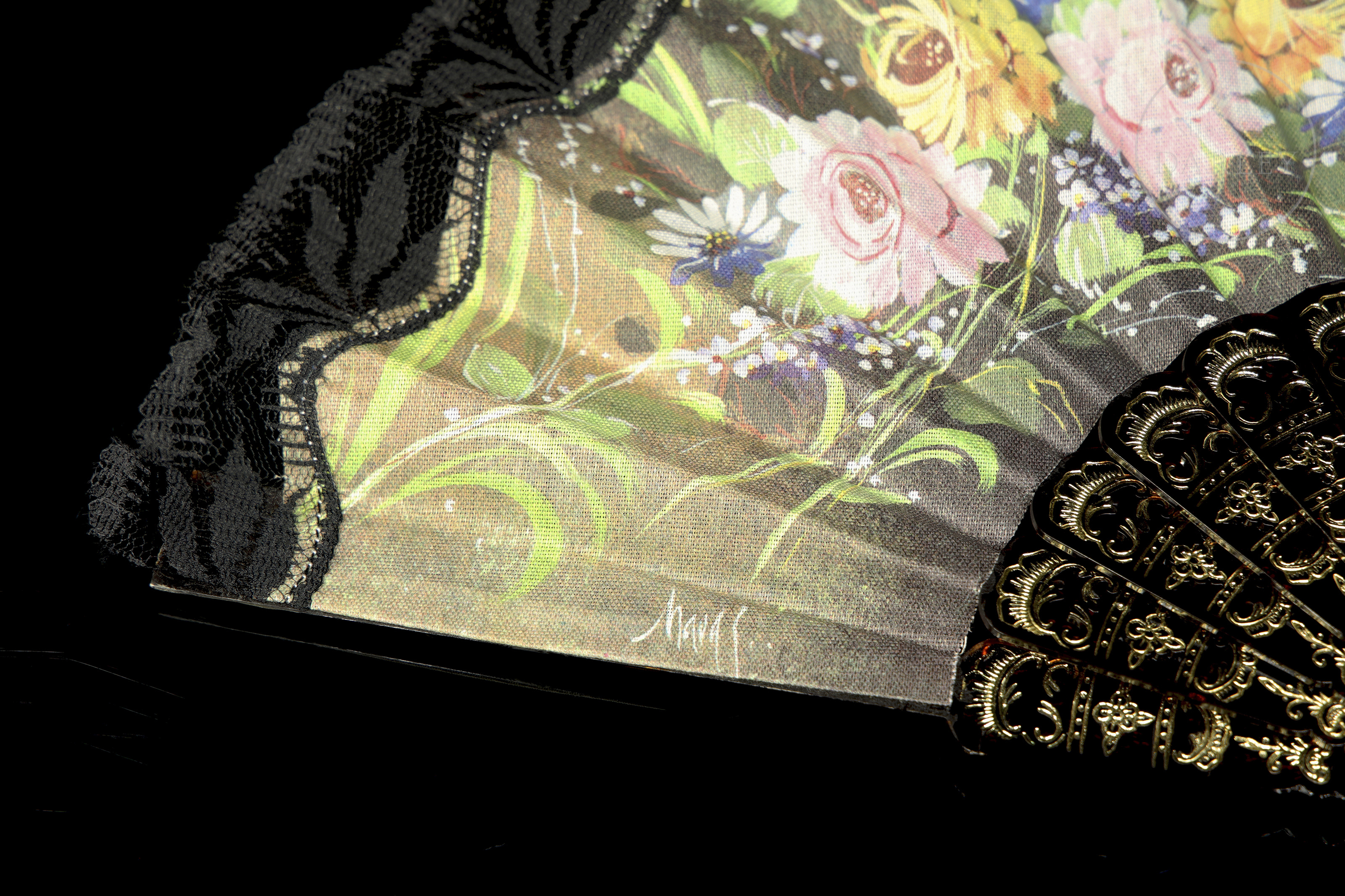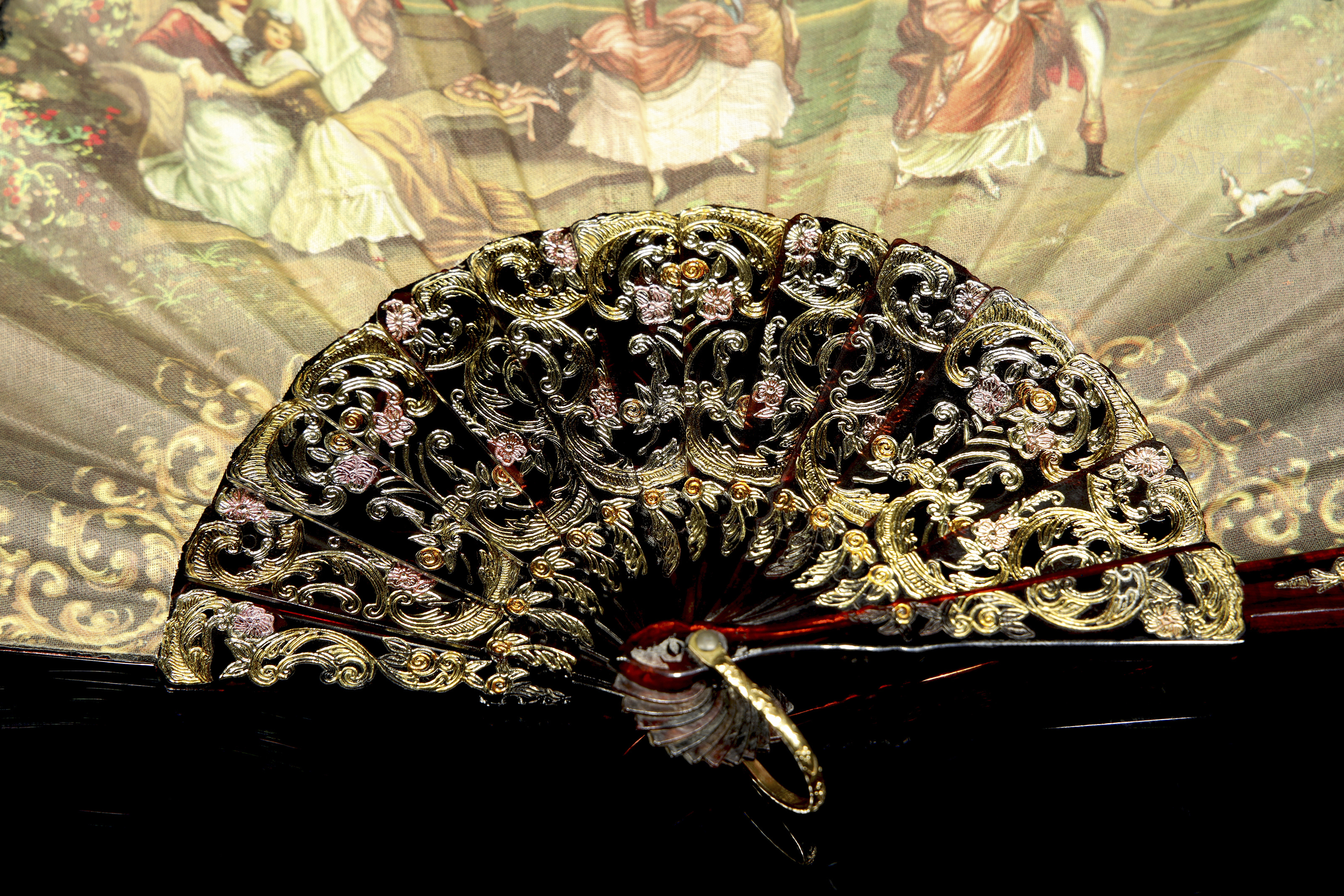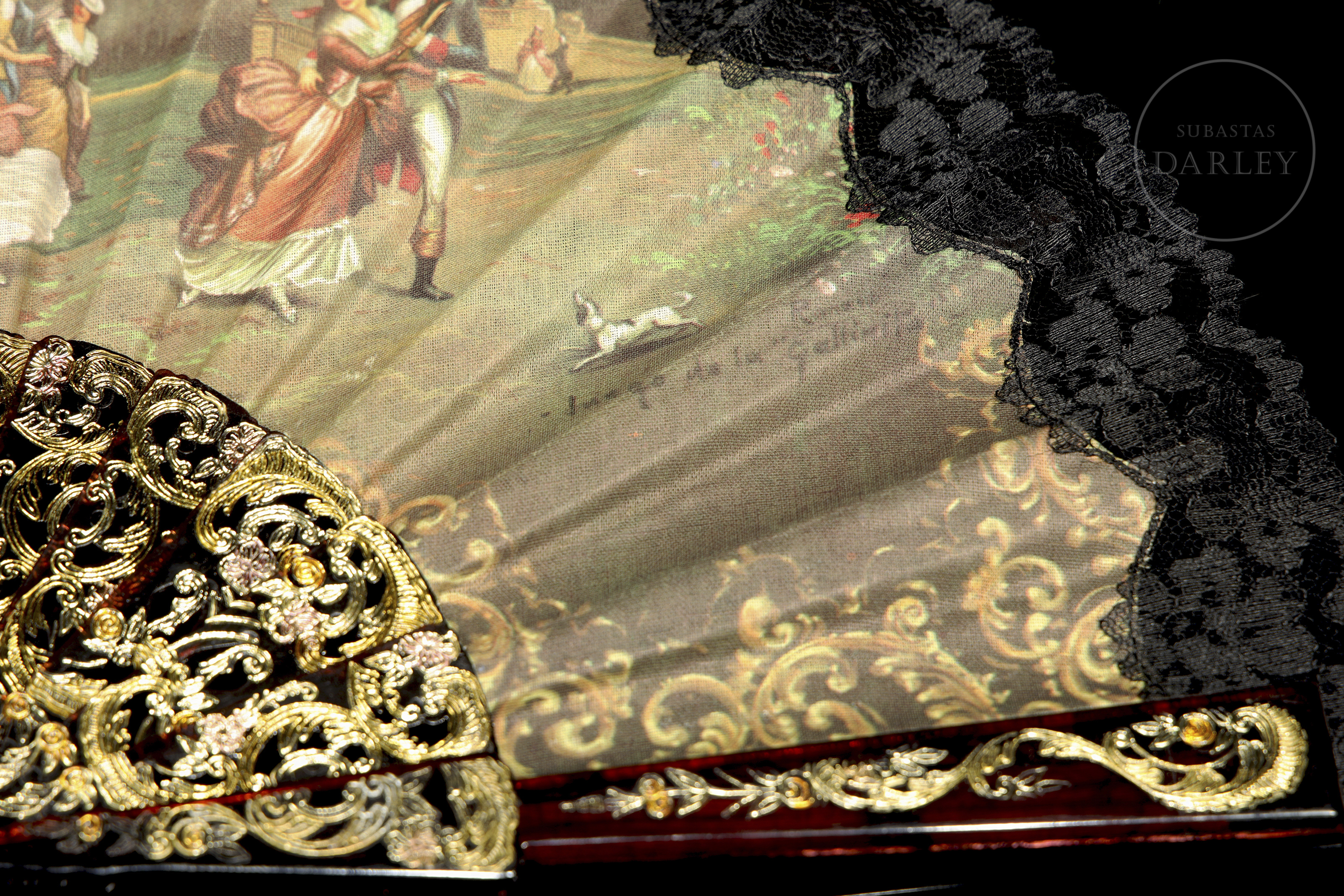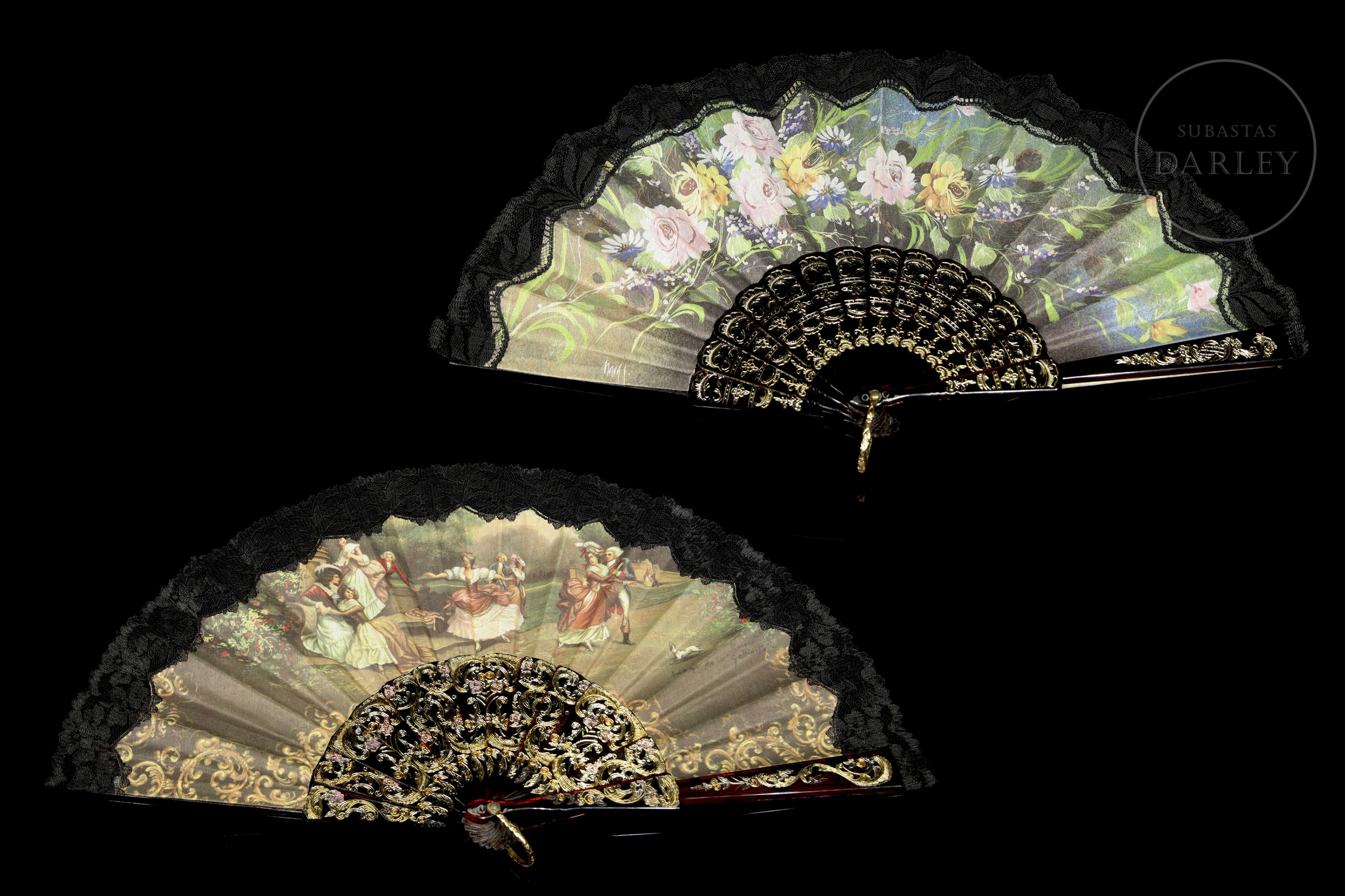 Un abanico presenta un bodegón floral policromado, y el otro una escena galante de cortejo. Ambos comparten el varillaje de carey sintético con profusas aplicaciones doradas y un borde de encaje negro.