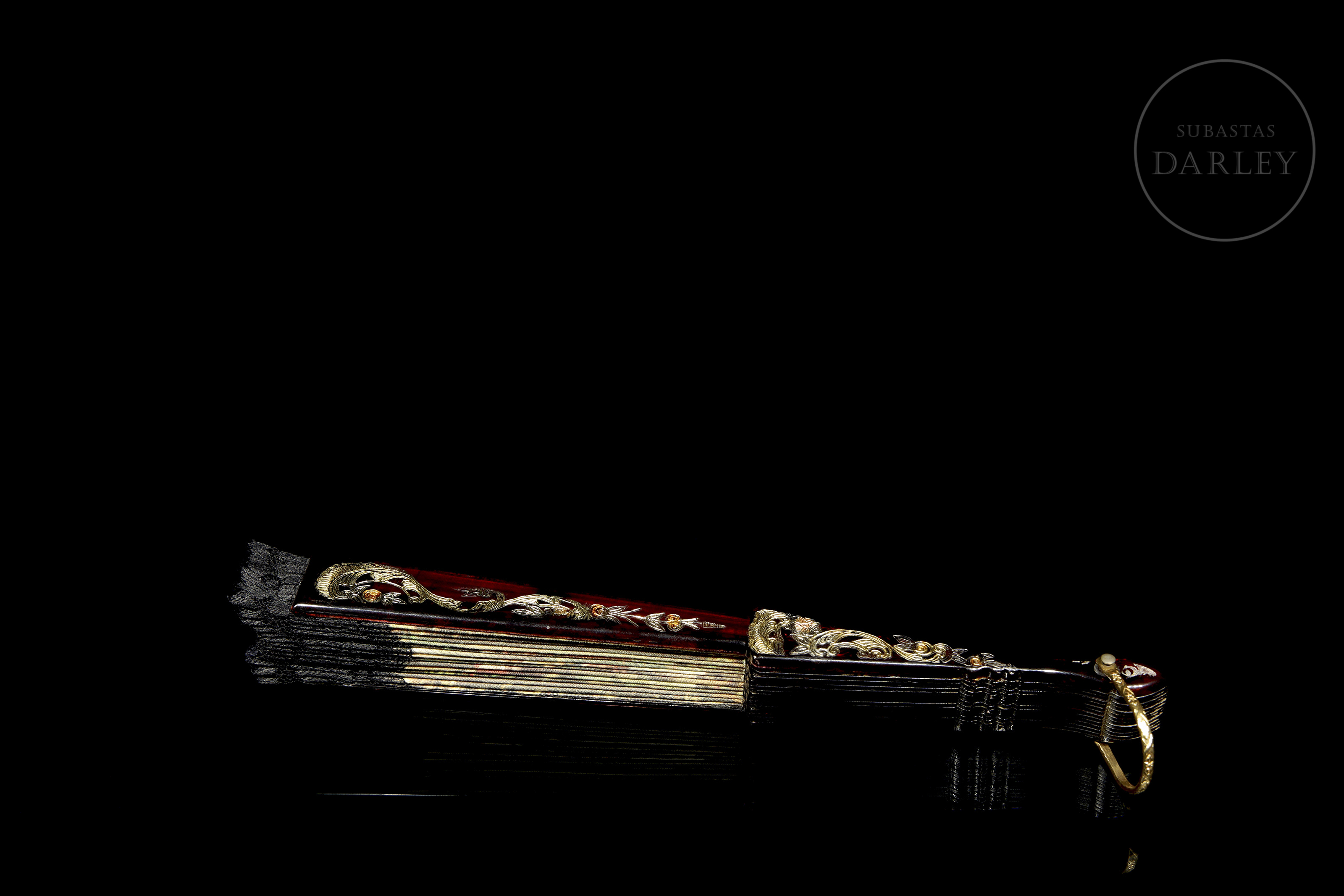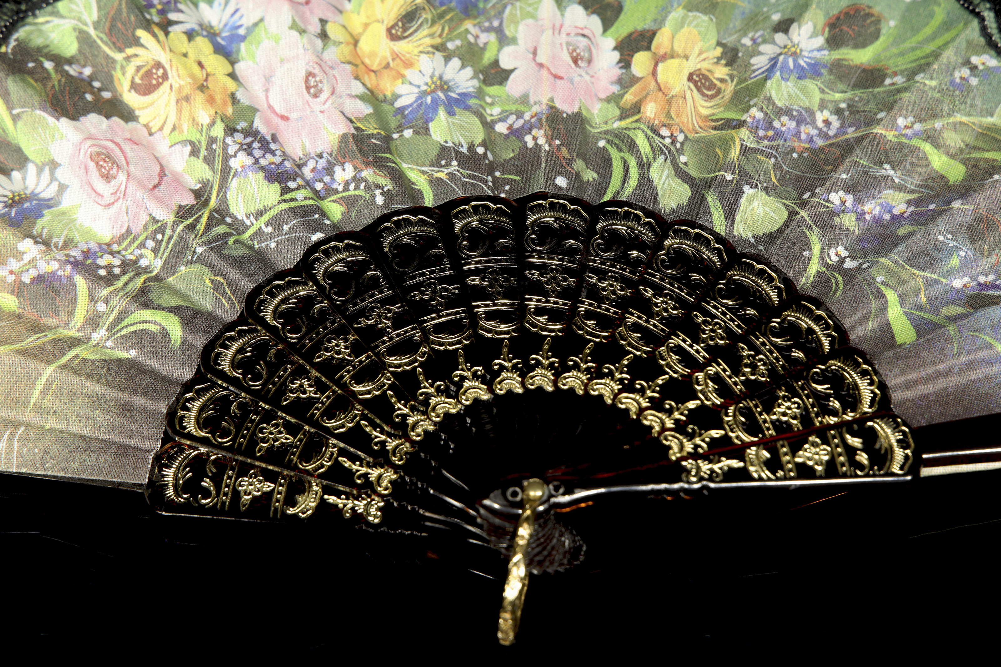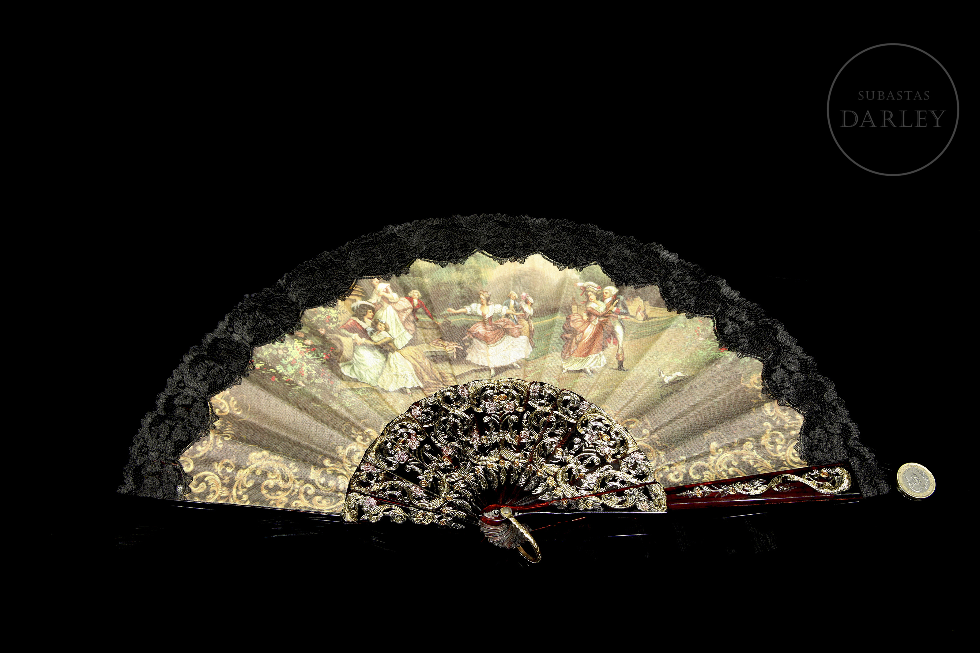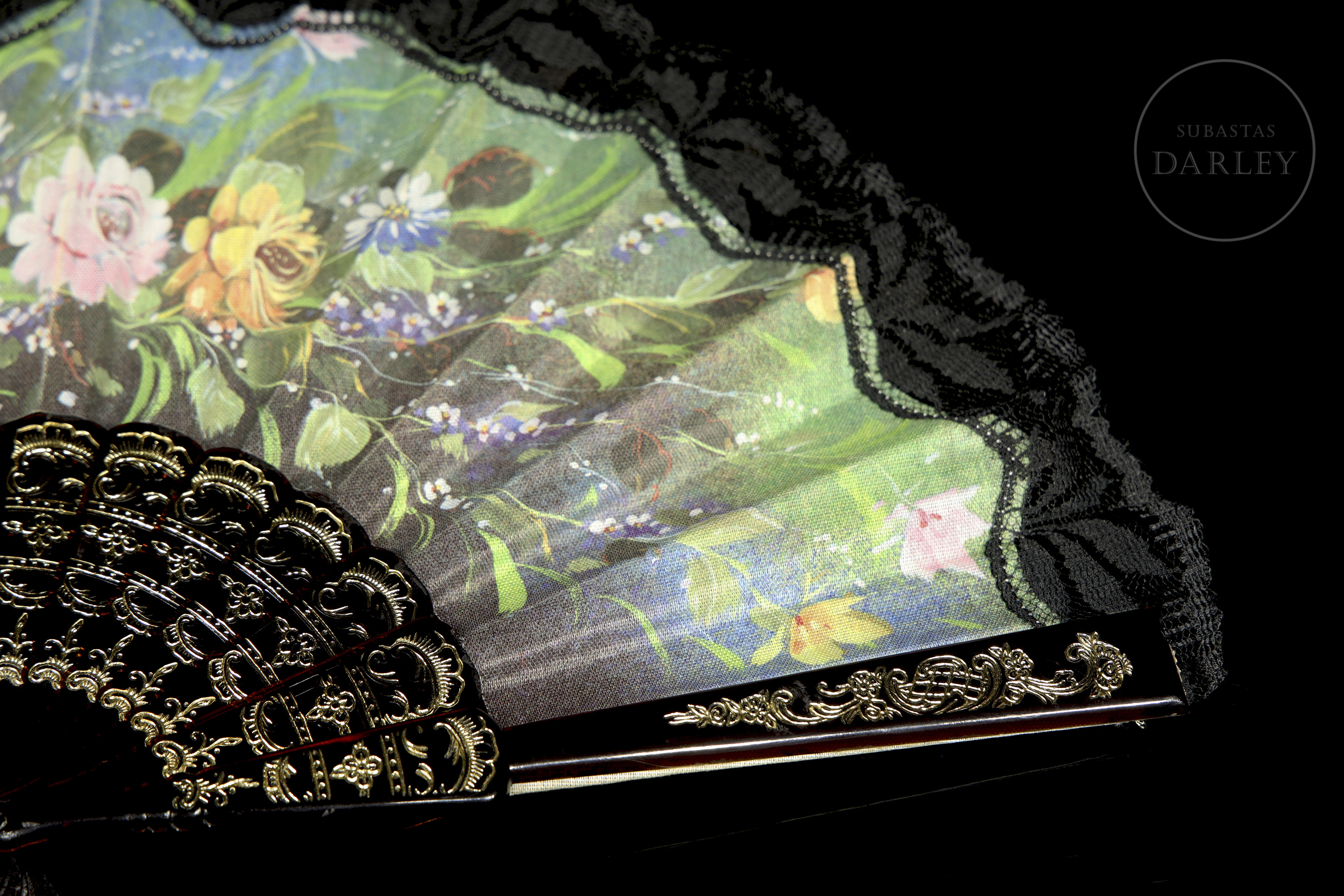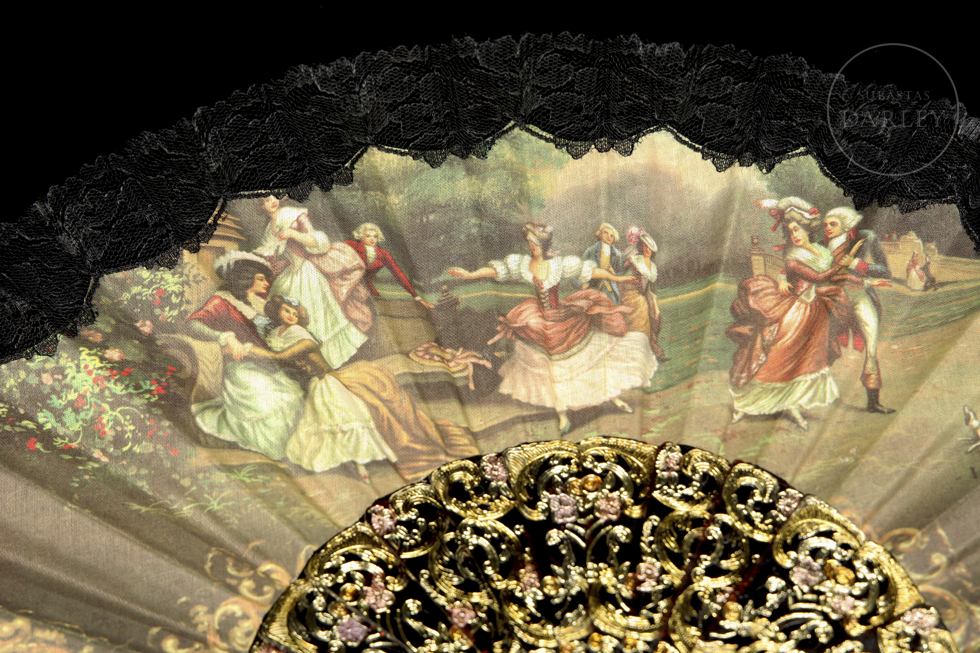 Un abanico presenta un bodegón floral policromado, y el otro una escena galante de cortejo. Ambos comparten el varillaje de carey sintético con profusas aplicaciones doradas y un borde de encaje negro.