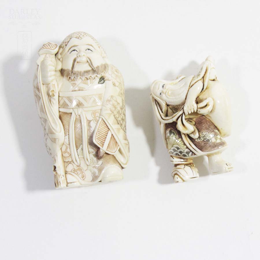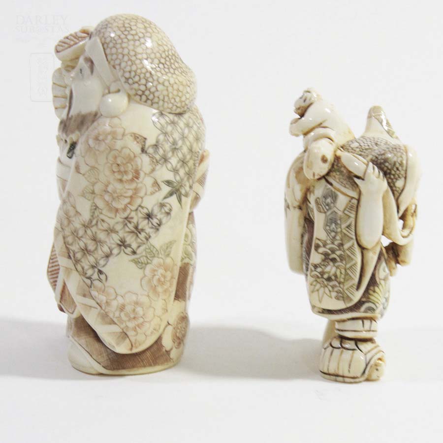 Bonitas figuras japonesas de marfil, uno de ellas es poco vista, anciana con un mono en la espalda y el cuello y cabeza muy torcida, buena calidad.