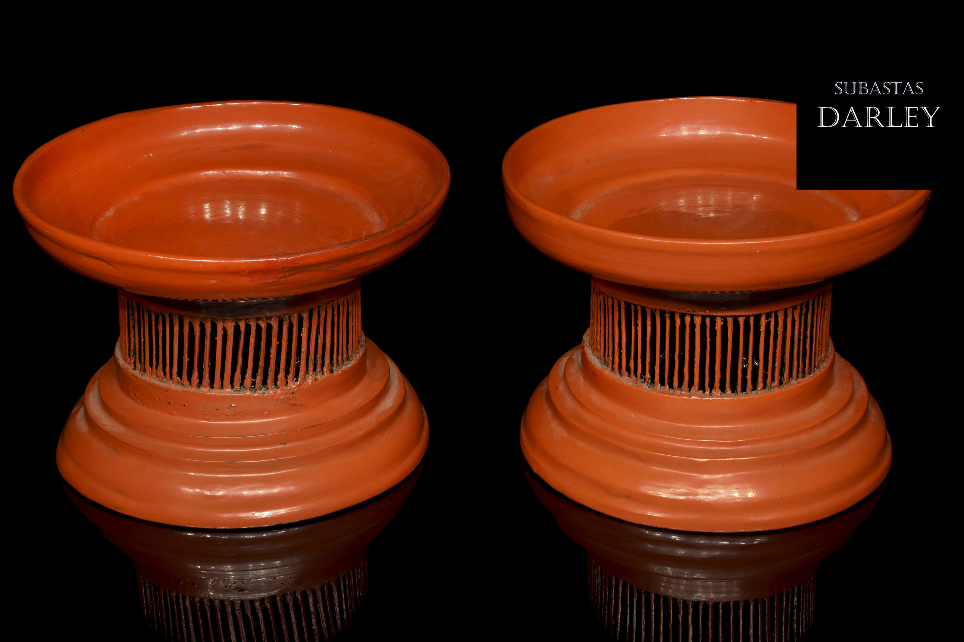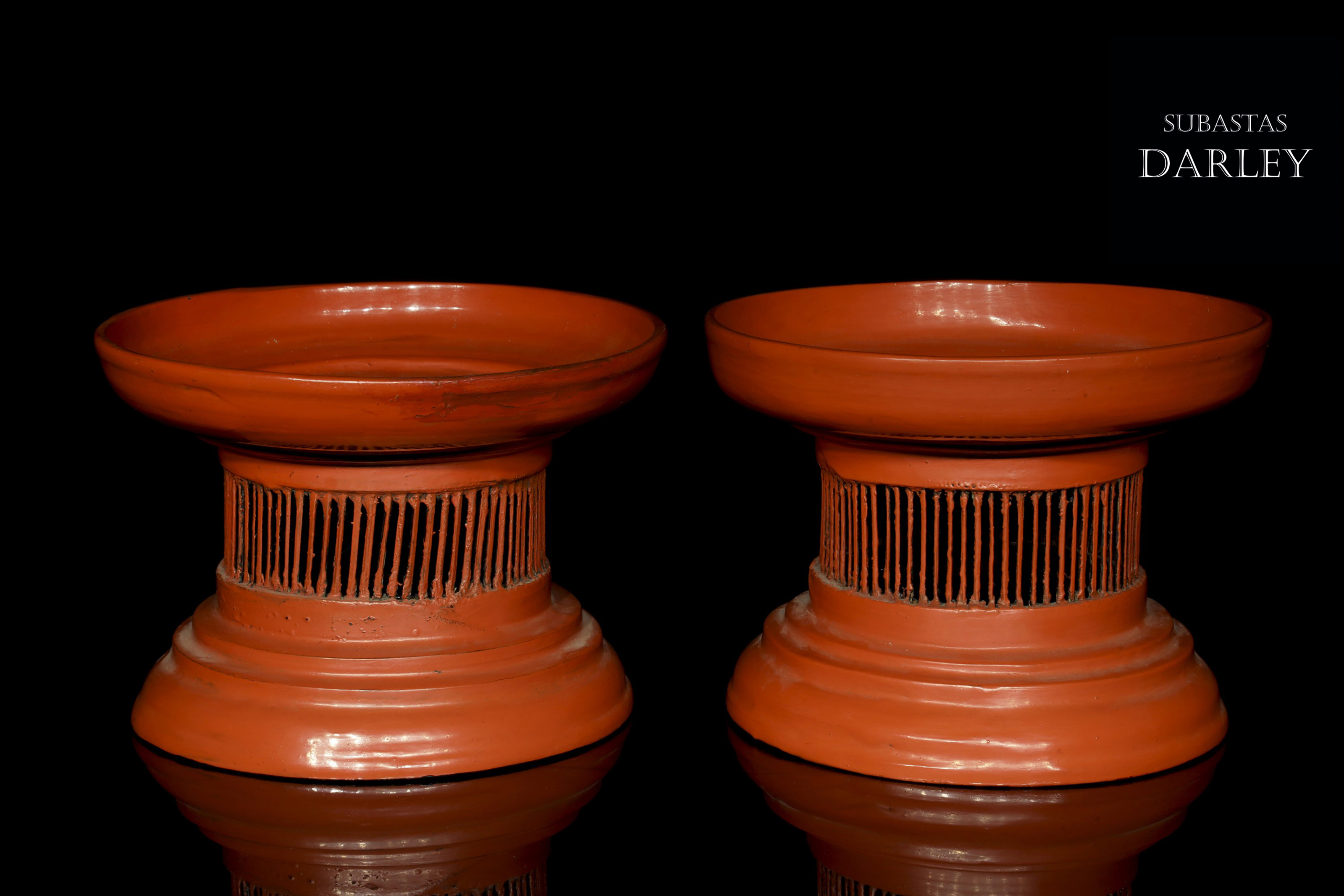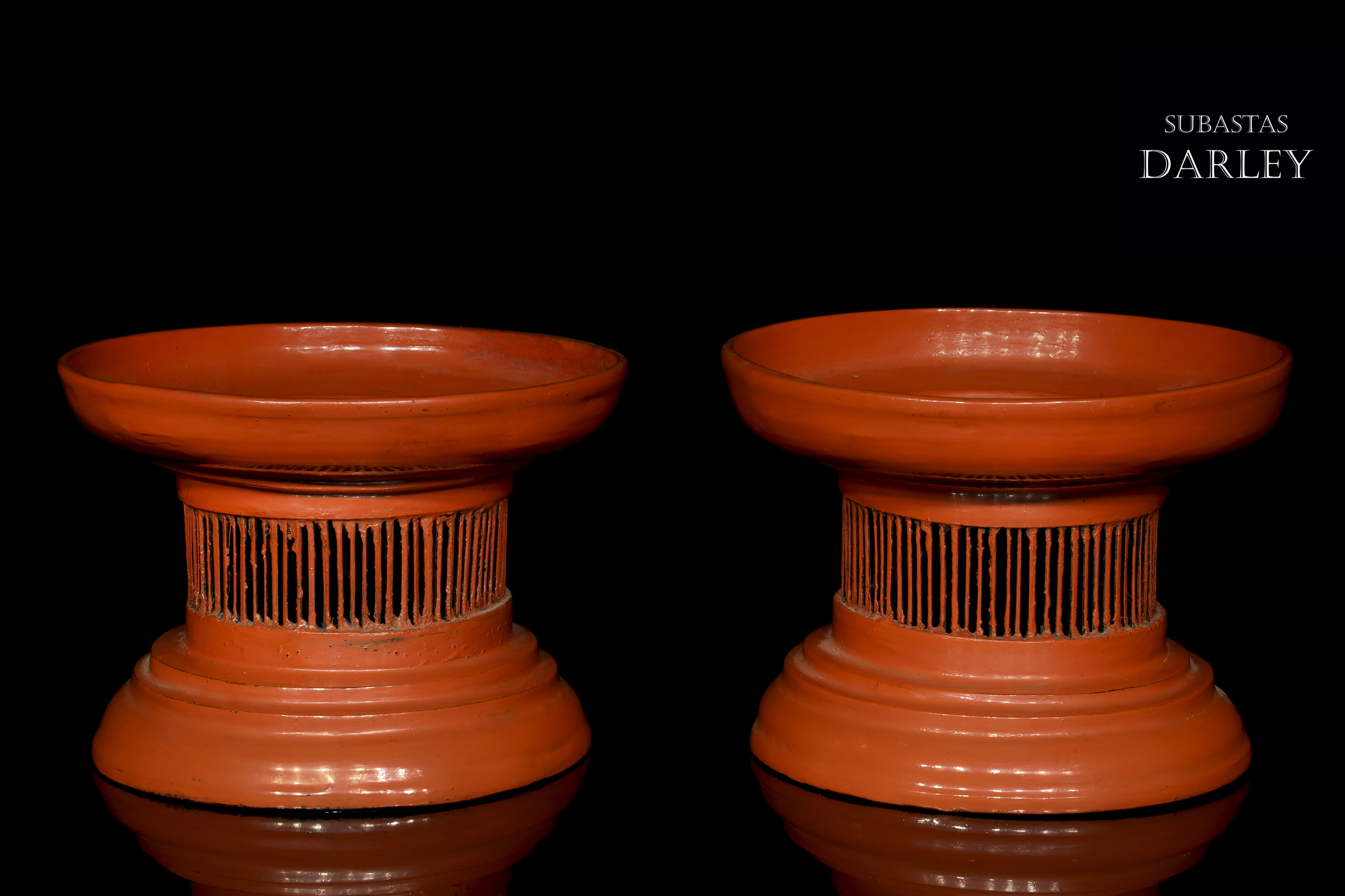 Madera tallada y lacada en rojo. Compuestos por una bandeja ancha con un borde vertical unido mediante delgadas tablillas a un pie escalonado.