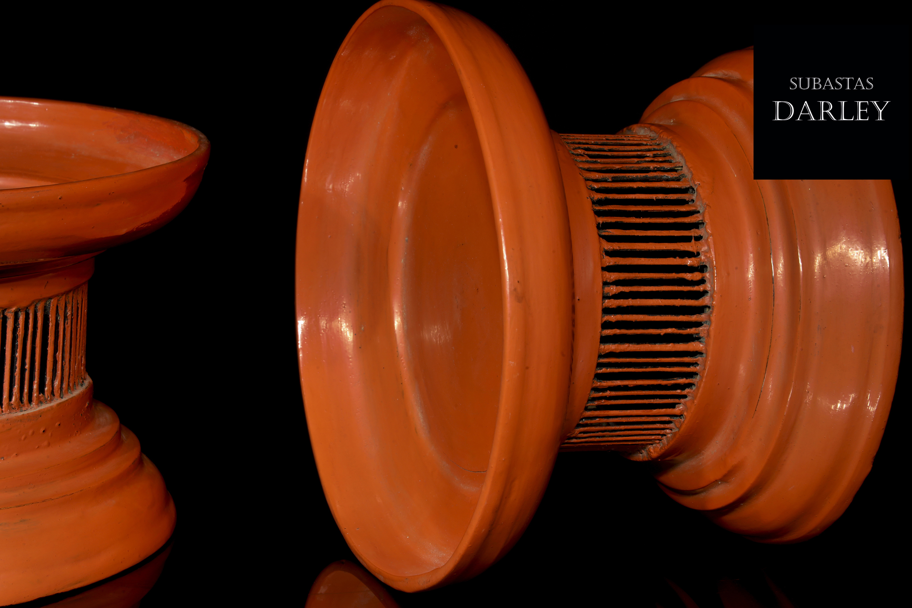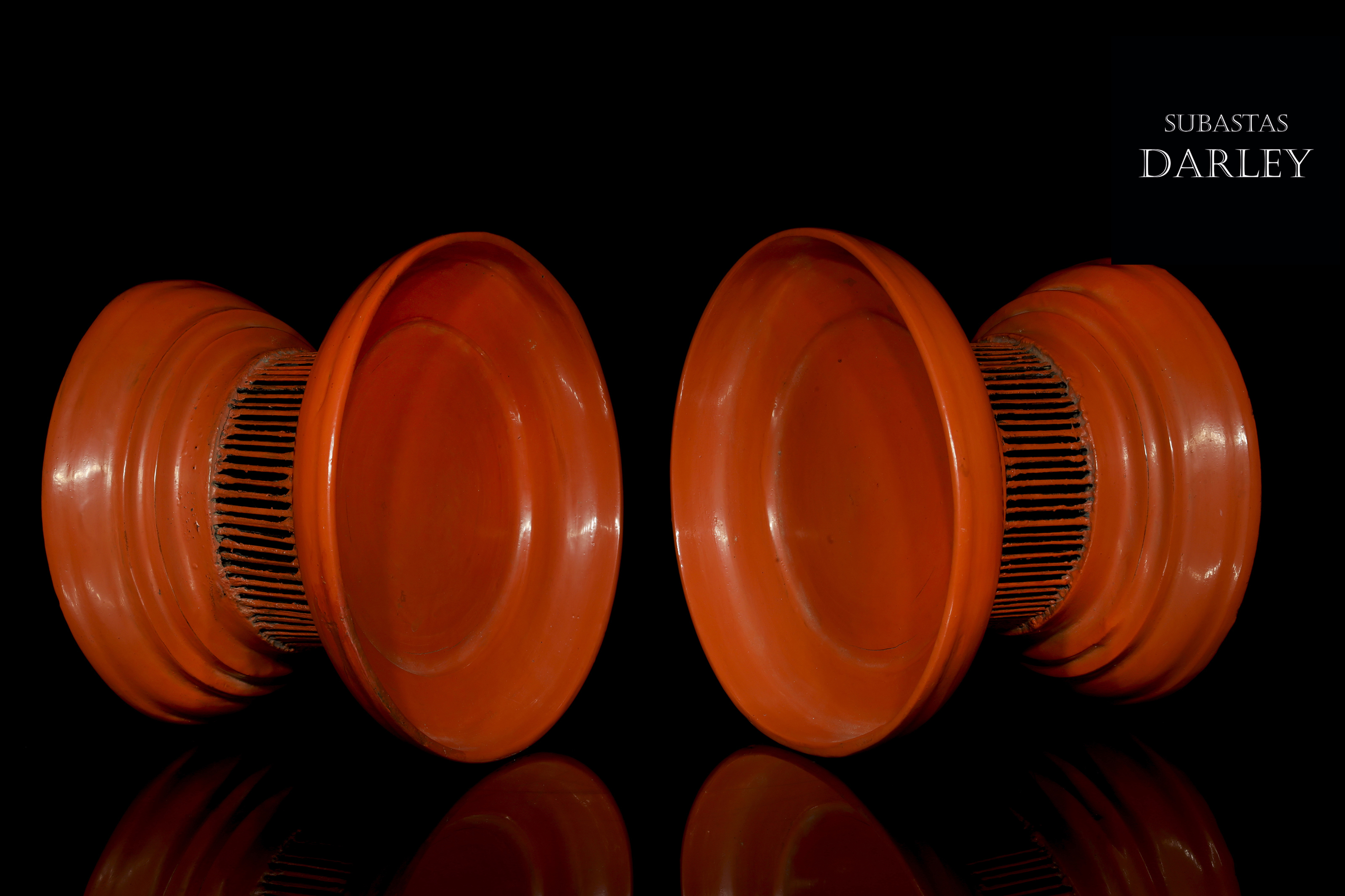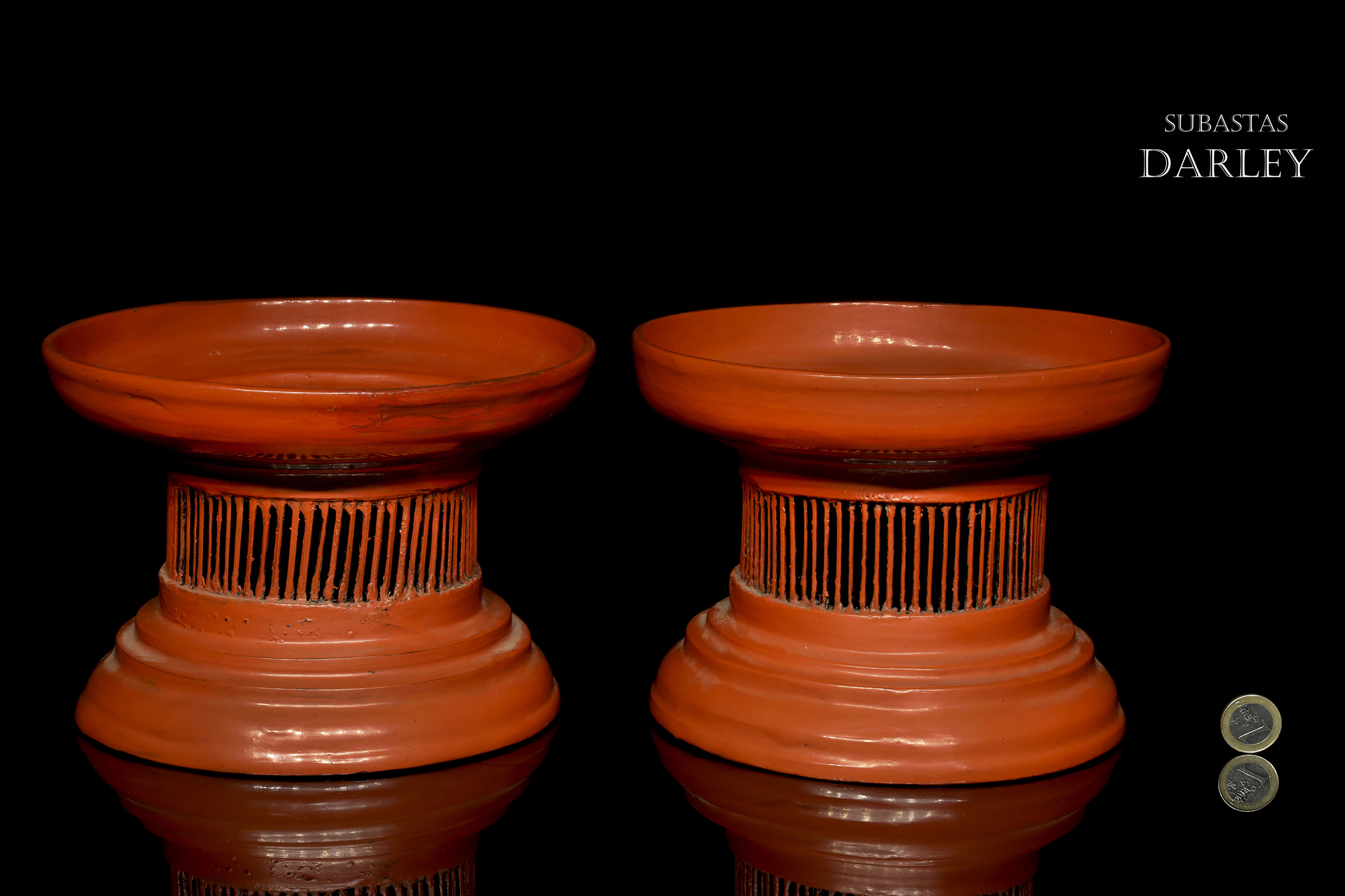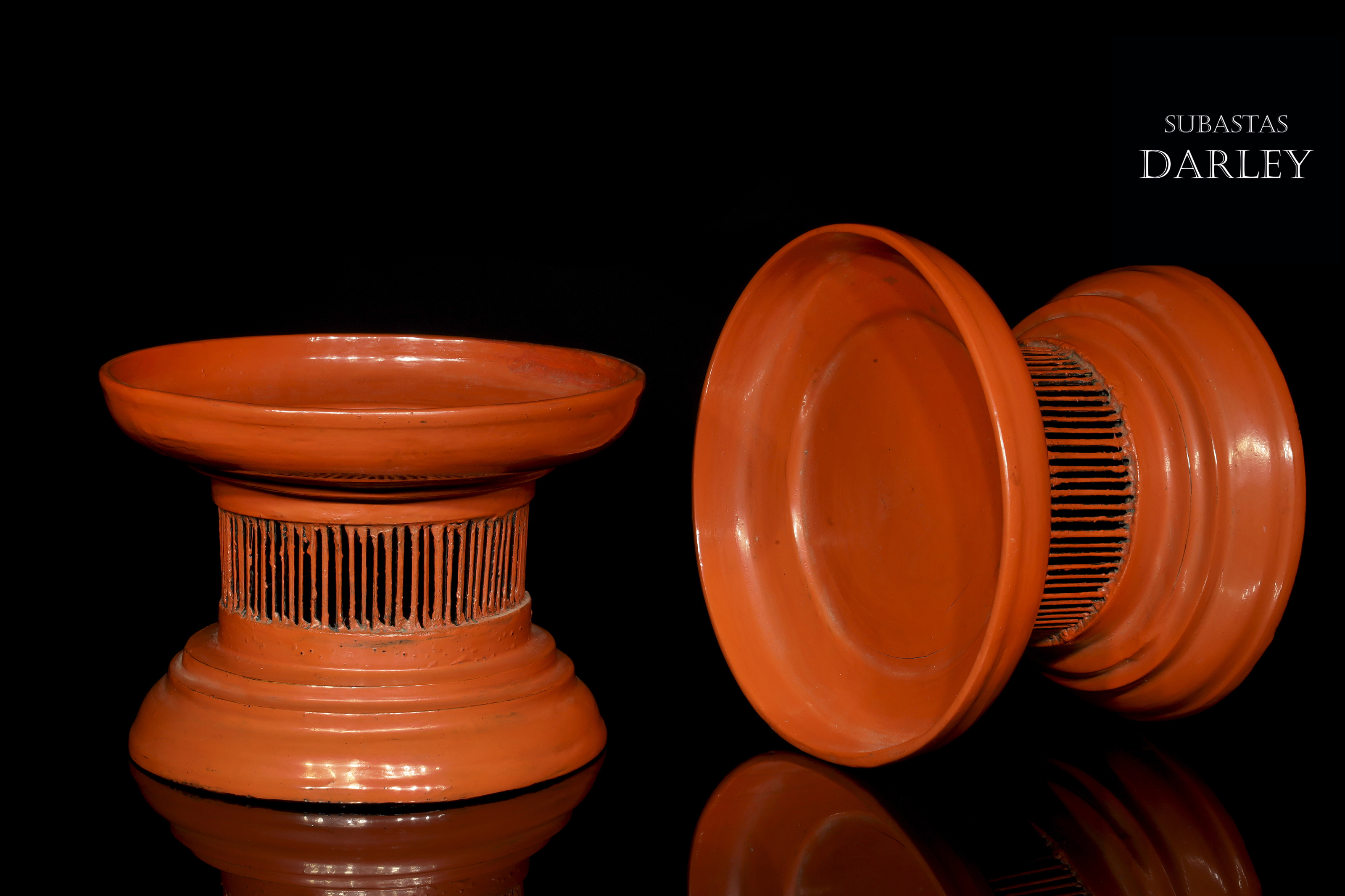 Madera tallada y lacada en rojo. Compuestos por una bandeja ancha con un borde vertical unido mediante delgadas tablillas a un pie escalonado.