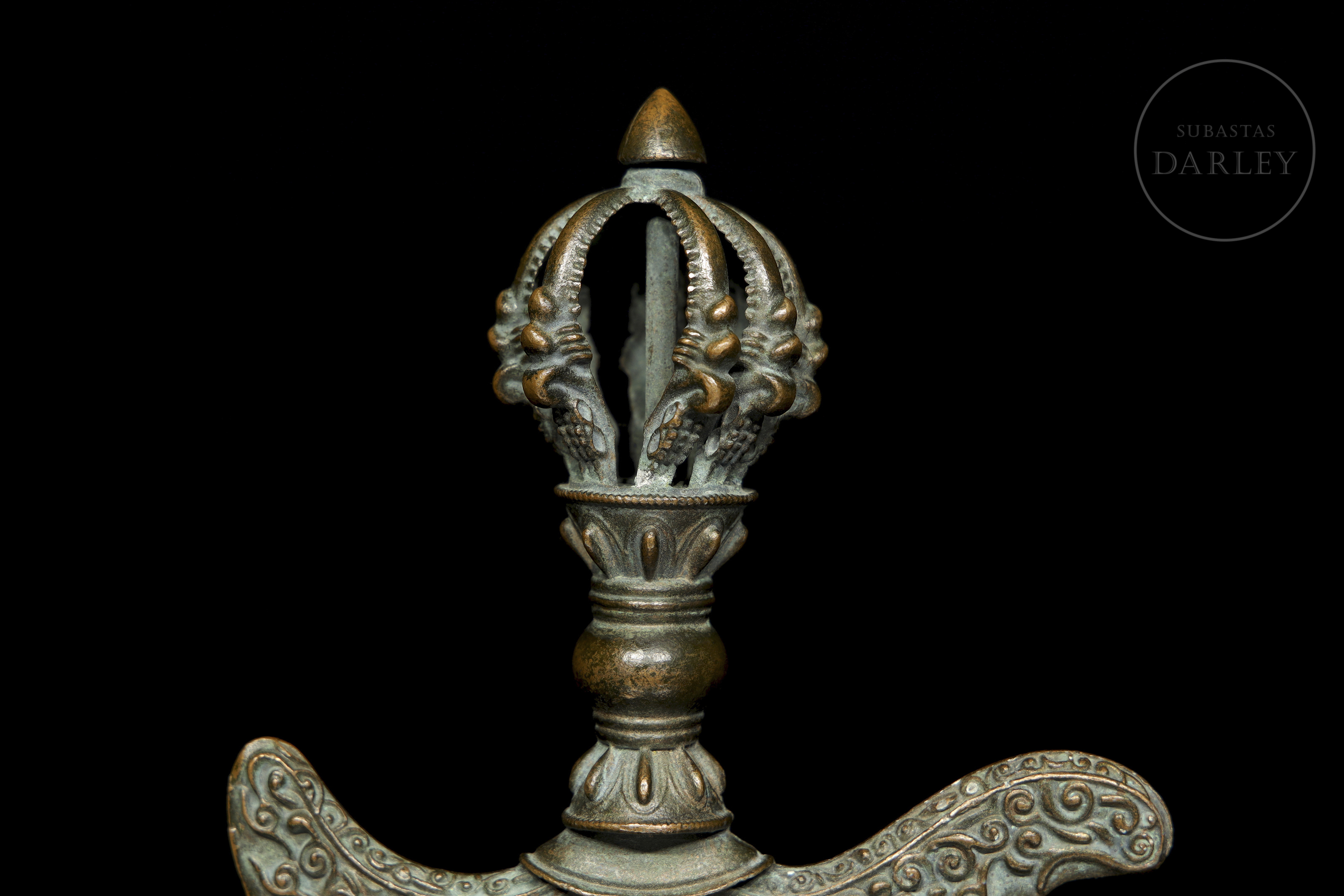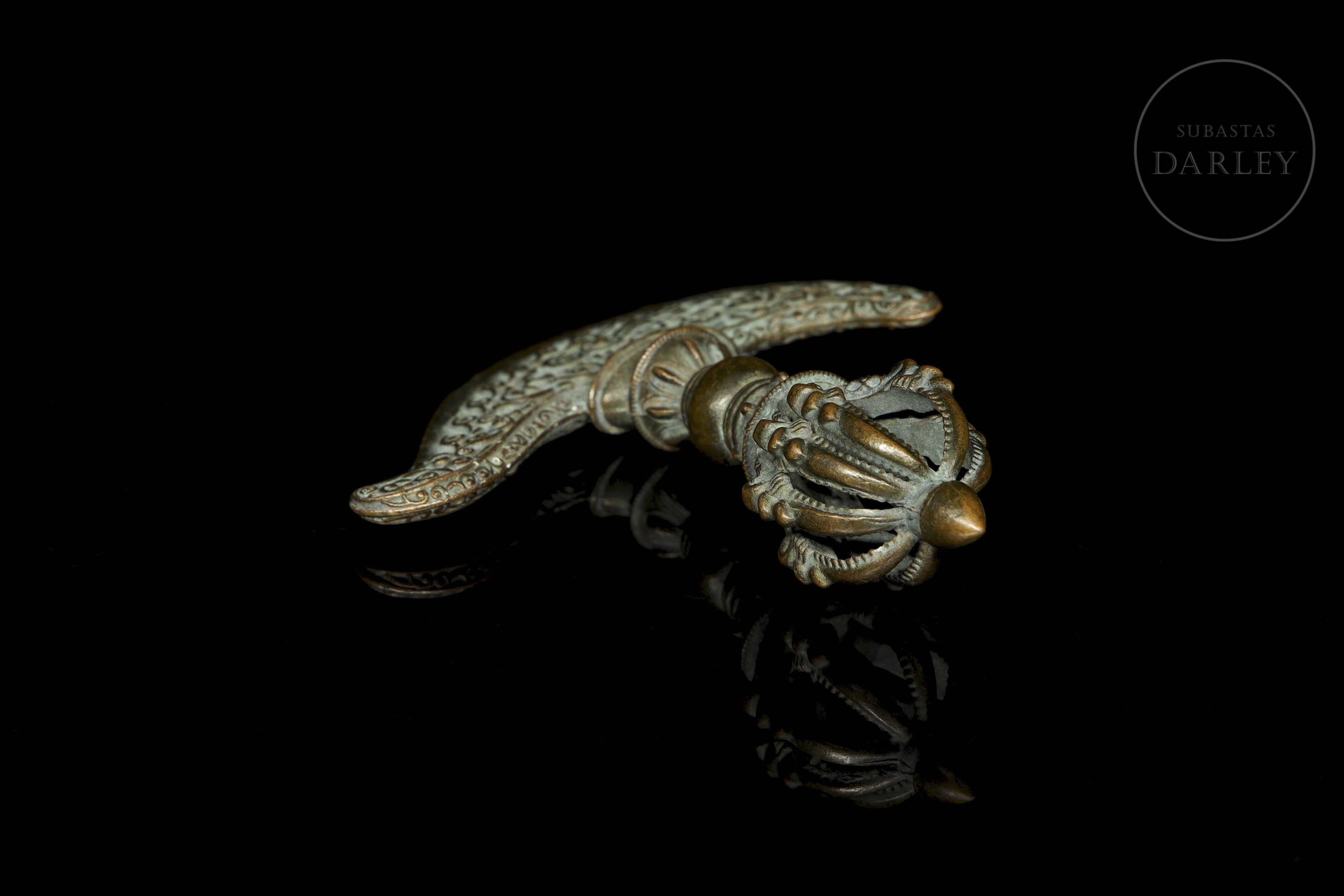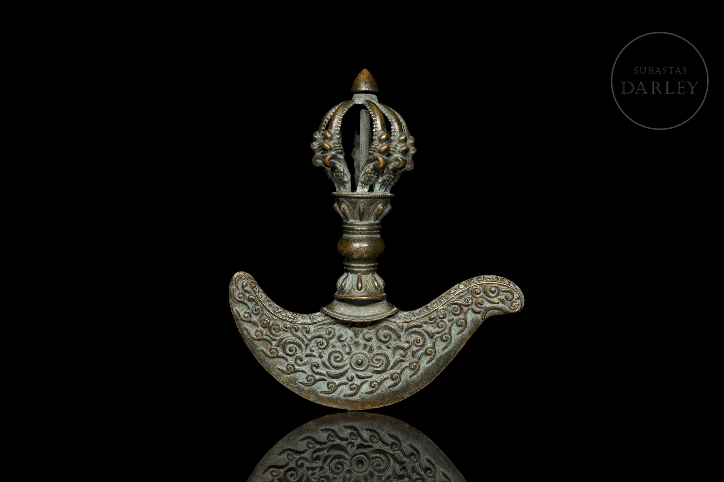 Instrumento ritual budista tibetano de bronce, conocido como Kartika (Drigug). Posee una en forma de Vajra (o Dorje), con un nudo central y puntas que emergen de una flor de loto. La empuñadura se une a la hoja en forma de media luna, ornamentada con relieves de roleos y llamas.