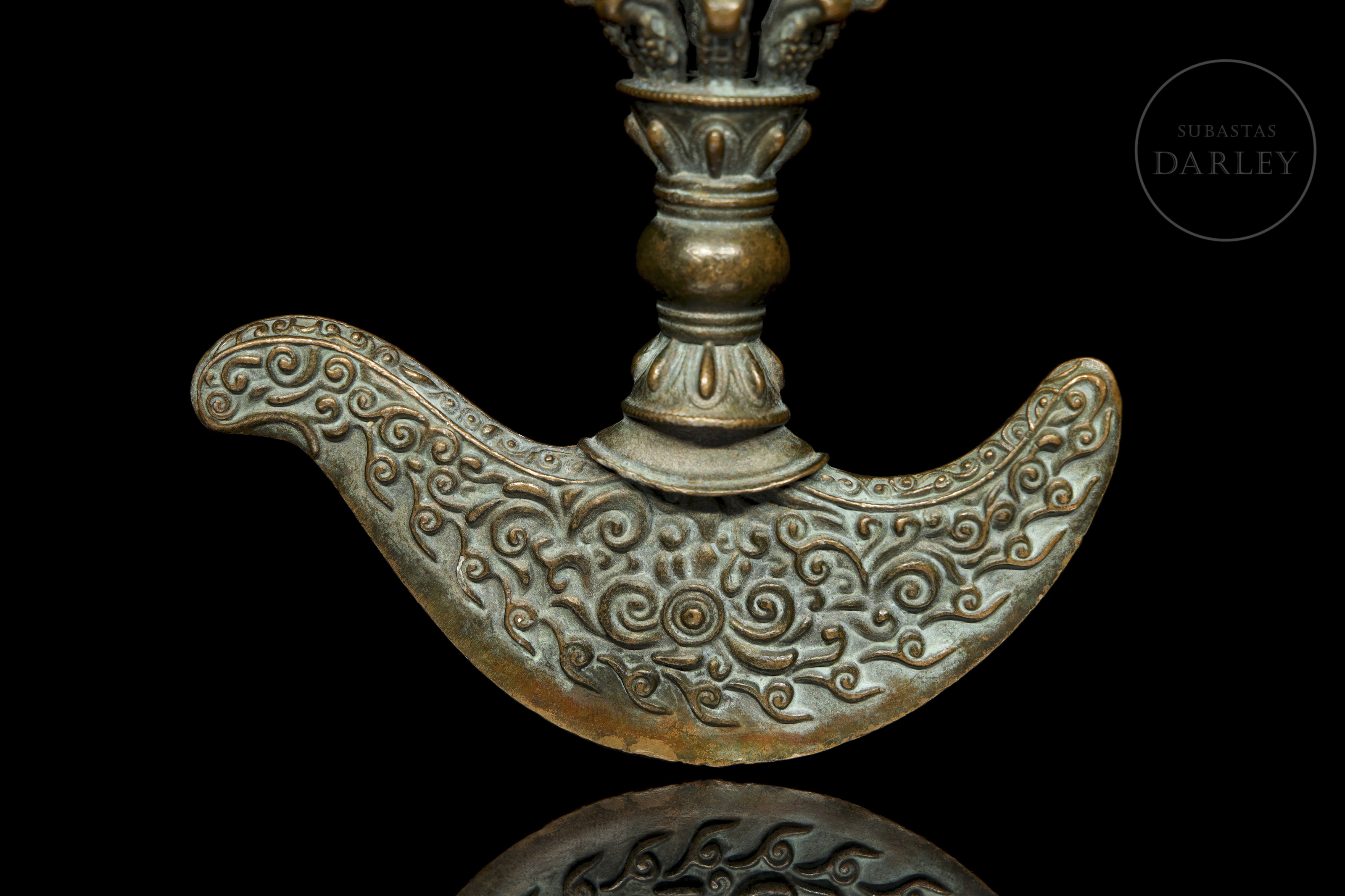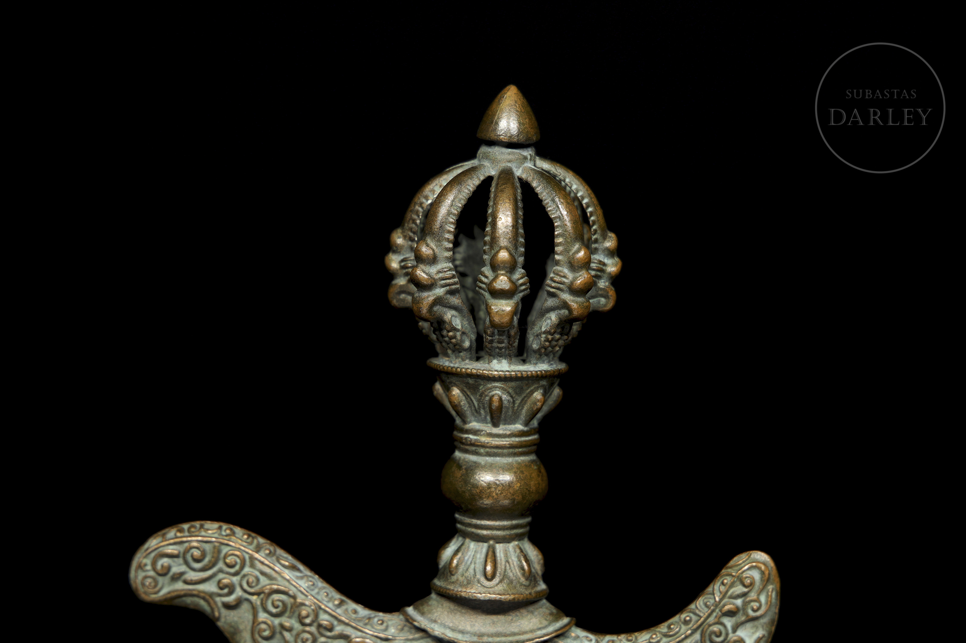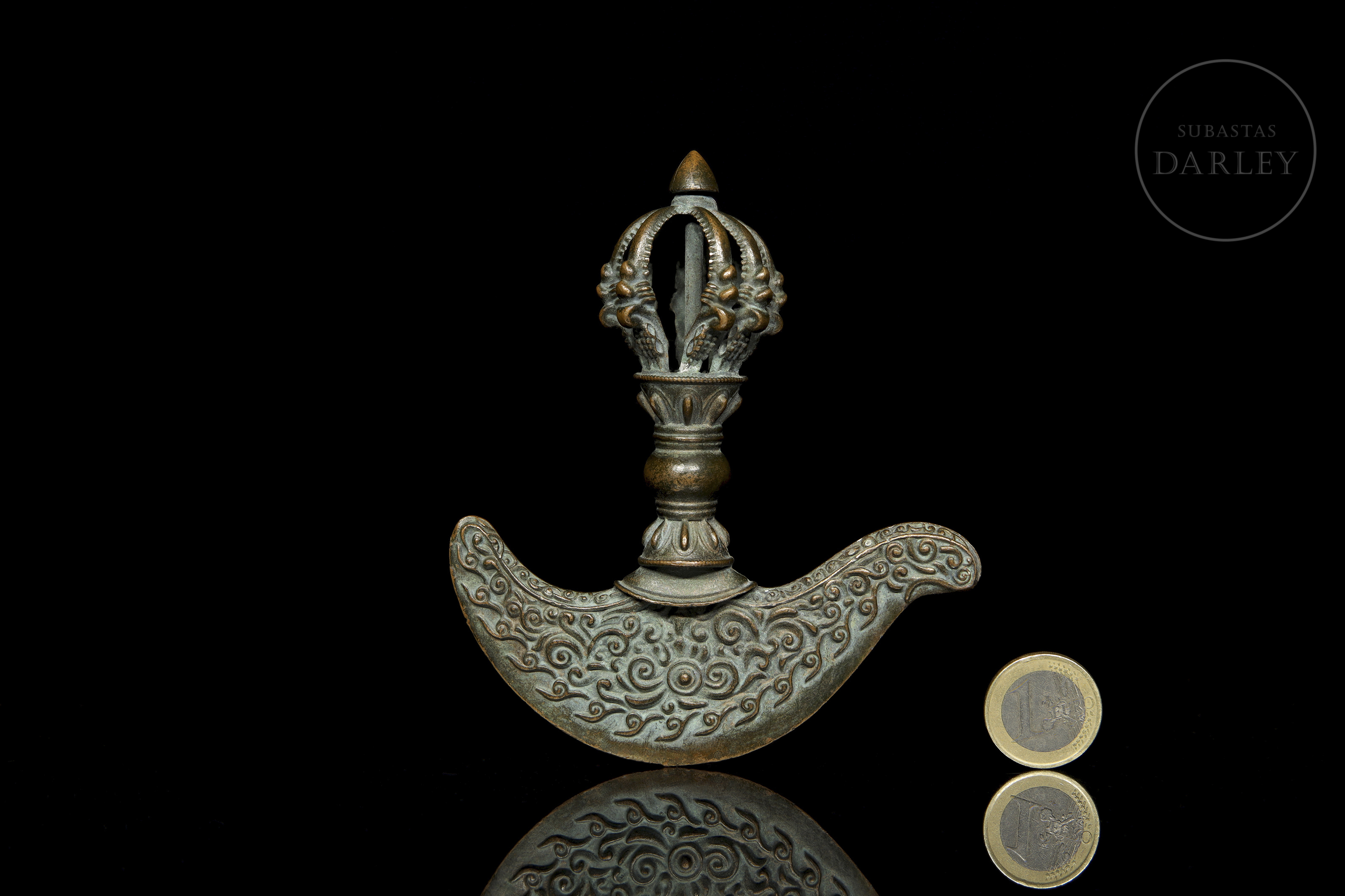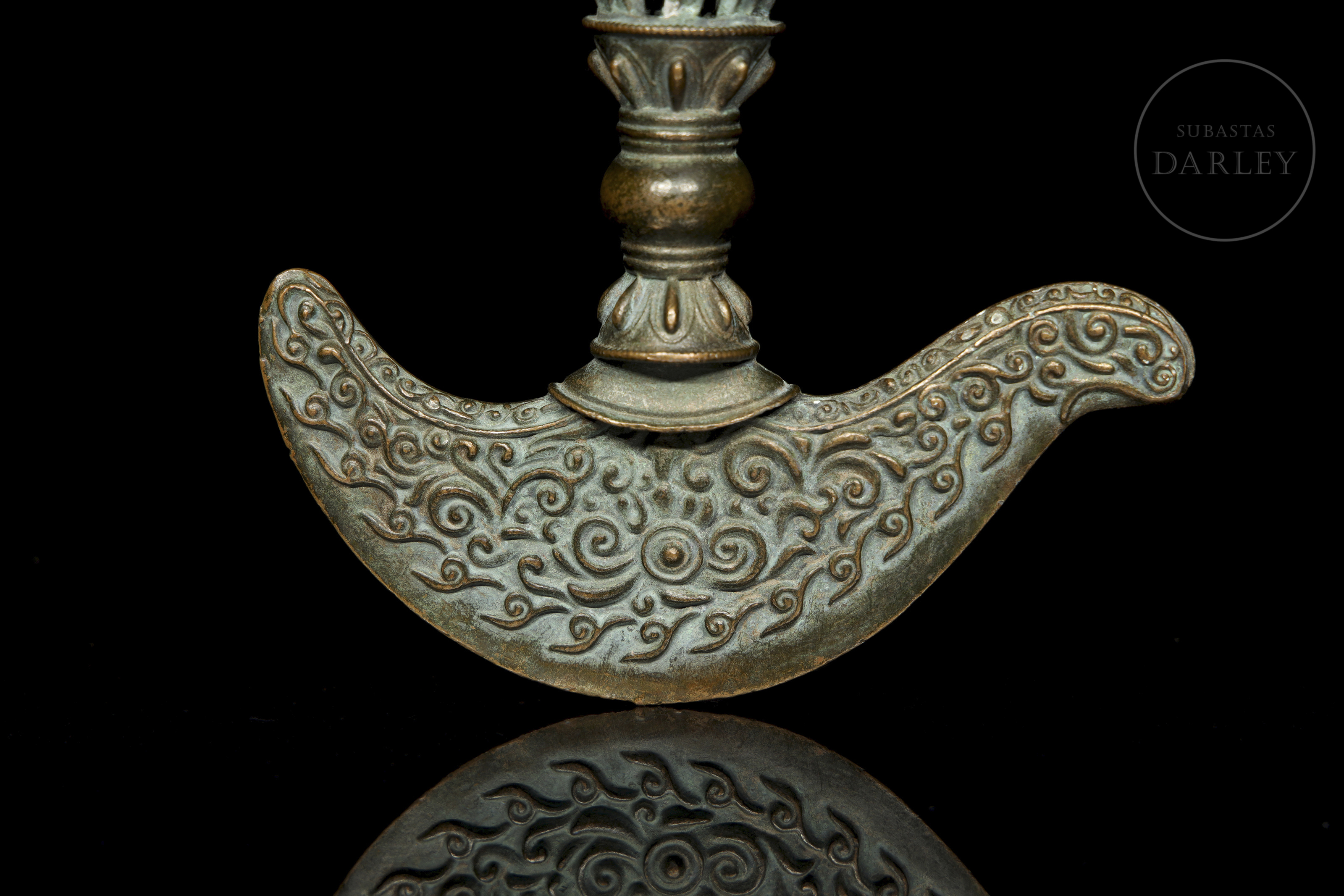 Instrumento ritual budista tibetano de bronce, conocido como Kartika (Drigug). Posee una en forma de Vajra (o Dorje), con un nudo central y puntas que emergen de una flor de loto. La empuñadura se une a la hoja en forma de media luna, ornamentada con relieves de roleos y llamas.