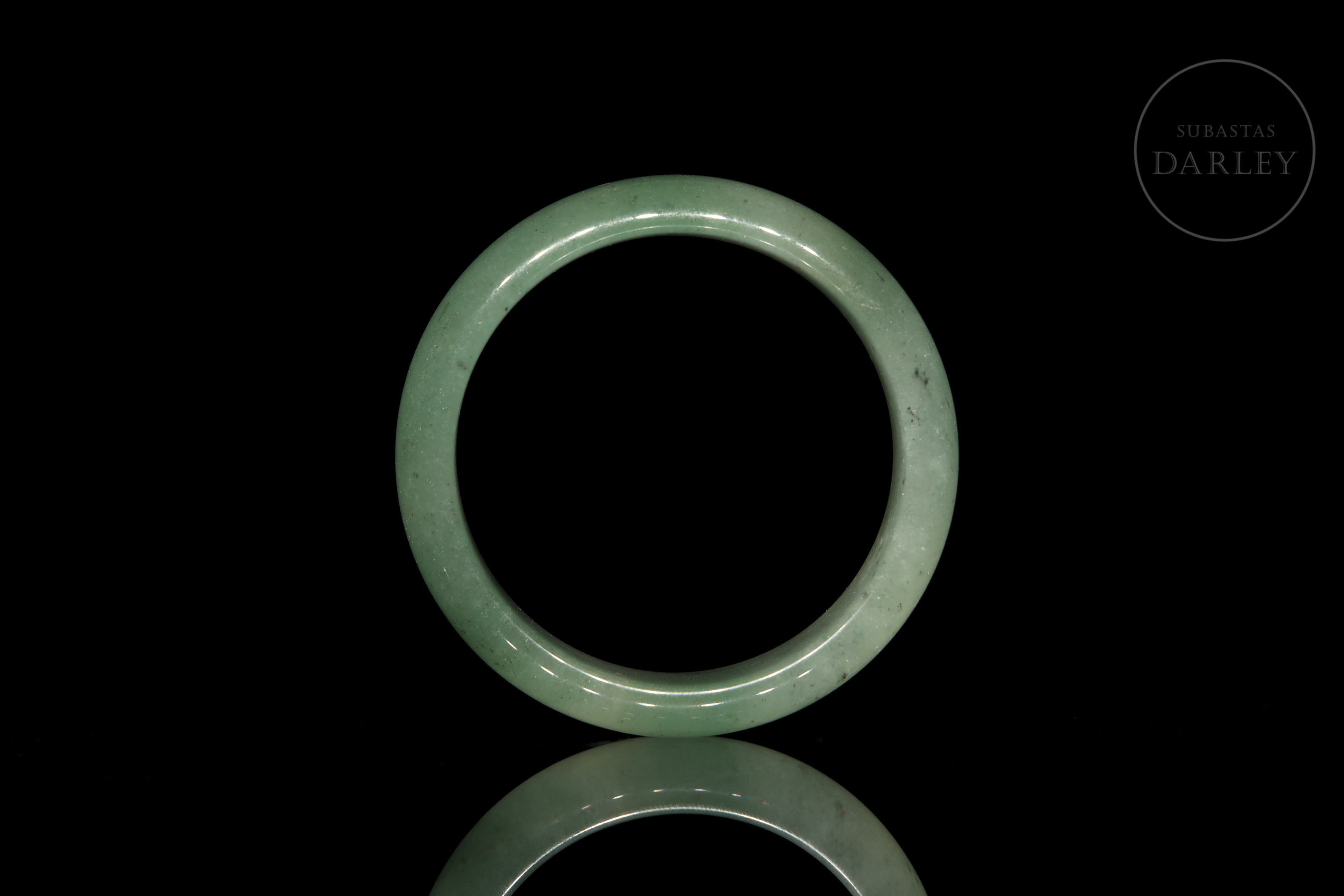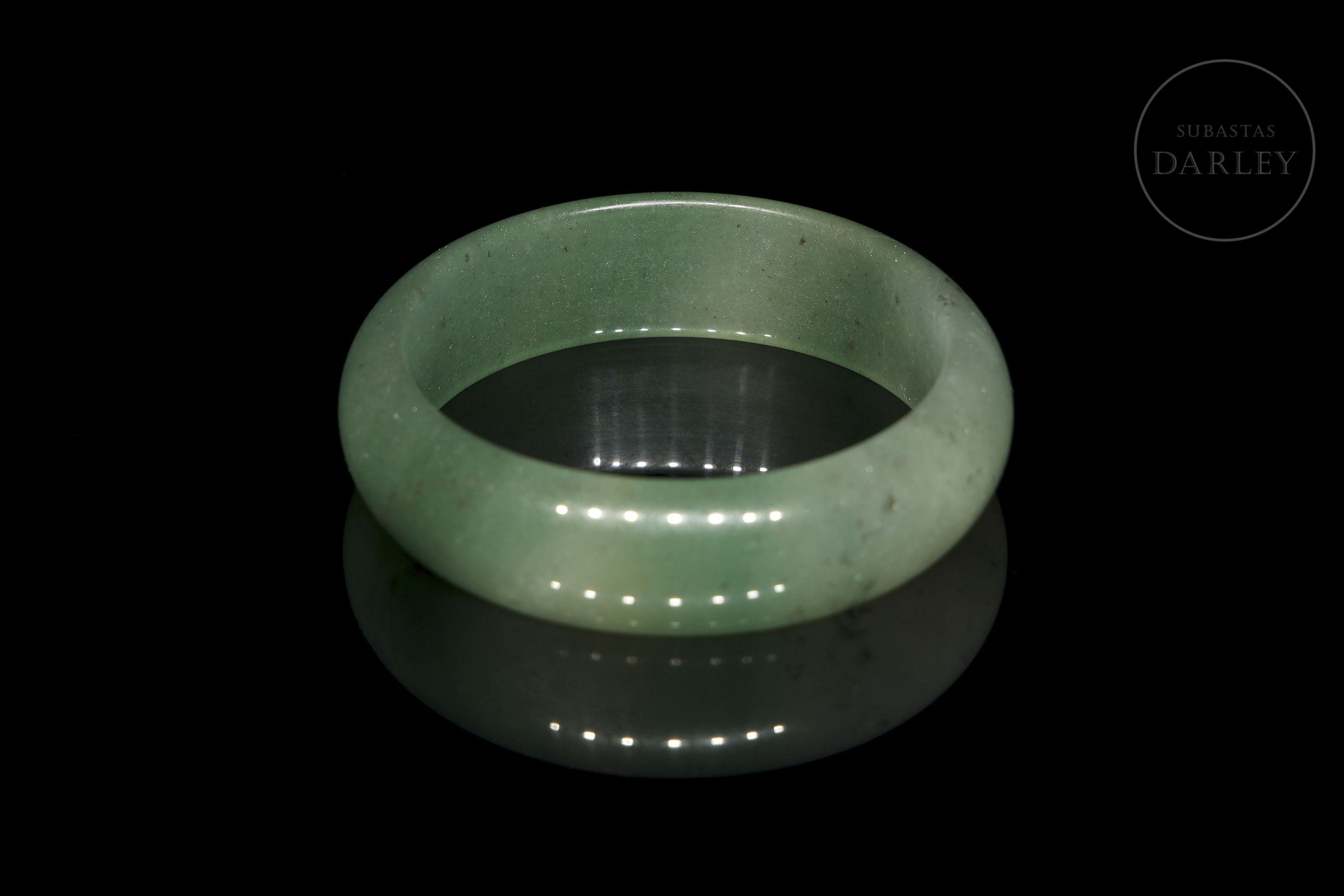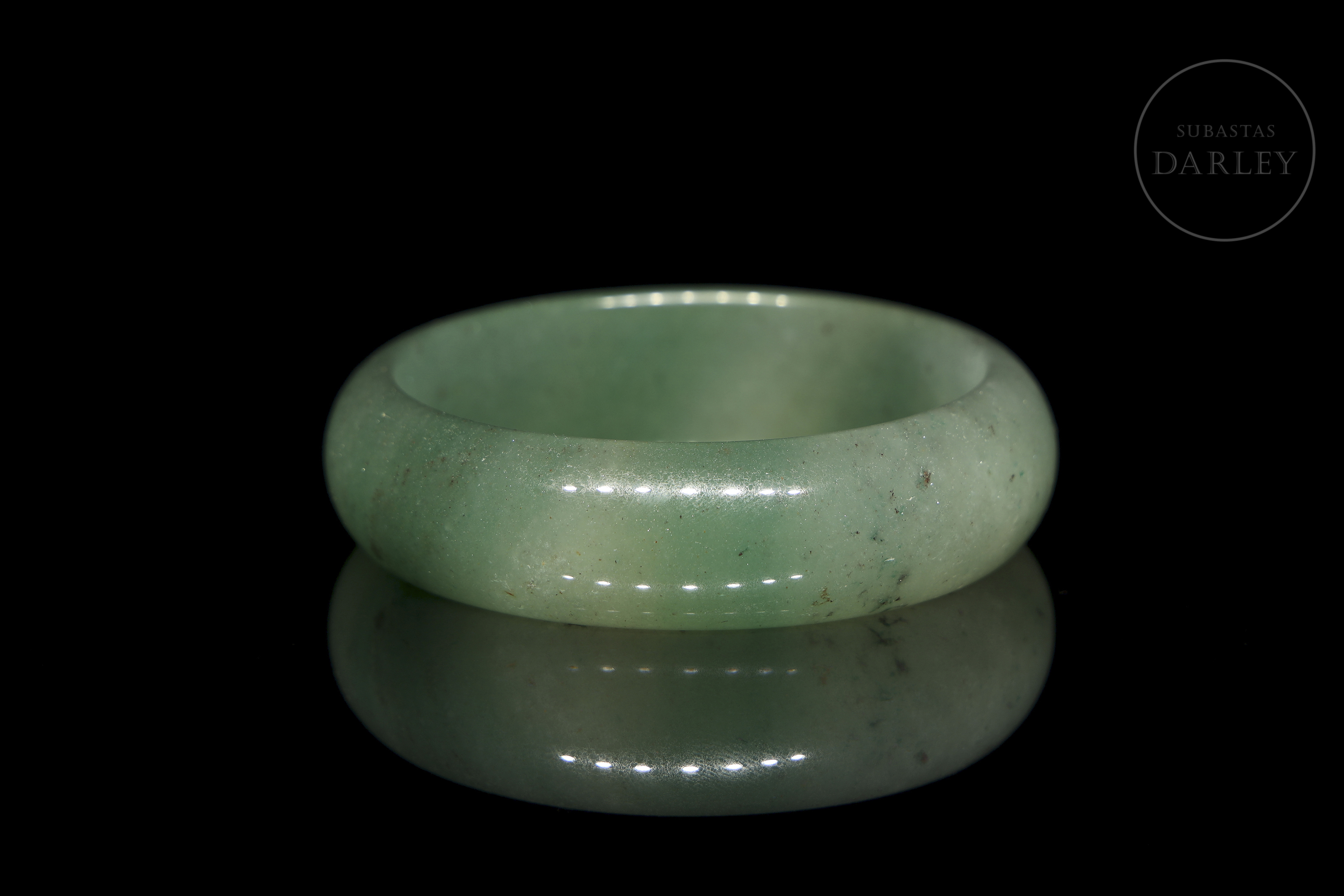 Jade de suave tonalidad verde con áreas blanquecinas y pequeñas inclusiones oscuras. Posee un formato circular con perfil redondeado y un pulido vítreo.