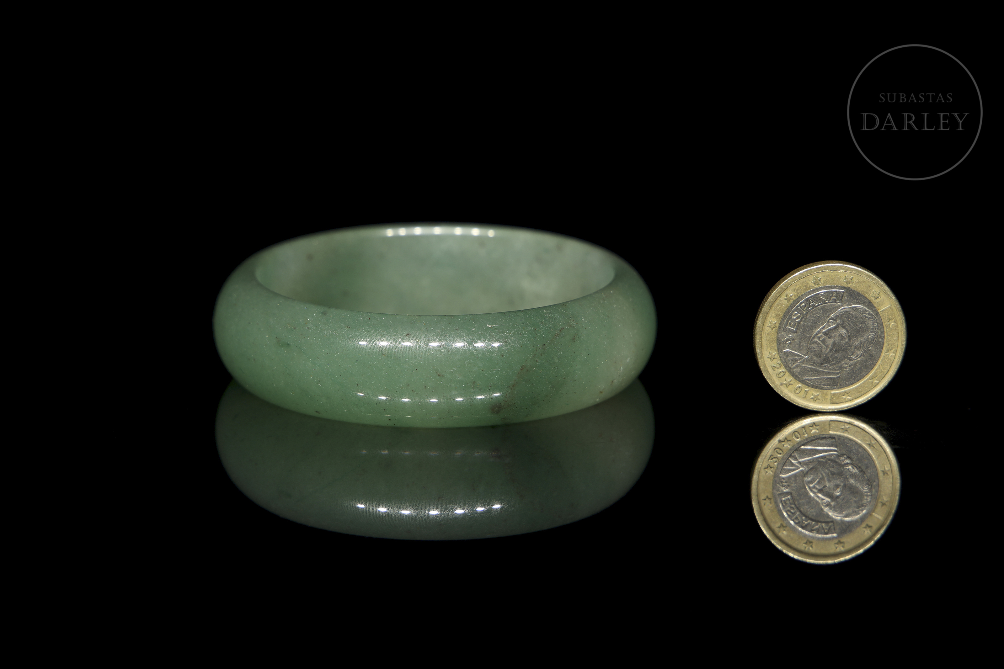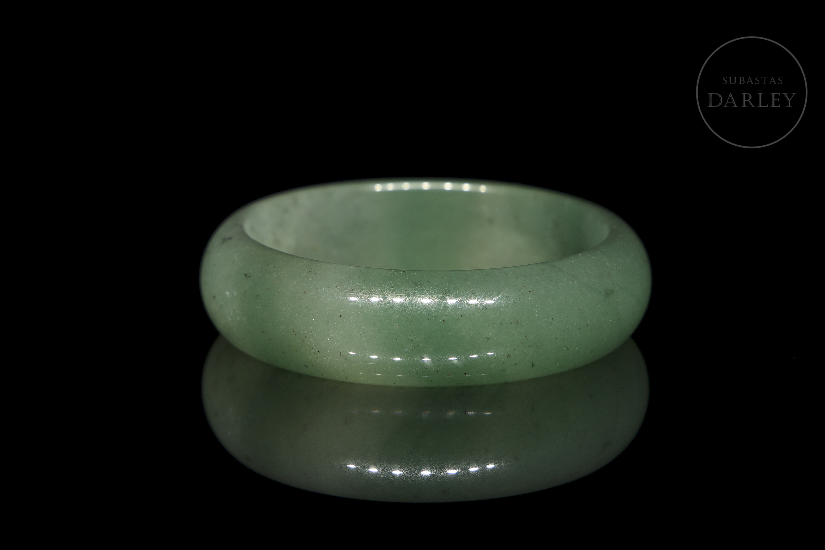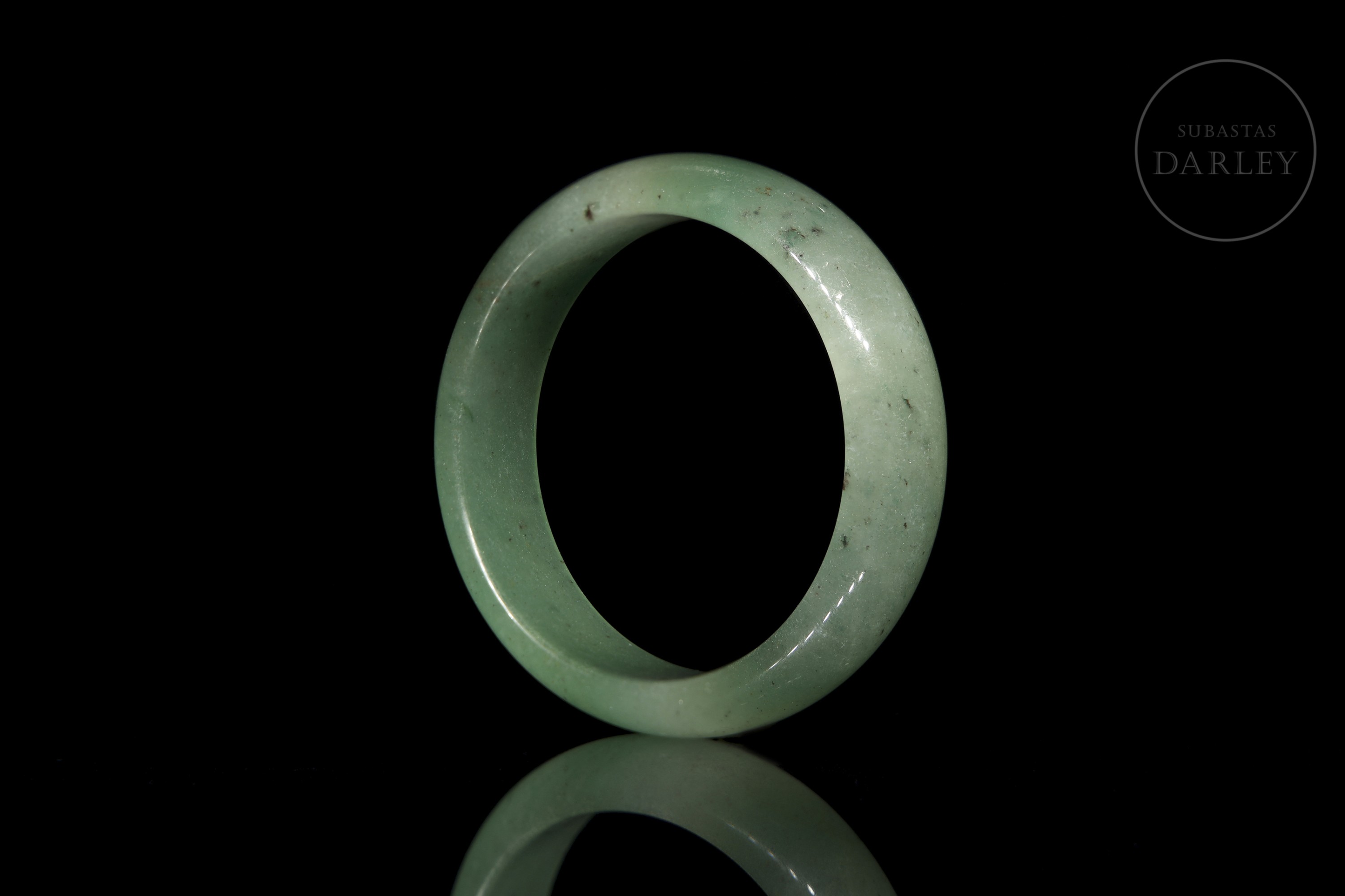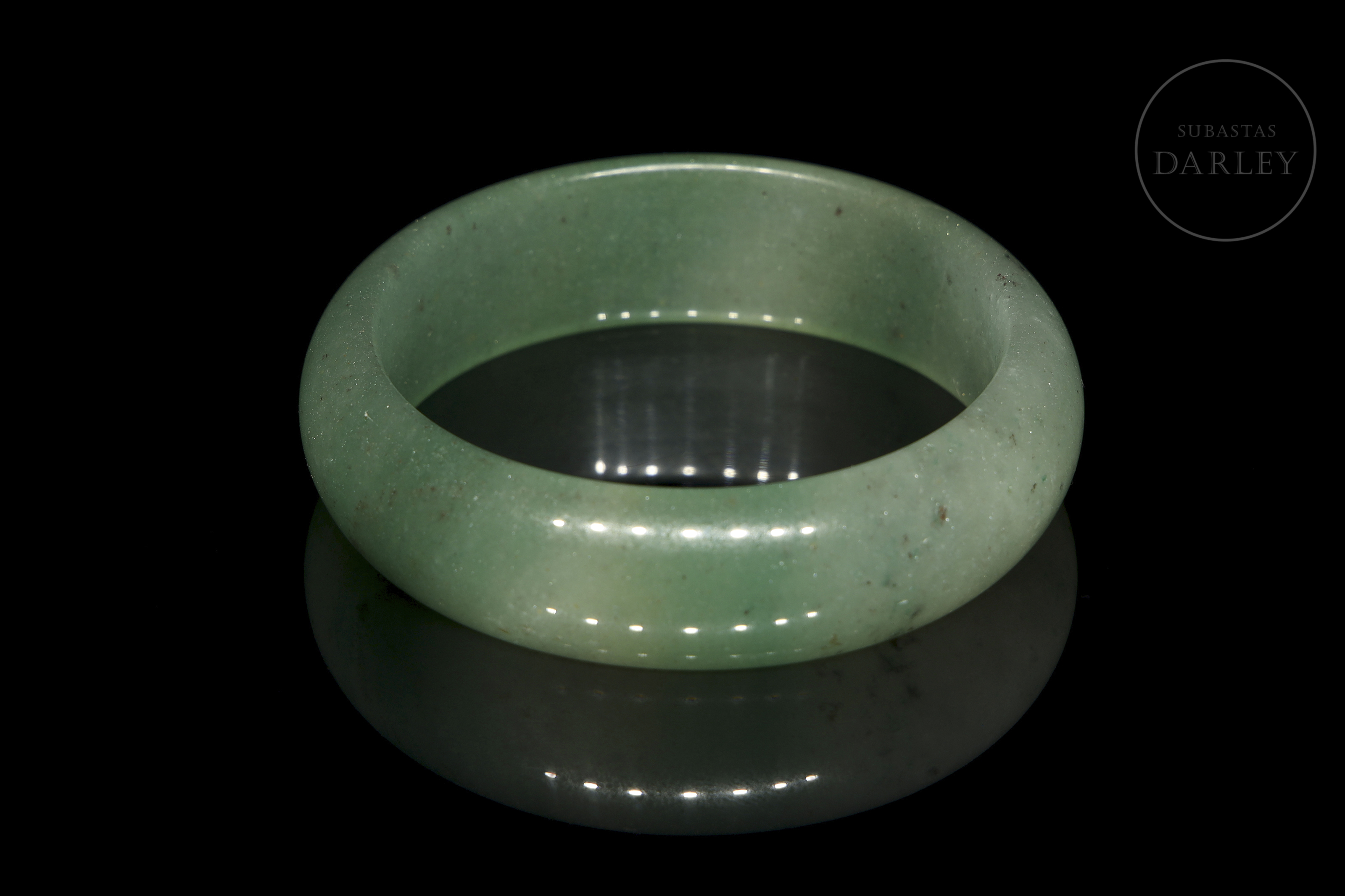 Jade de suave tonalidad verde con áreas blanquecinas y pequeñas inclusiones oscuras. Posee un formato circular con perfil redondeado y un pulido vítreo.