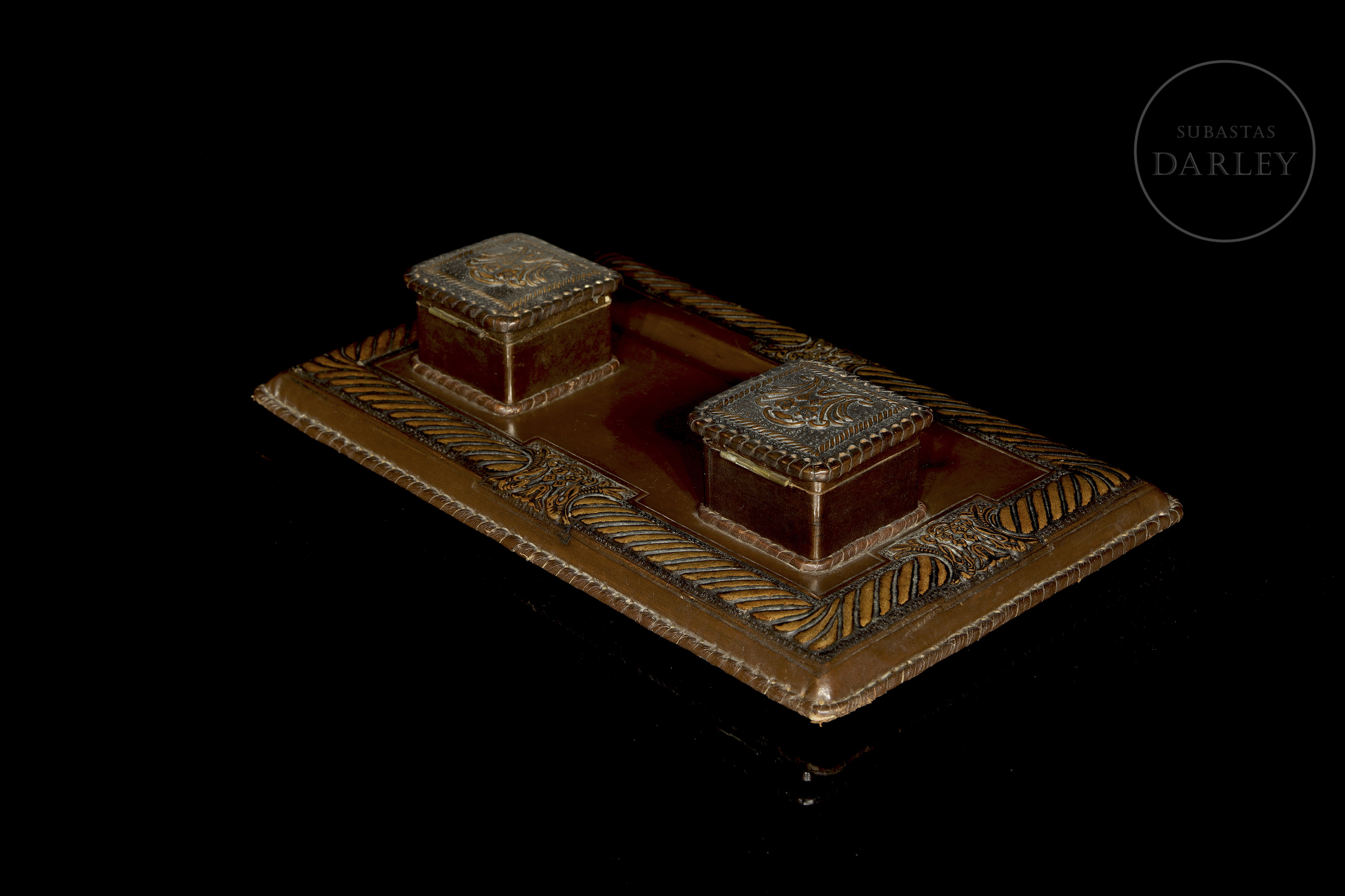 Pieza de escritorio de manufactura artesanal, realizada en cuero de tonalidad marrón, de formato rectangular con decoración perimetral repujada de estilo clásico. Presenta una base con canal para plumas y dos tinteros cuadrangulares integrados con tapas abisagradas.