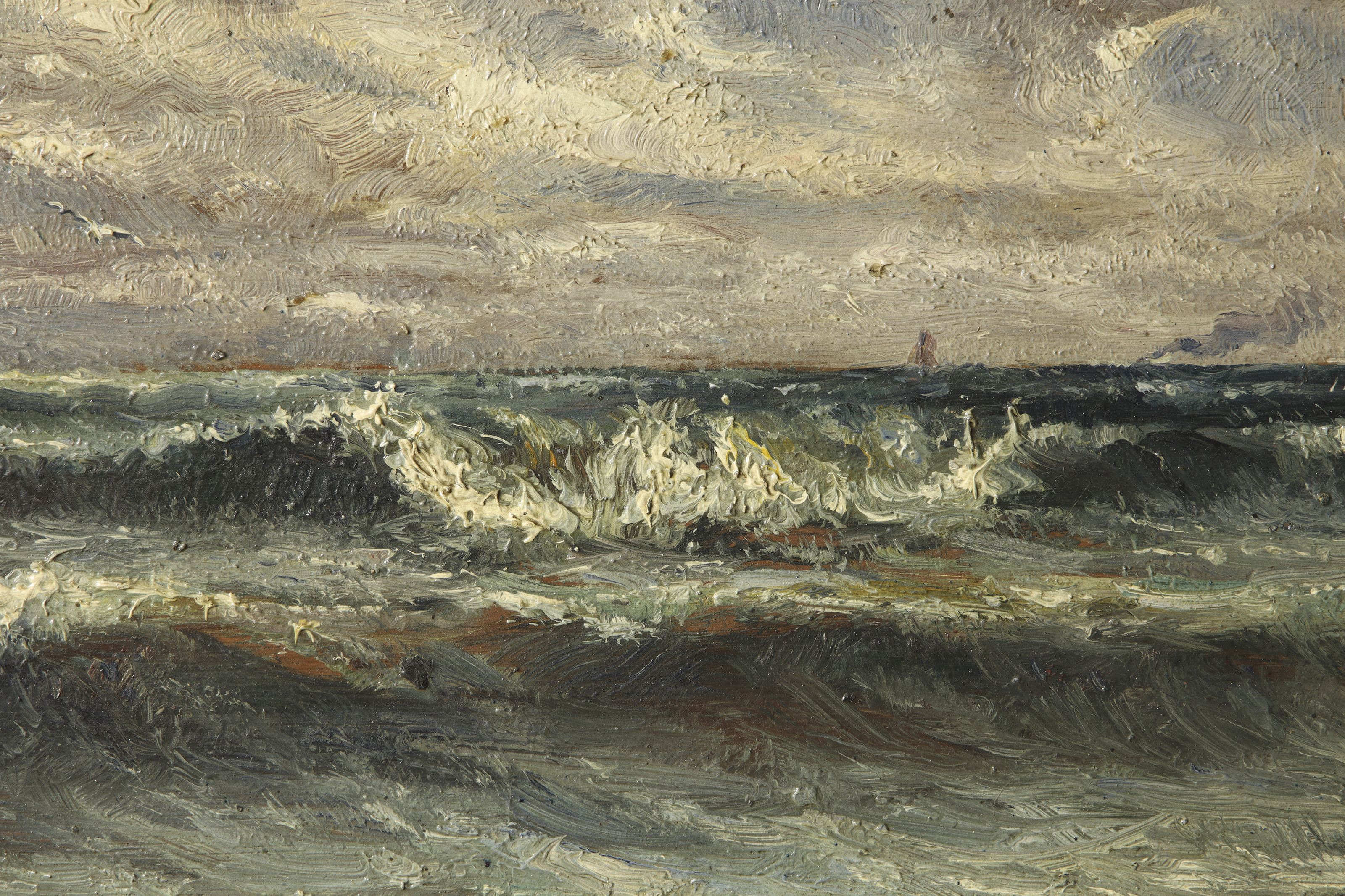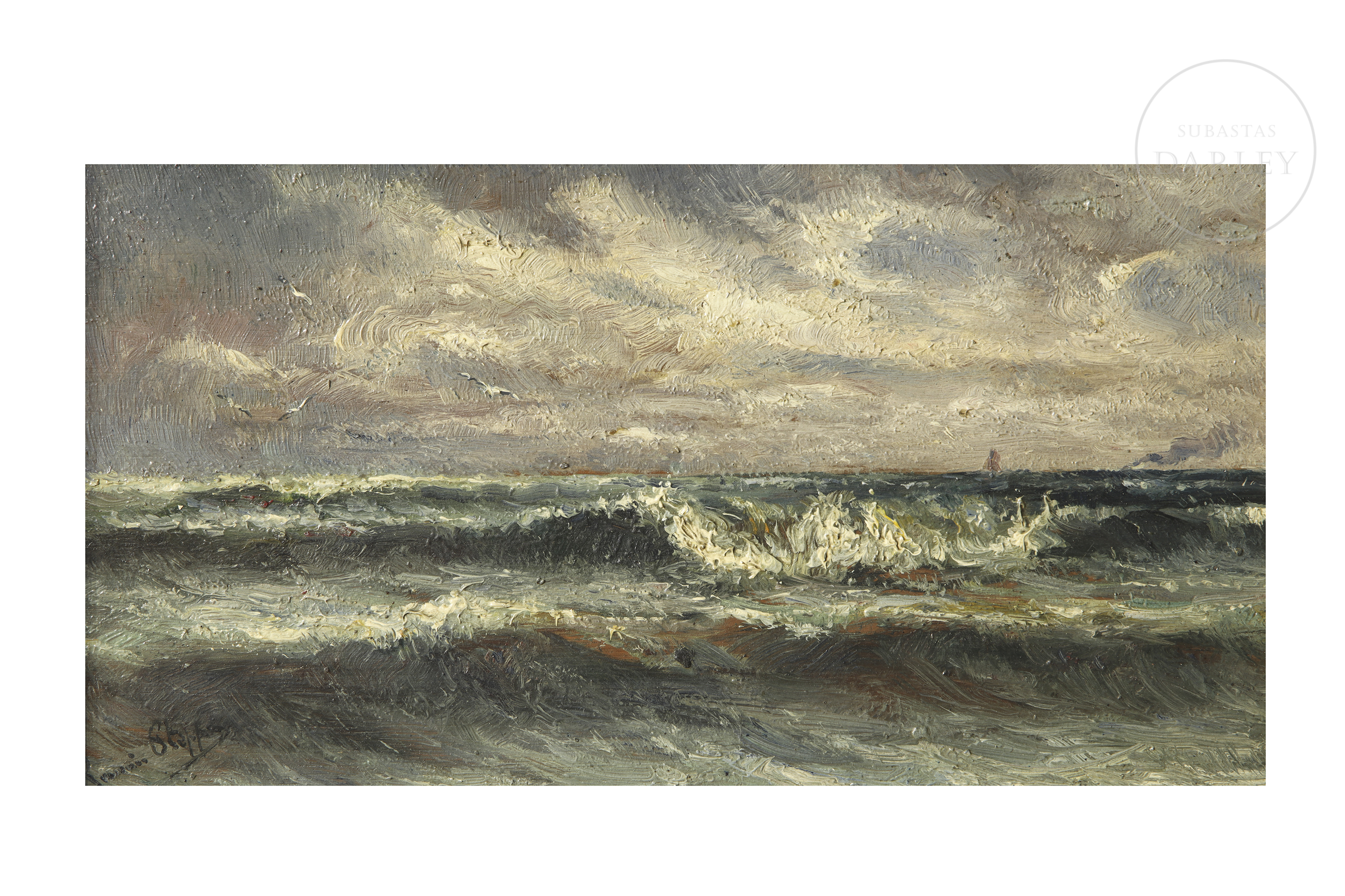 Óleo sobre tabla. Marina que representa un embravecido oleaje bajo un cielo de tormenta, en el que sobrevuelan pequeñas gaviotas blancas. Firmado en la esquina inferior derecha.