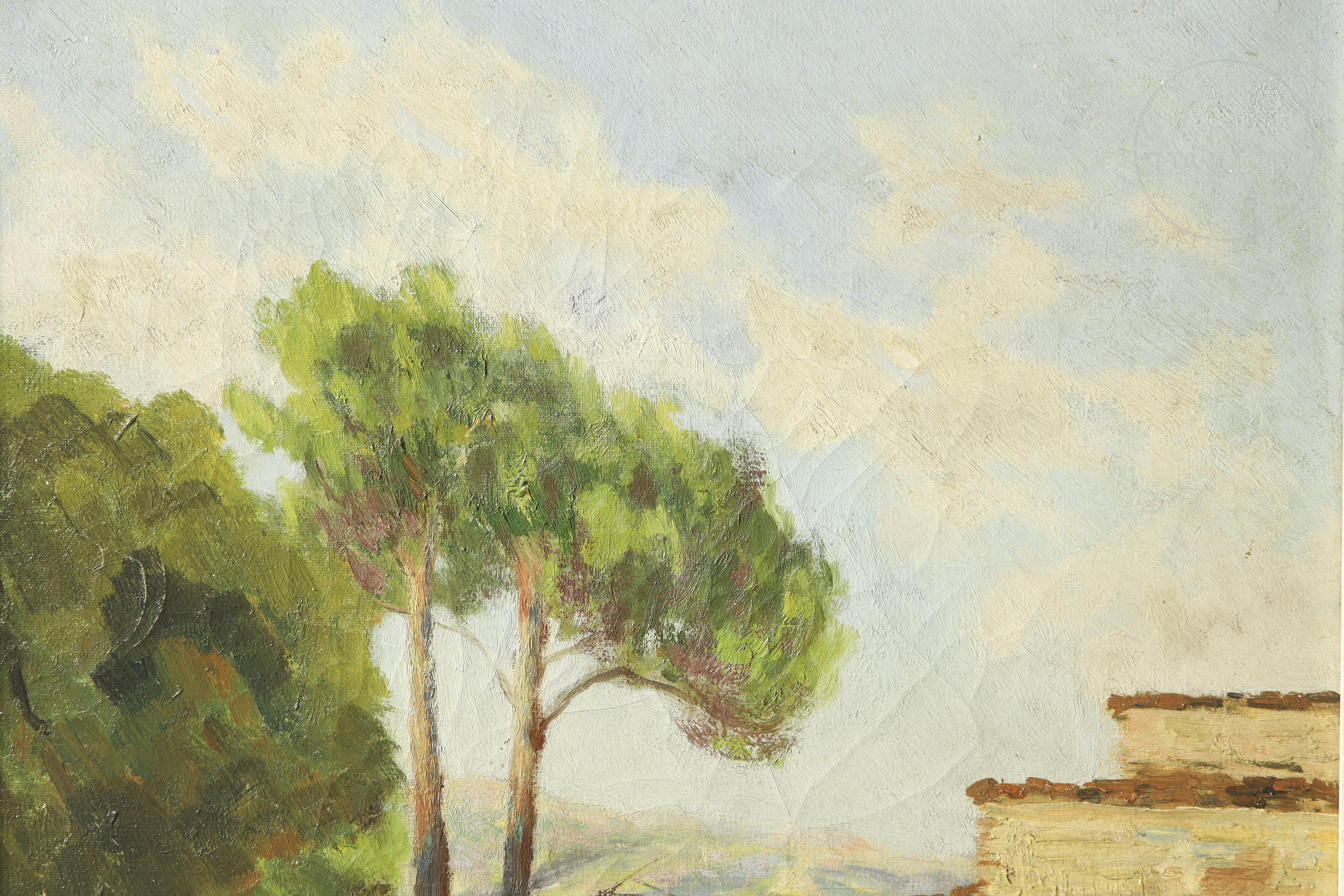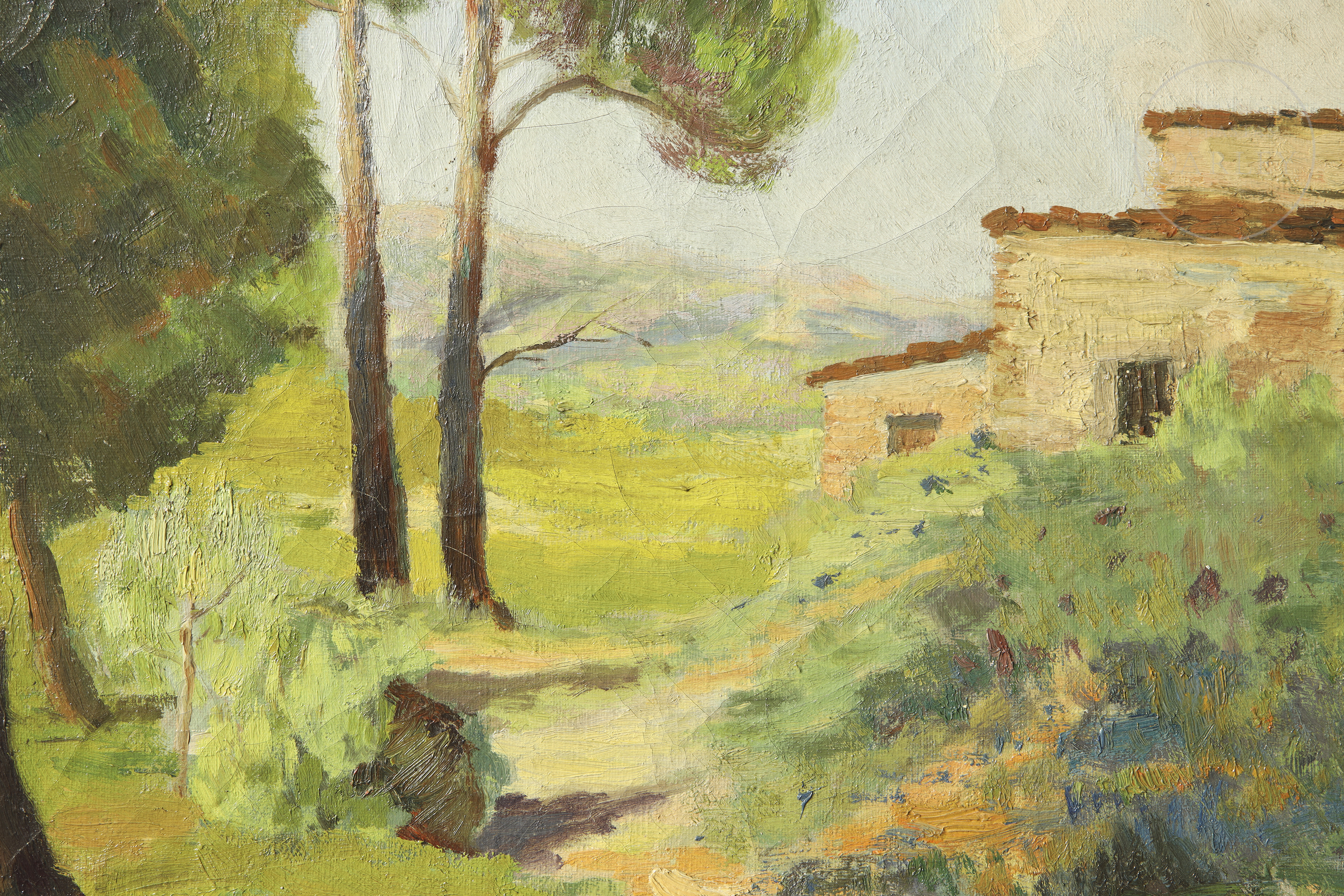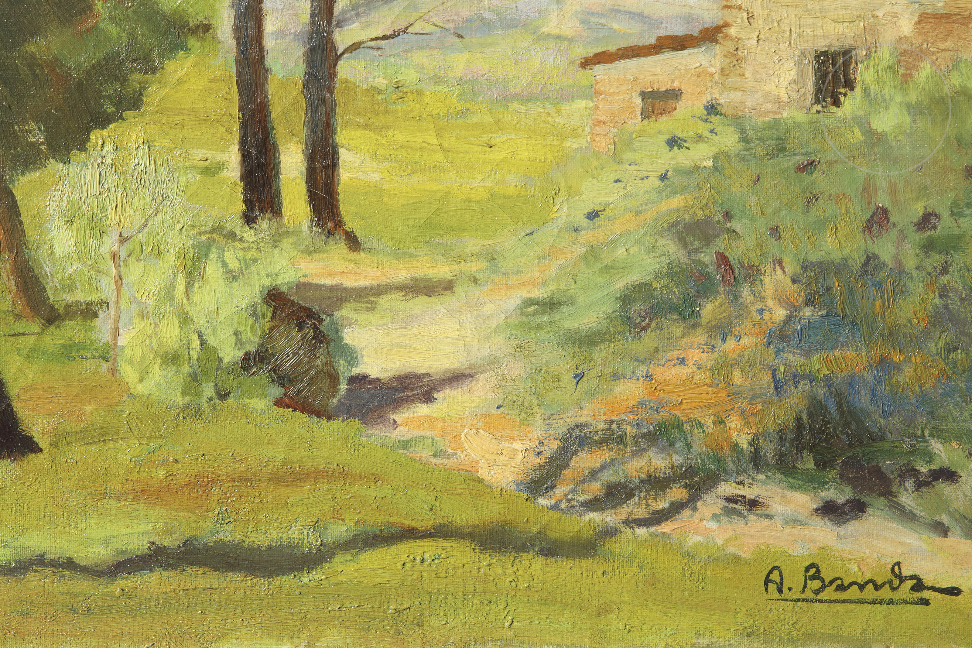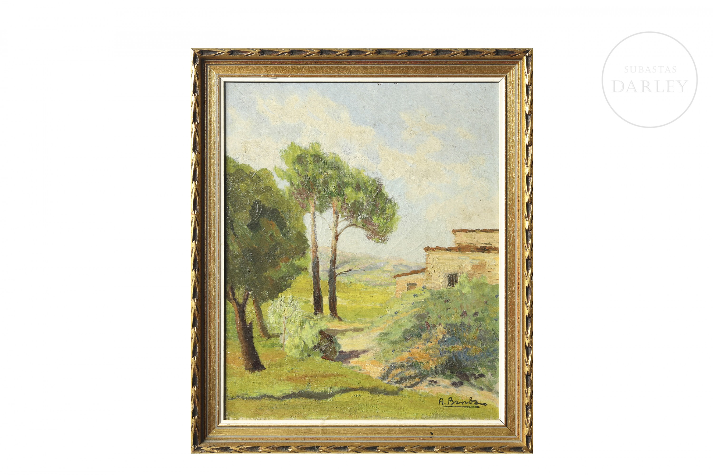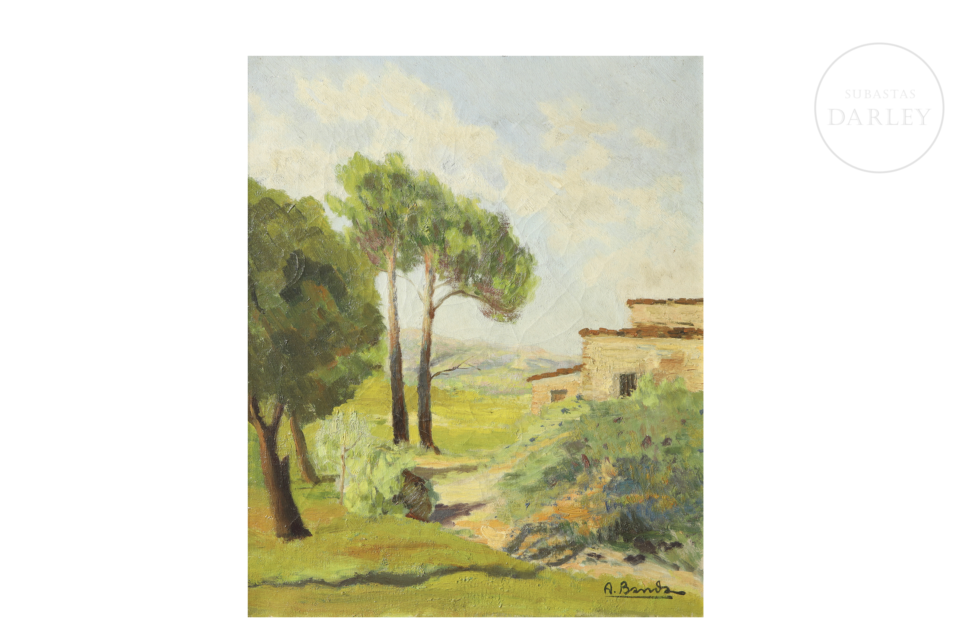 Óleo sobre lienzo. Paisaje que representa un soleado paisaje donde se vislumbra una masía rodeada de una frondosa vegetación. Firmado en la esquina inferior derecha. Titulado, ubicado y fechado en el reverso.