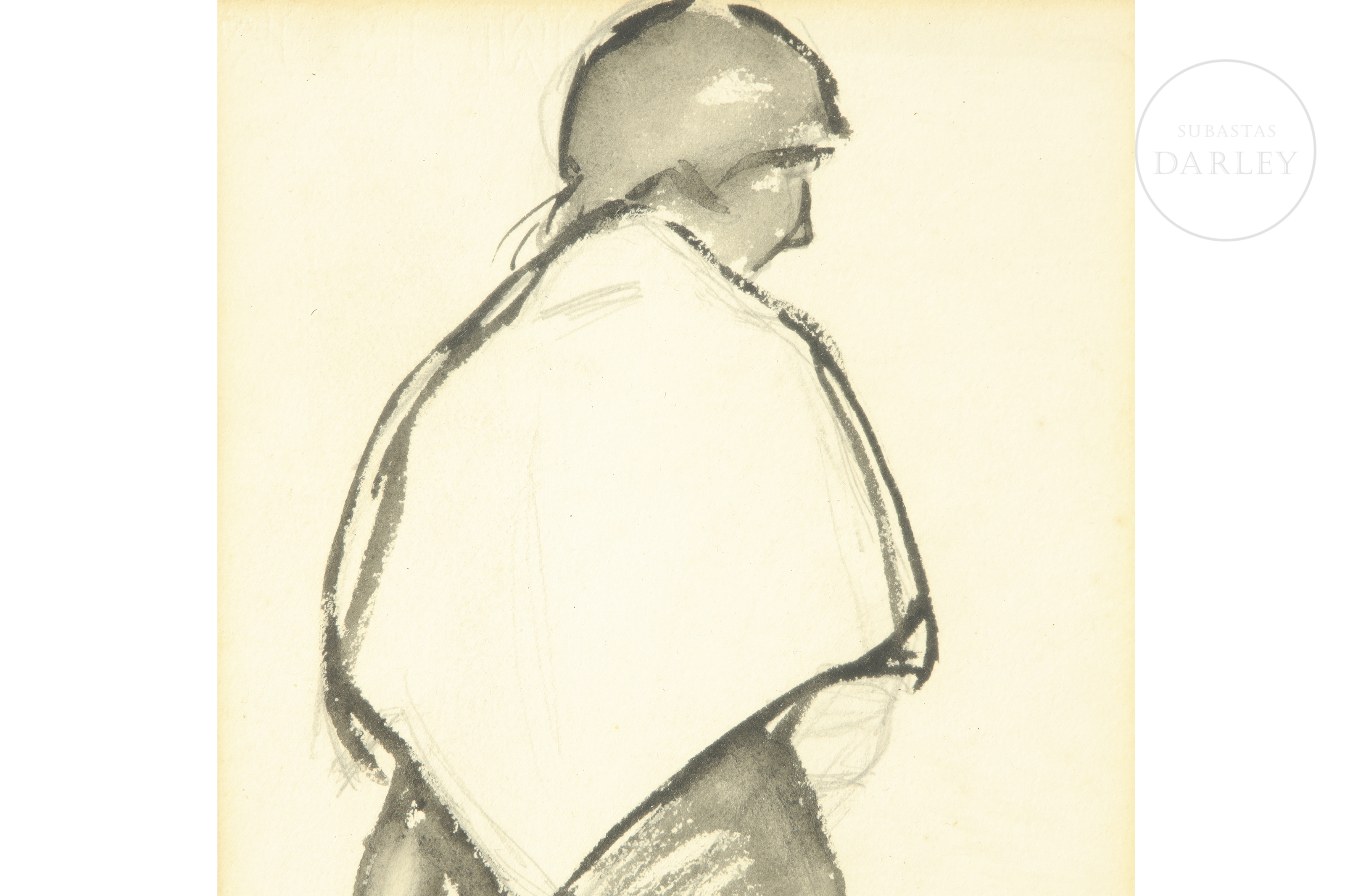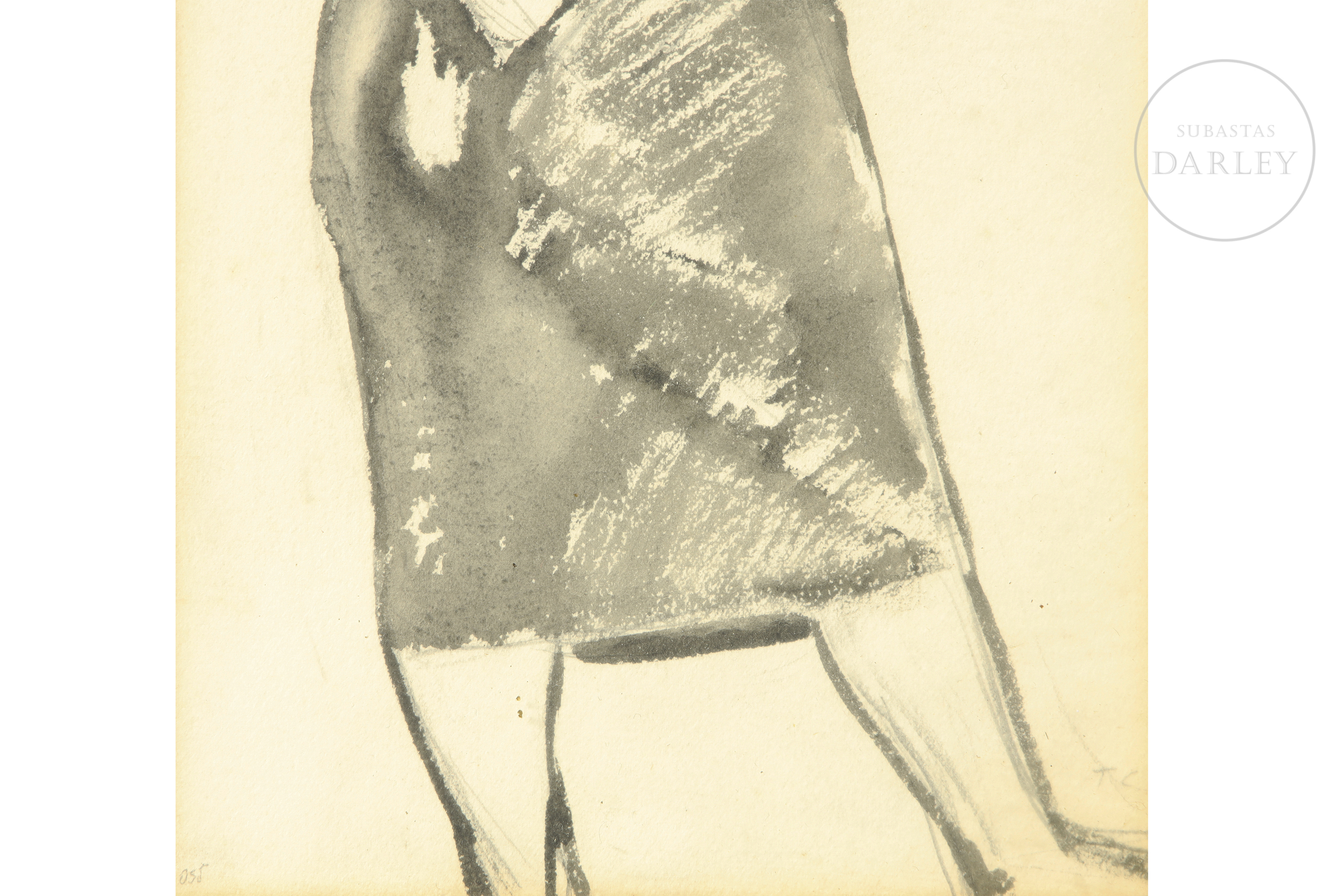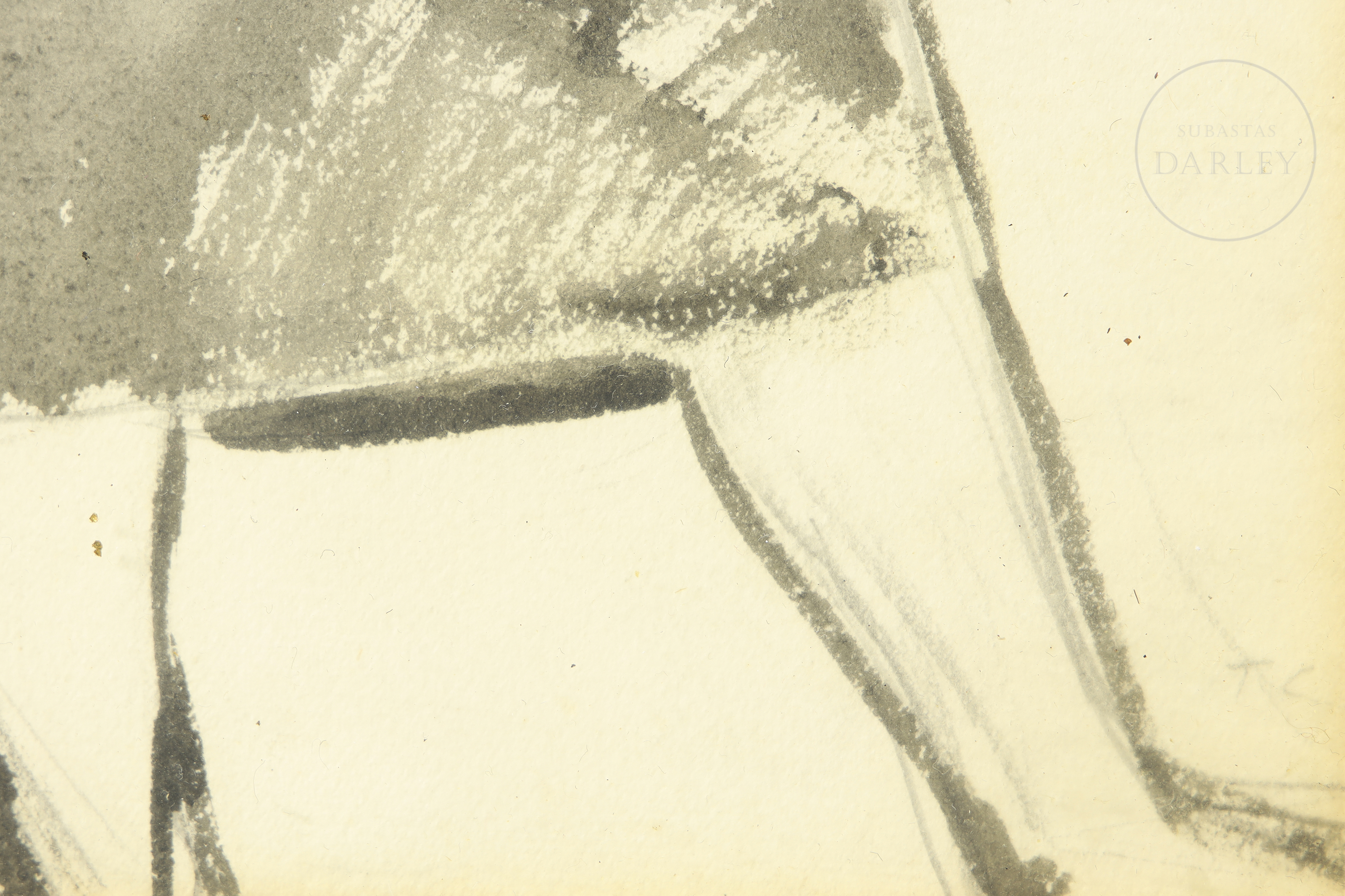 Técnica mixta sobre papel. Dibujo figurativo que representa una figura femenina de espaldas, resuelta con trazos sintéticos y gestuales. Firmado con las iniciales "T. C" en el ángulo inferior derecho y numerado (055) en el ángulo inferior izquierdo.