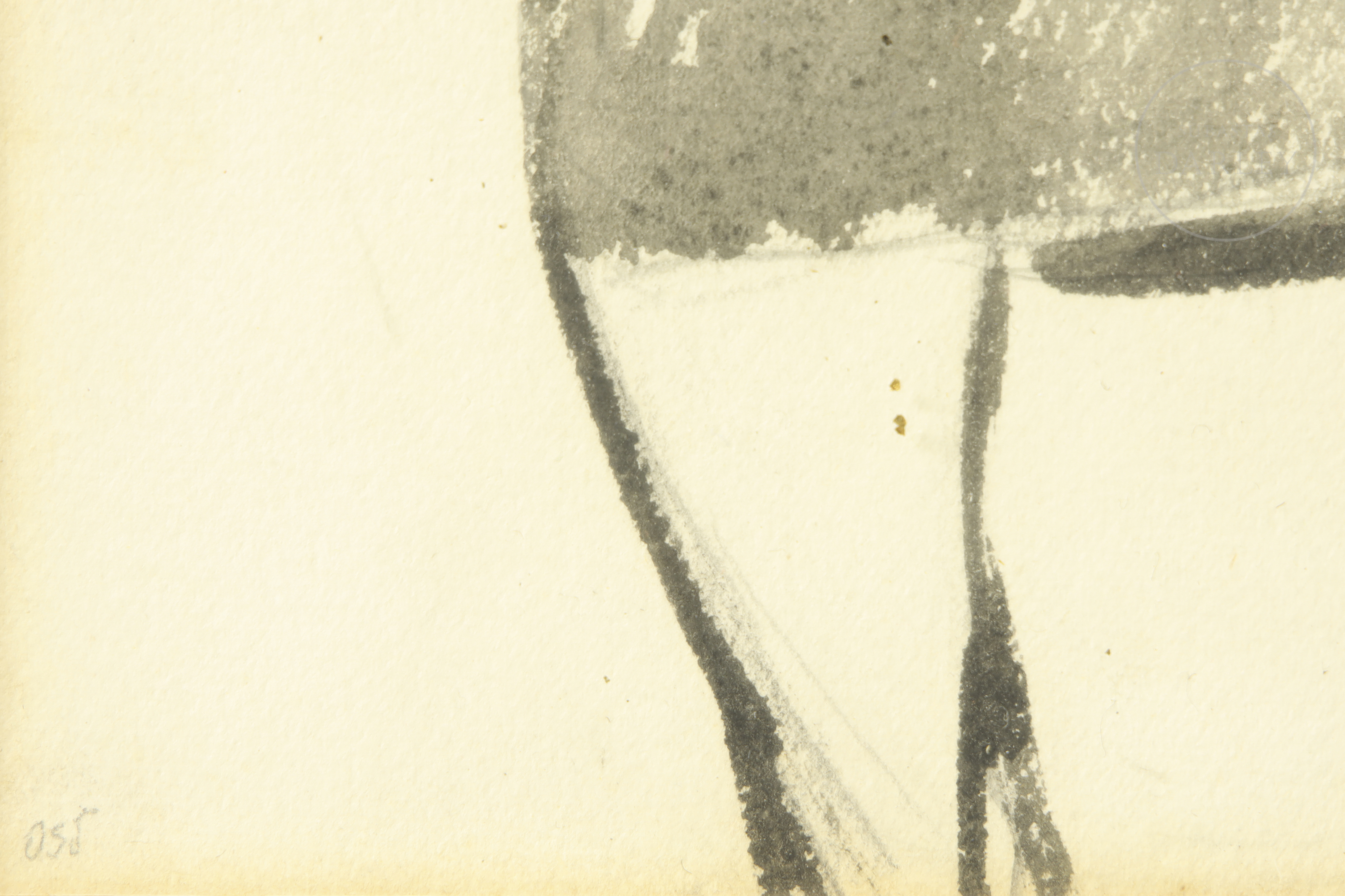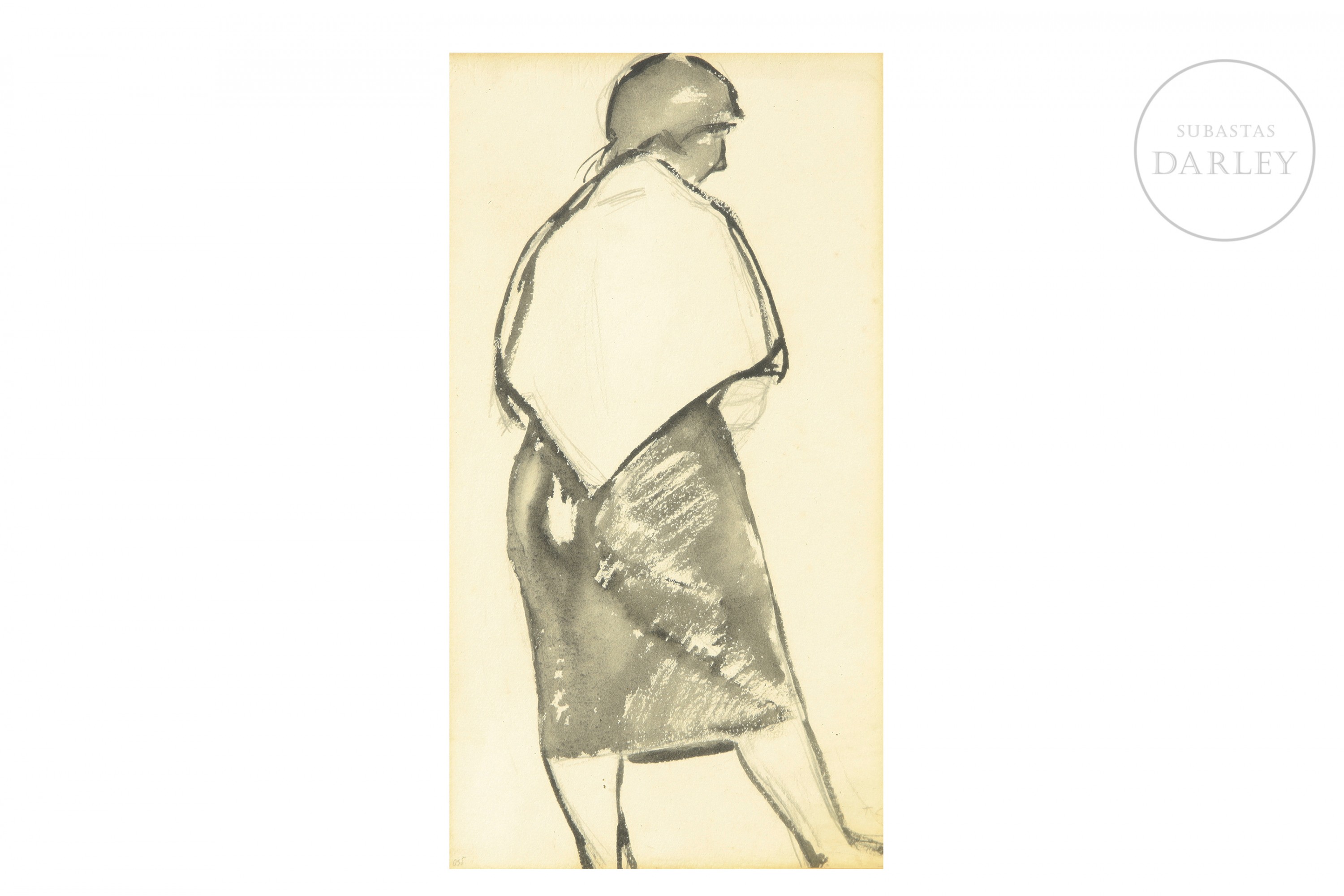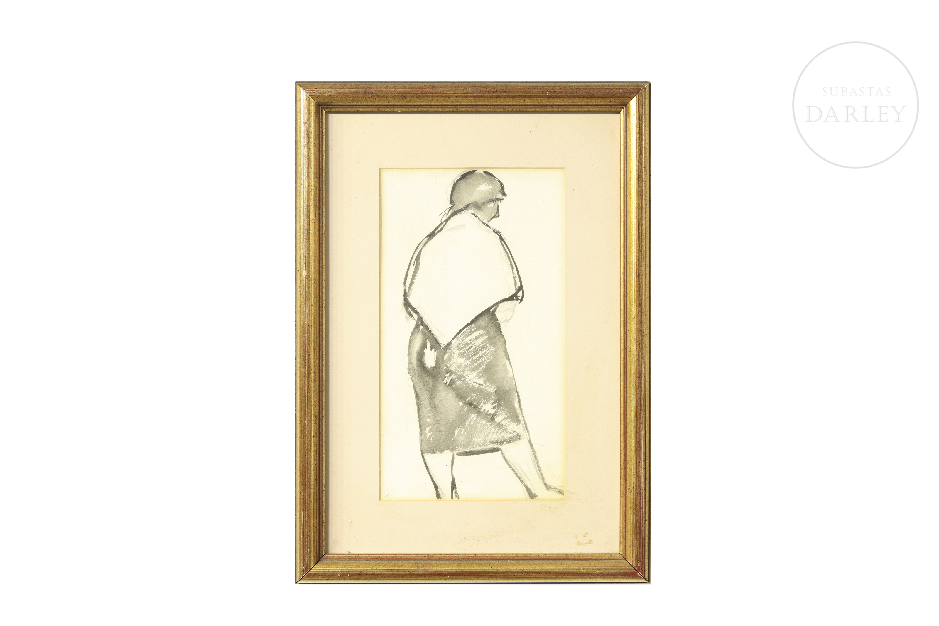 Técnica mixta sobre papel. Dibujo figurativo que representa una figura femenina de espaldas, resuelta con trazos sintéticos y gestuales. Firmado con las iniciales "T. C" en el ángulo inferior derecho y numerado (055) en el ángulo inferior izquierdo.