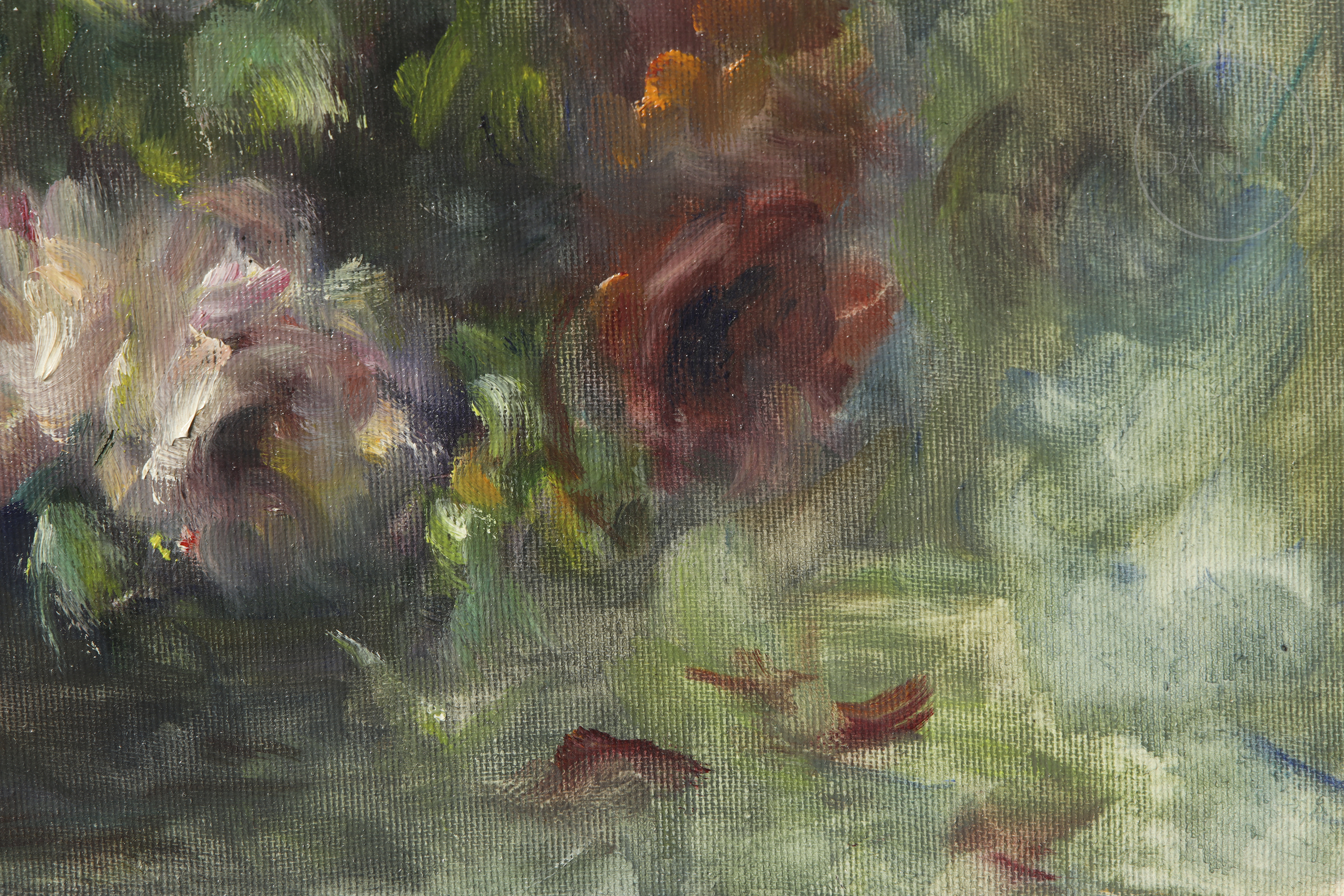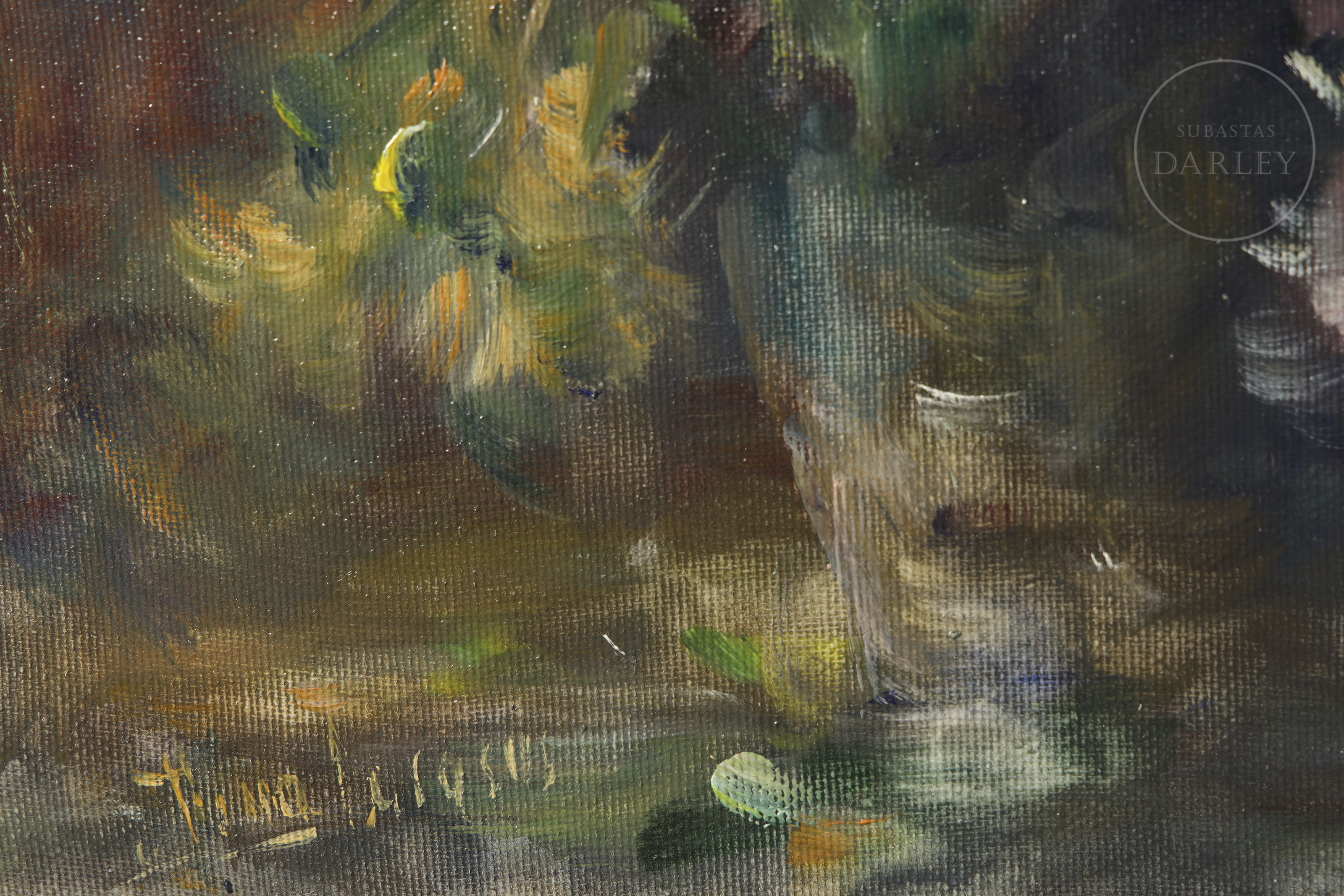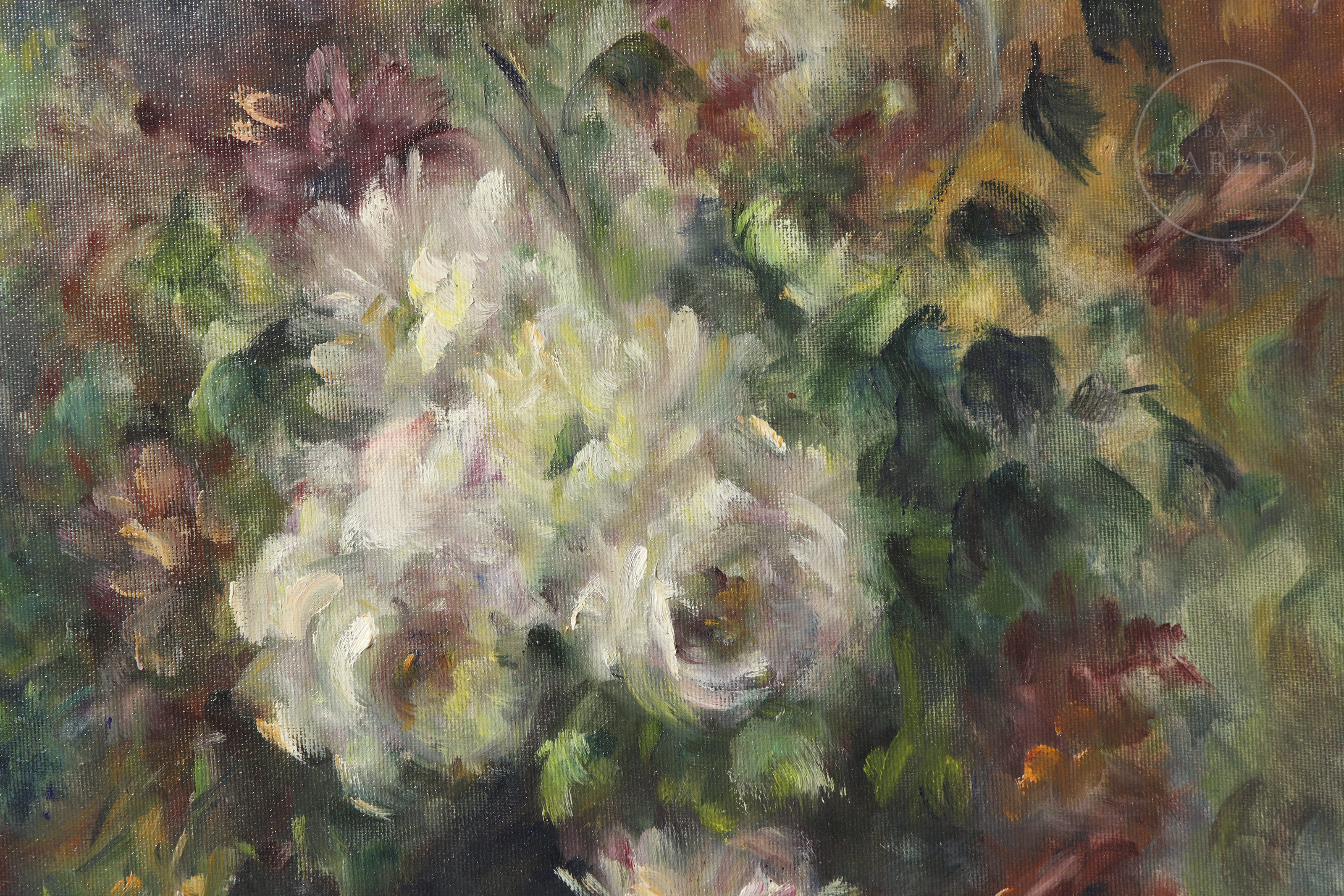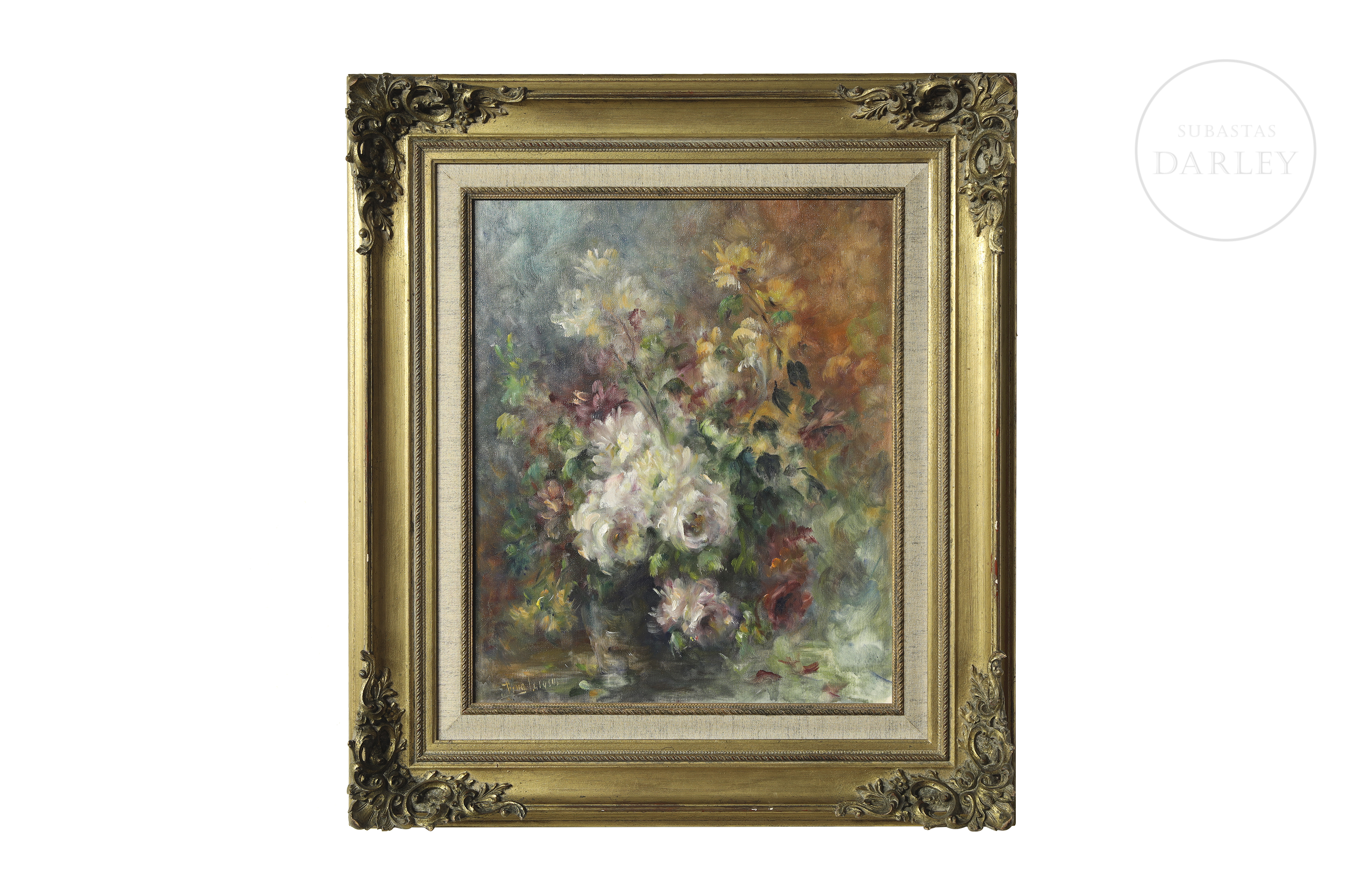 Óleo sobre lienzo. Bodegón floral que presenta un ramo de flores con pincelada suelta y empastada. Firmado en la esquina derecha inferior.
