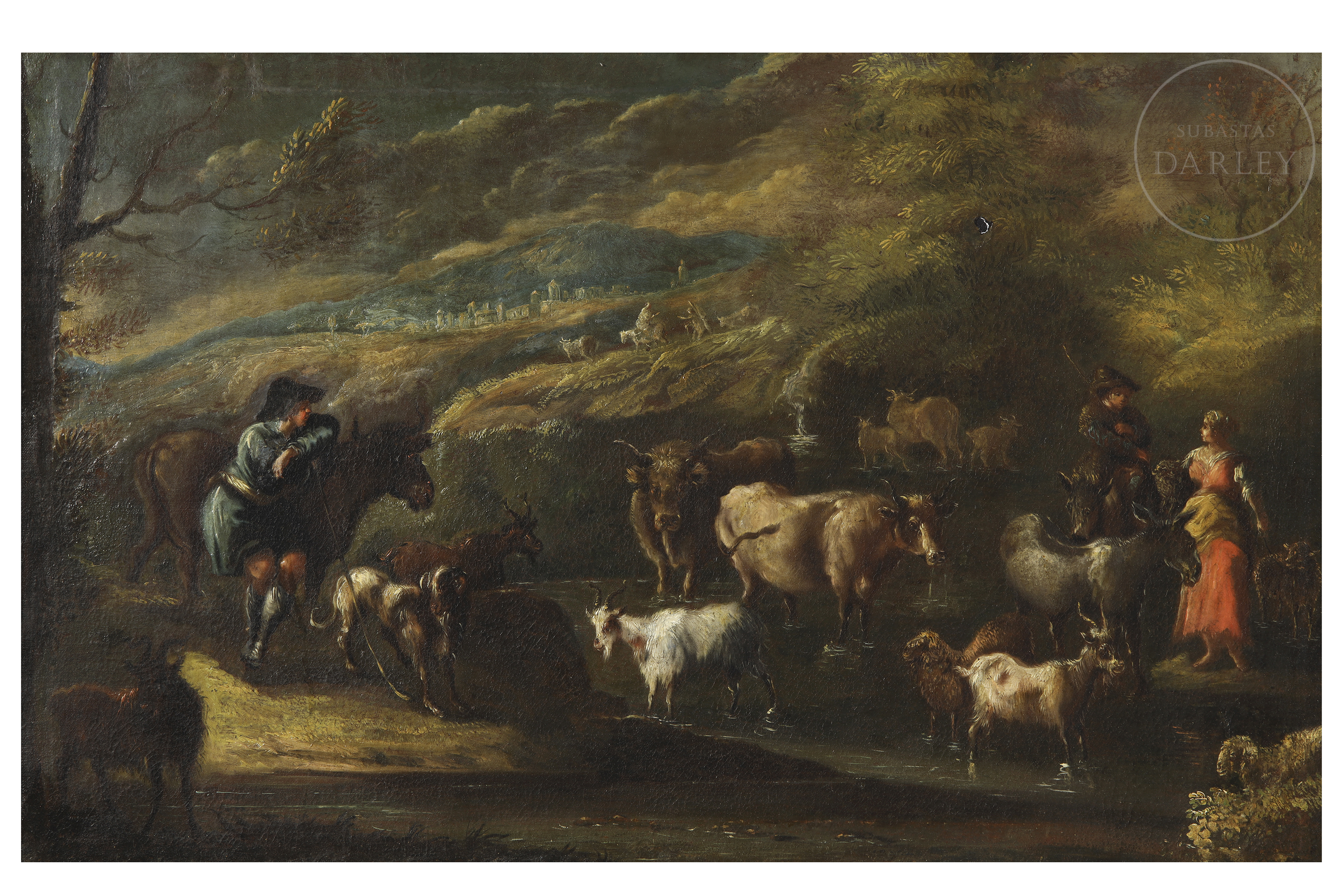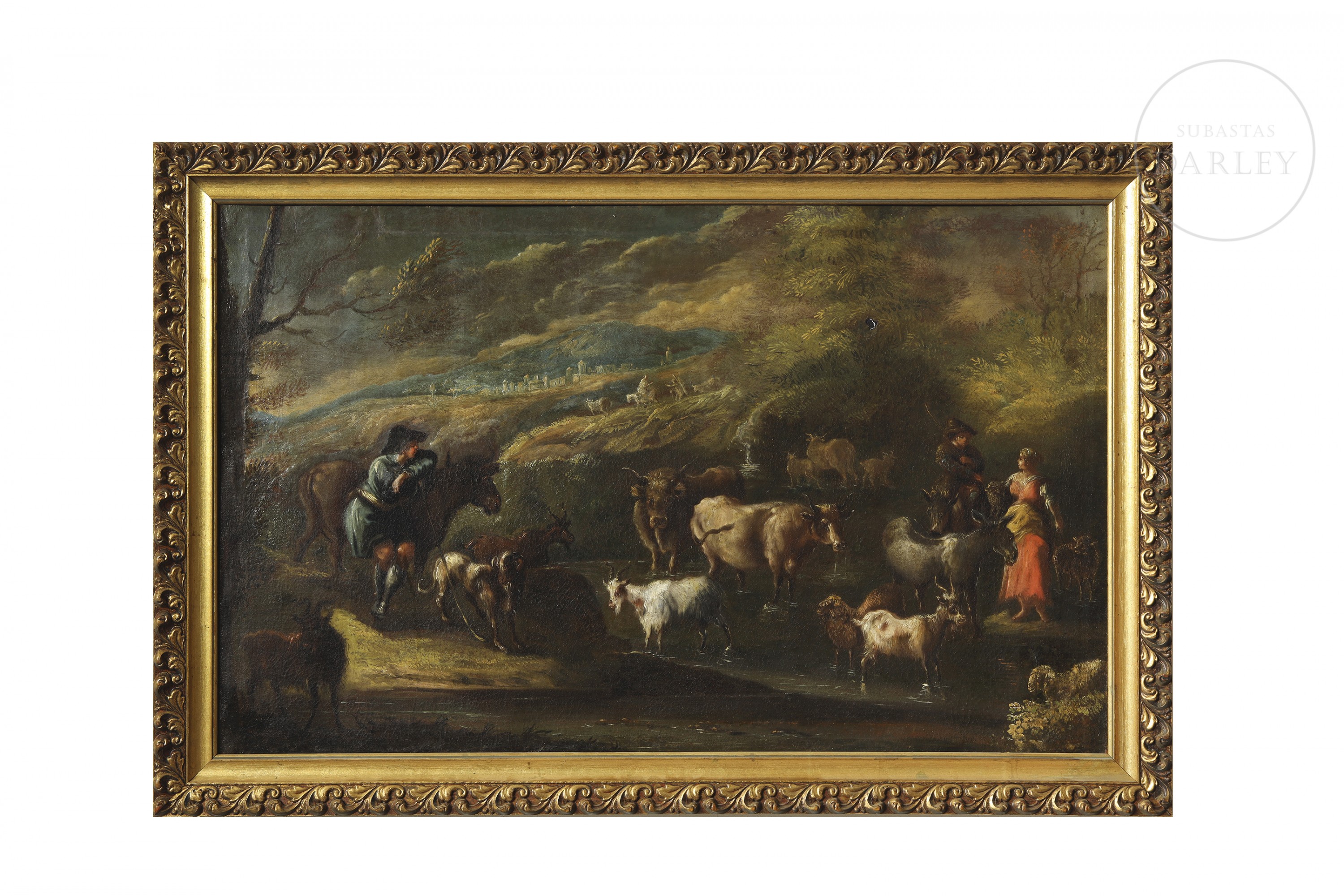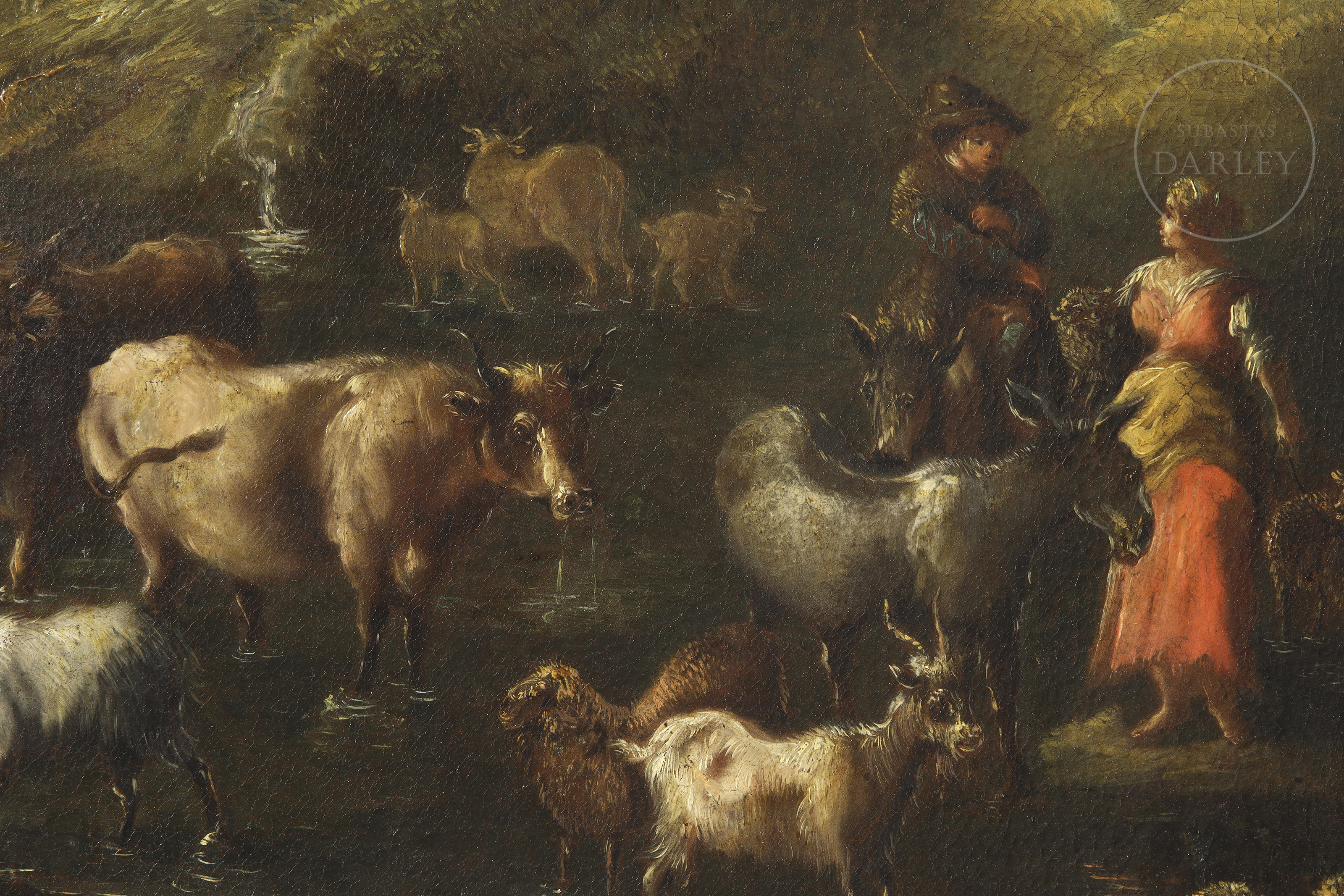 Óleo sobre lienzo. Paisaje campestre con una escena de pastores. La composición muestra un rebaño de vacas y cabras en un arroyo, con pastores a caballo y a pie en los laterales. Seguidor de Rosa da Tívoli (1657-1706).