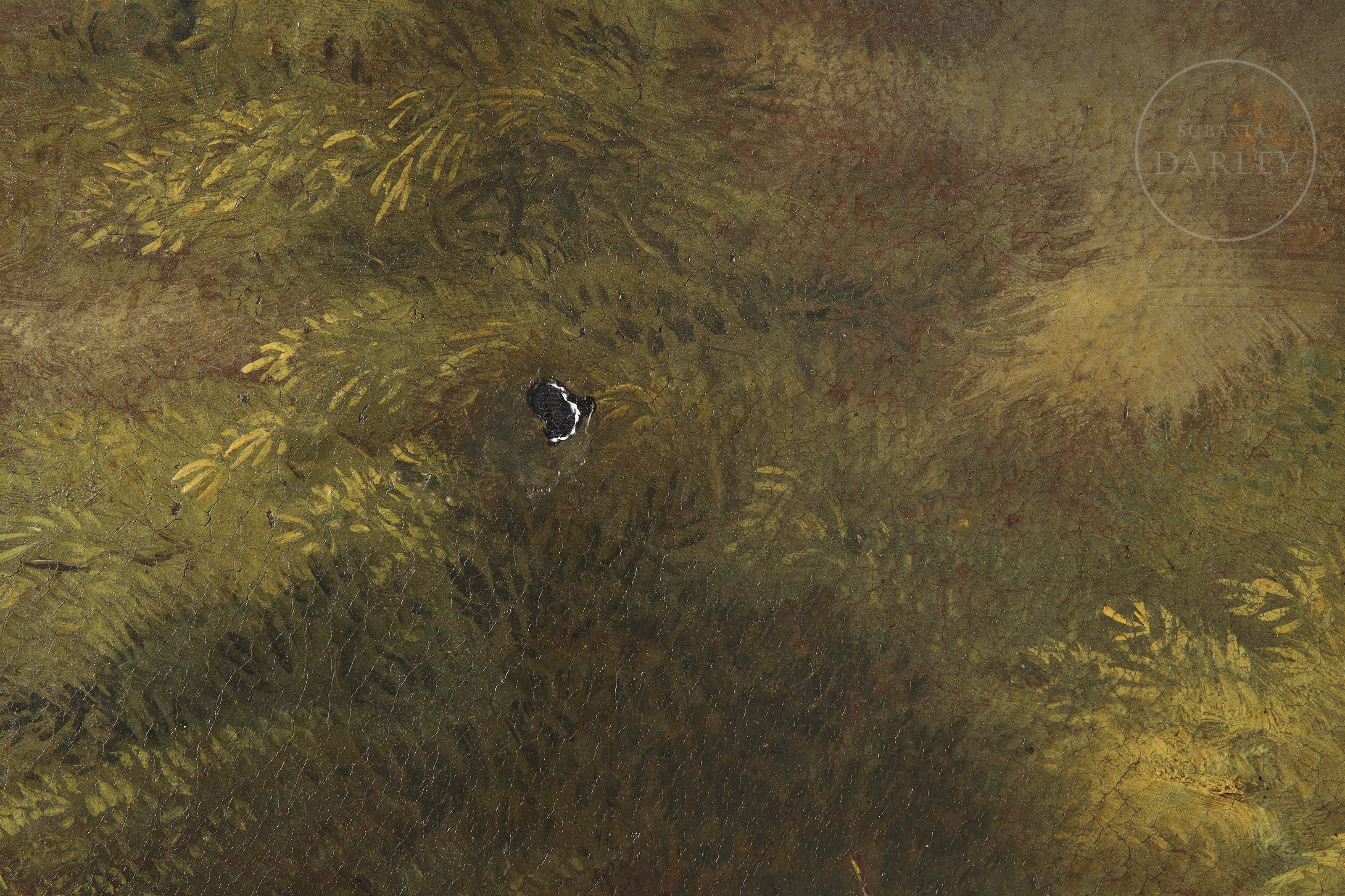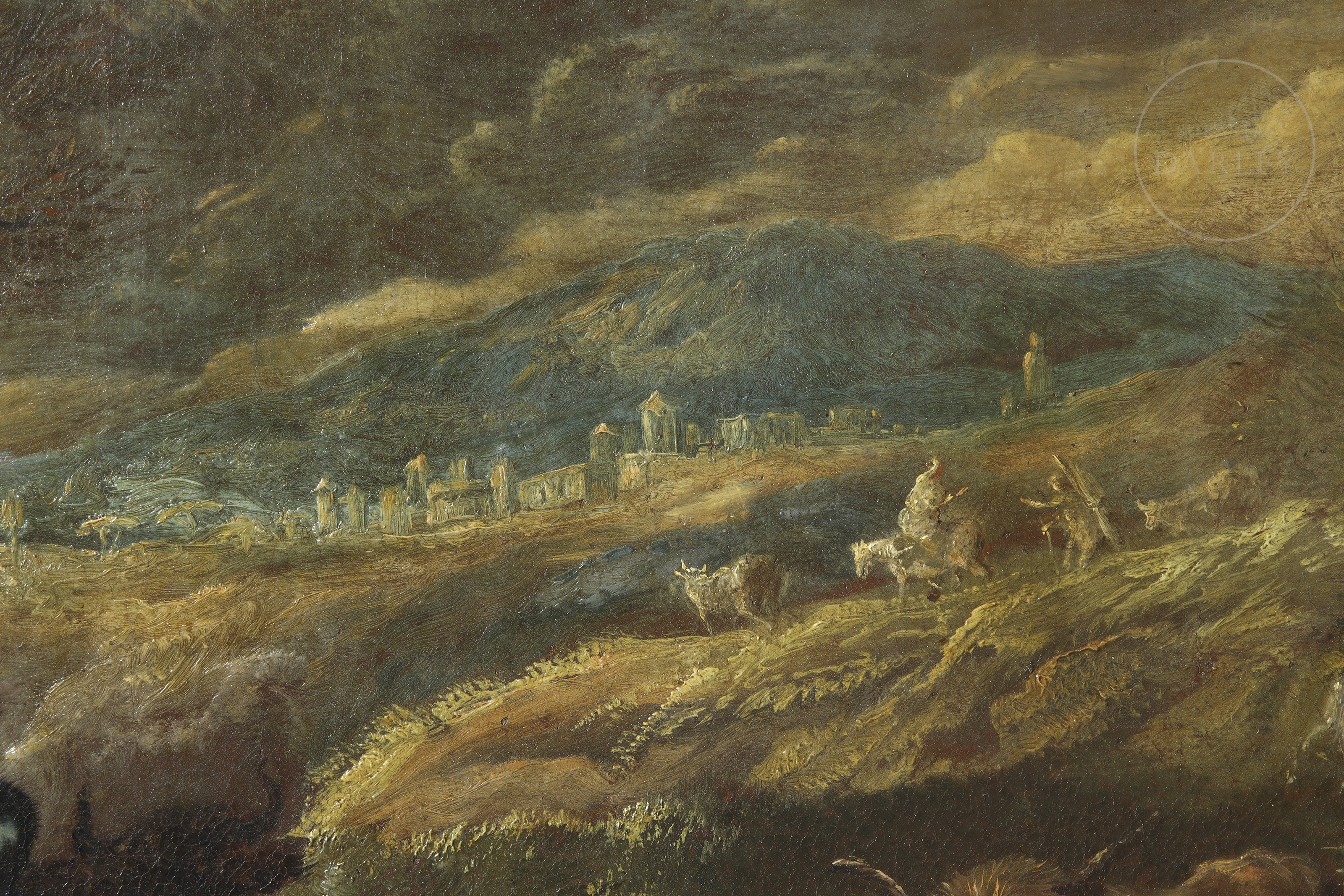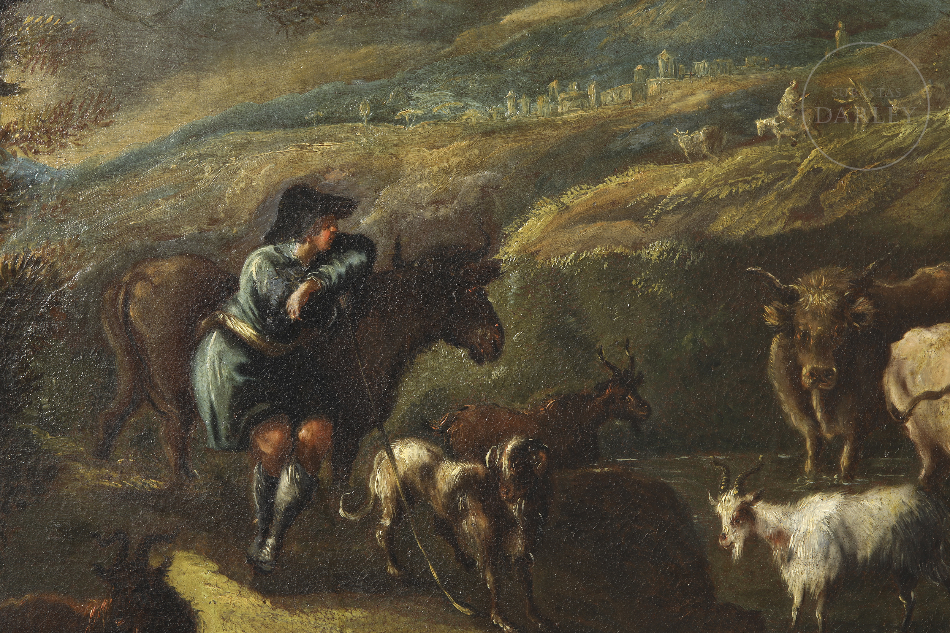Óleo sobre lienzo. Paisaje campestre con una escena de pastores. La composición muestra un rebaño de vacas y cabras en un arroyo, con pastores a caballo y a pie en los laterales. Seguidor de Rosa da Tívoli (1657-1706).