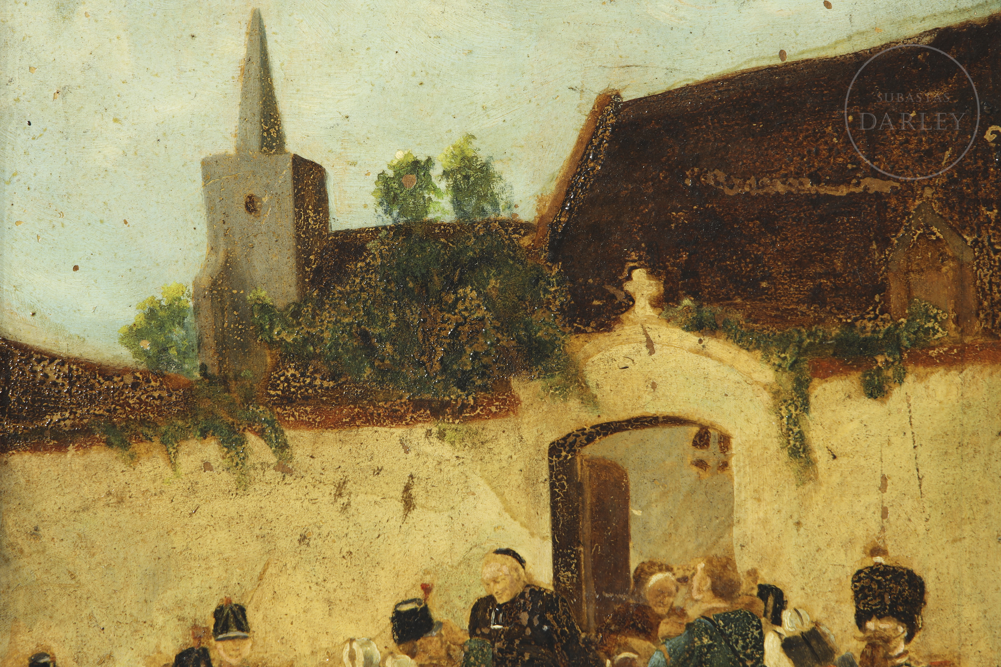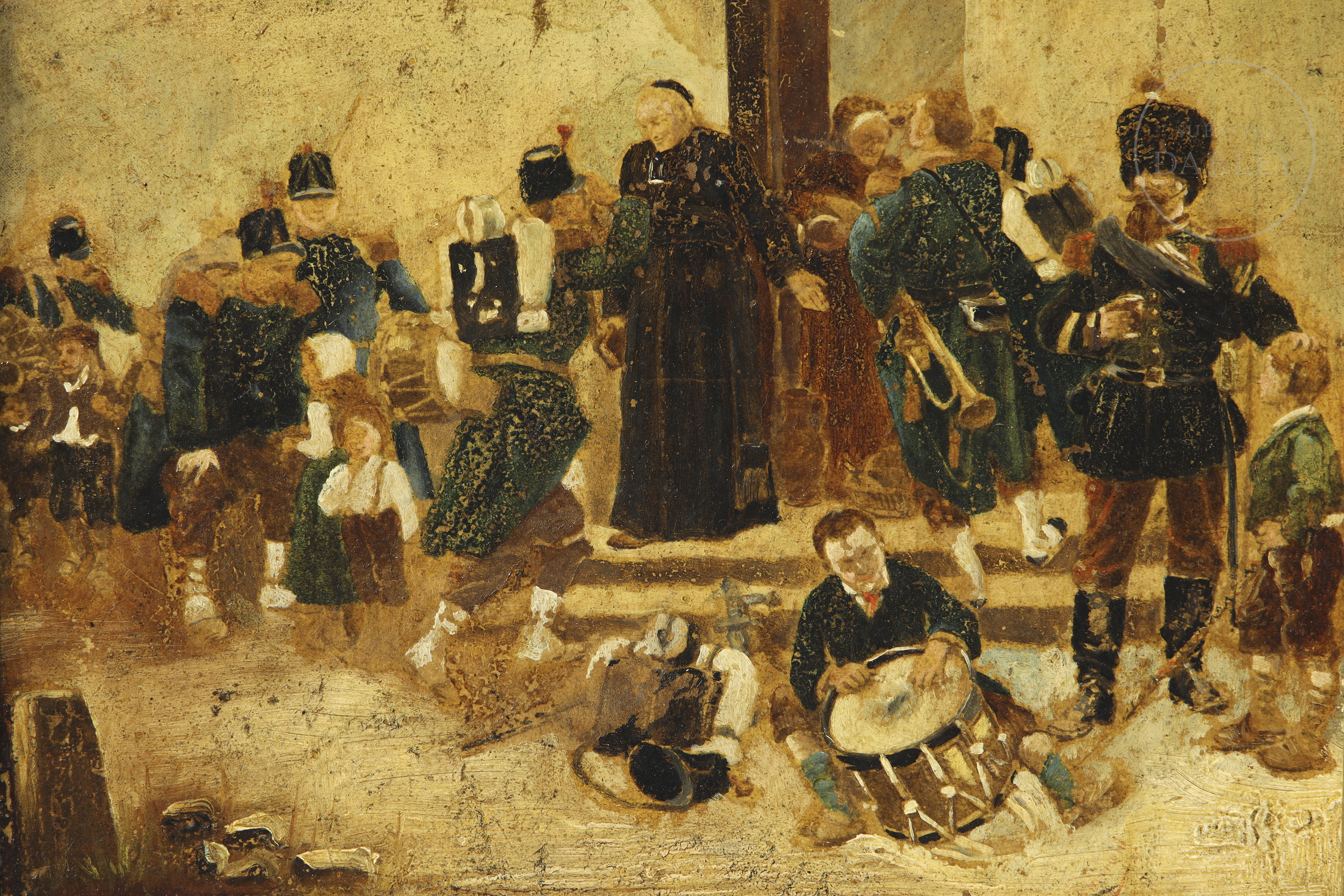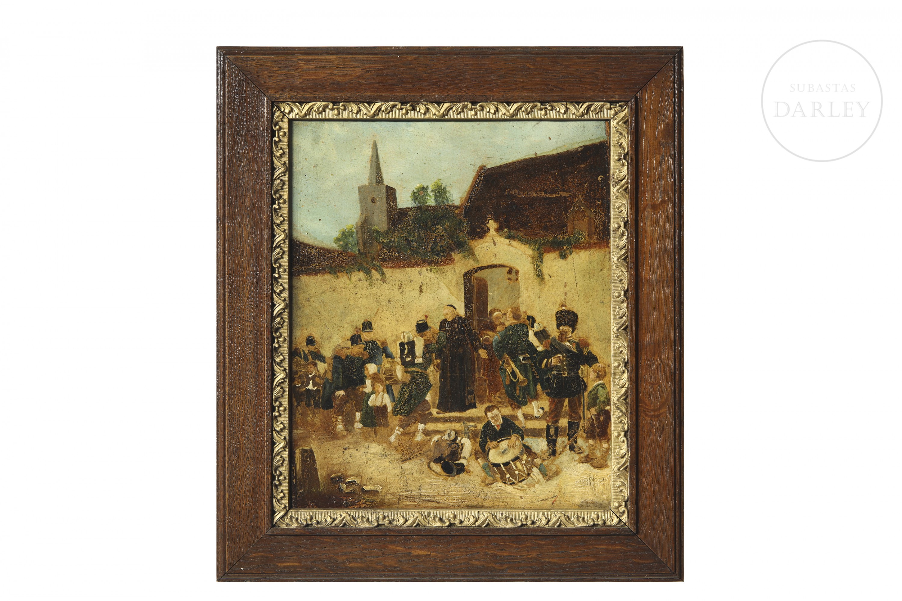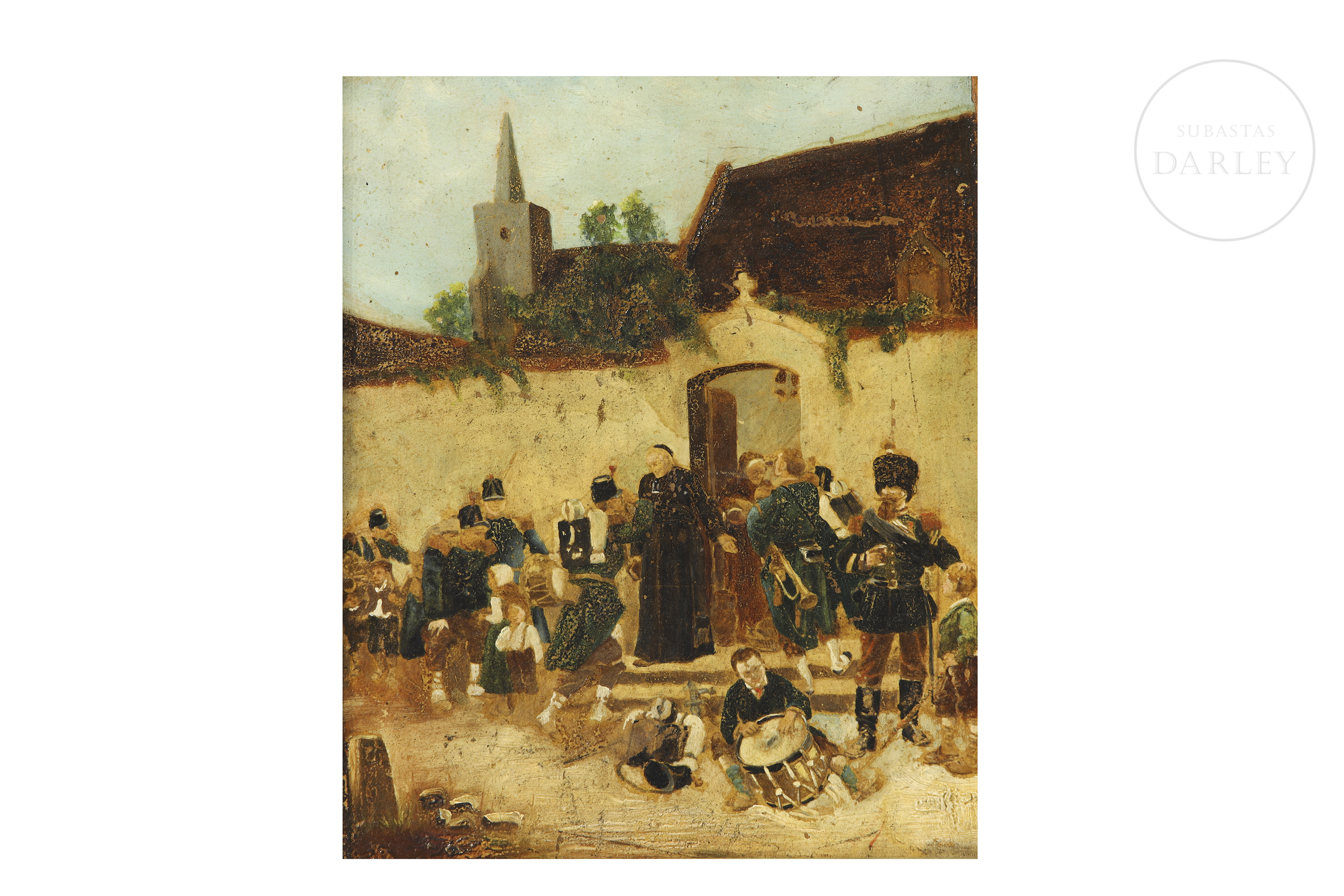 Escena de género ambientada en un patio rural donde un grupo de soldados franceses, ataviados con uniformes azules del Segundo Imperio, recibe la bendición de un sacerdote antes de partir. Destacan los músicos con tambores y shakos de gala, propios de la infantería francesa.