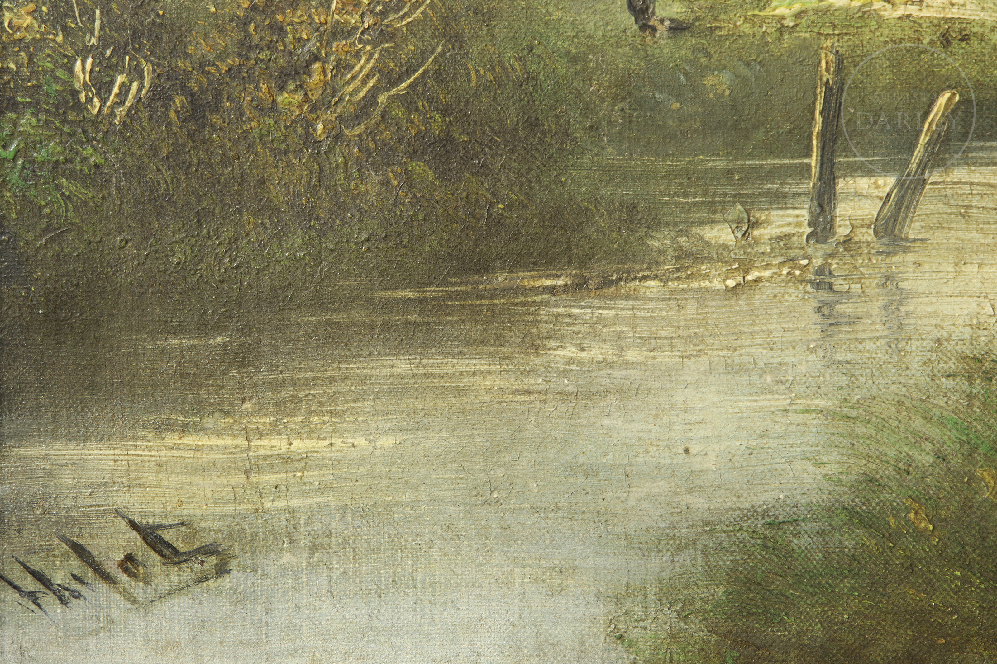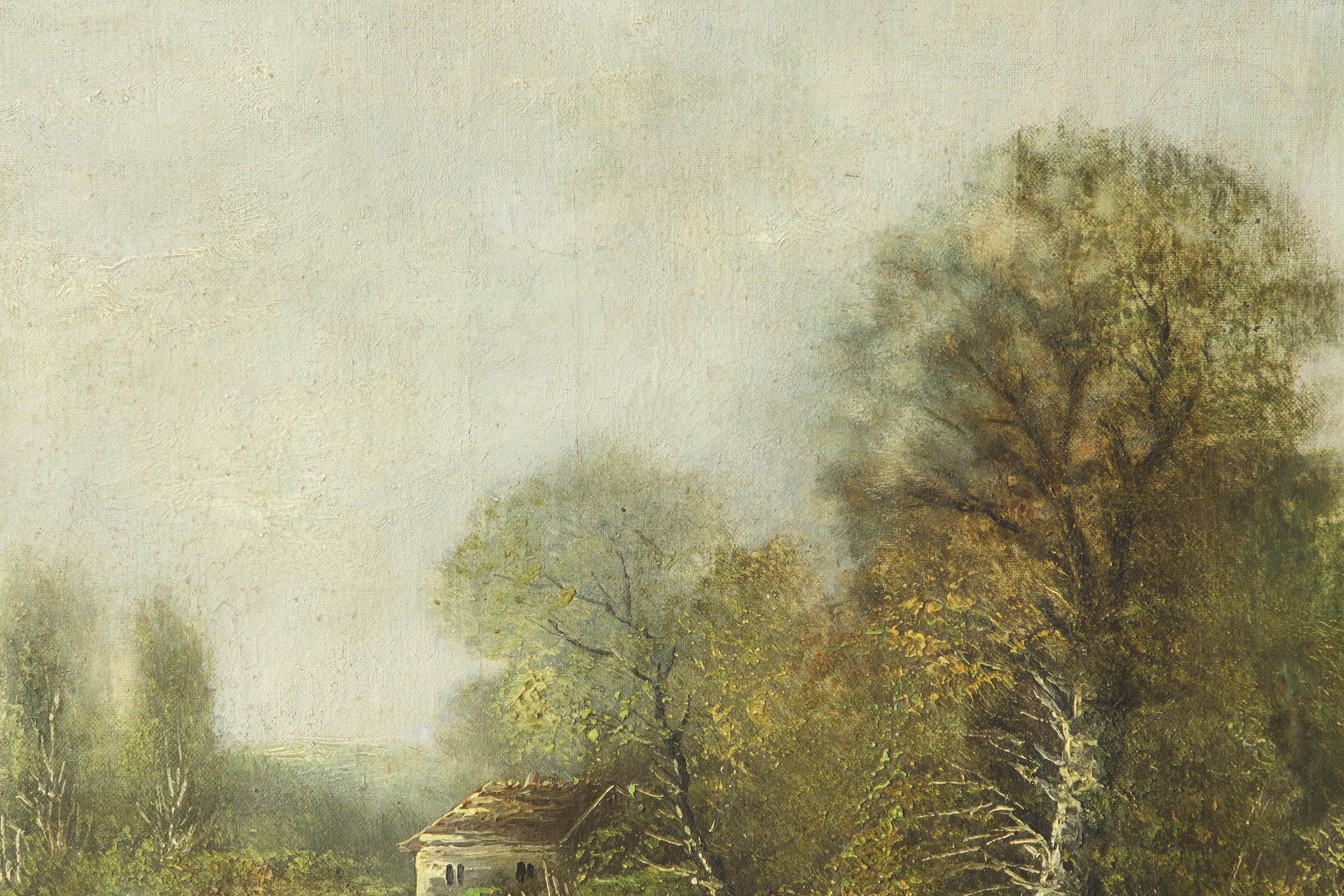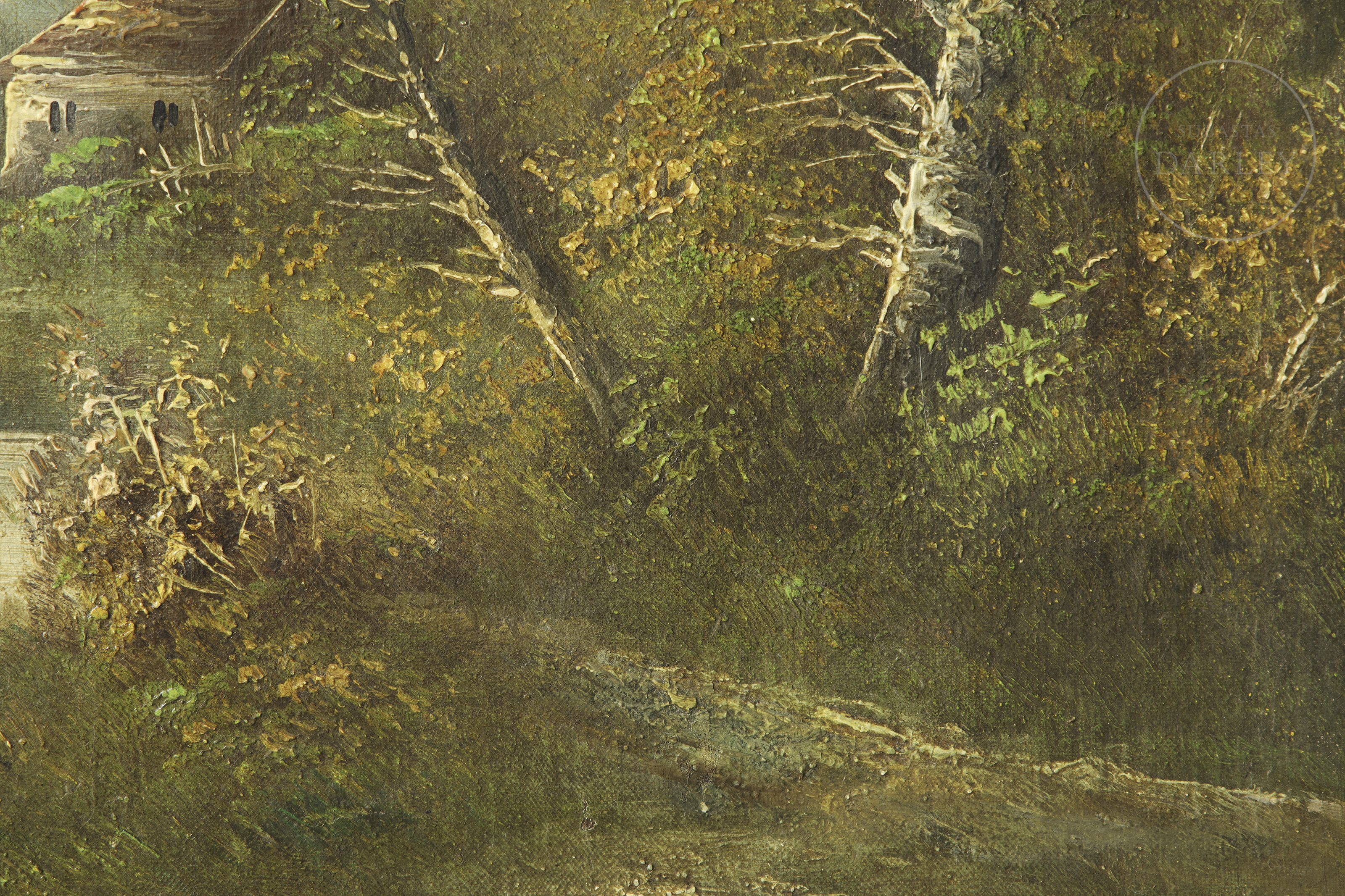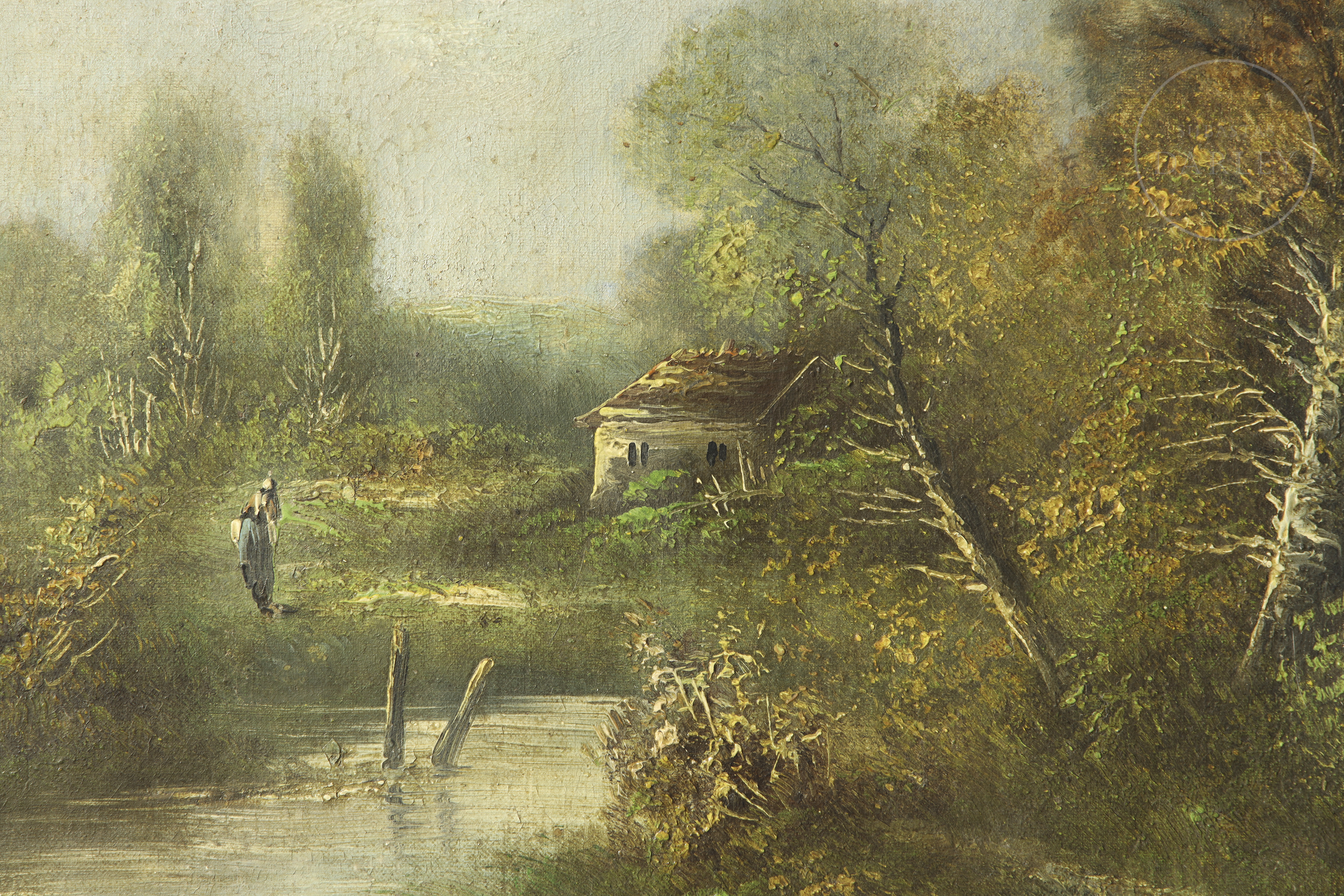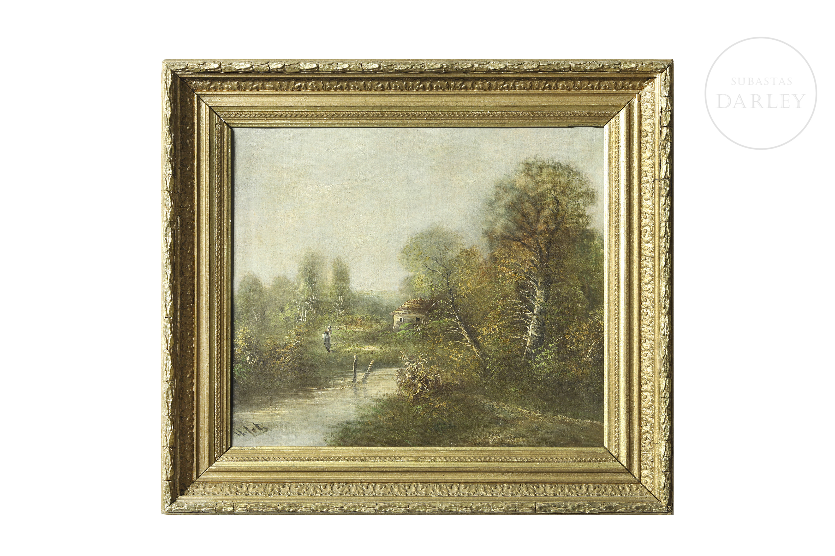 Óleo sobre lienzo. Paisaje rural en el que se aprecia una figura femenina caminando por un sendero junto a una casa y un río. Firmado en la esquina inferior derecha.