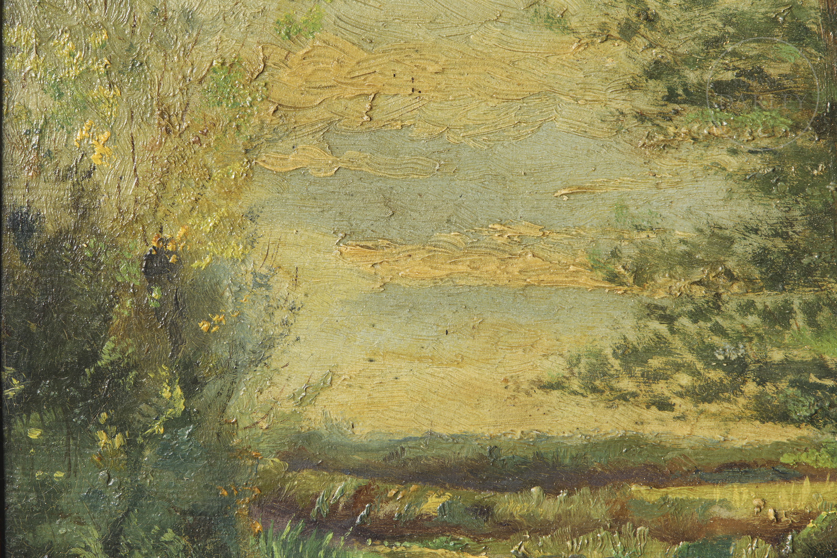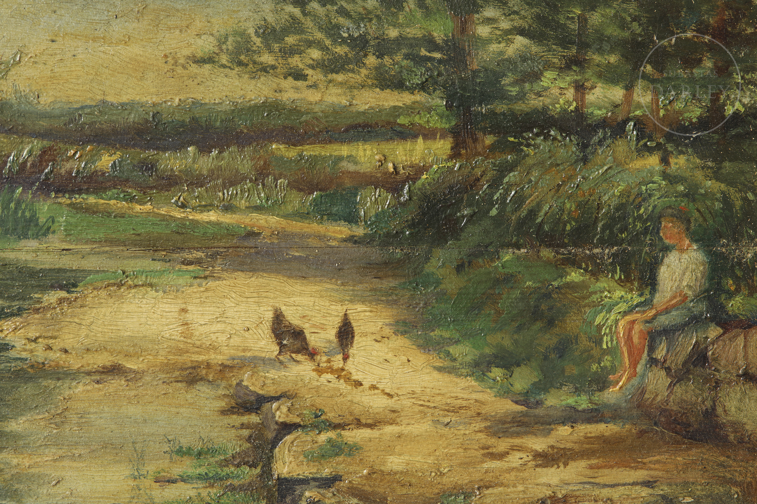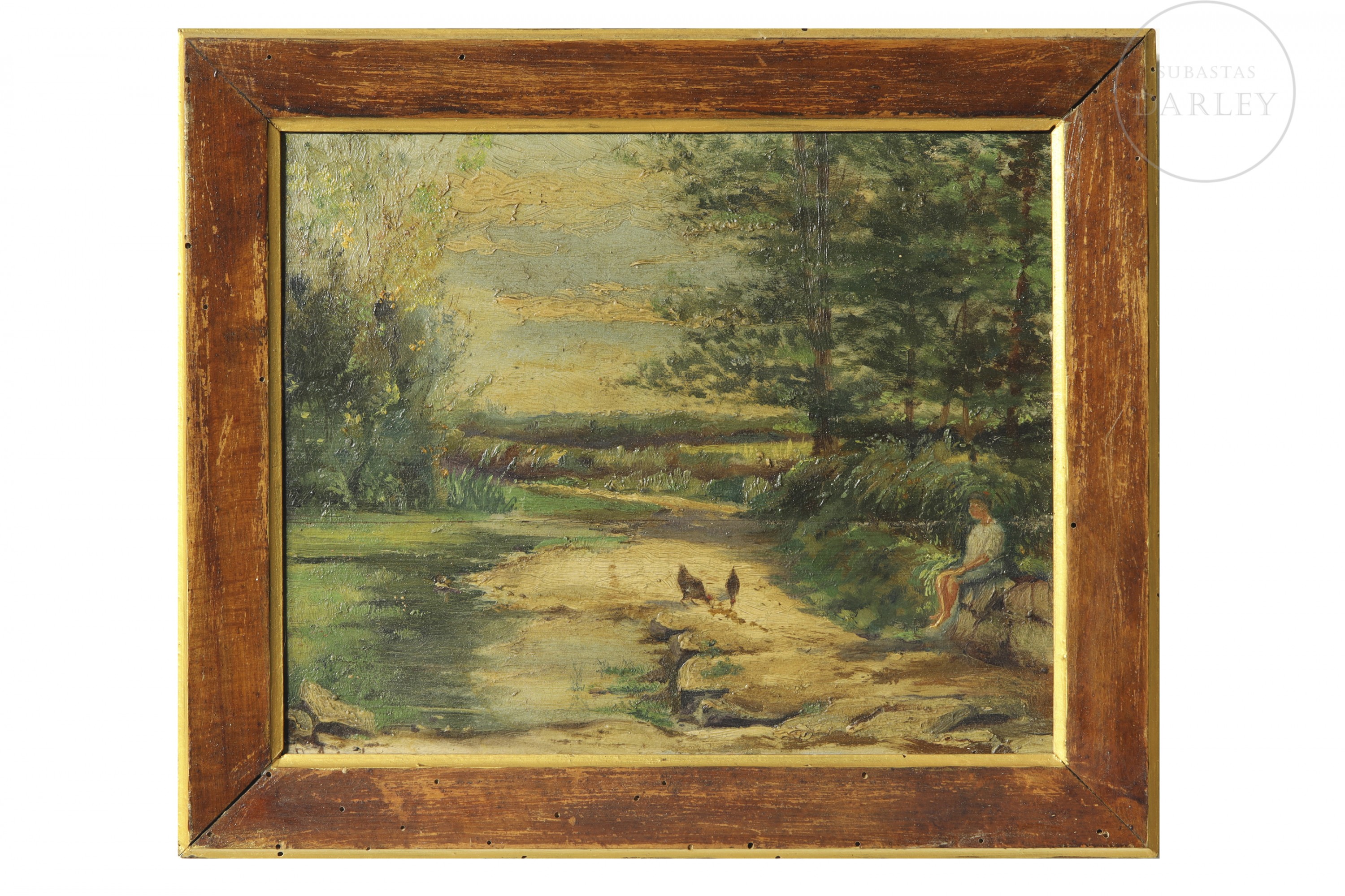 Óleo sobre tabla. Escena que representa a un niño sobre un muro, sentado en la orilla de un río, mientras observa como dos gallinas comen del suelo. Firmado y fechado "1924" en el reverso.