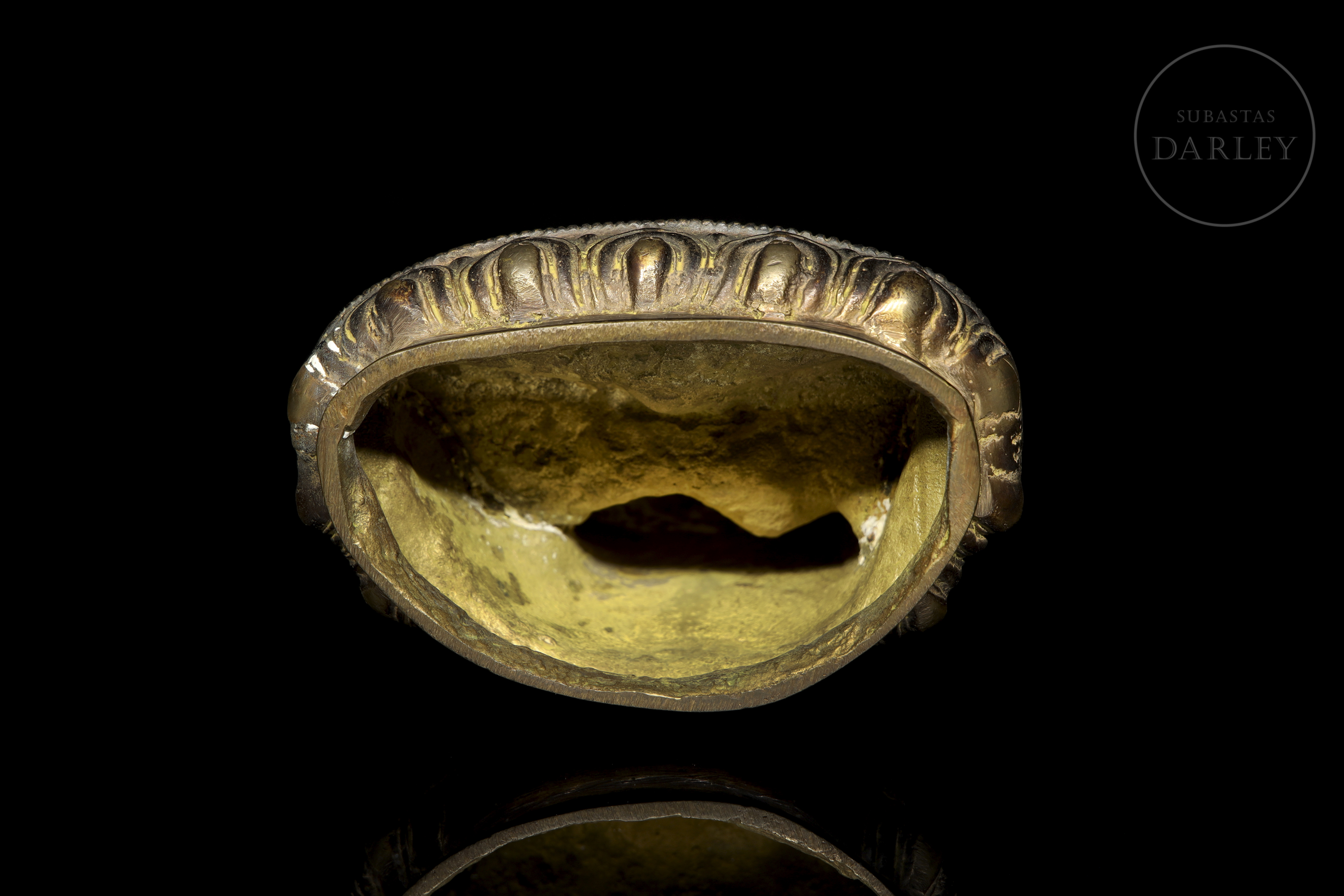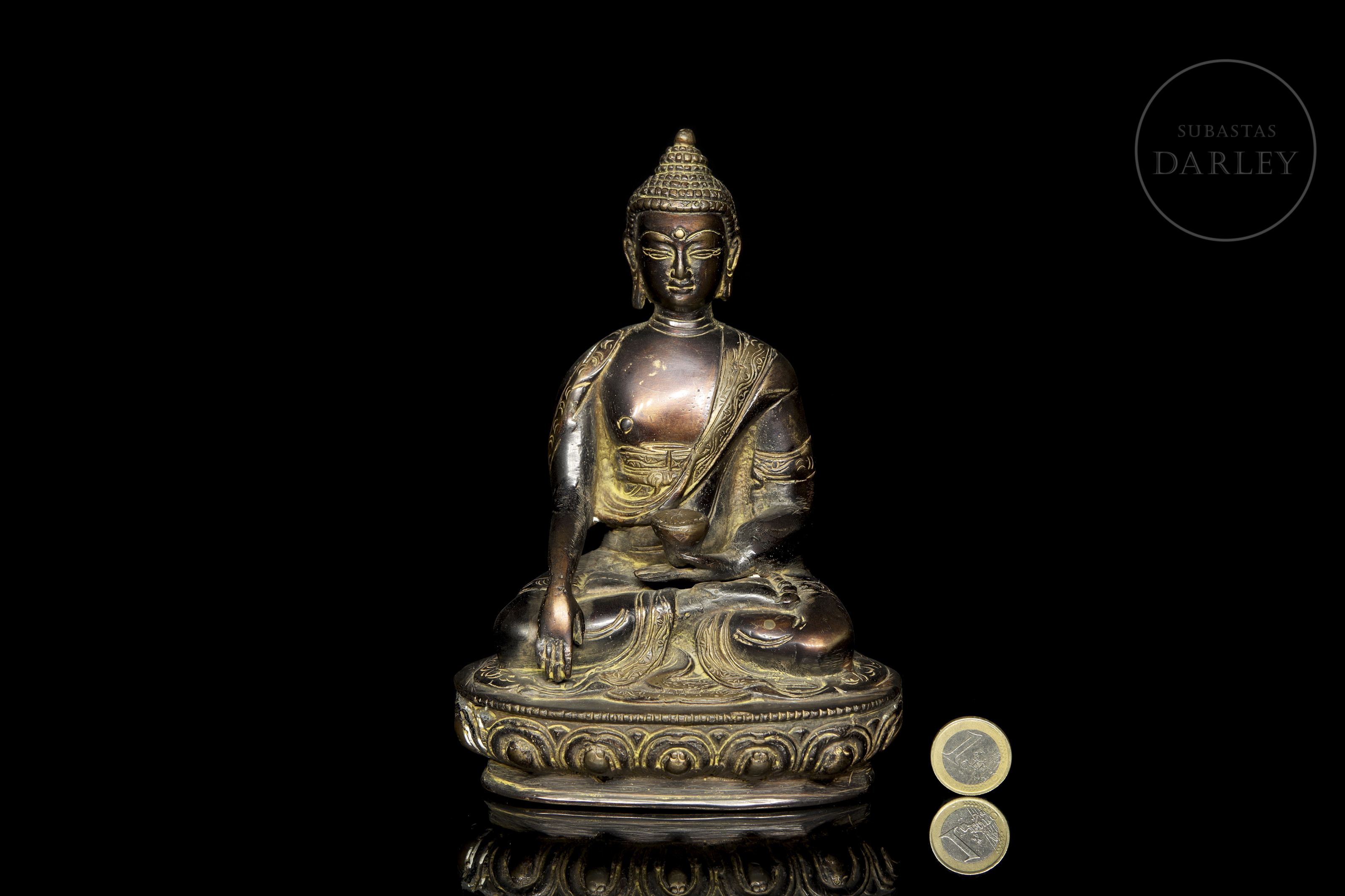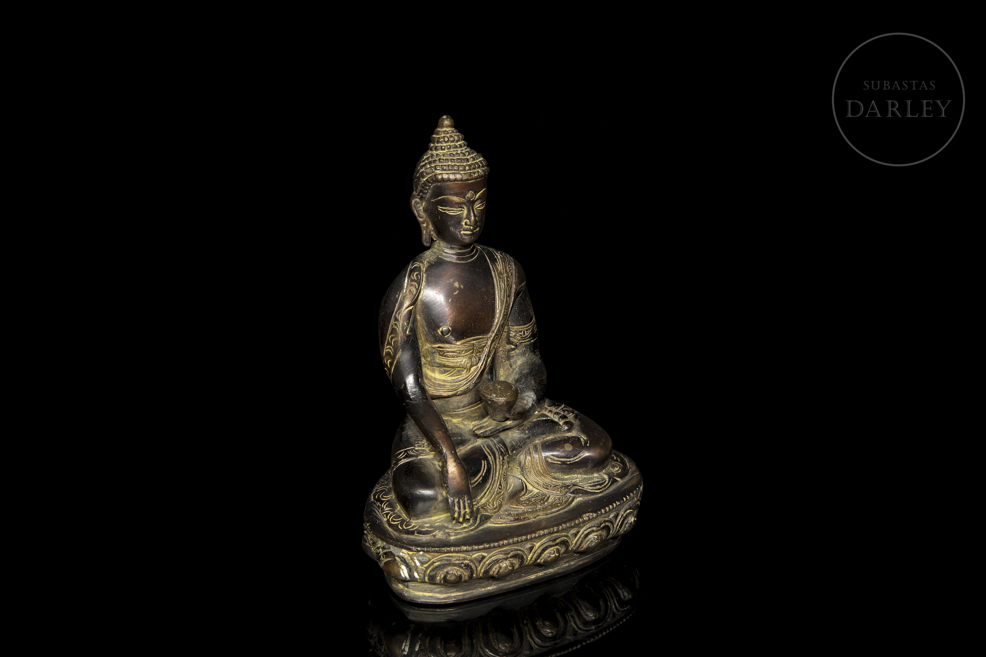 Figura de bronce que representa a Buda Shakyamuni en actitud de meditación, sentado en posición de loto sobre una base doble de pétalos tallados. Porta en la mano izquierda un cuenco ritual, mientras la derecha descansa sobre la rodilla en bhumisparsha mudra.