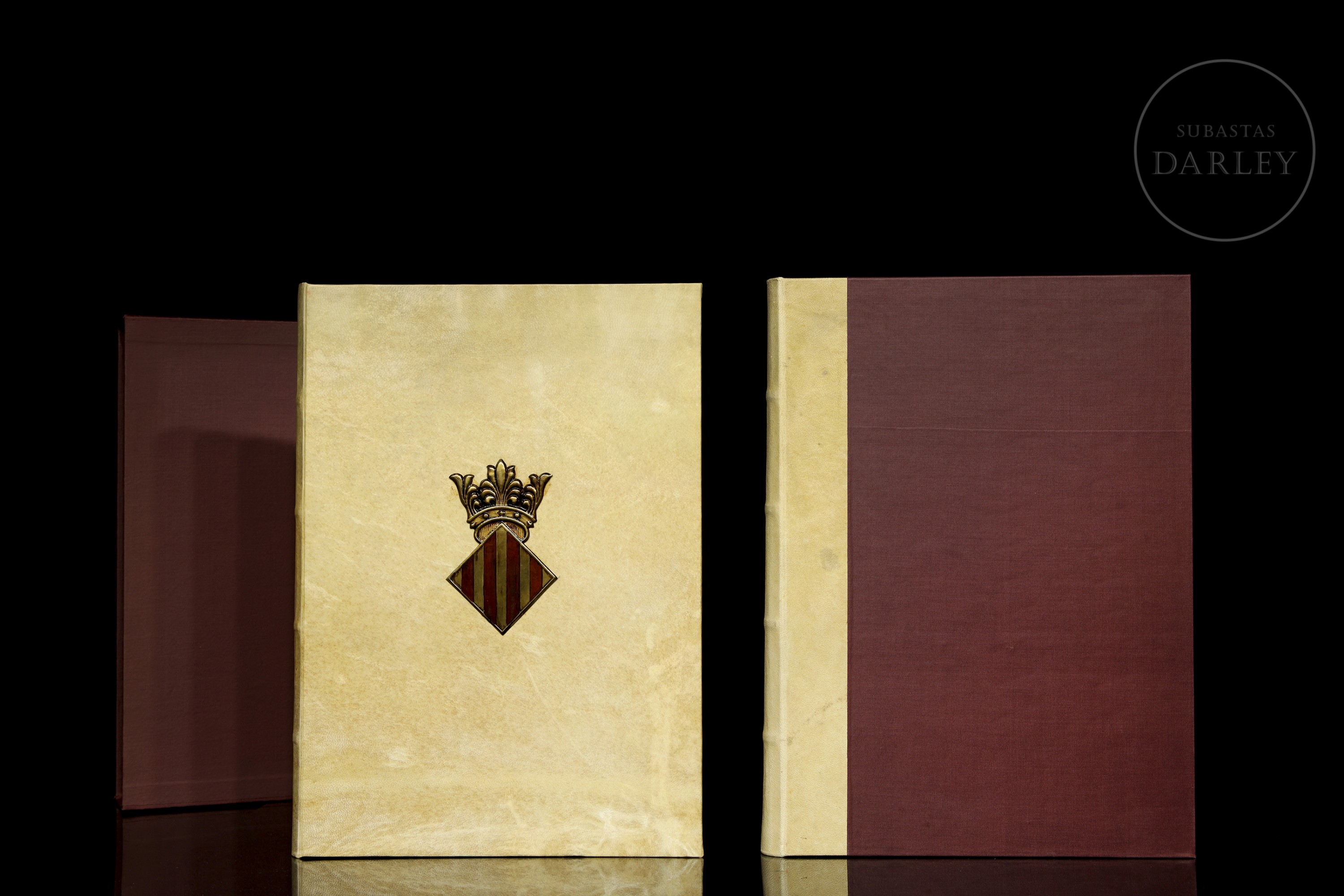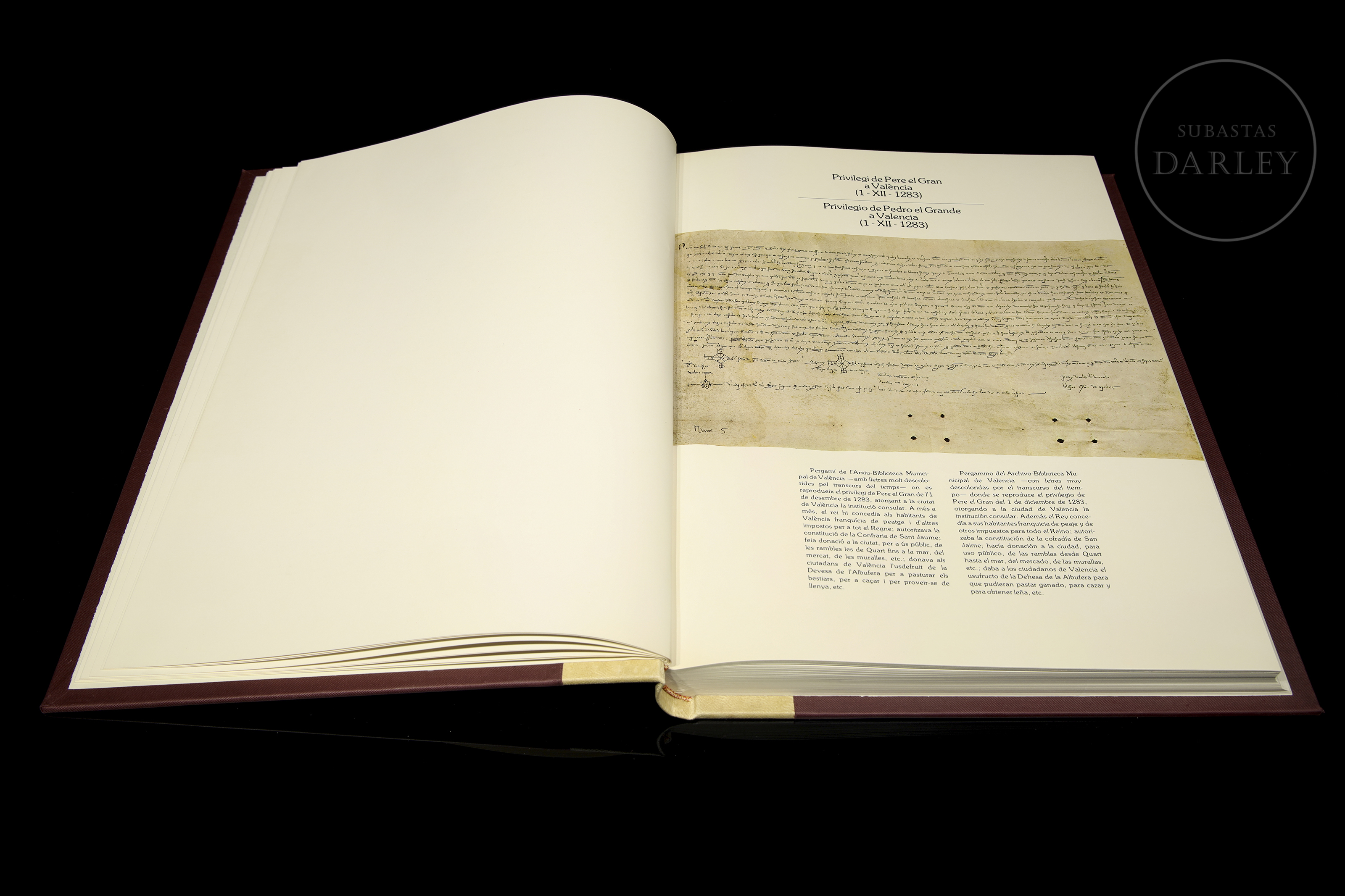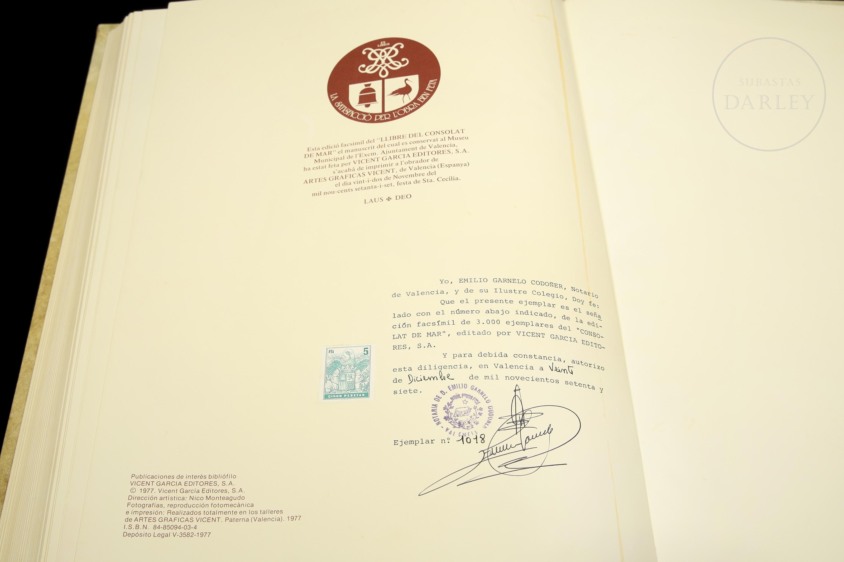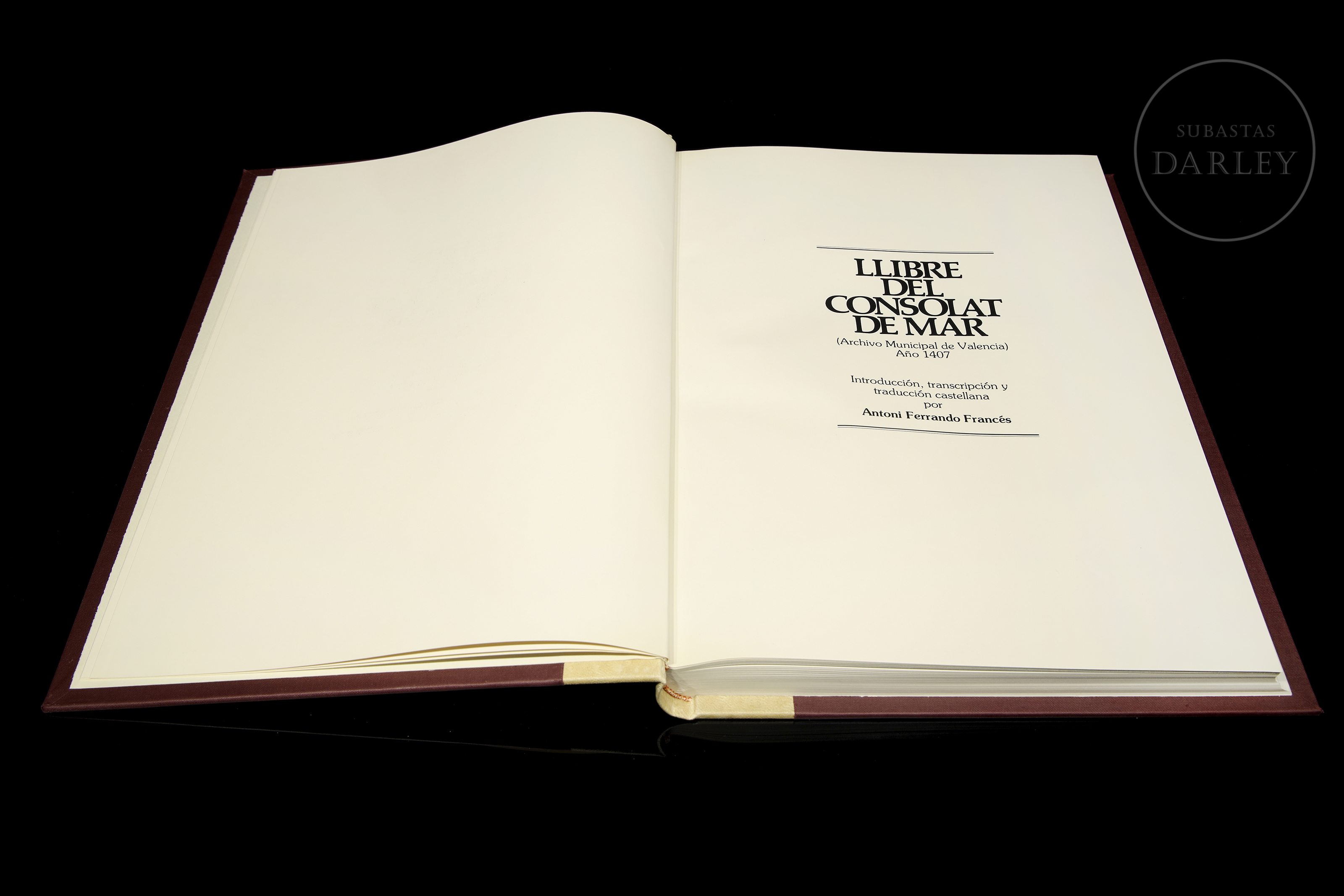 Facsímil del "LLibre de Consolat de mar" (1407). Edición facsímil de lujo por Vicente García editores S.A. 1977. Introducción, transcripción y traducción Valenciana y Castellana. Tirada de 3.000 ejemplares numerados, autentificados con firma autógrafa notarial. Ejemplar Nº: 1018. Encuadernación de tapa dura. Obra original custodiada en el Archivo Municipal de Valencia.