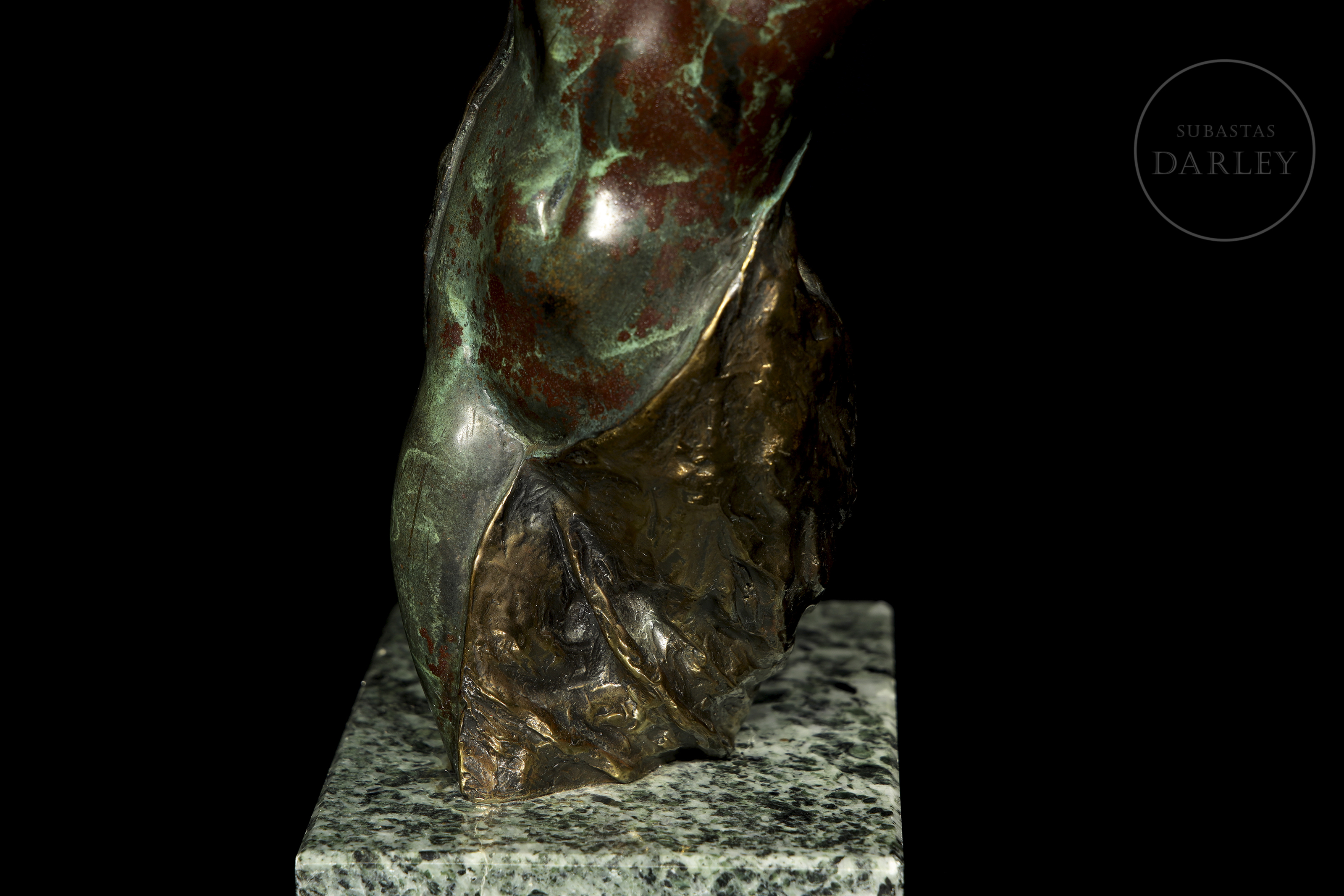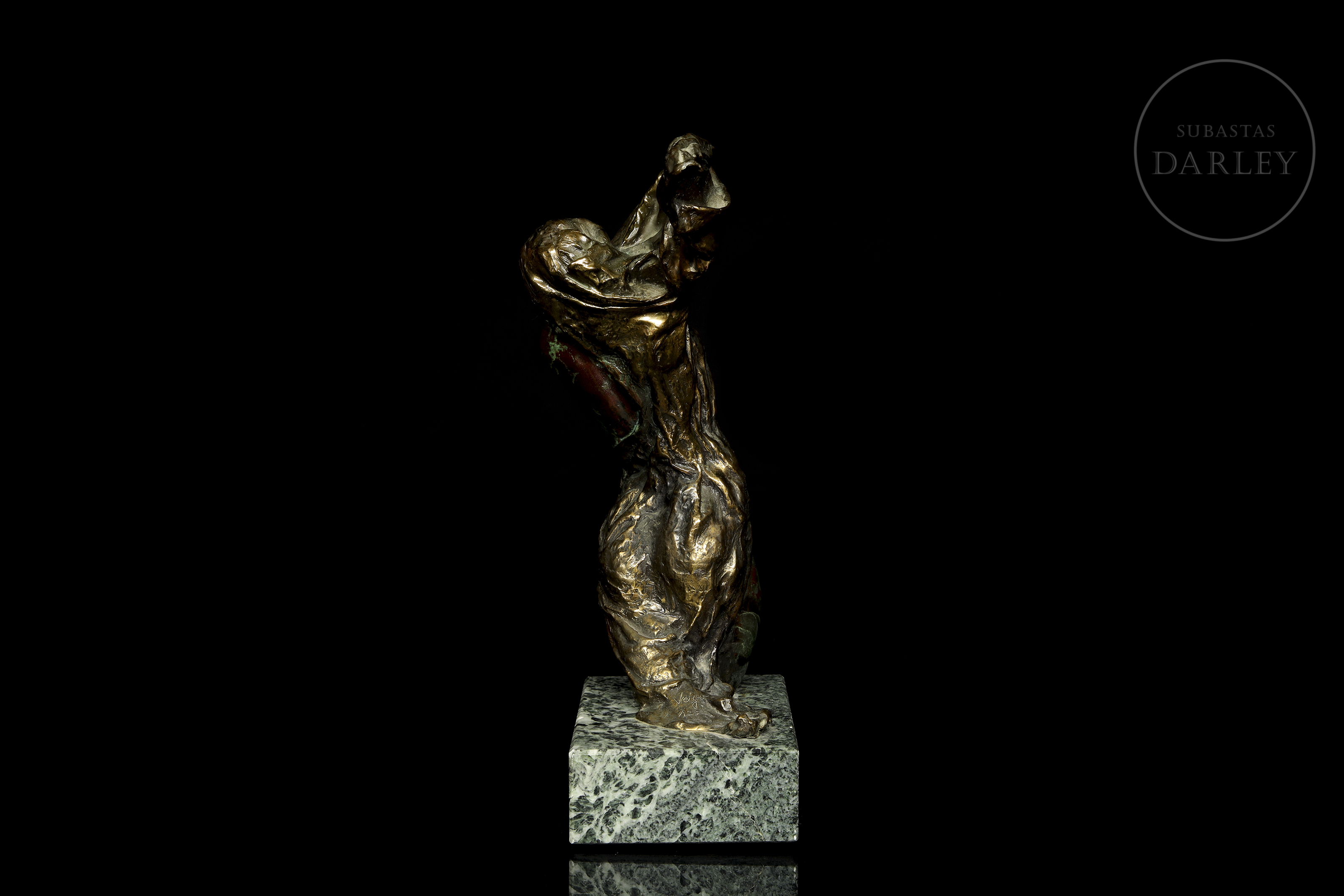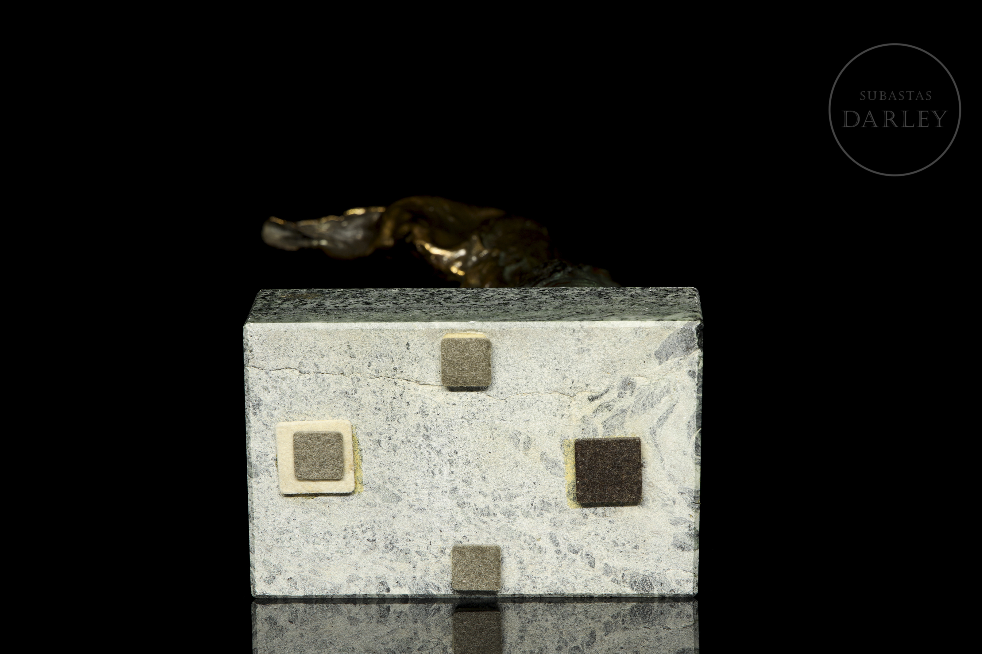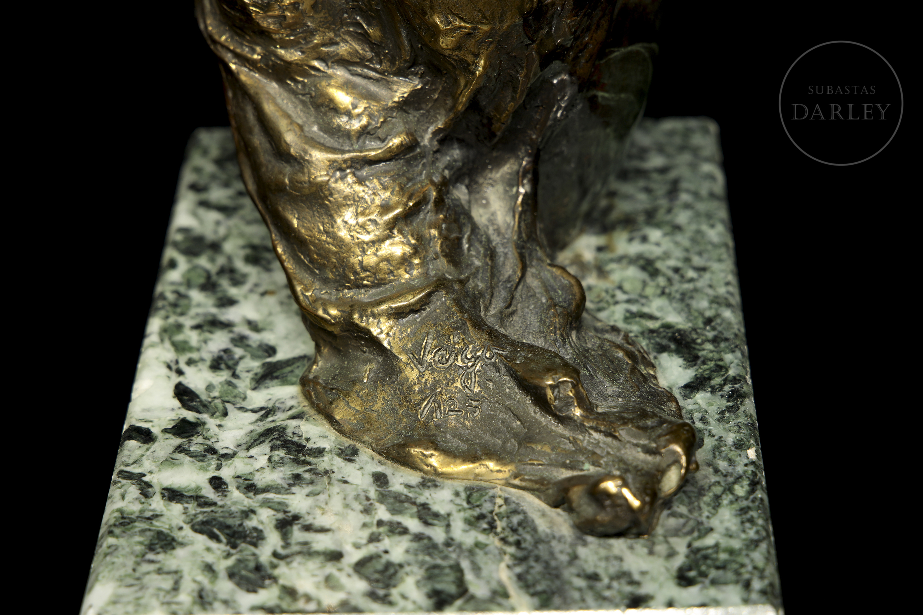 Bronce o metal patinado. Sobre peana de piedra tallada. Firmado y numerado "Veiga/125" en la base.