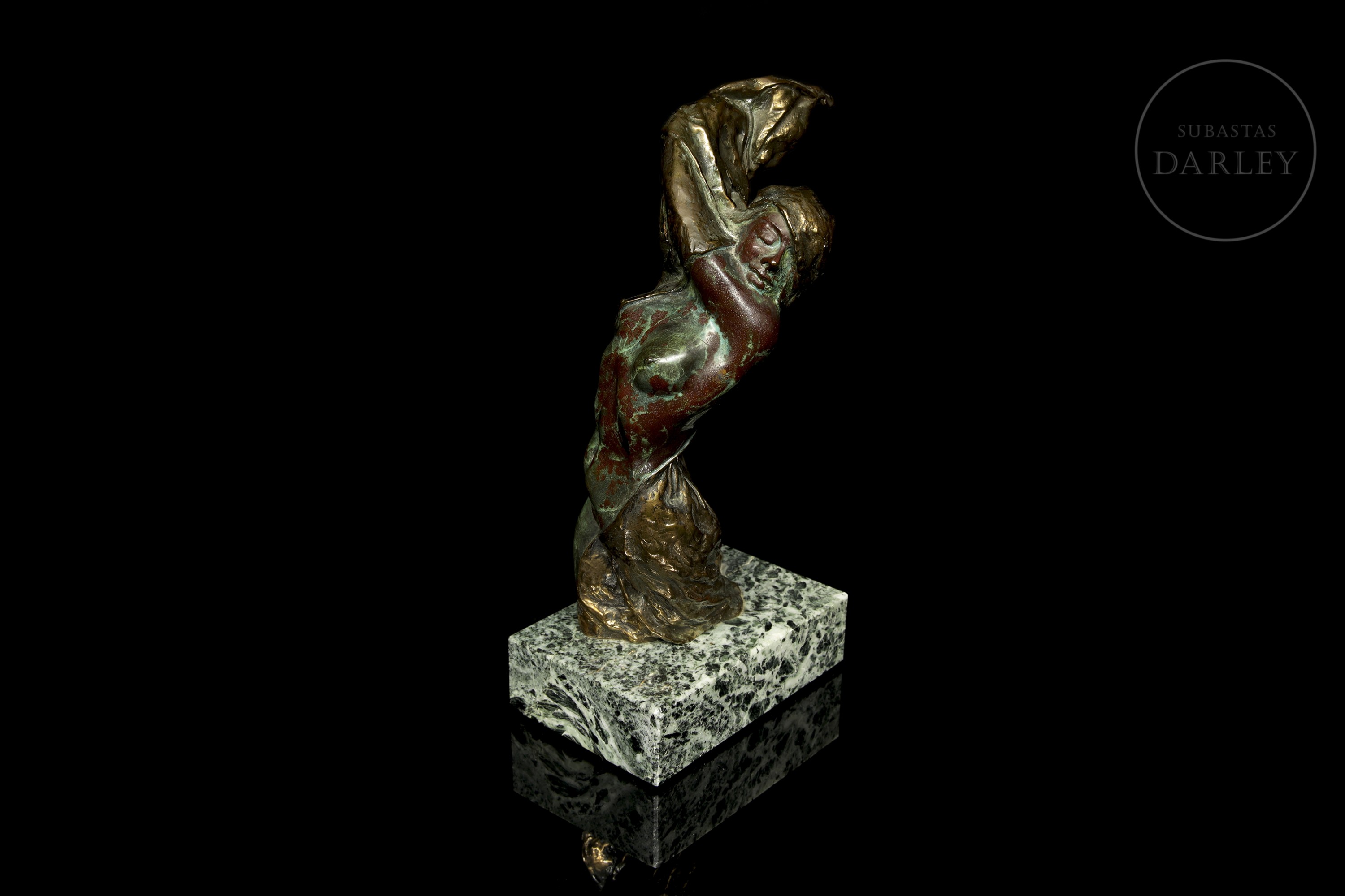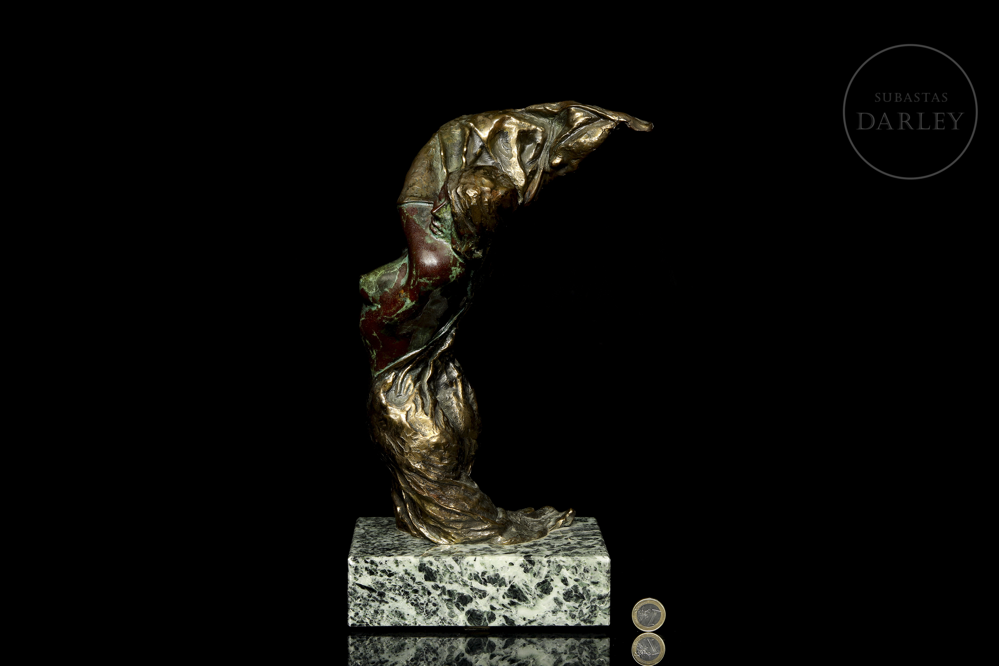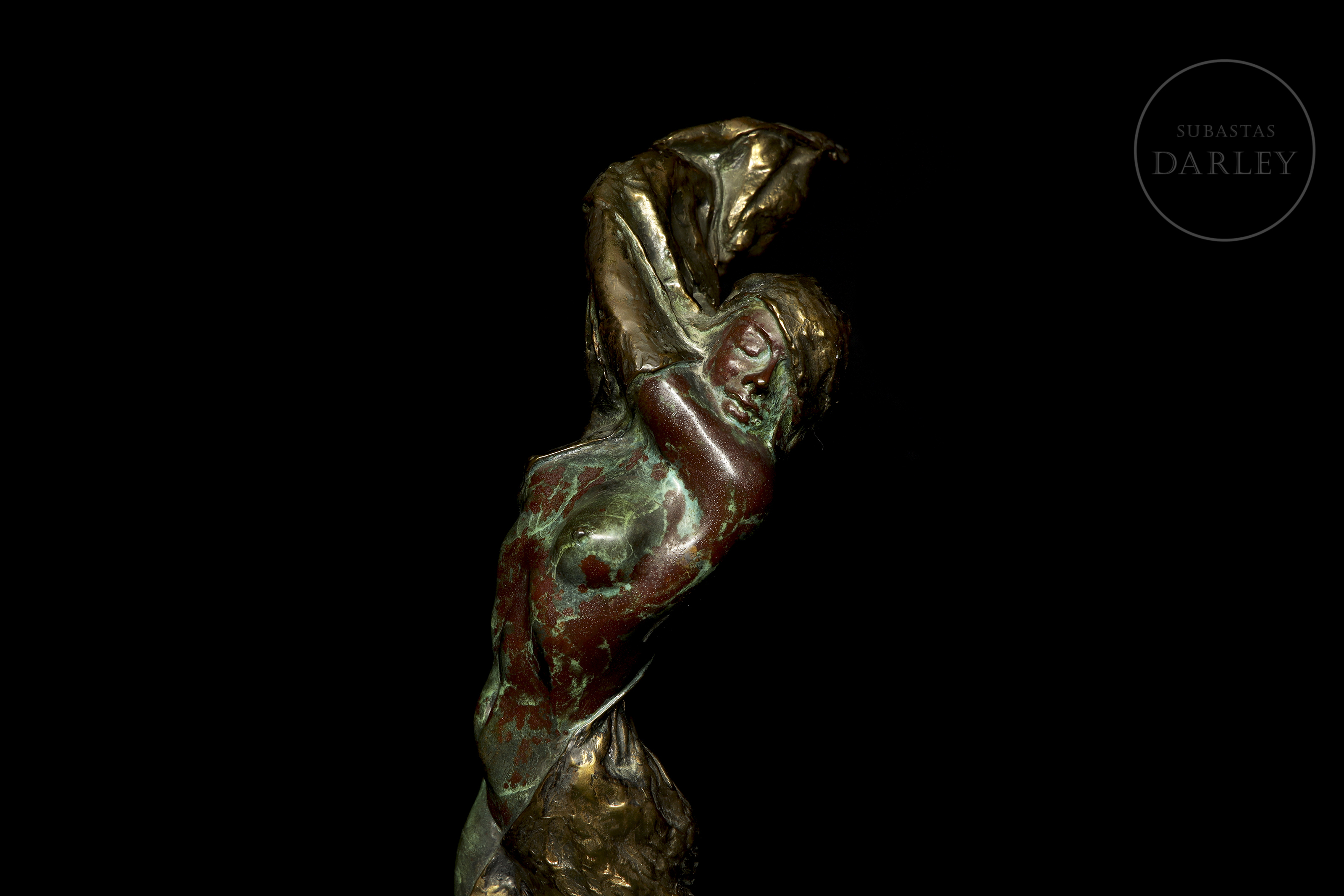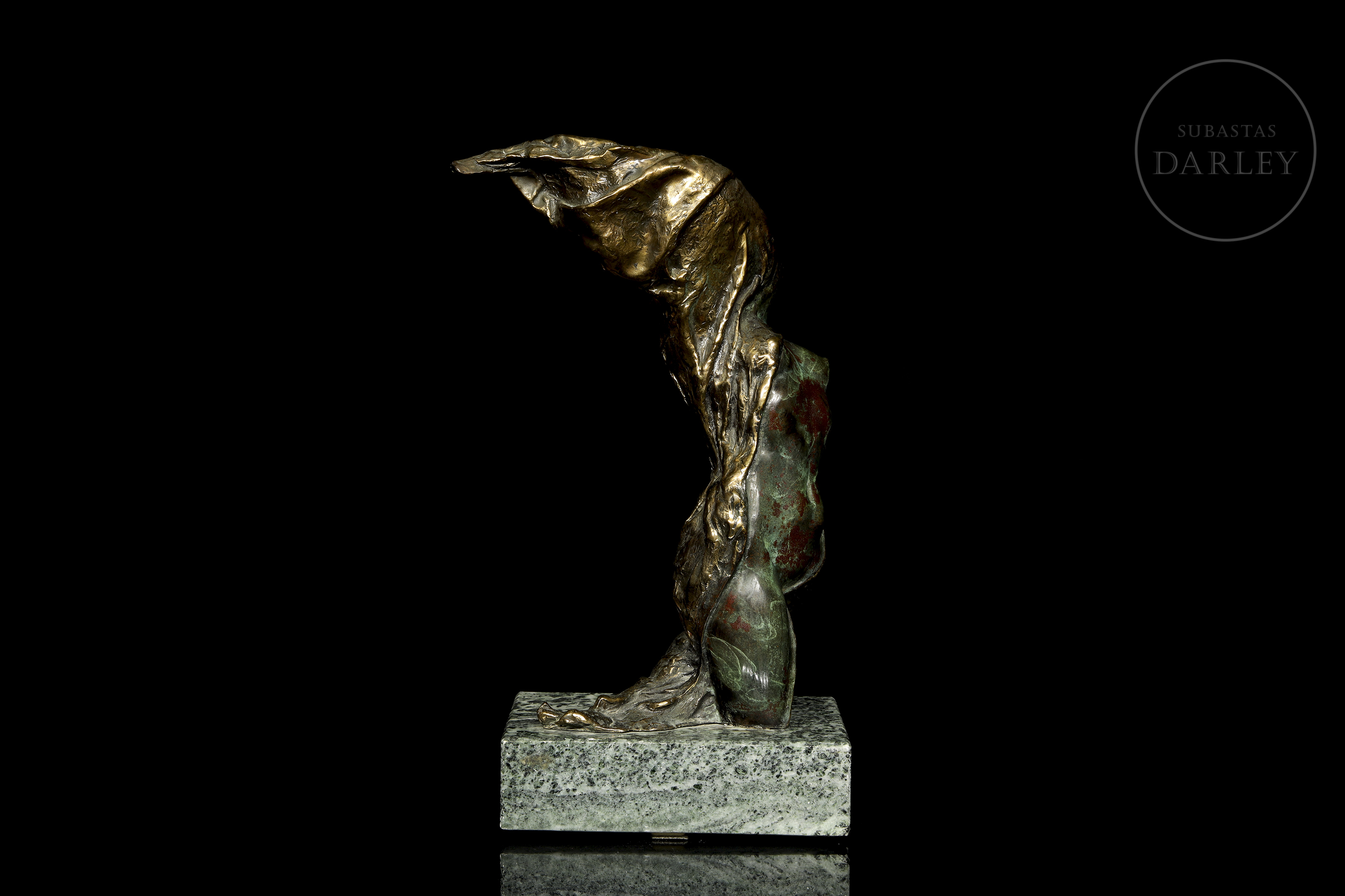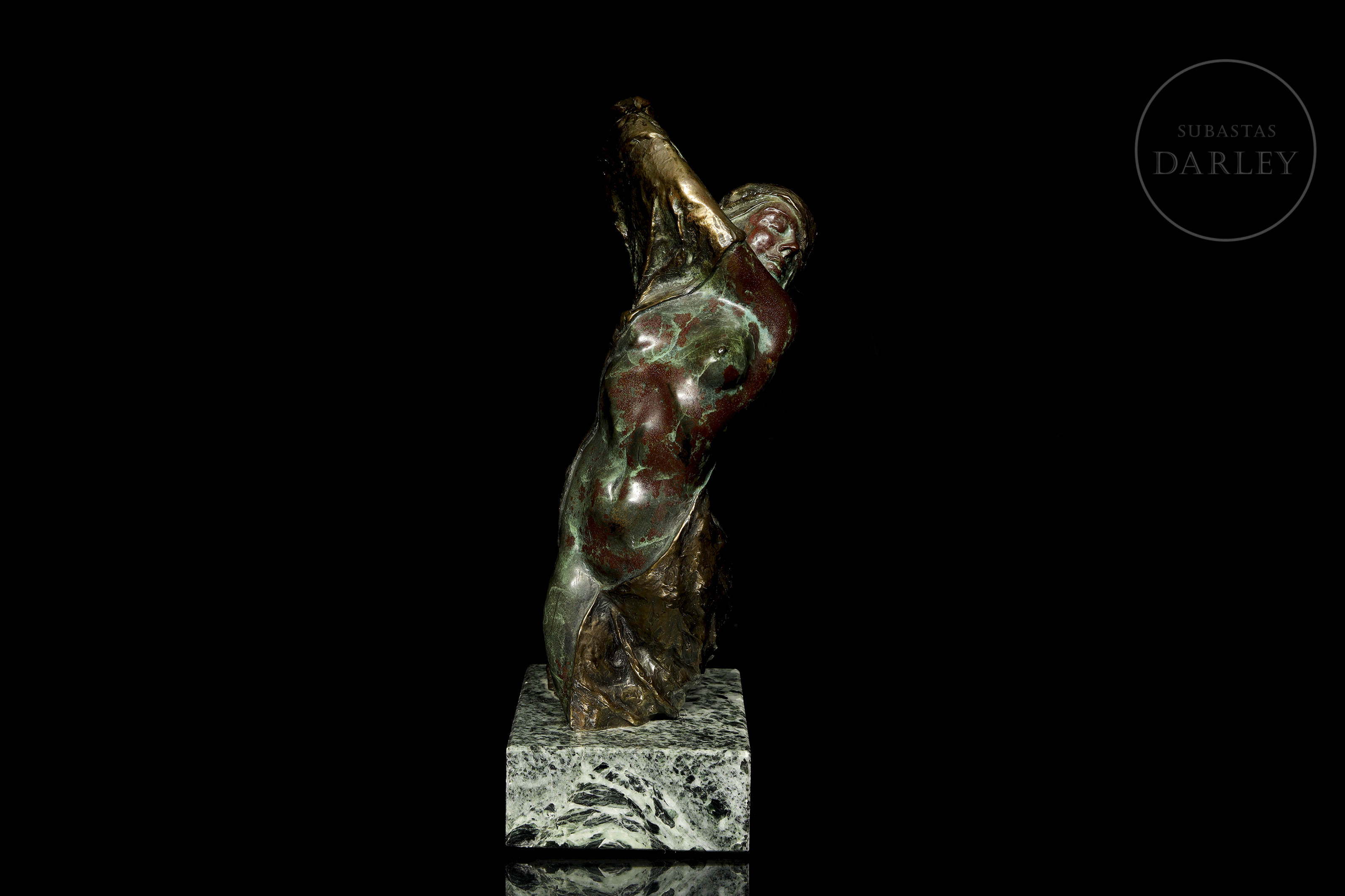 Bronce o metal patinado. Sobre peana de piedra tallada. Firmado y numerado "Veiga/125" en la base.